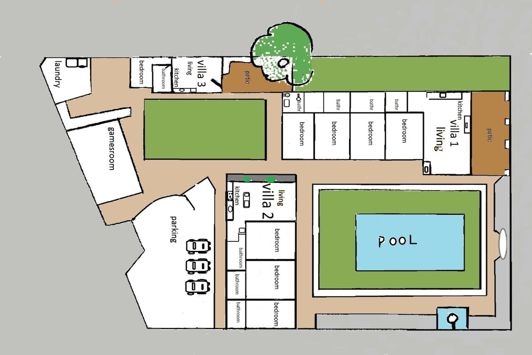 Stueetage: (Stue(pejs, varme(gennem aircondition), klimaanlæg, terrasse(overdækket)), åbent køkken(komfur(Komfur med fire kogeplader, elektrisk), ovn, mikrobølgeovn, opvaskemaskine , køle-fryseskab, toilet, varme(gennem aircondition), klimaanlæg), køkken-alrum(komfur(Komfur med fem kogeplader, gas), ovn, mikrobølgeovn, opvaskemaskine , køleskab, køle-fryseskab, varme(gennem aircondition), terrasse(overdækket)), Soveværelse med badeværelse(2x enkeltseng, badekar med bruser, bruser, håndvask, toilet, 3x varme(gulvvarme, gennem aircondition), klimaanlæg), Soveværelse med badeværelse(2x enkeltseng(90 x 210 cm), bruser, håndvask, toilet, 2x varme(gulvvarme)), Soveværelse med badeværelse(2x enkeltseng(90 x 210 cm), bruser, håndvask, toilet, 2x varme(gulvvarme, gennem aircondition)), Soveværelse med badeværelse(2x enkeltseng(90 x 210 cm), badekar med bruser, bruser, håndvask, toilet, 2x varme(gulvvarme, gennem aircondition)), Soveværelse med badeværelse(2x enkeltseng(90 x 200 cm), badekar med bruser, bruser, håndvask, toilet, 2x varme(gulvvarme, gennem aircondition)), Soveværelse med badeværelse(2x enkeltseng(90 x 210 cm), bruser, håndvask, toilet, 2x varme(gulvvarme)), soveværelse med gennemgang(2x enkeltseng(90 x 210 cm), bruser, håndvask, toilet, 2x varme(gulvvarme, gennem aircondition), barneseng), varme(gennem aircondition), klimaanlæg, barneseng, barnestol) Gæsteophold Stueetage: (Køkken(komfur(elektrisk), mikrobølgeovn, køle-fryseskab), stue / spisestue, Soveværelse med badeværelse(2x enkeltseng(90 x 200 cm)), varme(gulvvarme), klimaanlæg, terrasse(overdækket, 20 m2)) vaskerum (tørretumbler, vaskemaskine, terrasse), legeværelse(Fjernsyn(parabol, Hollandske TV-kanaler, Internationale TV-kanaler), klimaanlæg, bordtennisbord, biljard), have(indhegnet), grill, swimmingpool(privat, opvarmet, termotæppe til swimmingpool, 11 x 6 m.)