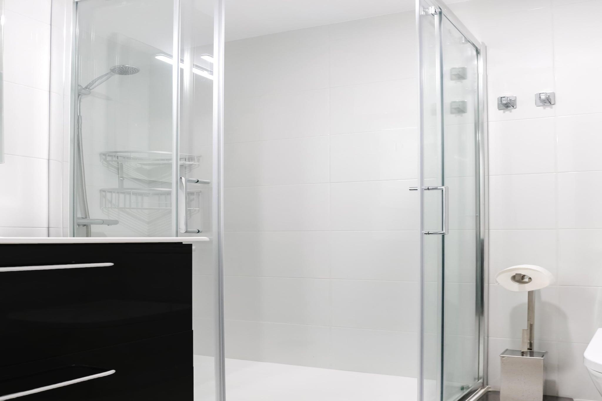 Stueetage: (Indgang (deles med ejer og andre gæster, adgang udefra), elevator) På 2. etage: (Indgang , Køkken(kogeplade, brødrister, emhætte, kaffemaskine, ovn, mikrobølgeovn, køle-fryseskab, Saftpresser), stue / spisestue(Fjernsyn(fladskærm), spisebord, sofahjørne), soveværelse(dobbeltseng(135 x 190 cm)), soveværelse(enkeltseng(90 x 190 cm), enkeltseng(90 x 190 cm)), soveværelse(køjeseng eller 2 enkeltsenge), badeværelse(bruser, håndvask, toilet), badeværelse(badekar, håndvask, toilet), varme, terrasse(privat)) have(deles med andre gæster), havemøbler, parkering, swimmingpool(deles med andre gæster, udendørs, herunder en del for børn (maks. dybde 50 cm), opened from 1/2 Jun upto and including 1/2 Sep), tennisbane(deles med andre gæster), legeredskaber(deles med andre gæster), strygebræt, strygejern