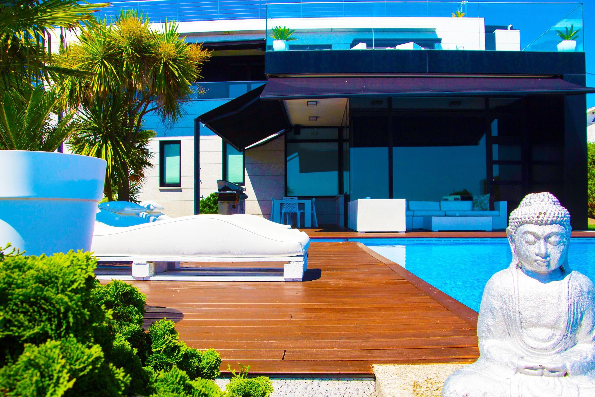 Dette smukke designerhus ligger i kystbyen Sanxenxo. Huset har 5 soveværelser med dobbeltsenge, alle med en fantastisk udsigt over havet og øerne, en opvarmet saltvandspool (poolen er opvarmet fra midten af juni til slutningen af september) og stilfulde havemøbler. Huset har moderne elektriske persienner og indvendige persienner, vinduer med motoriseret åbning, 3D-ledet tv i stuen, satellit og WIFI. Tv på badeværelset med et imponerende hydromassagebadekar med funktioner som farveterapi eller aromaterapi. De tre badeværelser har store brusere med hydromassage og musik i rørledninger. Gulvvarme og varme trægulve i hele huset. High-end møbler og apparater. Huset ligger i et roligt og grønt område, 10 minutters gang fra Montalvo og Bascuas strande. I Sanxenxo kan du nyde flere aktiviteter såsom karting, vandsport, ridning, bådudlejning, besøg på Ons Island, A Toxa Casino og de prestigefyldte A Toxa og Monte Castrove golfbaner.