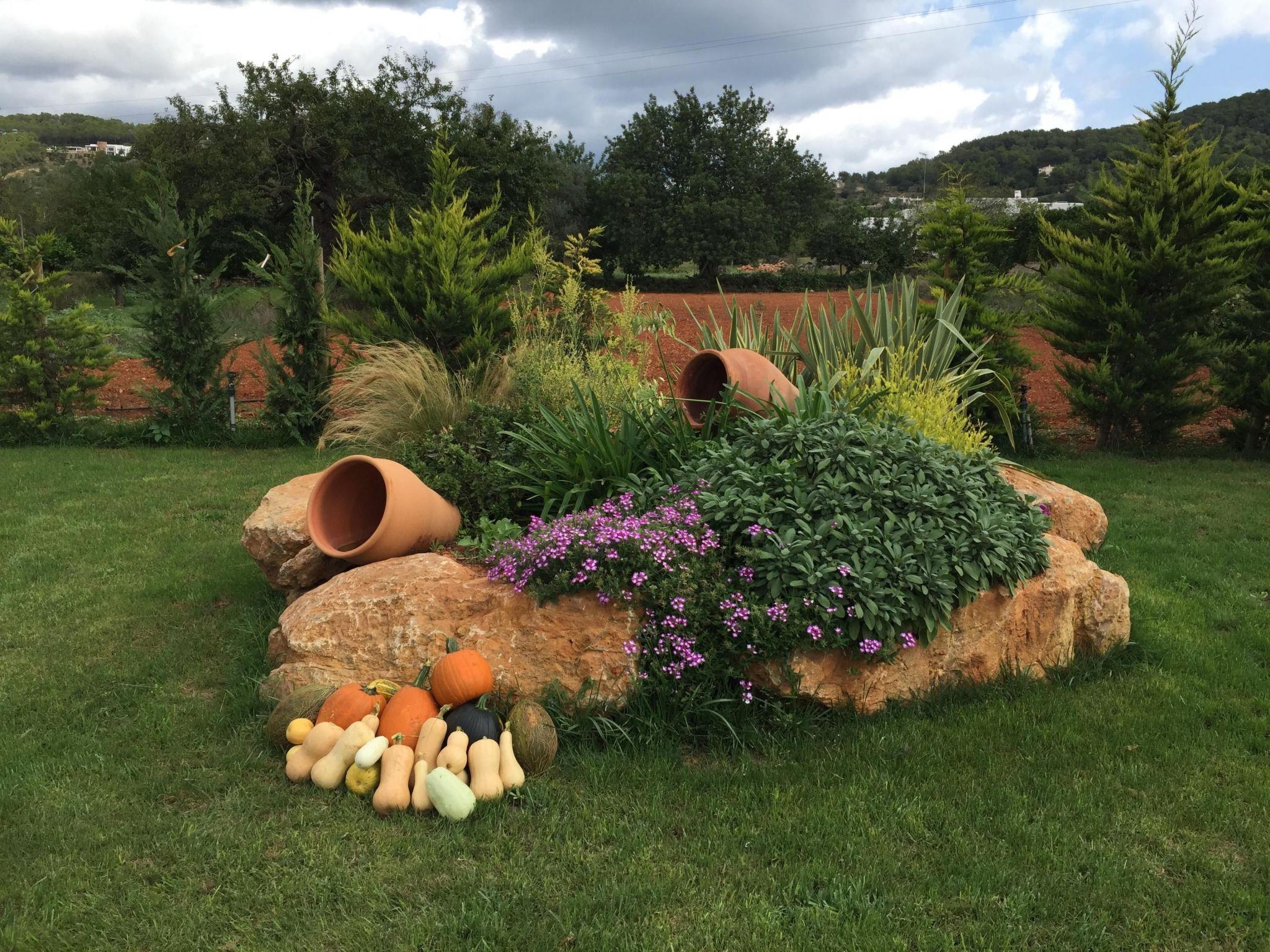 The holiday home, which was built in the 19th Century, is one of the traditional houses in the village of San Carlos. It was completely renovated in 2000, but has lost neither its authenticity nor the traditional charm of a country house on Ibiza. The house has two floors. On the upper floor is the 100-square-metre suite, where there is a bedroom with a large double bed, a bathroom with a Jacuzzi and a small living room with a sofa bed as well as its own large balcony. The other two bedrooms are approximately 14 square metres in size, and each has two double beds. In addition, there are two further bathrooms with bathtub or shower. The living room is equipped with a flat-screen TV, DVD player and a music system as well as cosy armchairs. The 35 sqm kitchen is fully equipped with a dining table and chairs, and invites you to cook or dine together. A small separate utility room with washing machine, tumble dryer and ironing board are also available. You have access to free WLAN throughout the whole house.