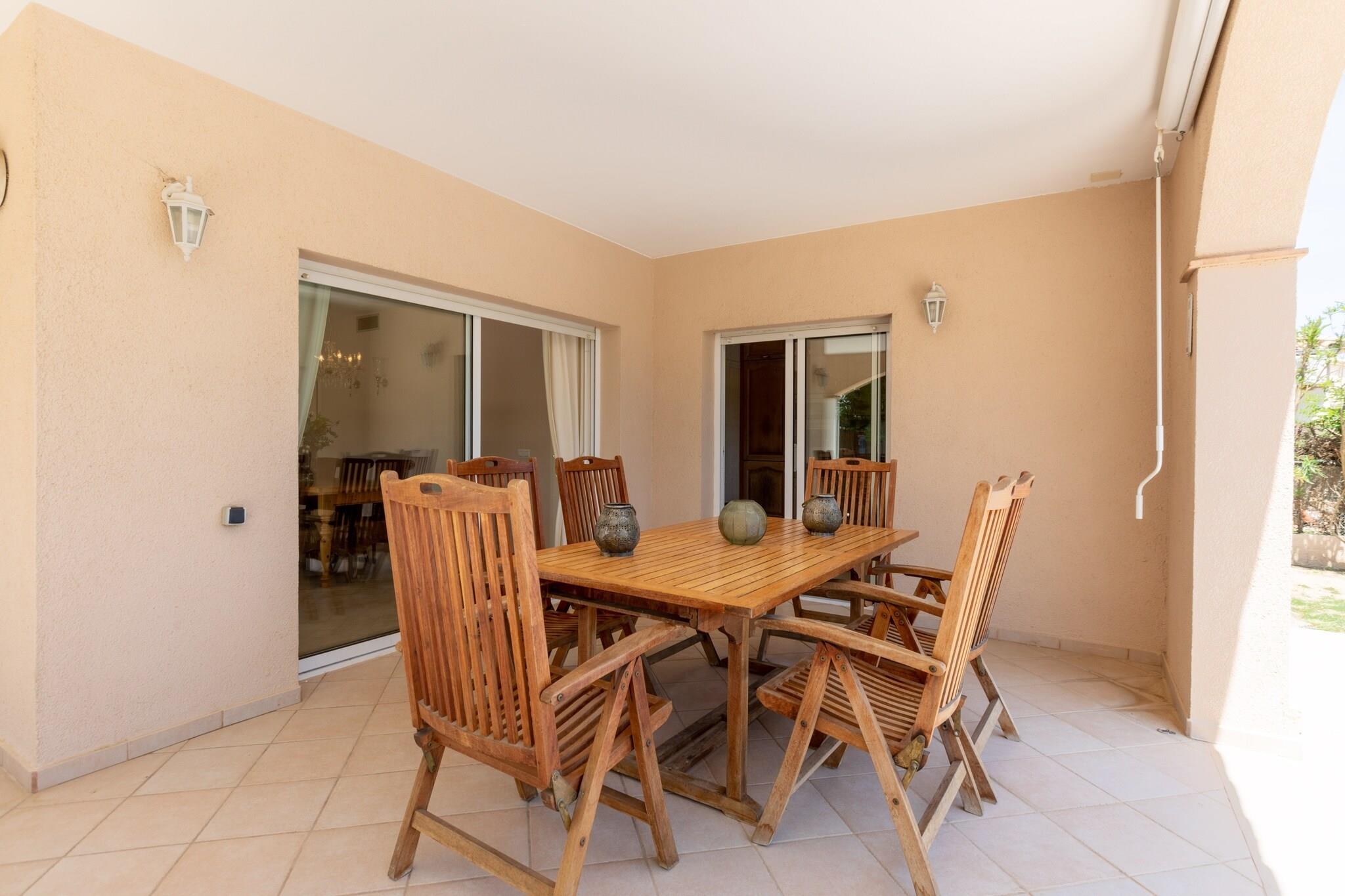 Stueetage: (Køkken(komfur(elektrisk), emhætte, ovn, mikrobølgeovn, opvaskemaskine , køleskab, fryser(140-199L)), stue / spisestue(Fjernsyn(parabol), spisebord, DVD-afspiller, stereoanlæg), soveværelse(dobbeltseng), badeværelse(bruser, toilet)) På 1. etage: (soveværelse(køjeseng), soveværelse(dobbeltseng), soveværelse(dobbeltseng, toilet), badeværelse(badekar med bruser), badeværelse(badekar med bruser, toilet)) veranda, bruser(udendørs), vaskemaskine, klimaanlæg, terrasse, have, havemøbler, grill, liggestole, swimmingpool(privat, 7 x 4 m., opened from Apr upto and including Sep), barneseng, barnestol