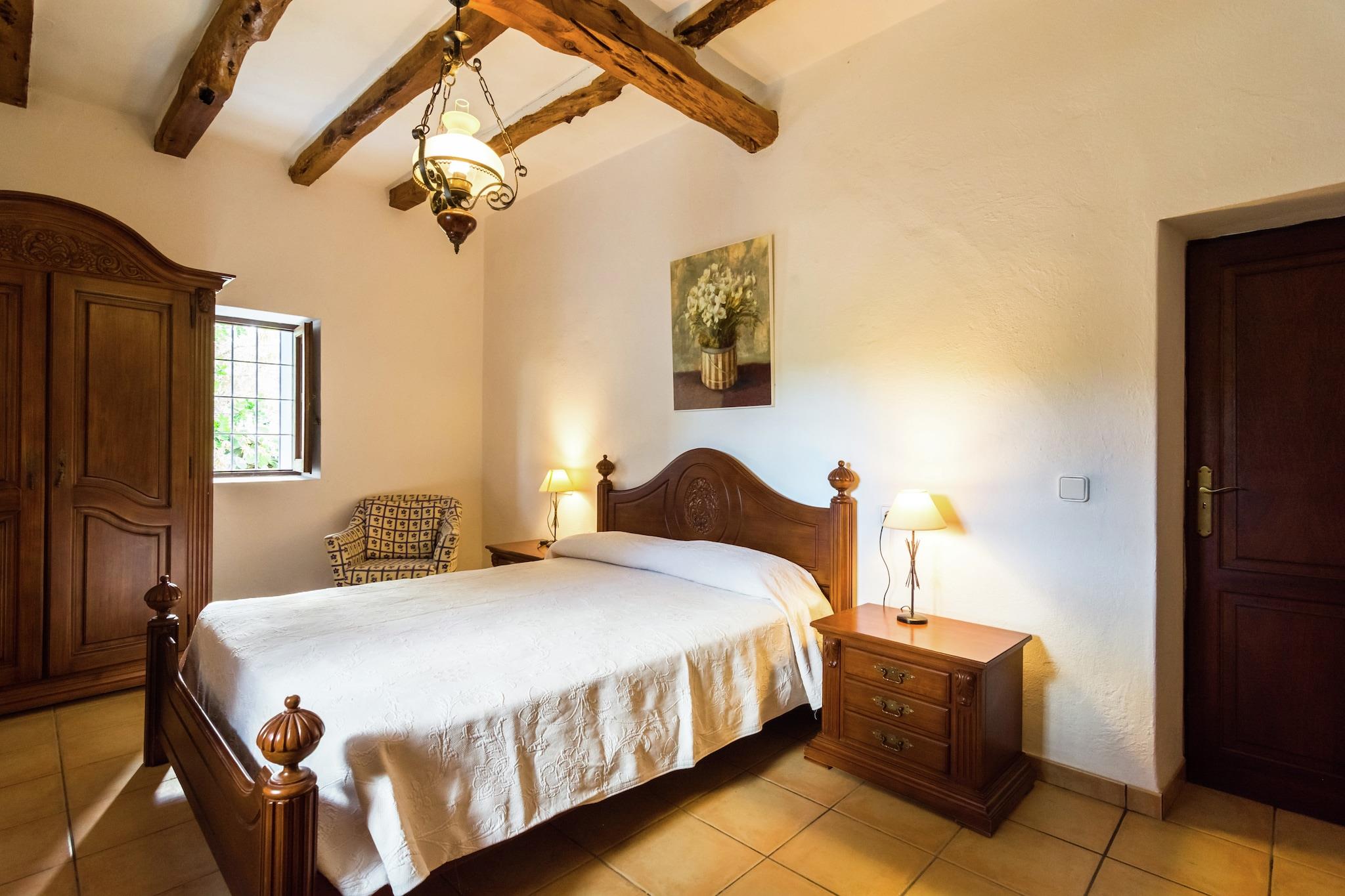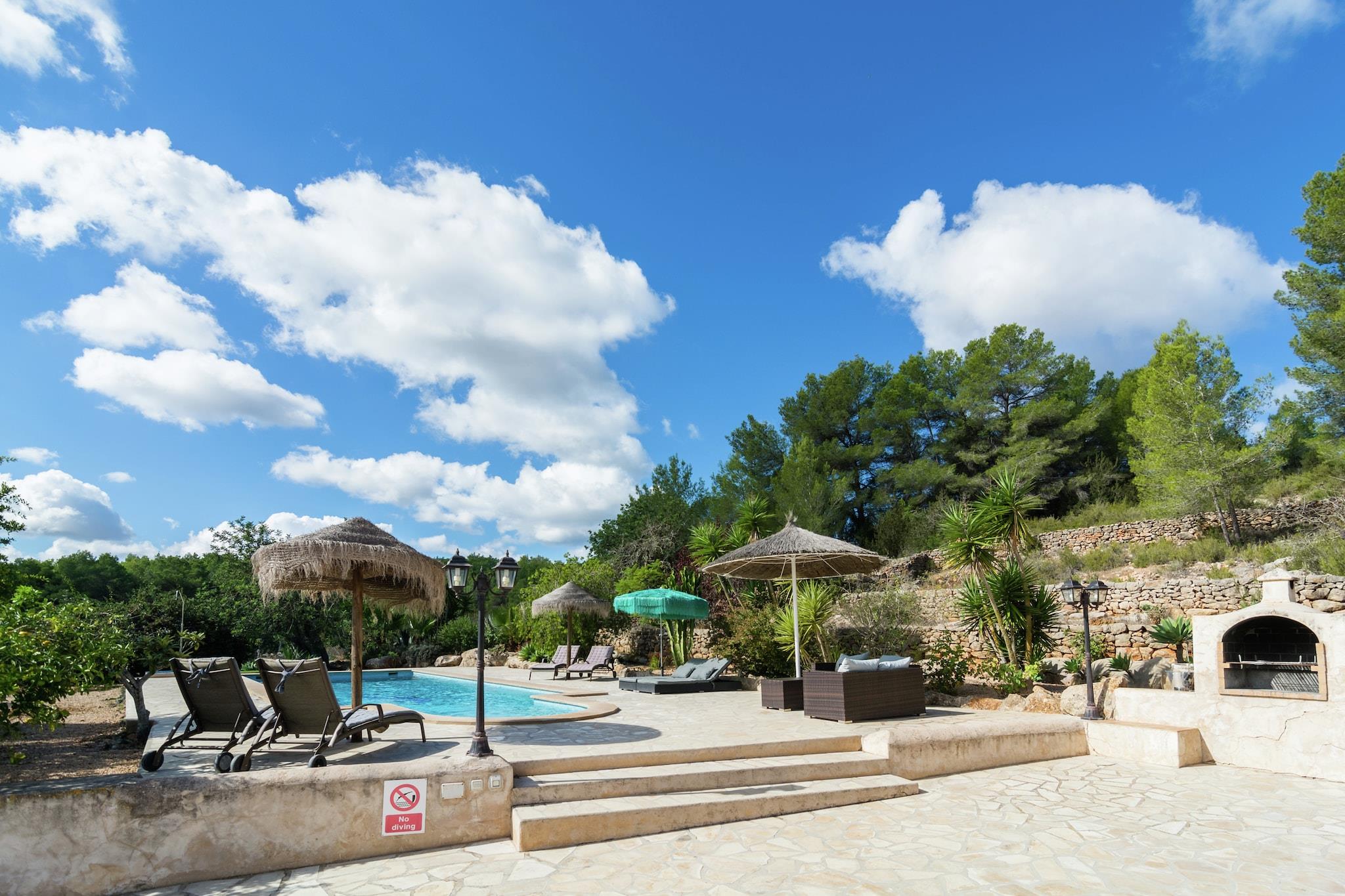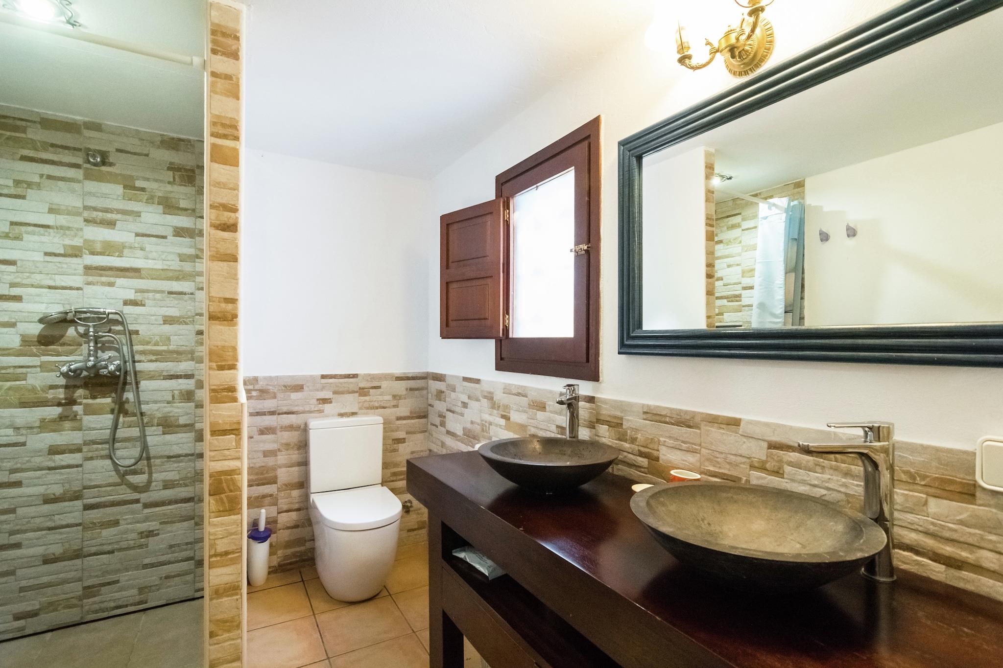 Can Bosque er en finca i Santa Agnes. Finca er 300 år gammel. Det er roligt beliggende i det kuperede landskab i Santa Agnes. Det er omgivet af smukke grunde med århundreder gamle oliventræer. Finca er mellem San Mateo og Santa Agnes, to små landsbyer med en smuk kirke og en restaurant. Hjemmet ligger 15 minutter i bil fra Cala Salada-stranden. Det er 5 minutter i bil fra Santa Agnes med sin berømte dal af mandeltræer. På 20 km fra Can Bosque finder du den hyggelige by Ibiza Town. Hele området er perfekt til vandrere og folk, der nyder at opdage små bugter og indløb væk fra trængsel og travlhed. Grundene er helt lukket. Du går ind gennem elektroniske porte. Der er en stor terrasse foran huset med en 11 x 4 m swimmingpool. Der er en mursten bygget grill og en overdækket terrasse med spisebord. Hovedhuset har en stor stue med et attraktivt opholdsområde, pejs, satellit-tv, stereoanlæg og et smukt gammelt bjælkeloft. Franske vinduer åbner ud mod terrassen. Det tilstødende køkken er udstyret med keramisk kogeplade, ovn, mikroovn, stort køleskab og opvaskemaskine. Det har en komfortabel spiseplads. Næste er opbevaringsområdet med vaskemaskine. Der er to soveværelser støder op til stuen. Den ene er et soveværelse med dobbeltseng, den anden har to enkeltsenge. Begge har eget badeværelse med badekar, bruser og toilet. Trin fører op til det tredje soveværelse. Dette har en dobbeltseng, eget badeværelse med badekar, bruser og toilet. Alle værelser har aircondition.