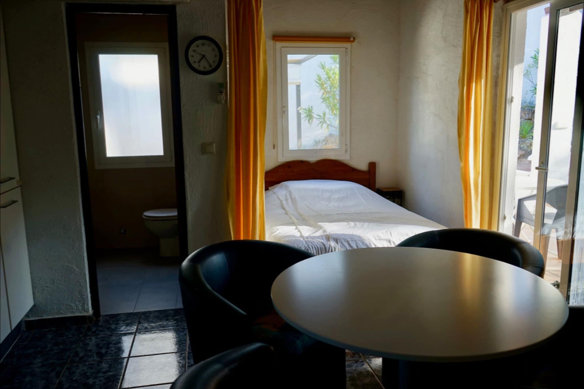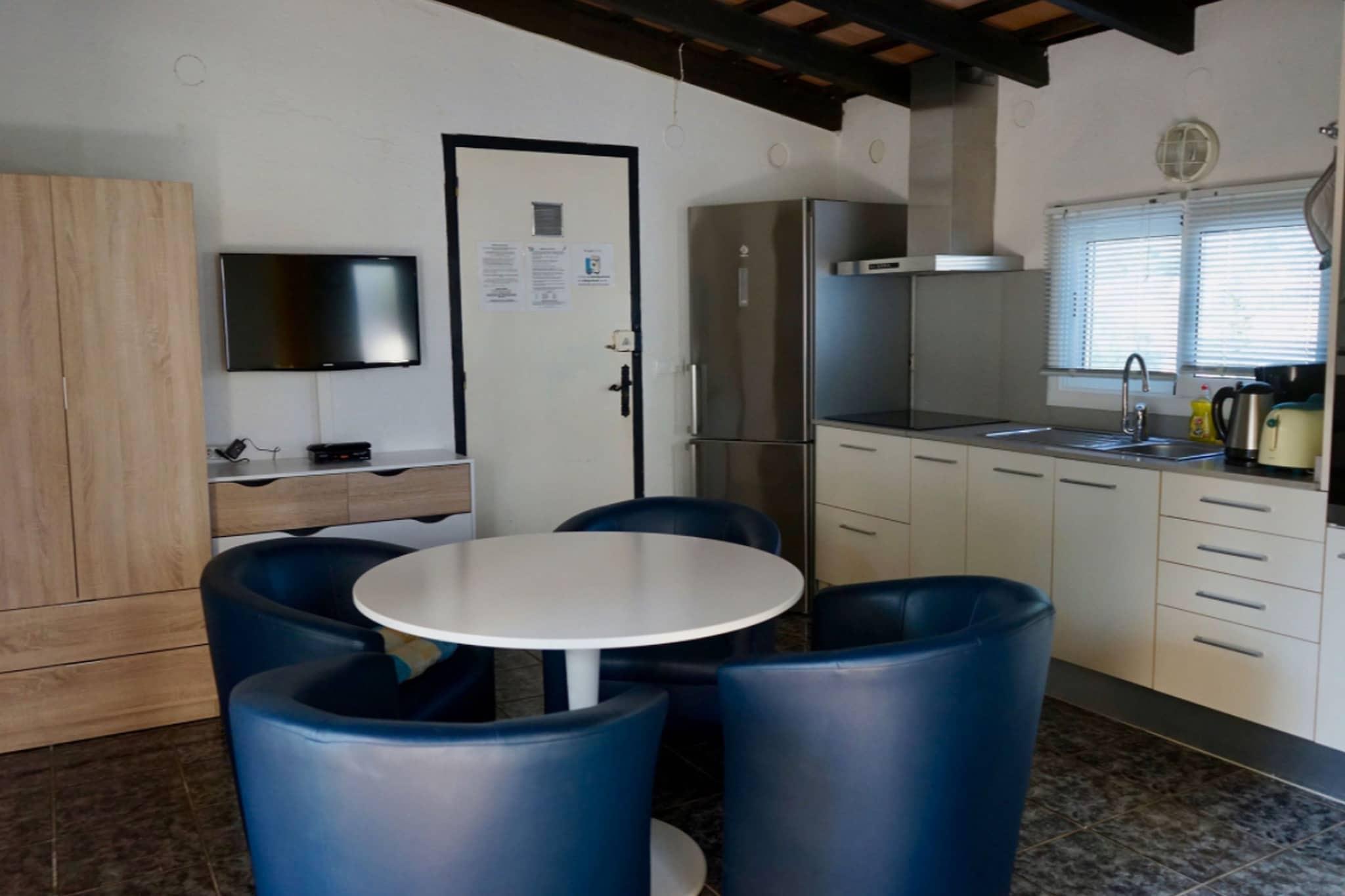 Stueetage: (åbent køkken(kaffemaskine, ovn, mikrobølgeovn, køle-fryseskab), Stue/soveværelse(dobbeltseng, spisebord, varme, klimaanlæg), soveværelse(køjeseng), badeværelse(bruser, håndvask, toilet)) grill, swimmingpool(privat)