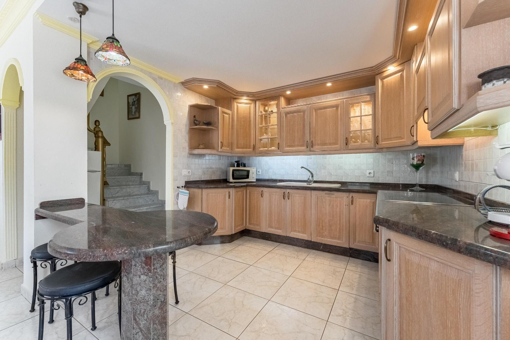 Stueetage: (Indgang (deles med andre gæster, adgang udefra), Stue(Fjernsyn(fladskærm, Internationale TV-kanaler), sofahjørne), Køkken(kogeplade, elkedel, emhætte, kaffemaskine, ovn, mikrobølgeovn, køle-fryseskab), soveværelse(dobbeltseng eller 2 enkeltsenge Senge), badeværelse(bruser, håndvask, toilet), klimaanlæg) terrasse(privat), have(privat), parking lot(public), swimmingpool(deles med andre gæster, udendørs, opvarmet, opened from Jan upto and including Dec), strygebræt, strygejern