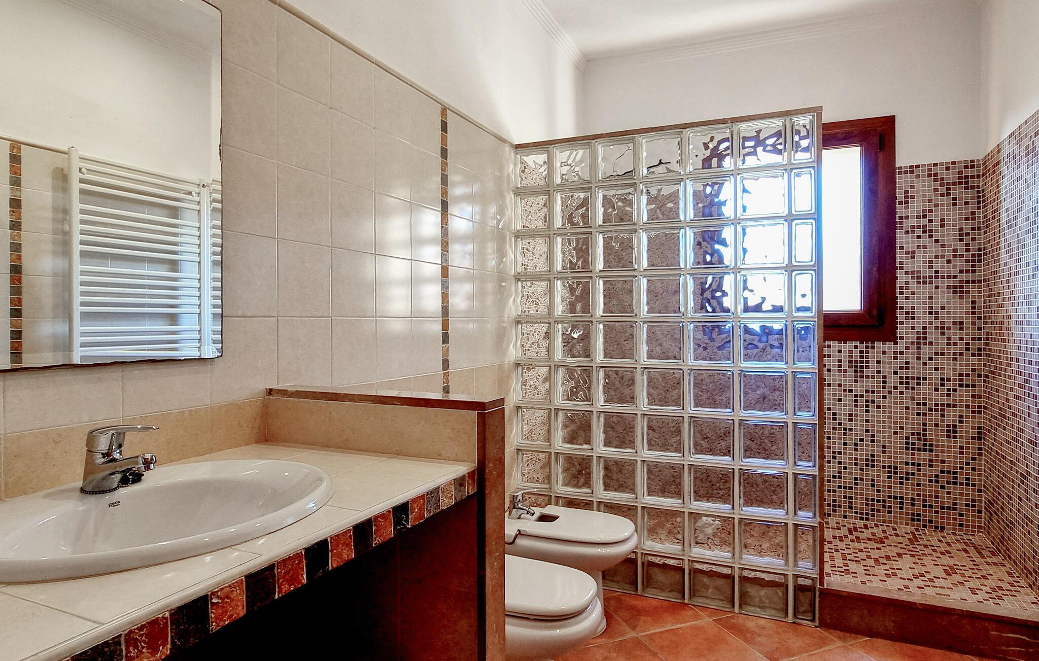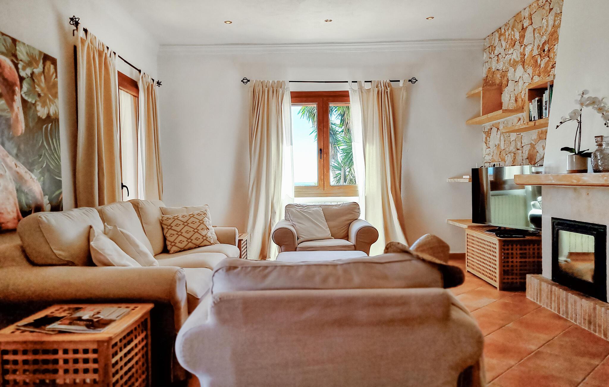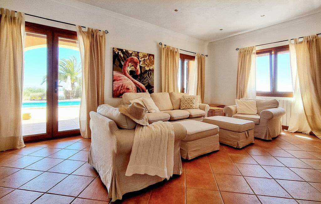 Velkommen til denne flotte og virkelig rummelige finca, der ligger i vidunderlige omgivelser i Sa Teulera og byder på masser af plads og komfort til et ophold med den store familie. Indvendigt emmer det af kvalitet, komfort og autentisk middelhavs-look over hele linjen. Den rummelige stue med store vinduespartier lukker masser af lys ind og byder på en betagende udsigt over det omkringliggende landskab. Køkkenet er stort og veludstyret, så lad blot familiens kokke kræse om livretterne, mens andre flader ud i sofaerne eller dækker op til den helt store festmiddag ved spisebordet.