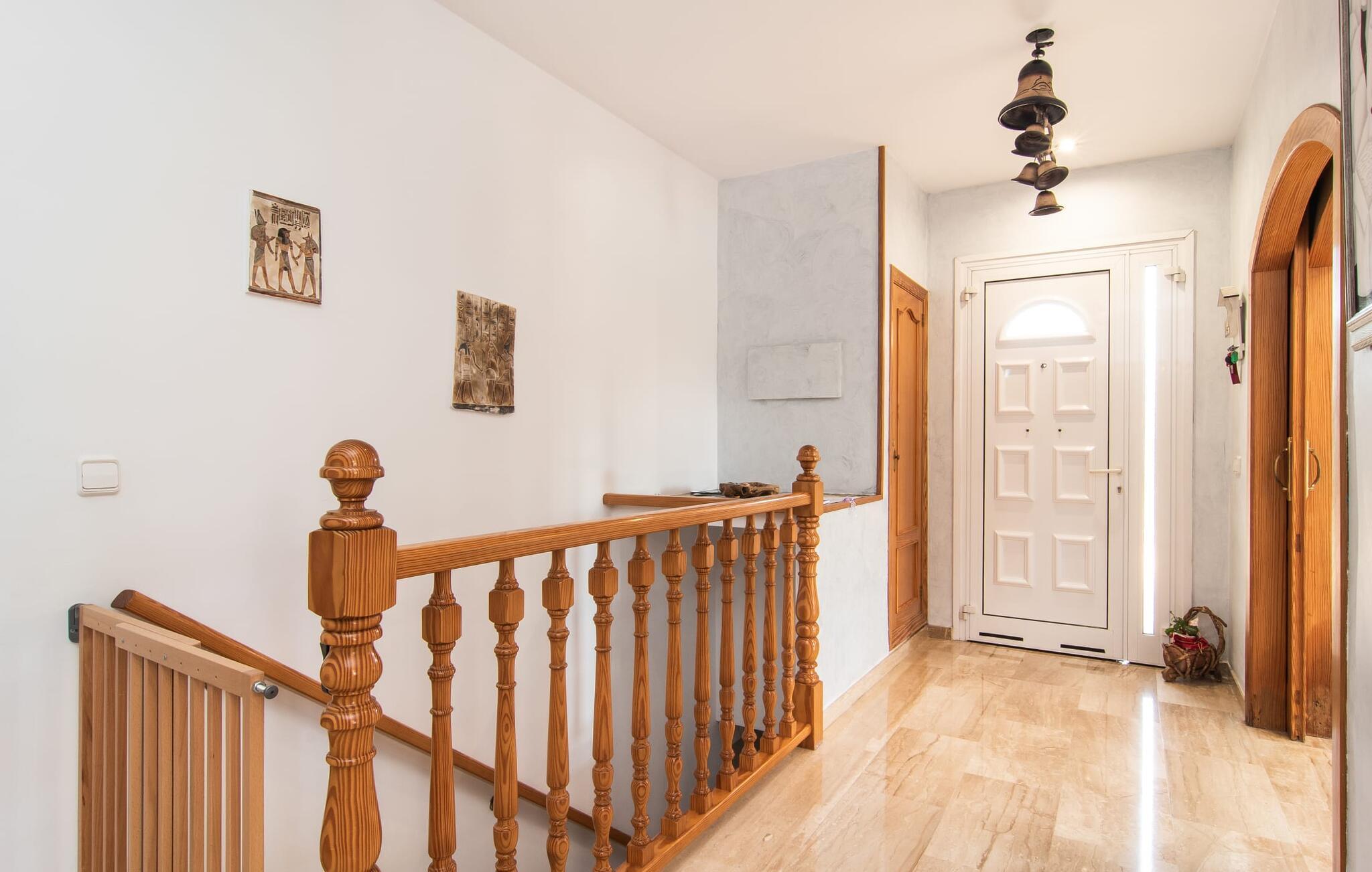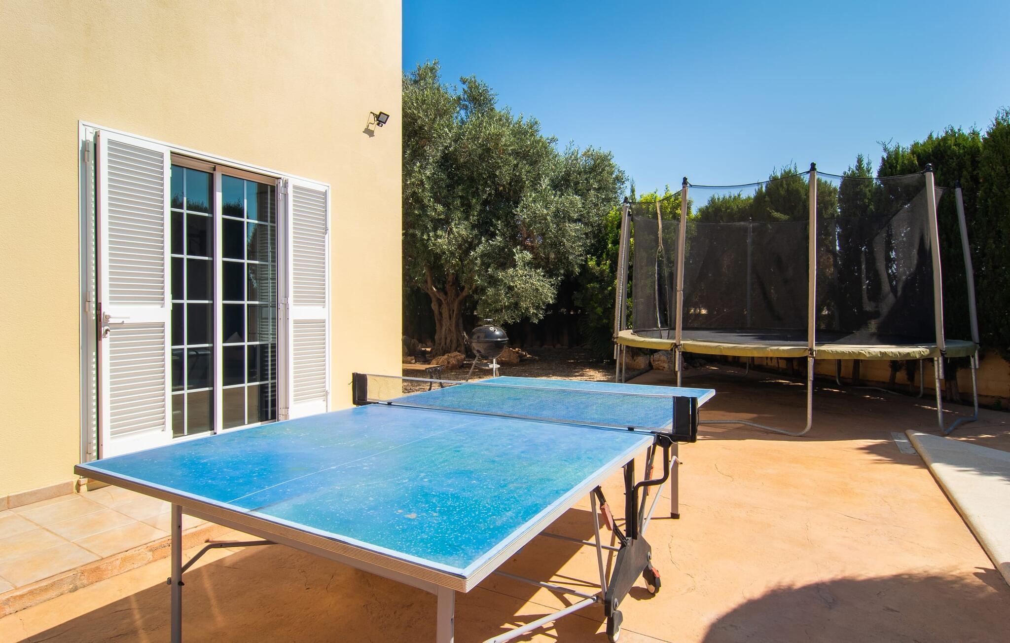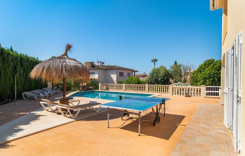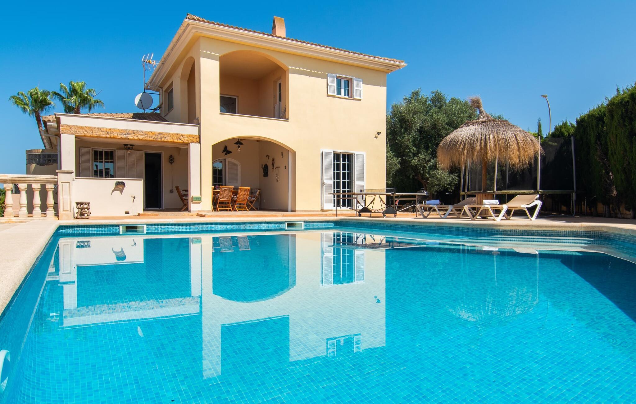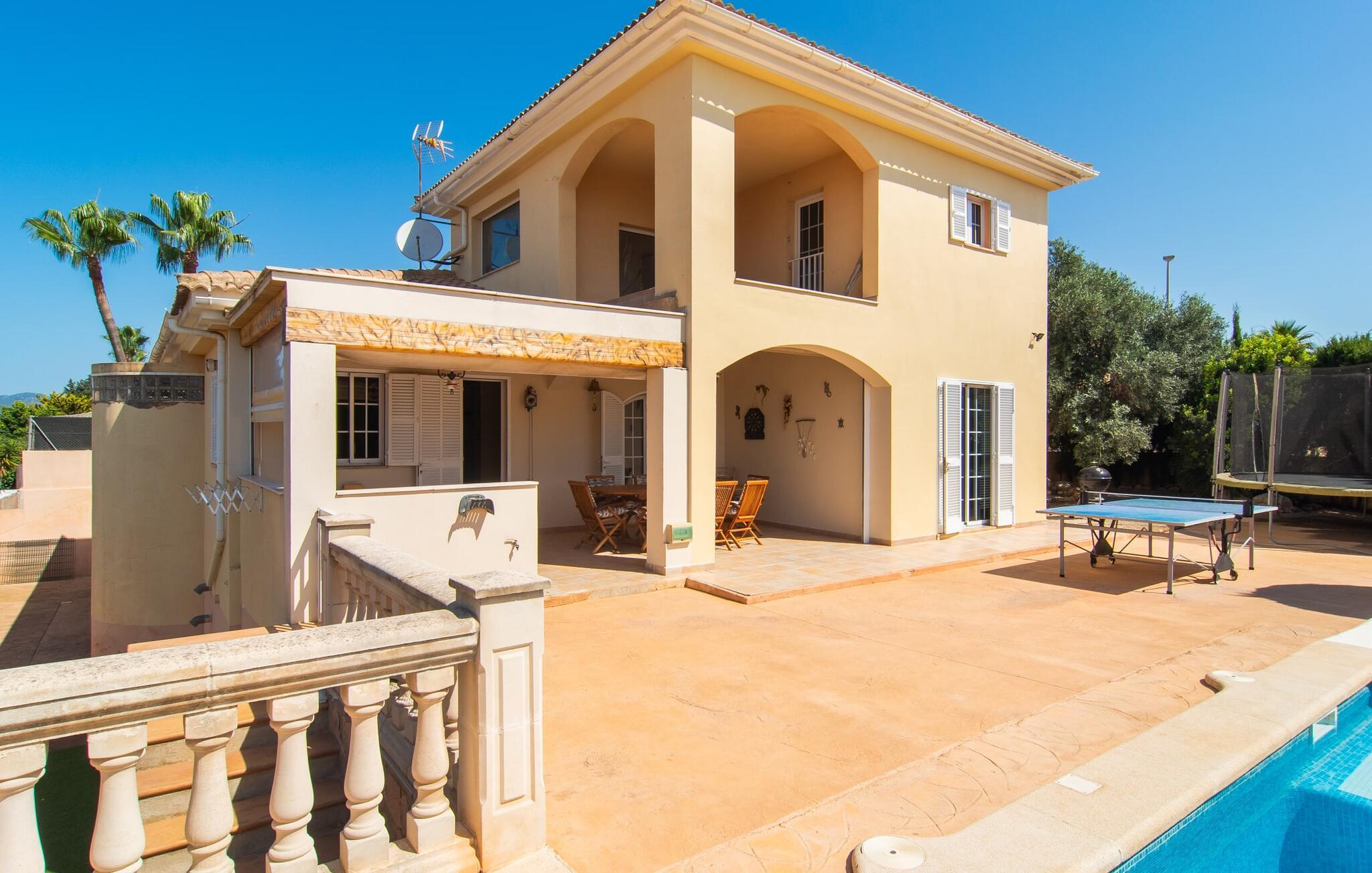 Villa "Sayana" er det perfekte tilflugtssted for gæster, der ønsker at udforske Palma og nyde en fredelig ferie på samme tid. Dette omhyggeligt vedligeholdte feriehus ligger lige uden for hovedstaden og har en privat pool og en frodig have med oliven- og palmetræer. Slap af på liggestolene ved poolen, mens de små morer sig på trampolinen og spiller bordtennis. Den skyggefulde veranda, der støder op til huset, giver et behageligt sted at slappe af på varme sommerdage eller køligere aftener, suppleret med en grill til afslappet spisning. Indenfor byder villaen på moderne komfort med lyse, luftige rum. Den indbydende opholds- og spisestue åbner direkte ud til terrassen gennem gulv-til-loft glasdøre. Det fuldt udstyrede køkken giver mulighed for nem selvforplejning. Villaen kan rumme op til seks gæster og har tre smukt designede soveværelser samt en ekstra sovemulighed på et åbent galleri, der er tilgængeligt fra stuen. To moderne badeværelser, hvoraf det ene har spabad, fuldender den luksuriøse oplevelse. Villa "Sayana" lover et behageligt ophold - book jeres ferie i dag! Den smarte byvilla "Sayana" i et boligområde i Palma. Byejendommen ligger i udkanten af byen og er derfor strategisk placeret for udflugter til fods eller i bil. Strandene i Palma-bugten kan også nås på en kort køretur. Elektricitet er inkluderet i prisen, hvis den anvendes hensigtsmæssigt. I sjældne tilfælde vil I blive opkrævet gebyret kontant på stedet. Den valgfri brug af varmen faktureres kontant på stedet.