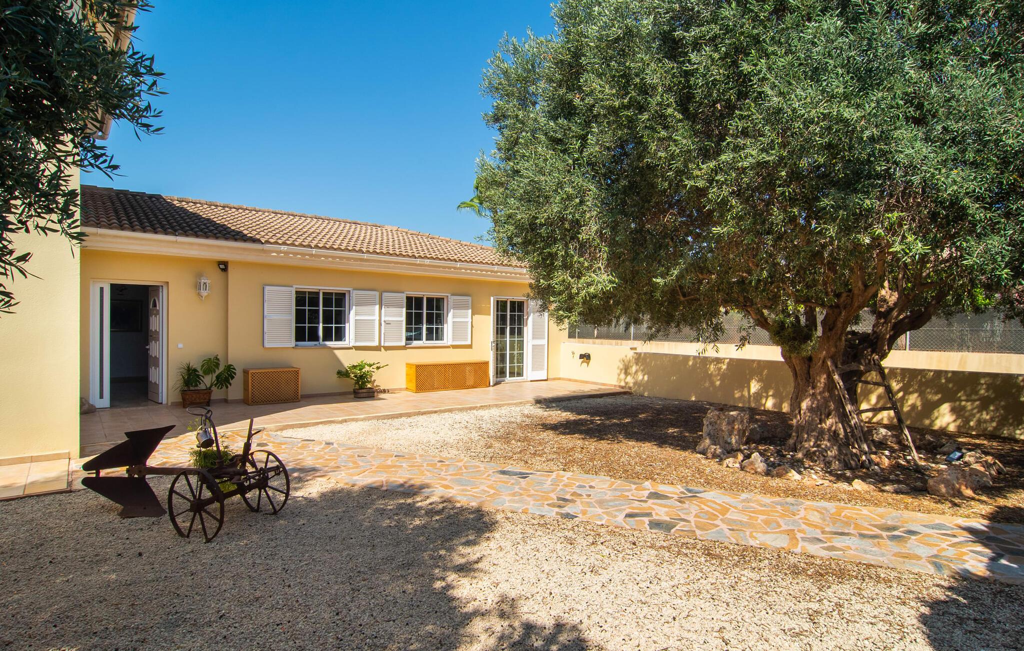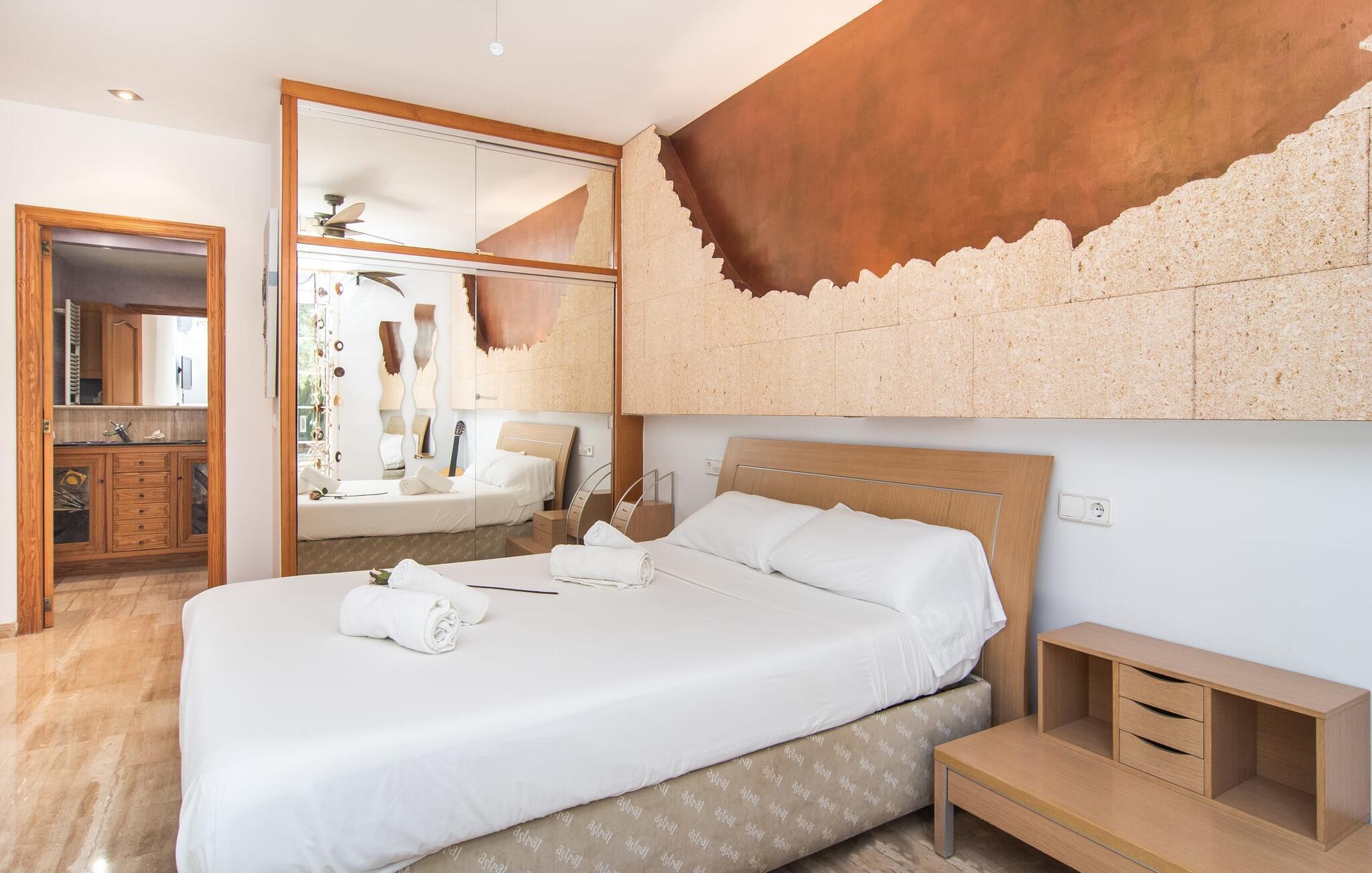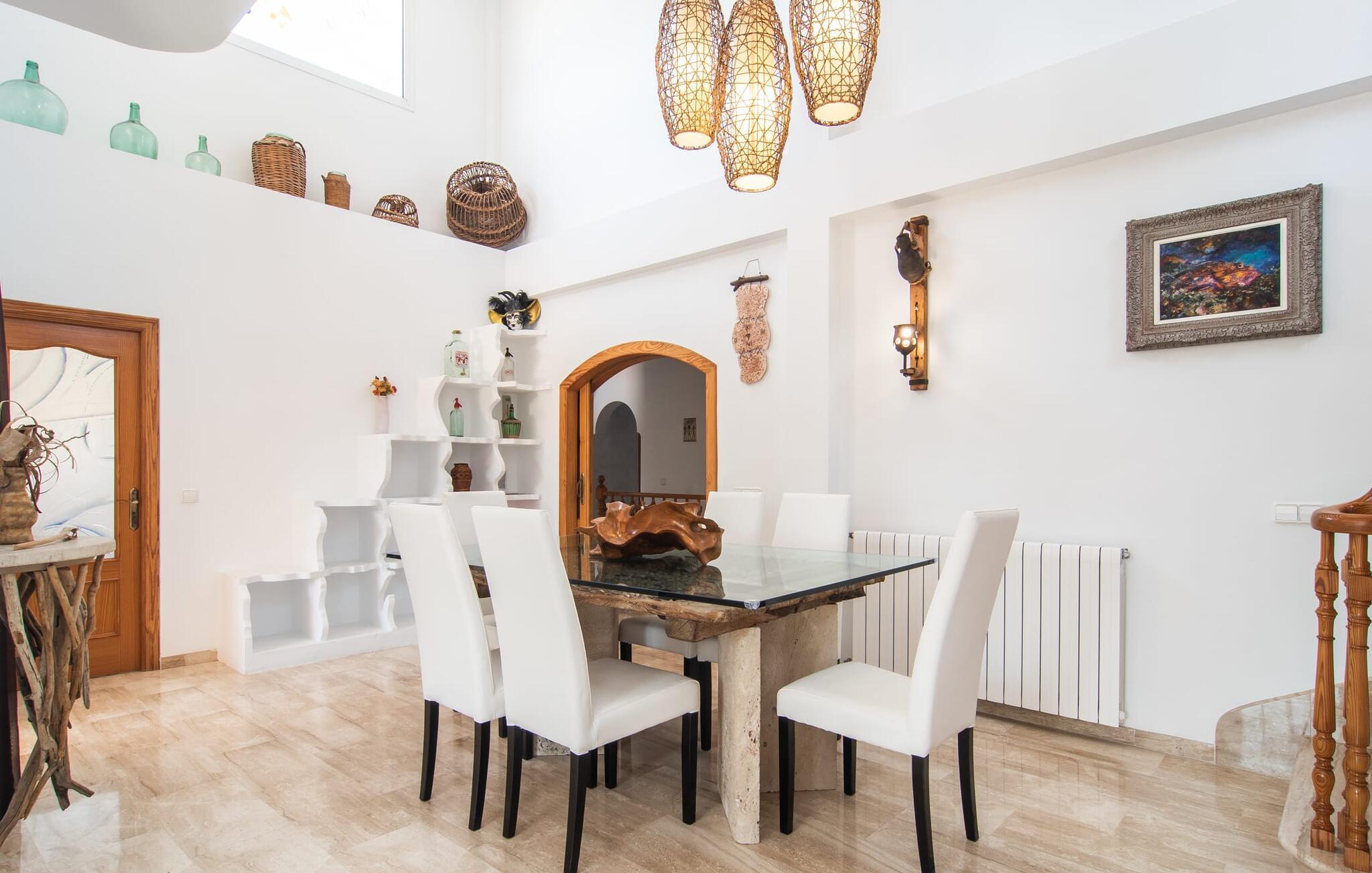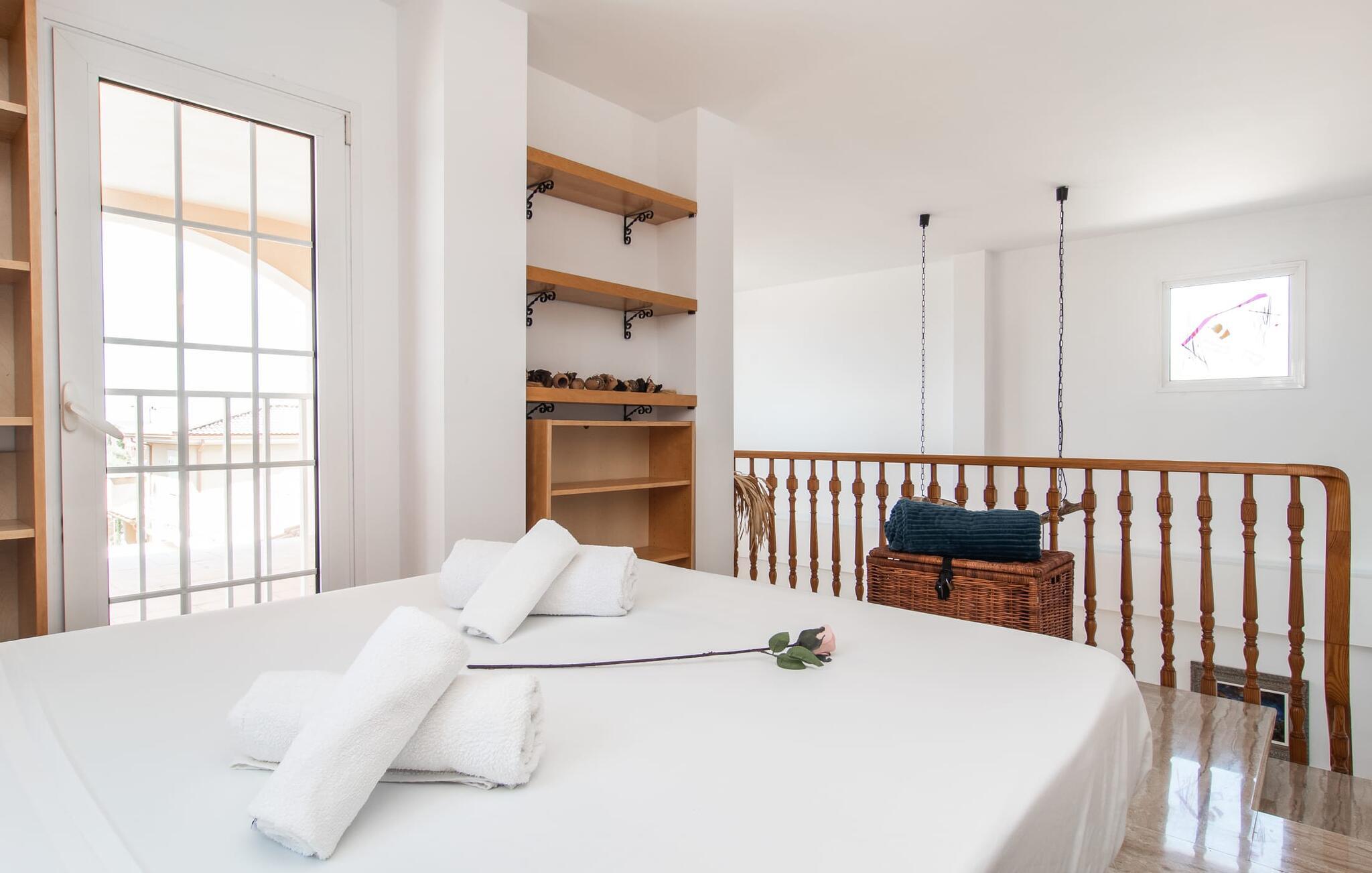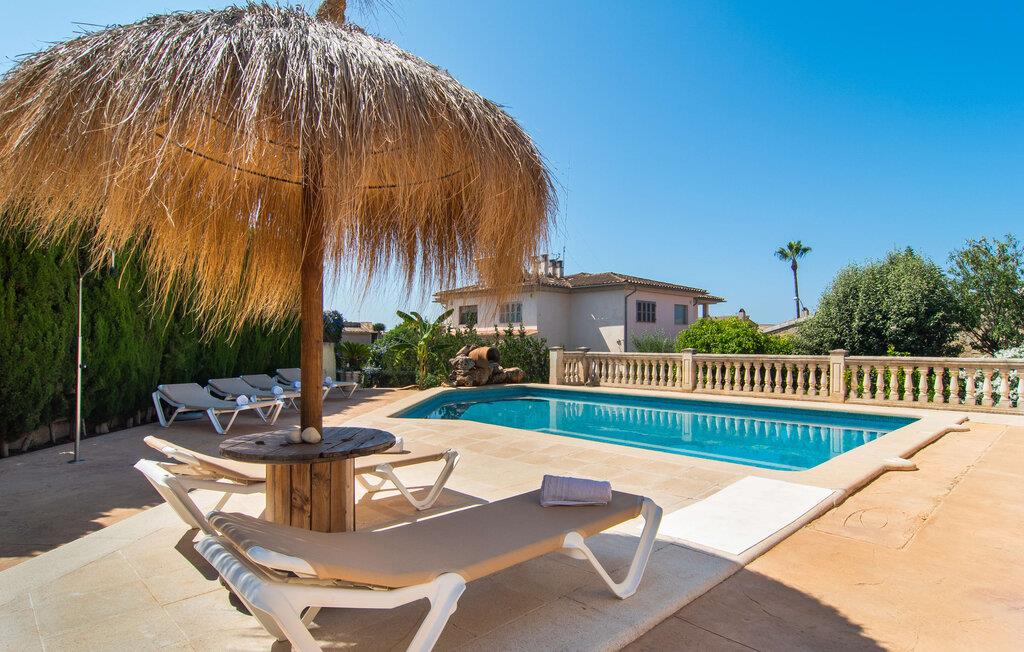 Villa "Sayana" er det perfekte tilflugtssted for gæster, der ønsker at udforske Palma og nyde en fredelig ferie på samme tid. Dette omhyggeligt vedligeholdte feriehus ligger lige uden for hovedstaden og har en privat pool og en frodig have med oliven- og palmetræer. Slap af på liggestolene ved poolen, mens de små morer sig på trampolinen og spiller bordtennis. Den skyggefulde veranda, der støder op til huset, giver et behageligt sted at slappe af på varme sommerdage eller køligere aftener, suppleret med en grill til afslappet spisning. Indenfor byder villaen på moderne komfort med lyse, luftige rum. Den indbydende opholds- og spisestue åbner direkte ud til terrassen gennem gulv-til-loft glasdøre. Det fuldt udstyrede køkken giver mulighed for nem selvforplejning. Villaen kan rumme op til seks gæster og har tre smukt designede soveværelser samt en ekstra sovemulighed på et åbent galleri, der er tilgængeligt fra stuen. To moderne badeværelser, hvoraf det ene har spabad, fuldender den luksuriøse oplevelse. Villa "Sayana" lover et behageligt ophold - book jeres ferie i dag! Den smarte byvilla "Sayana" i et boligområde i Palma. Byejendommen ligger i udkanten af byen og er derfor strategisk placeret for udflugter til fods eller i bil. Strandene i Palma-bugten kan også nås på en kort køretur. Elektricitet er inkluderet i prisen, hvis den anvendes hensigtsmæssigt. I sjældne tilfælde vil I blive opkrævet gebyret kontant på stedet. Den valgfri brug af varmen faktureres kontant på stedet.