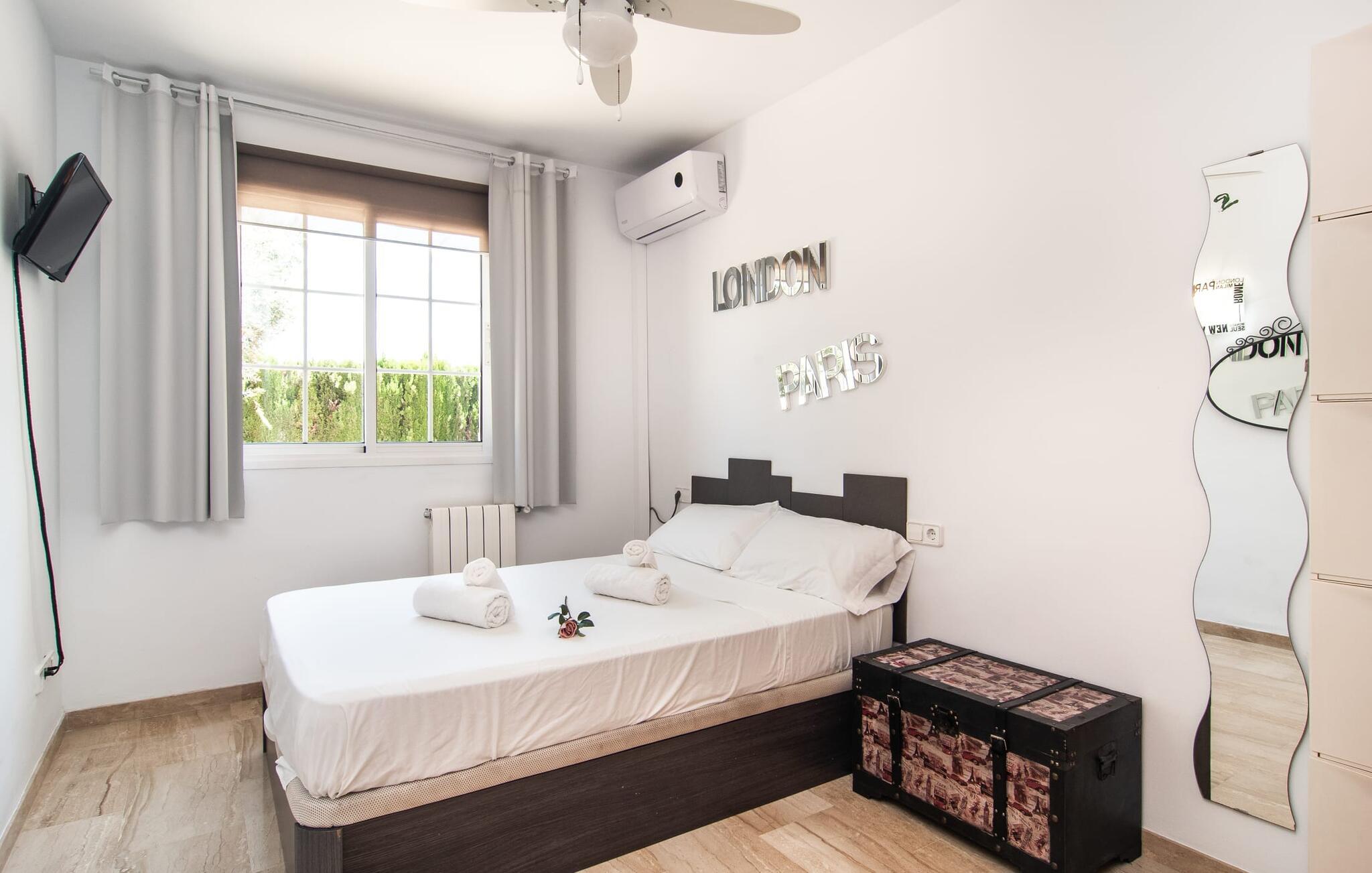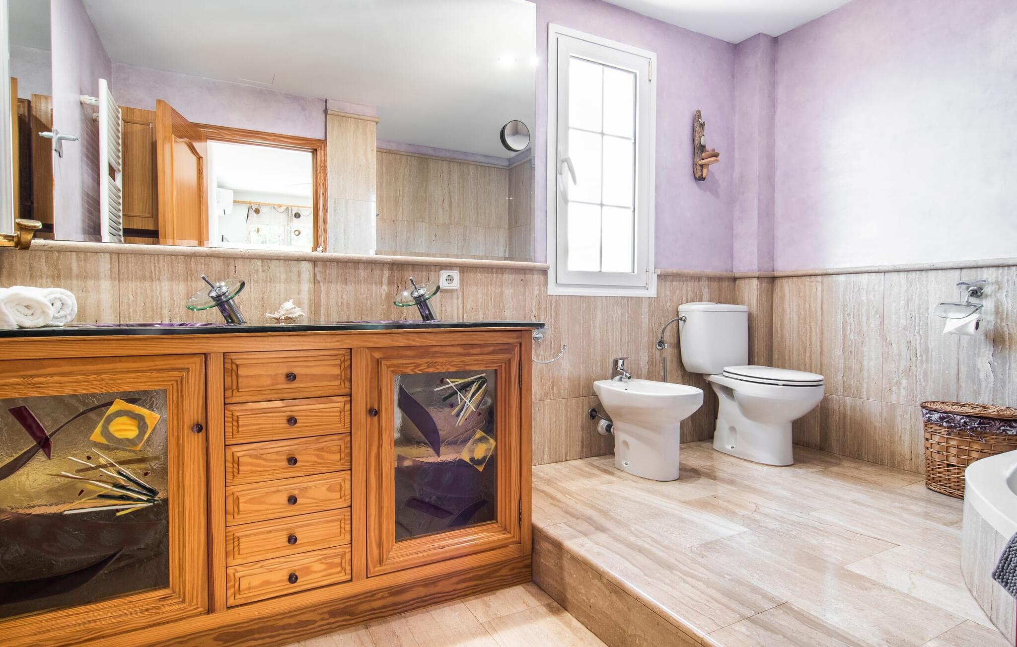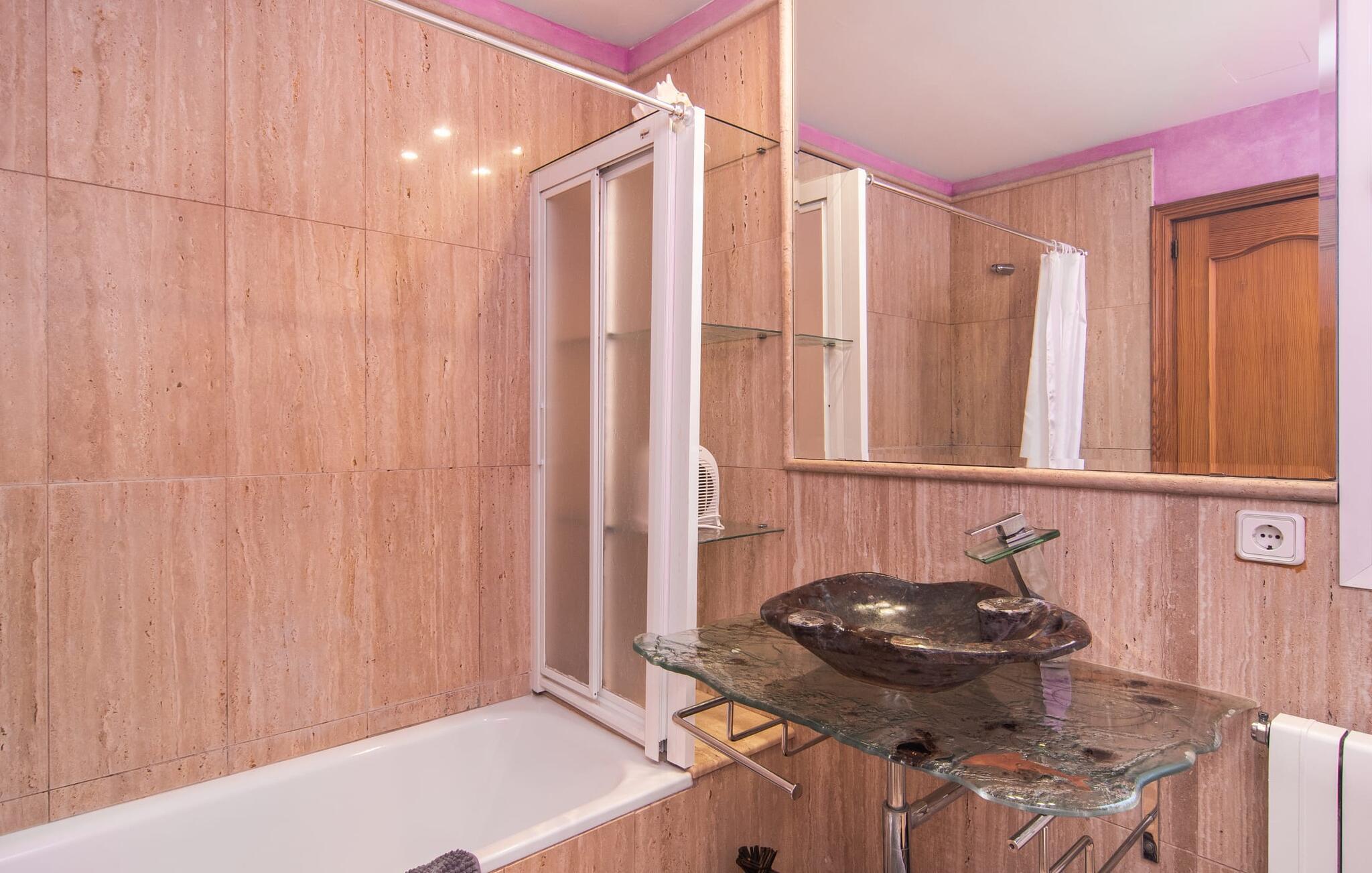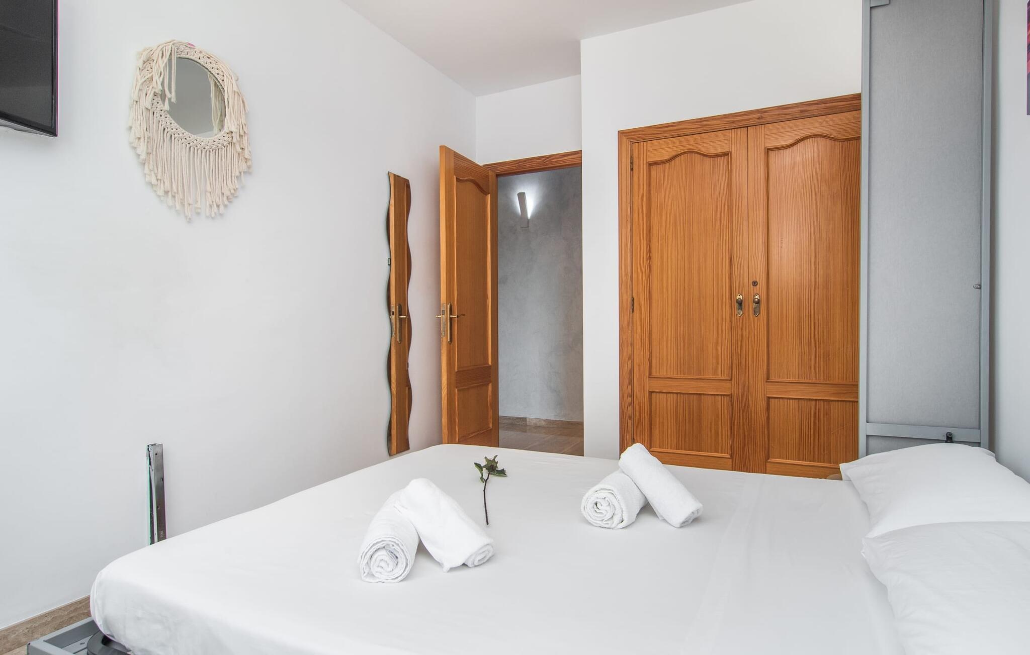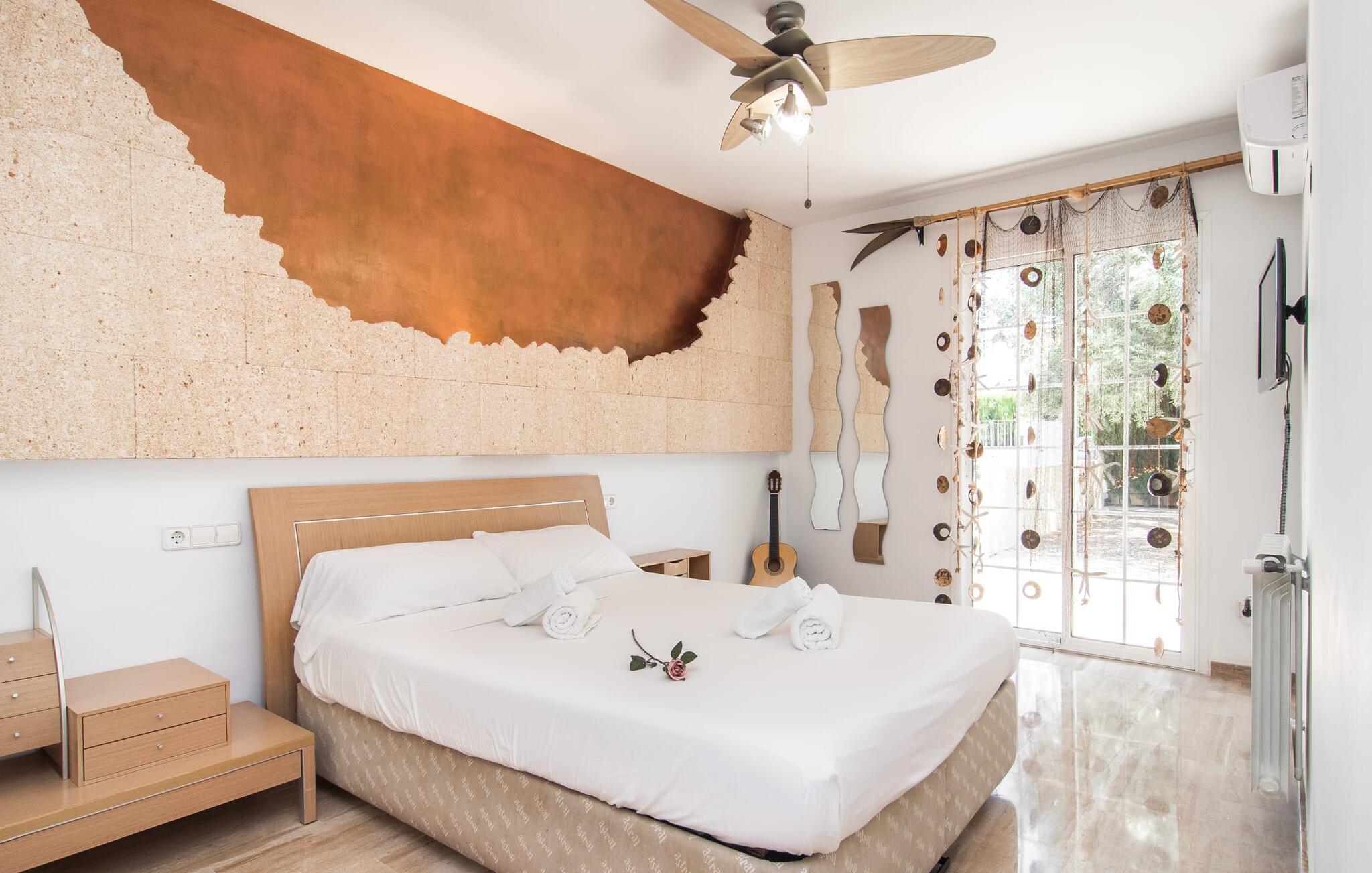 Villa "Sayana" er det perfekte tilflugtssted for gæster, der ønsker at udforske Palma og nyde en fredelig ferie på samme tid. Dette omhyggeligt vedligeholdte feriehus ligger lige uden for hovedstaden og har en privat pool og en frodig have med oliven- og palmetræer. Slap af på liggestolene ved poolen, mens de små morer sig på trampolinen og spiller bordtennis. Den skyggefulde veranda, der støder op til huset, giver et behageligt sted at slappe af på varme sommerdage eller køligere aftener, suppleret med en grill til afslappet spisning. Indenfor byder villaen på moderne komfort med lyse, luftige rum. Den indbydende opholds- og spisestue åbner direkte ud til terrassen gennem gulv-til-loft glasdøre. Det fuldt udstyrede køkken giver mulighed for nem selvforplejning. Villaen kan rumme op til seks gæster og har tre smukt designede soveværelser samt en ekstra sovemulighed på et åbent galleri, der er tilgængeligt fra stuen. To moderne badeværelser, hvoraf det ene har spabad, fuldender den luksuriøse oplevelse. Villa "Sayana" lover et behageligt ophold - book jeres ferie i dag! Den smarte byvilla "Sayana" i et boligområde i Palma. Byejendommen ligger i udkanten af byen og er derfor strategisk placeret for udflugter til fods eller i bil. Strandene i Palma-bugten kan også nås på en kort køretur. Elektricitet er inkluderet i prisen, hvis den anvendes hensigtsmæssigt. I sjældne tilfælde vil I blive opkrævet gebyret kontant på stedet. Den valgfri brug af varmen faktureres kontant på stedet.