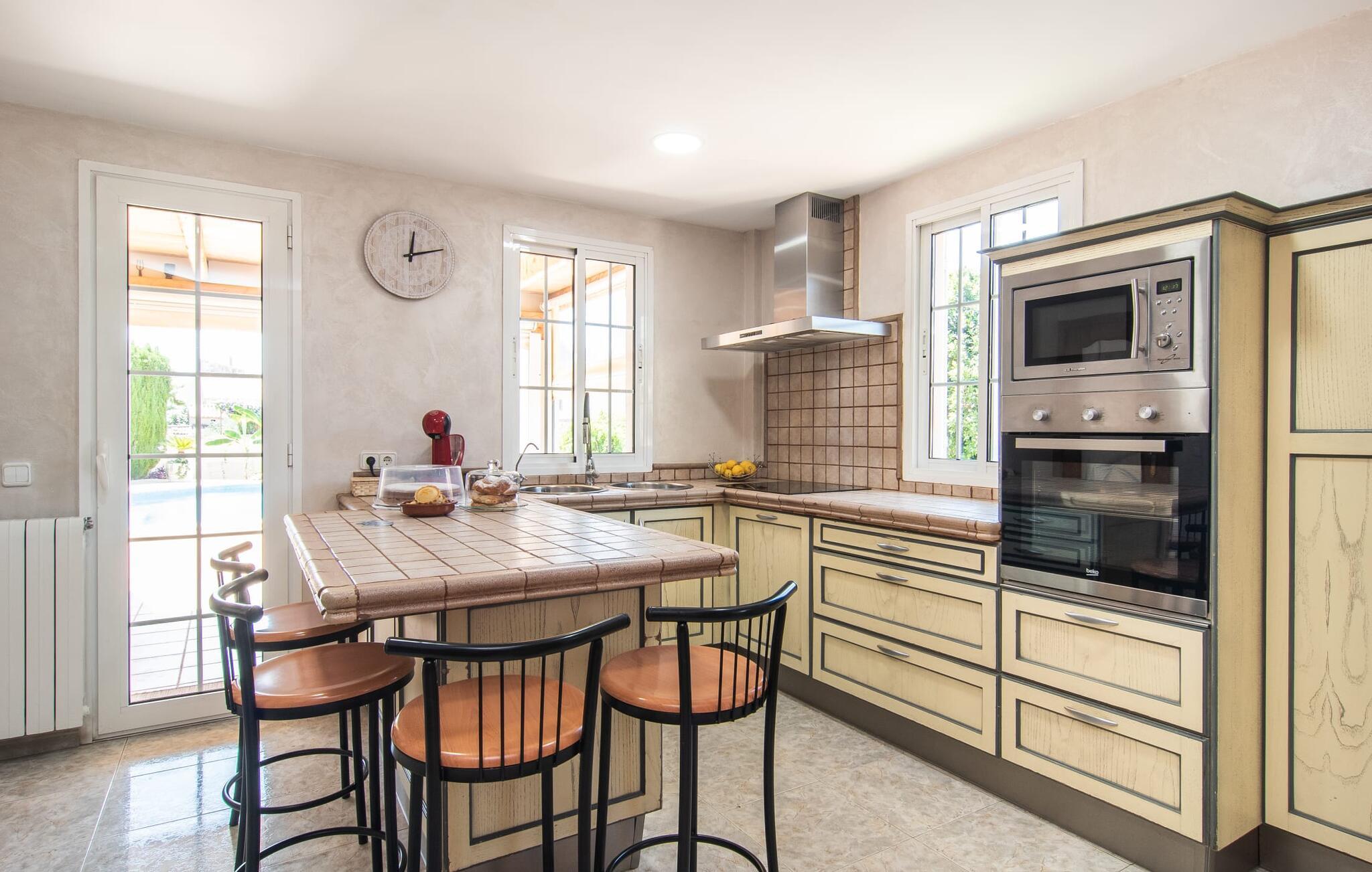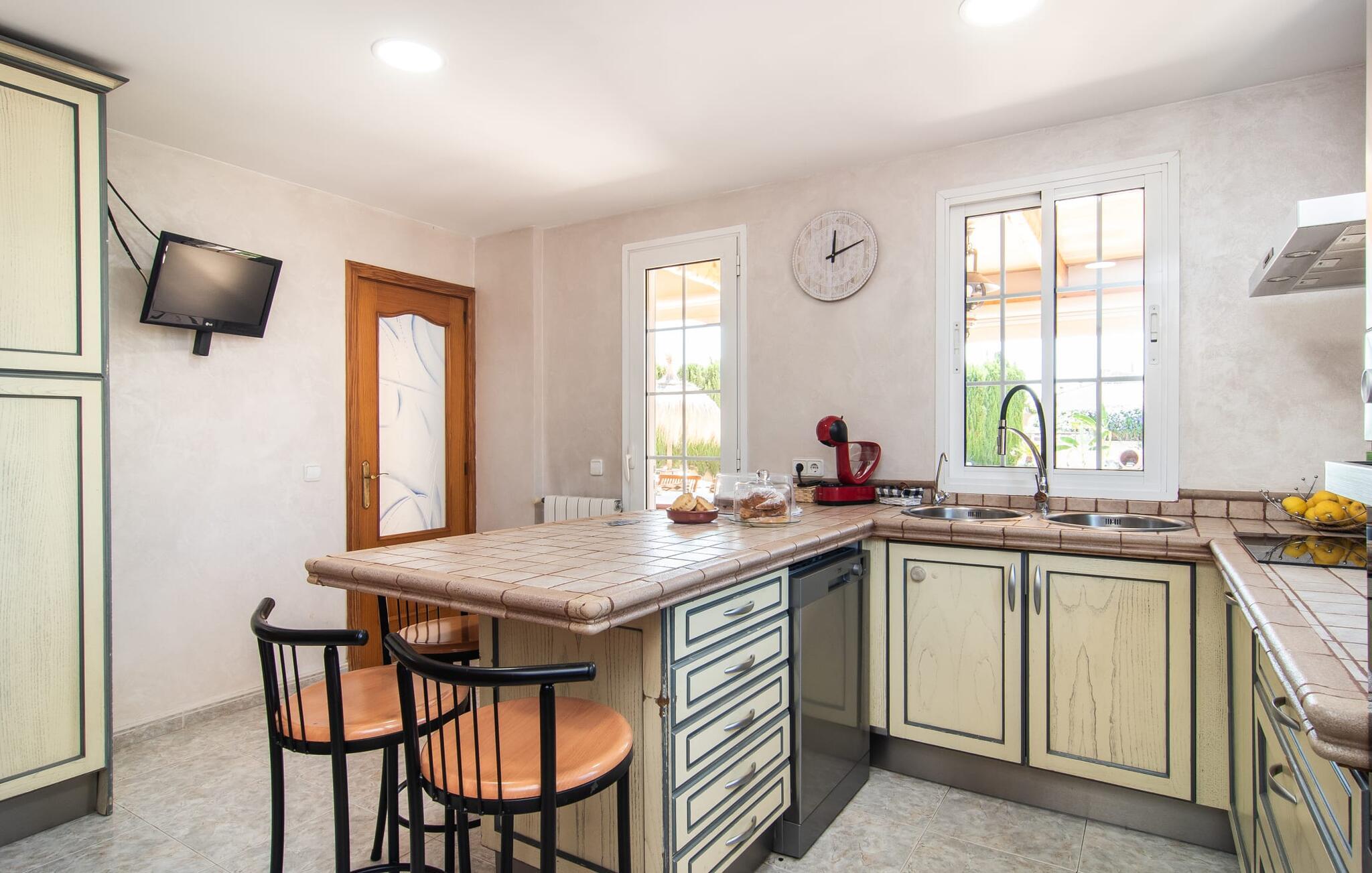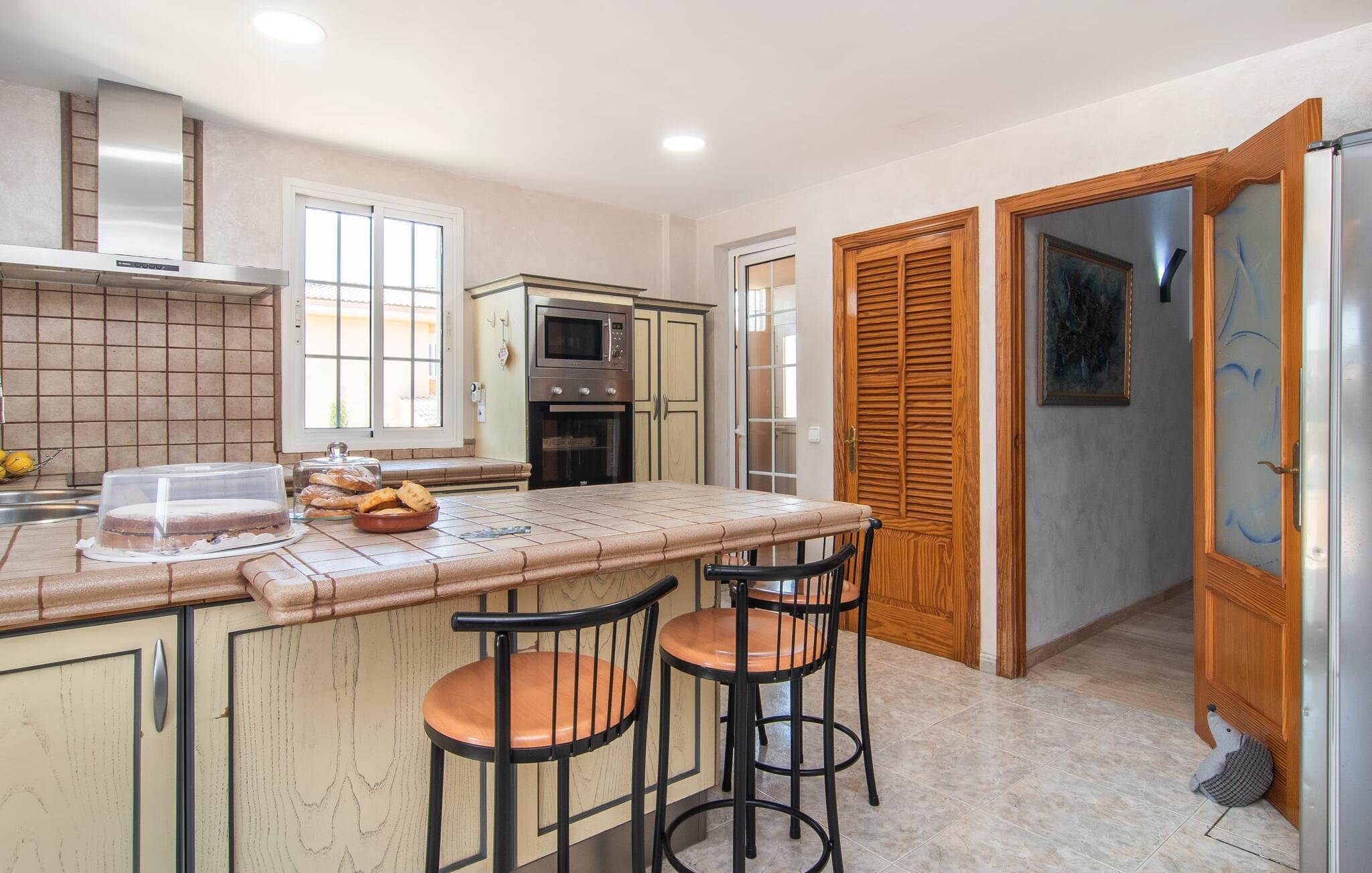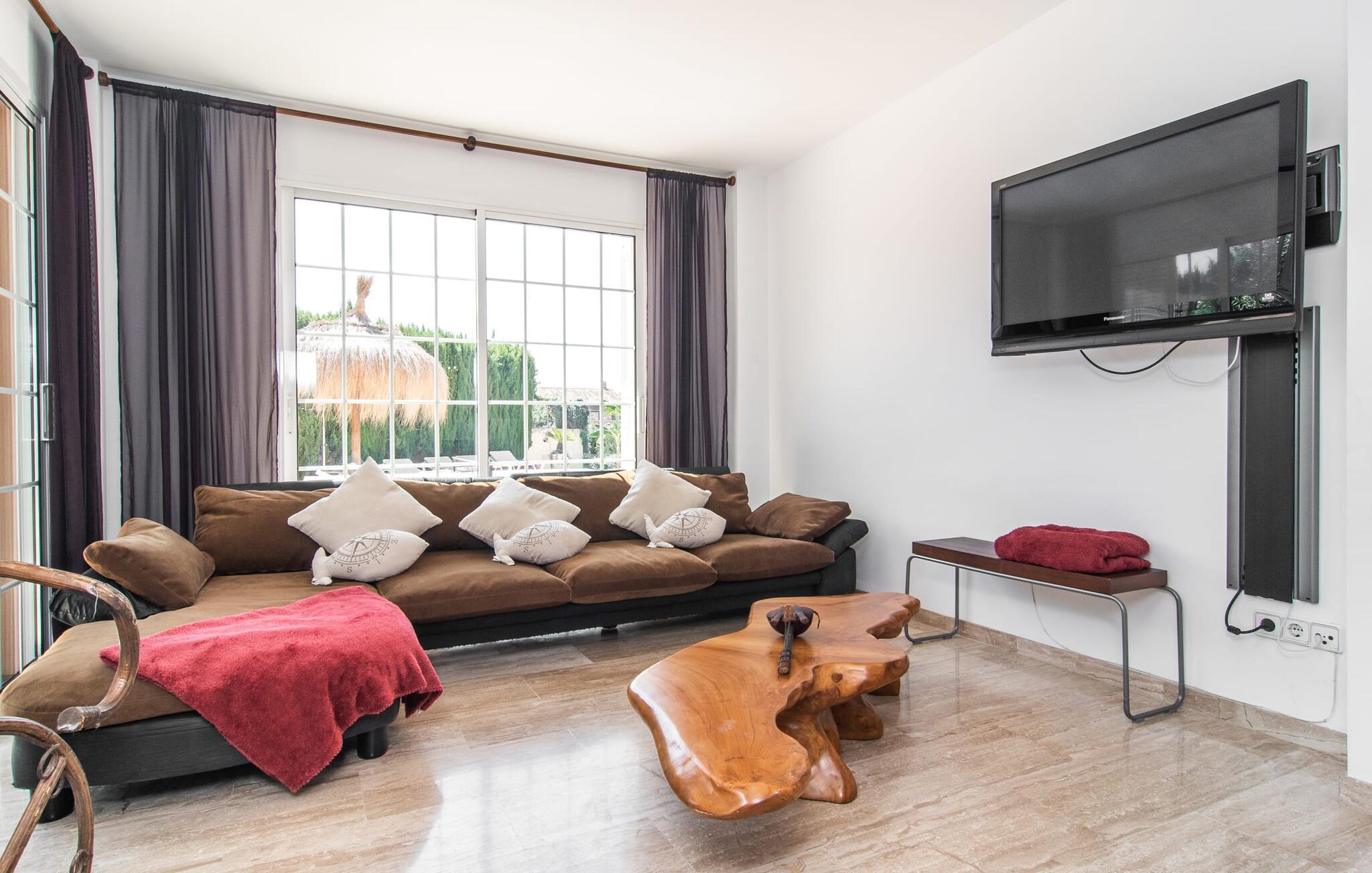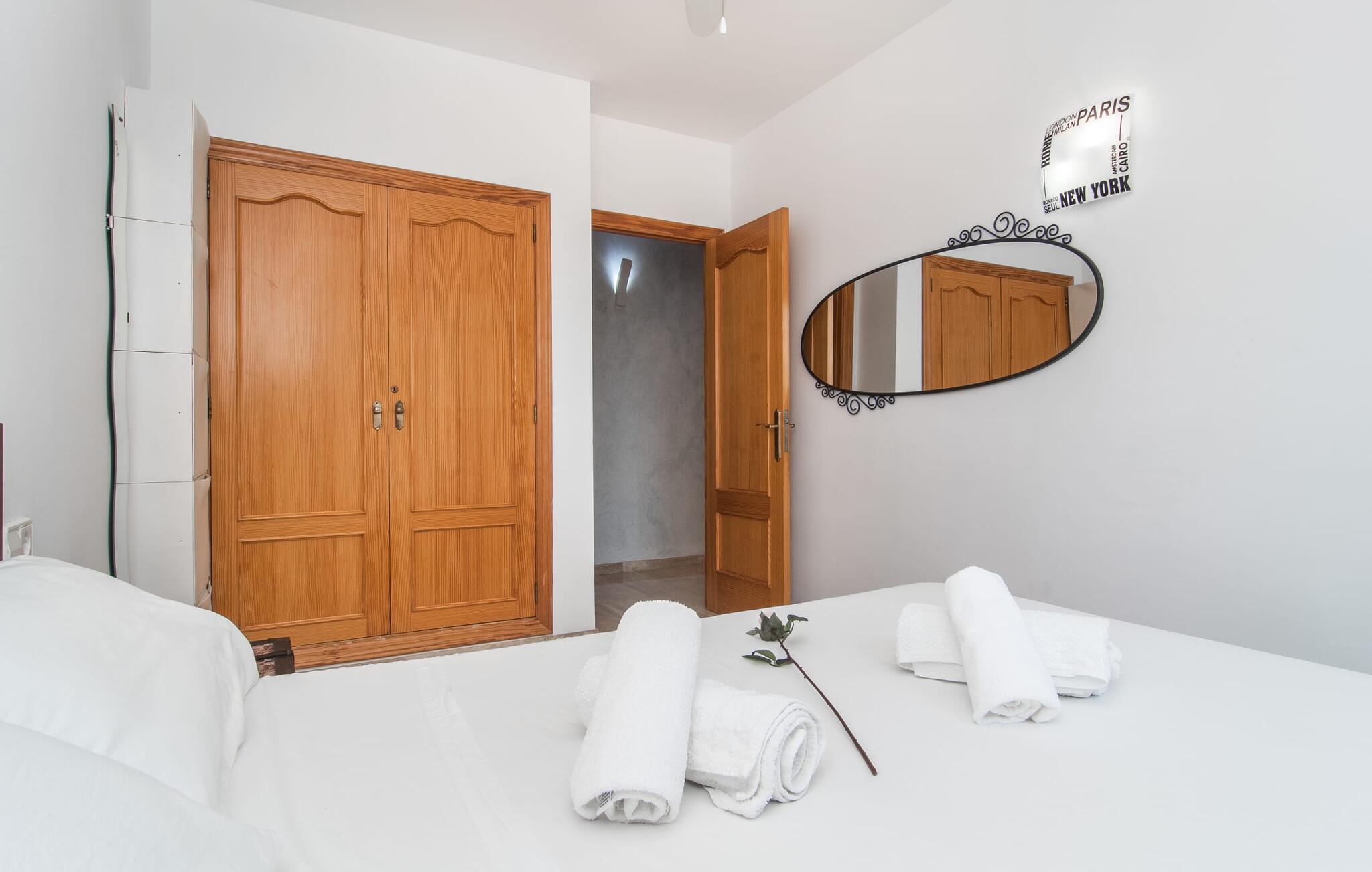 Villa "Sayana" er det perfekte tilflugtssted for gæster, der ønsker at udforske Palma og nyde en fredelig ferie på samme tid. Dette omhyggeligt vedligeholdte feriehus ligger lige uden for hovedstaden og har en privat pool og en frodig have med oliven- og palmetræer. Slap af på liggestolene ved poolen, mens de små morer sig på trampolinen og spiller bordtennis. Den skyggefulde veranda, der støder op til huset, giver et behageligt sted at slappe af på varme sommerdage eller køligere aftener, suppleret med en grill til afslappet spisning. Indenfor byder villaen på moderne komfort med lyse, luftige rum. Den indbydende opholds- og spisestue åbner direkte ud til terrassen gennem gulv-til-loft glasdøre. Det fuldt udstyrede køkken giver mulighed for nem selvforplejning. Villaen kan rumme op til seks gæster og har tre smukt designede soveværelser samt en ekstra sovemulighed på et åbent galleri, der er tilgængeligt fra stuen. To moderne badeværelser, hvoraf det ene har spabad, fuldender den luksuriøse oplevelse. Villa "Sayana" lover et behageligt ophold - book jeres ferie i dag! Den smarte byvilla "Sayana" i et boligområde i Palma. Byejendommen ligger i udkanten af byen og er derfor strategisk placeret for udflugter til fods eller i bil. Strandene i Palma-bugten kan også nås på en kort køretur. Elektricitet er inkluderet i prisen, hvis den anvendes hensigtsmæssigt. I sjældne tilfælde vil I blive opkrævet gebyret kontant på stedet. Den valgfri brug af varmen faktureres kontant på stedet.