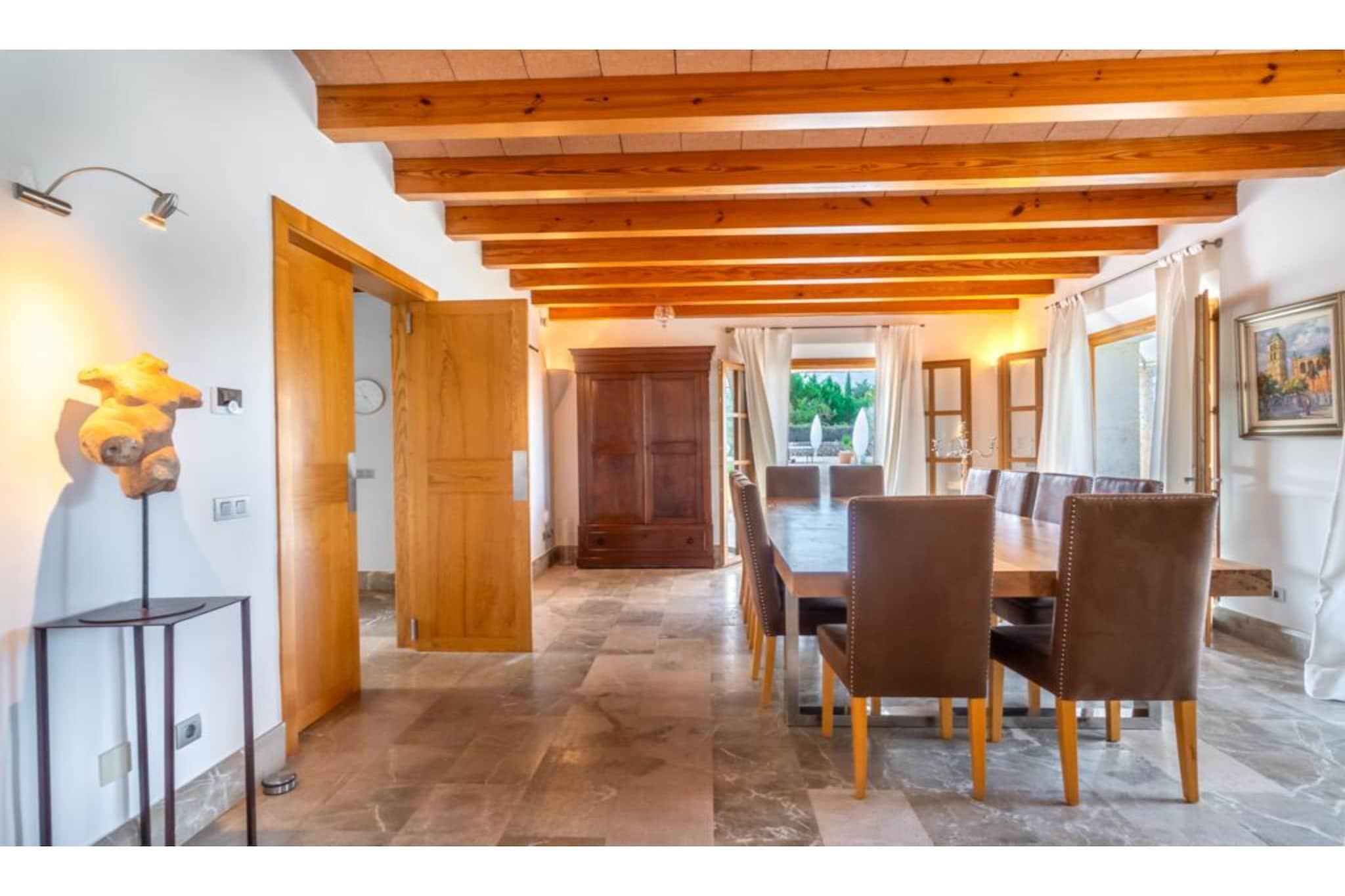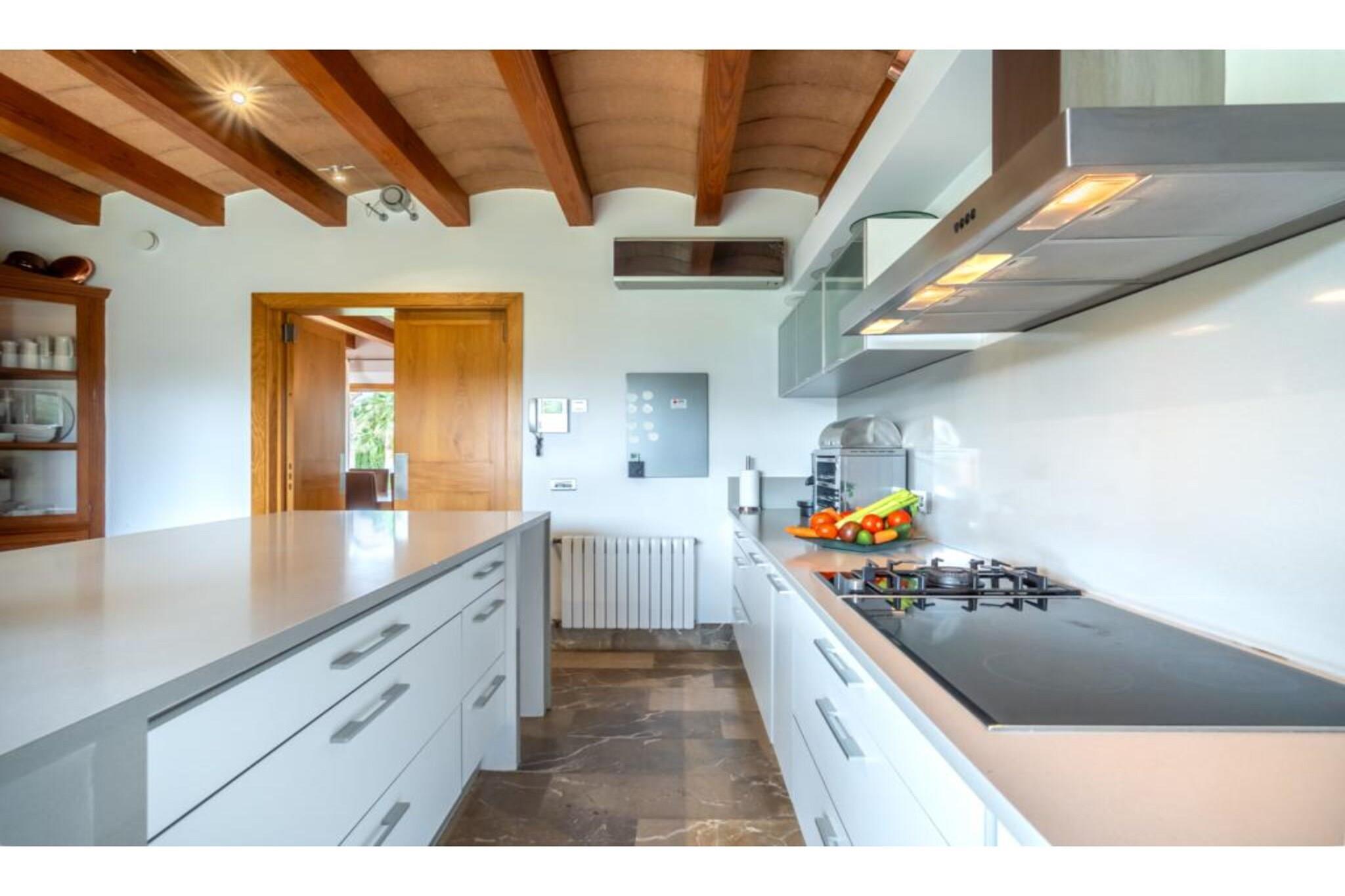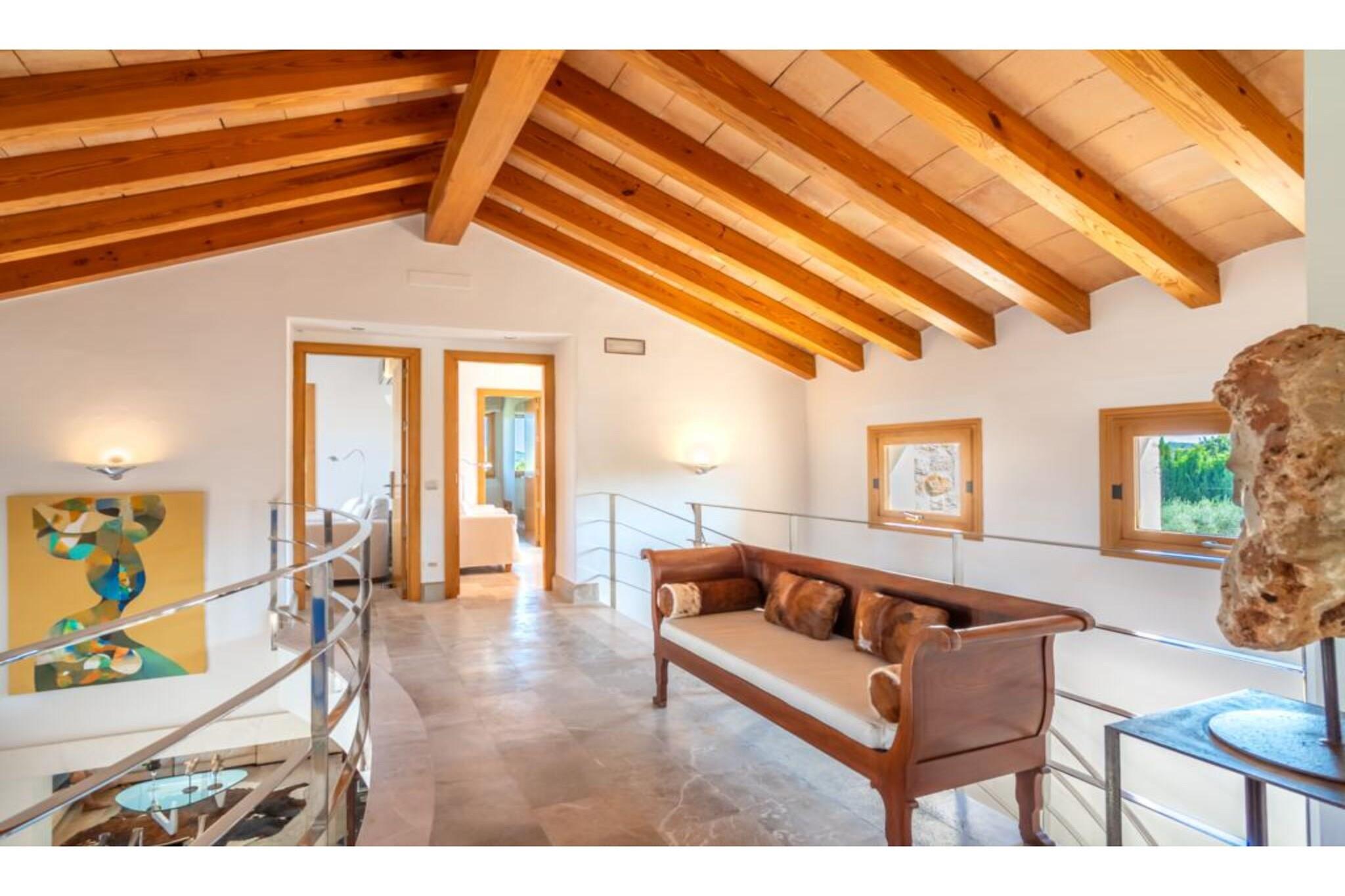 Fremragende ejendom. Huset blev bygget i 2006 med materialer af høj kvalitet: mallorsk sandsten, marmor, tømmer, stål mv. Bygget. Dekoreret med personlig stil og udsøgt smag og med stor kærlighed til åbne rum. Døre og installationer med de seneste udviklinger I teknologi: E-kort starter, baggrundsmusik inde og på terrasserne, Loewe TV i stuen og soveværelser, wifi. Alle 4 værelser er udstyret med badeværelse, påklædningsværelse, tv og udgang til terasse. 50 m2 køkkenet er fuldt udstyret, samt spisestue og stue. Haven har terrasser (1.000 meter), som er ideelle til udendørs arrangementer med plads til 200 personer. Der er et chill out område og parkering til 100 biler. For begivenheder inde i området har huset en maksimal kapacitet på 20/25 personer. Ideel til forretningsmøder, konferencer og små festligheder.