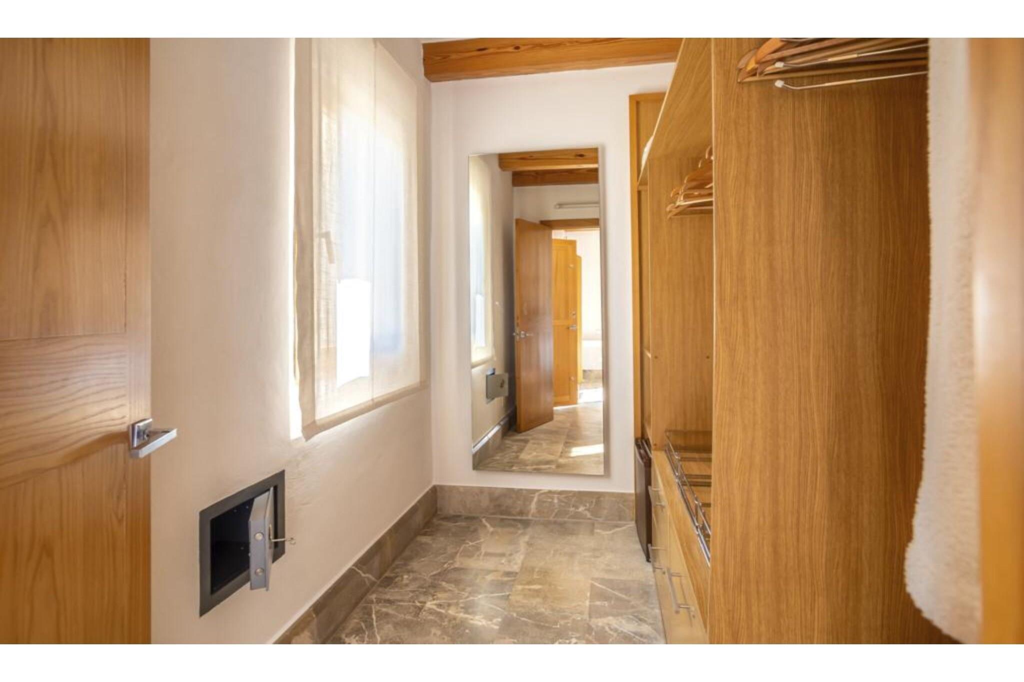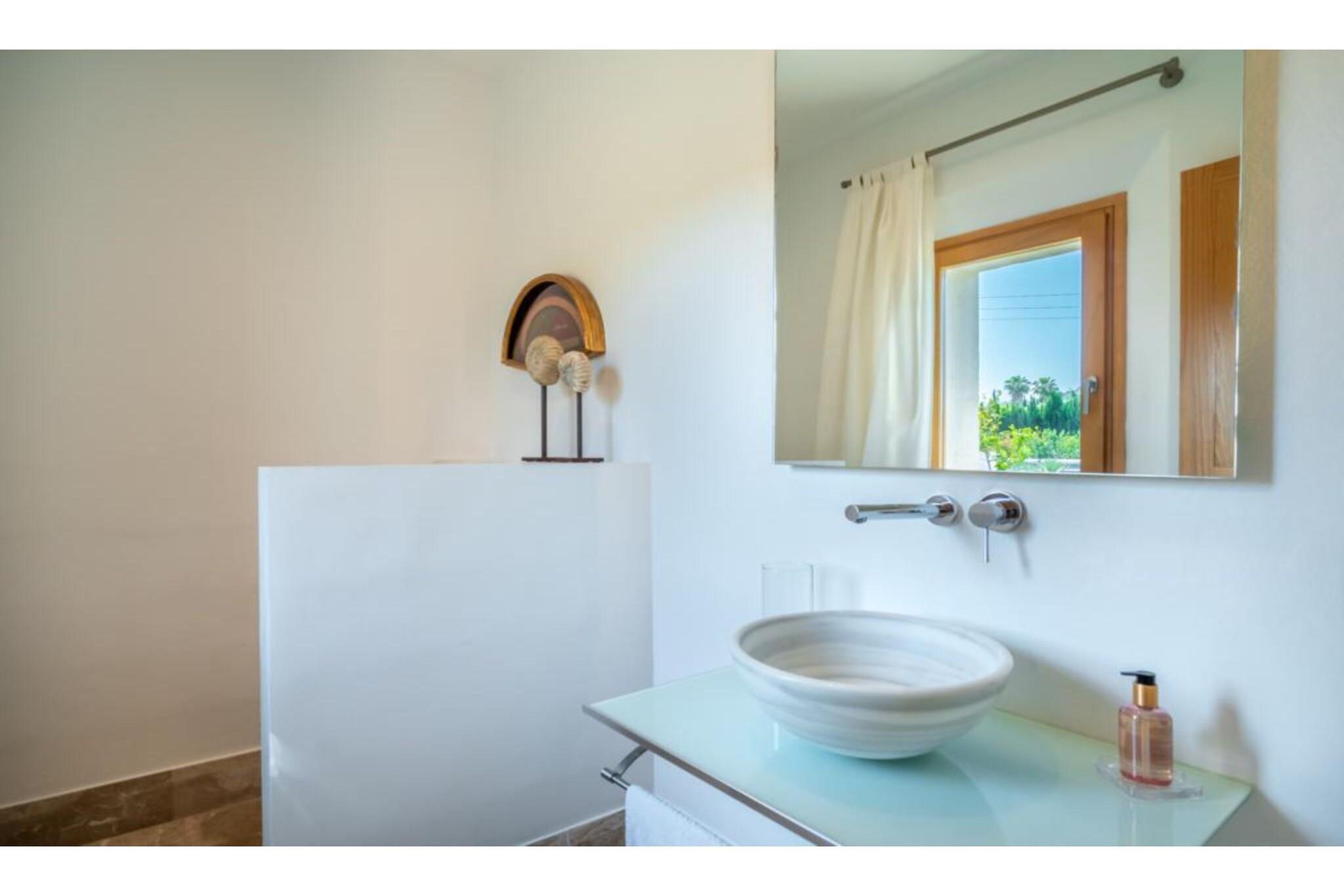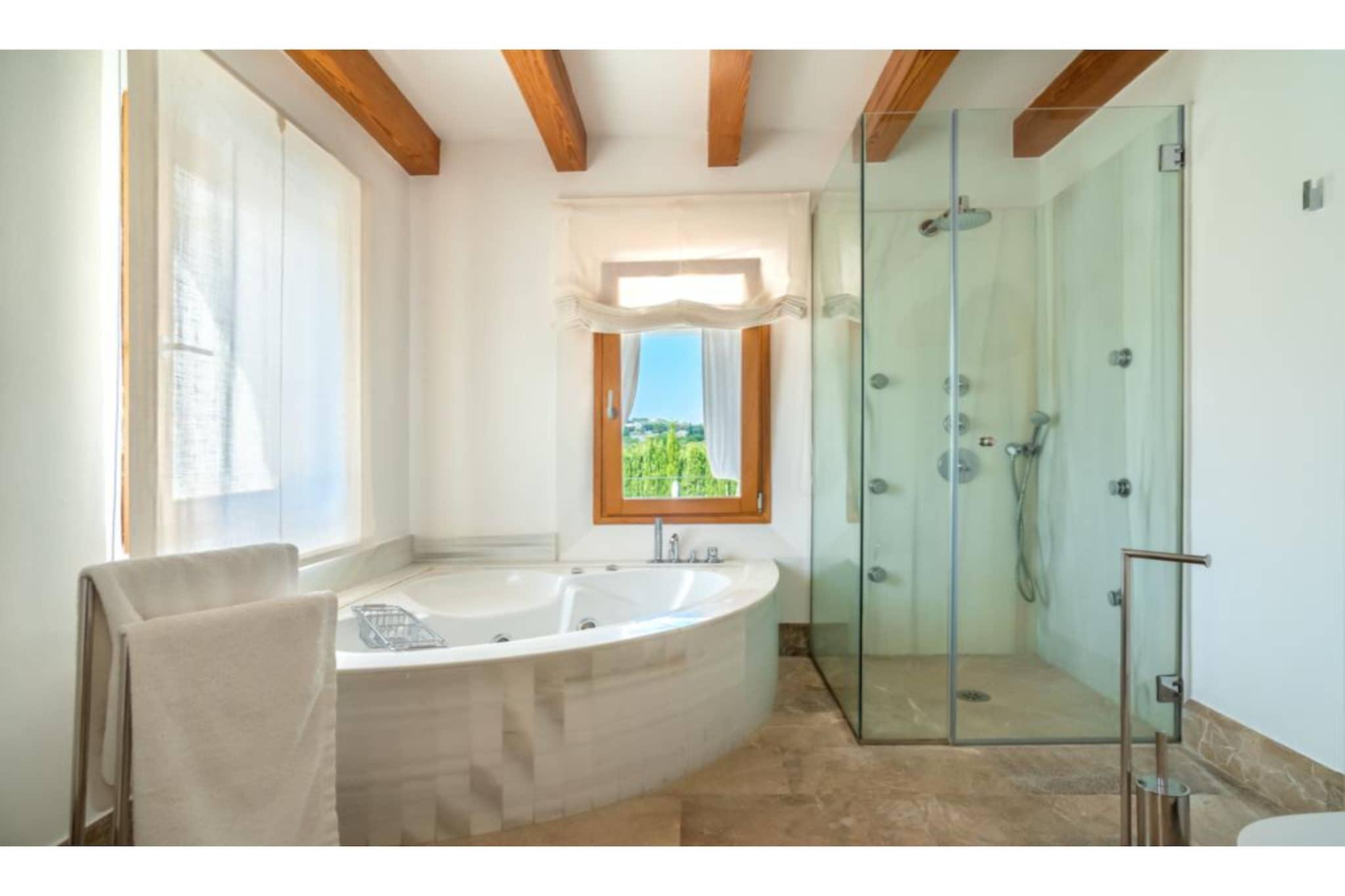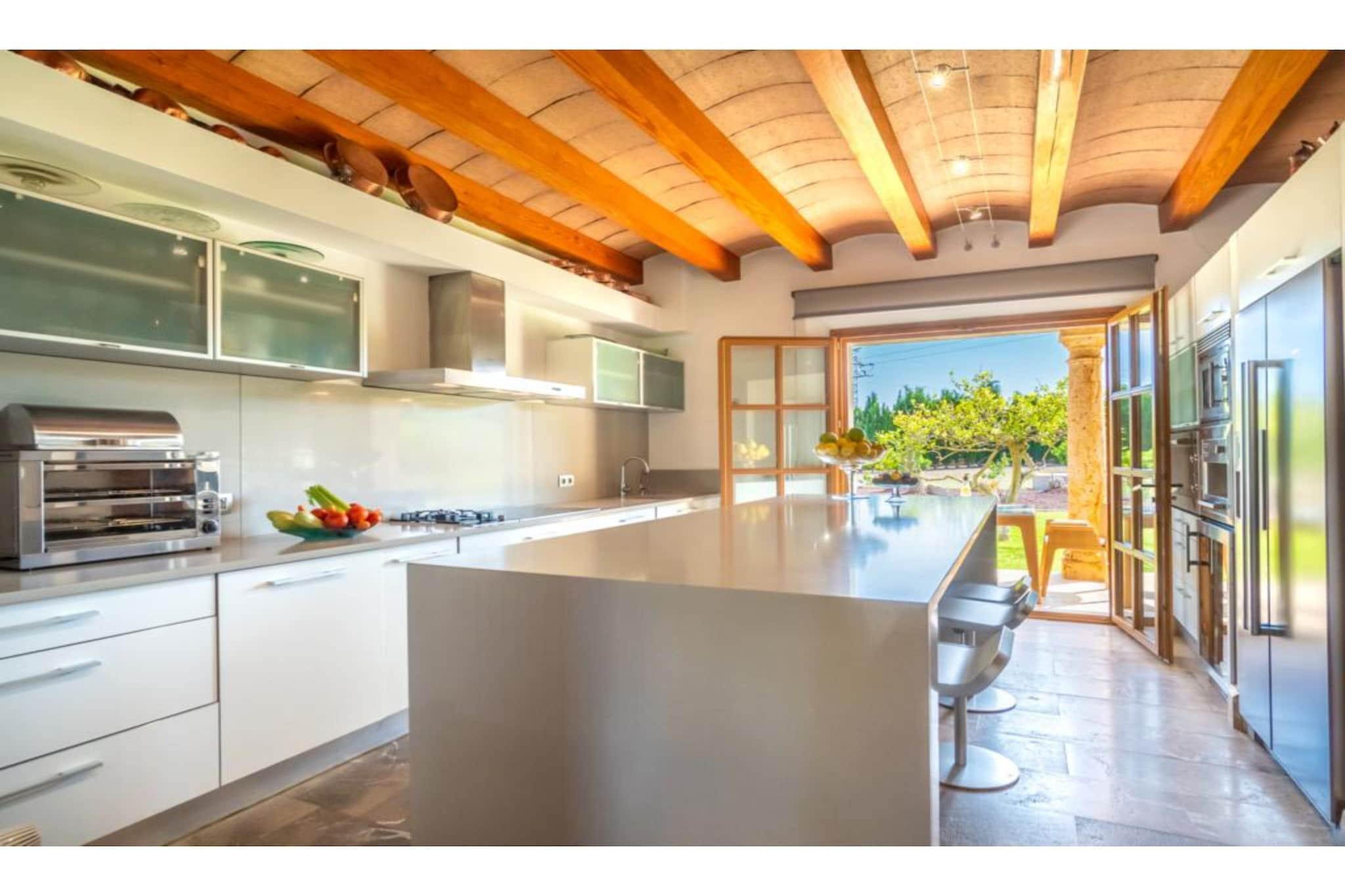 Fremragende ejendom. Huset blev bygget i 2006 med materialer af høj kvalitet: mallorsk sandsten, marmor, tømmer, stål mv. Bygget. Dekoreret med personlig stil og udsøgt smag og med stor kærlighed til åbne rum. Døre og installationer med de seneste udviklinger I teknologi: E-kort starter, baggrundsmusik inde og på terrasserne, Loewe TV i stuen og soveværelser, wifi. Alle 4 værelser er udstyret med badeværelse, påklædningsværelse, tv og udgang til terasse. 50 m2 køkkenet er fuldt udstyret, samt spisestue og stue. Haven har terrasser (1.000 meter), som er ideelle til udendørs arrangementer med plads til 200 personer. Der er et chill out område og parkering til 100 biler. For begivenheder inde i området har huset en maksimal kapacitet på 20/25 personer. Ideel til forretningsmøder, konferencer og små festligheder.