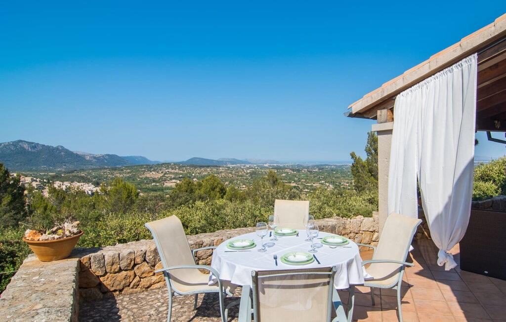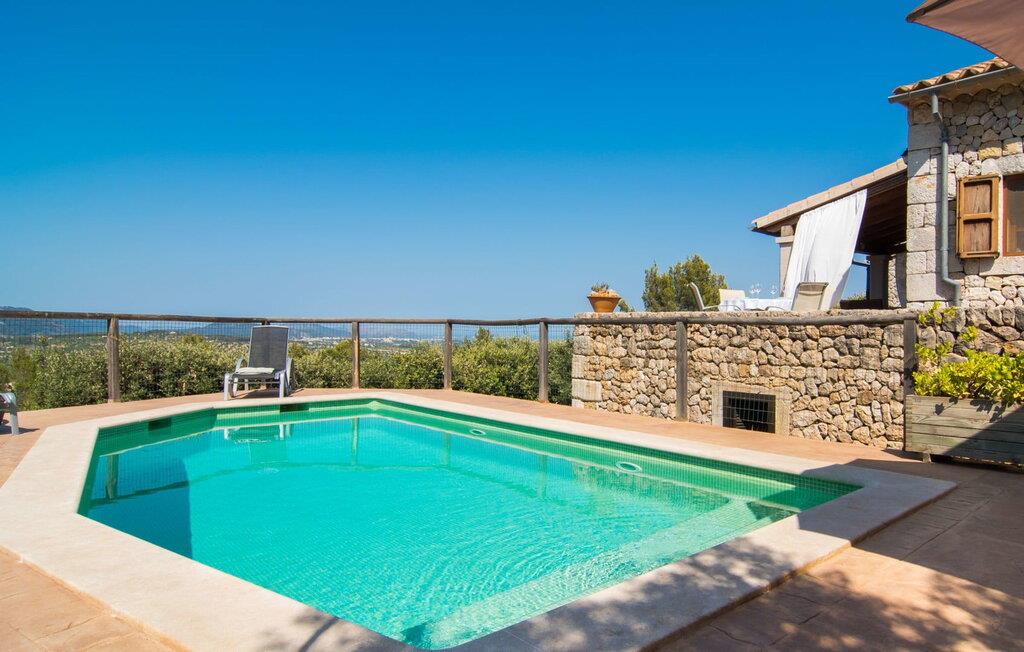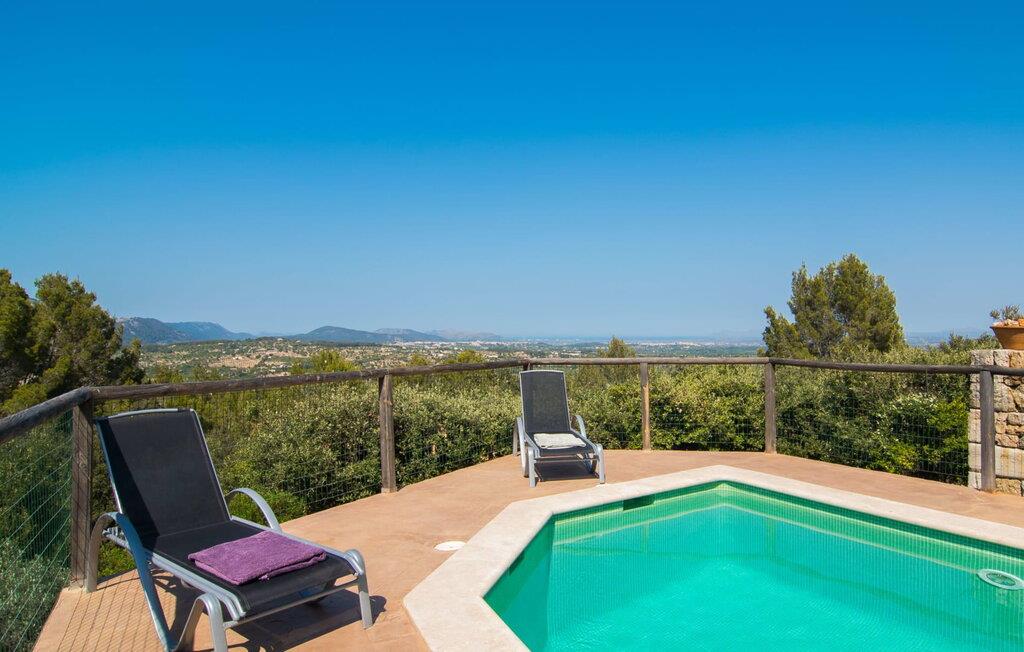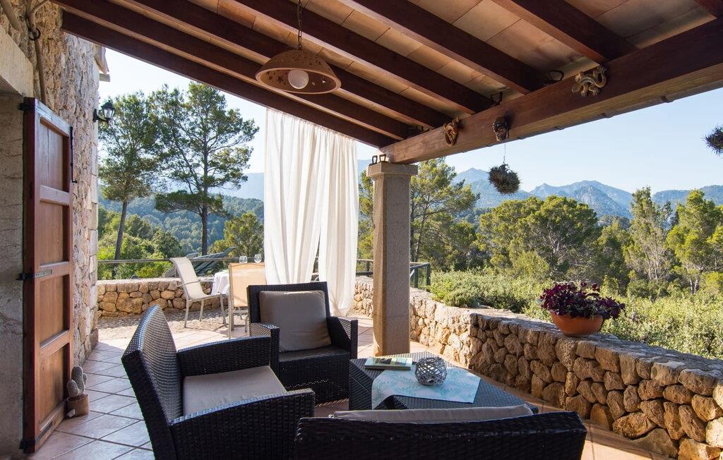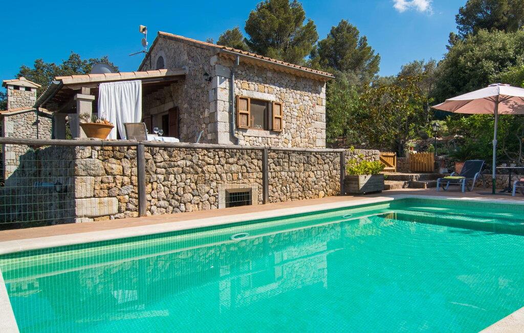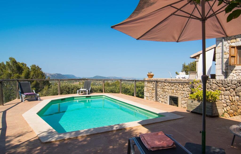 Villaen “Selva” er et fantastisk smukt stenhus med den bedste udsigt over det imponerende bjergområde på nordsiden af øen. En bred privat indkørsel fører op til ferieejendommen, for enden af hvilken den romantiske villa ligger på en forhøjet, fritliggende grund. Den lille ejendom har blot 62 m² boligareal, men det usædvanligt smukke udeareal med et varieret terrasselandskab og integreret pool og solterrasse gør det til noget helt særligt. Ejerne af huset vedligeholder deres lille ejendom med stor sans for detaljer, hvilket er tydeligt synligt ved ankomsten. Planter blomstrer overalt som i et lille eventyrslot, og der er maleriske steder overalt, der inviterer jer til at blive hængende. Den overdækkede terrasse lige ved siden af huset er et skønt sted. Det smukke bord er ideelt til morgenmad eller aftensmad med en luksuriøs udsigt. Køkkenet er direkte tilgængeligt fra terrassen, hvilket er meget praktisk, da der ikke er langt til at dække bord og rydde af bordet. Den er fuldt udstyret til selvforplejning med komfur, ovn, mikroovn, opvaskemaskine, kedel, filterkaffemaskine mv. Hvis vejret ikke samarbejder, er den indendørs spisning også fremragende. Til en afslappende aften er der en behagelig sofa i nærheden af fjernsynet. Dette er også et godt sted at fordybe jer i en yndlingsbog. Den lille pejs er indbegrebet af hygge og spreder hyggelig varme på kølige aftener. Udover de to hyggelige dobbeltværelser (det ene med stor dobbeltseng, det andet med to enkeltsenge) er der badeværelse med bruser i huset. Det andet badeværelse er bekvemt placeret i nærheden af poolen, så I kan friske op i løbet af dagen uden at skulle gå rundt i huset med våde fødder. Selvom ejendommen har to soveværelser med dobbeltsenge (hvoraf det ene er på hemsen; se billede), er den også særdeles velegnet til en romantisk ferie for to. Da bygningen er lavet af imponerende natursten, som er helt typisk for Mallorca, er temperaturen behagelig selv på varme mallorcanske sommerdage. På grund af den høje beliggenhed blæser der altid en behagelig brise gennem huset. Elektriske varmeapparater er tilgængelige i vintermånederne. Husets beliggenhed er helt idyllisk mellem stenge og fyrretræer og derfor et ideelt tilflugtssted for dem, der søger fred og ro. På klare dage strækker udsigten sig så langt som til havet på Mallorcas sydkyst. Selva selv, hvor smalle gader fører besøgende enten op ad bakke eller ned ad bakke, ligger kun 5 minutters kørsel fra villaen. De nærmeste butikker og restauranter er her og i landsbyen Inca, ca. 3 km væk. De smukke sandstrande i Alcúdia-bugten på nordkysten ligger cirka 25 km væk. Den romantiske bjergvilla “Selva” ligger ved porten til landsbyen af samme navn på den sydlige arm af Tramuntana-bjergene og byder på en spektakulær udsigt over store dele af Mallorca. De smukkeste landsbyer på øen er nemme at nå herfra med en lejebil. Selva med sine barer, restauranter og velassorterede supermarkeder ligger kun få minutter væk i bil. På grund af sin beliggenhed i hjertet af øen, kan I hurtigt nå alle strande fra villaen.