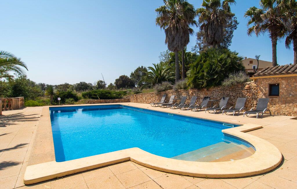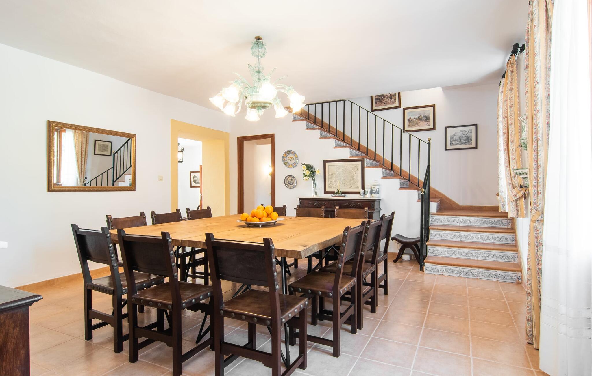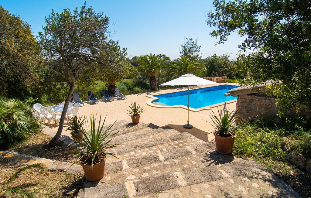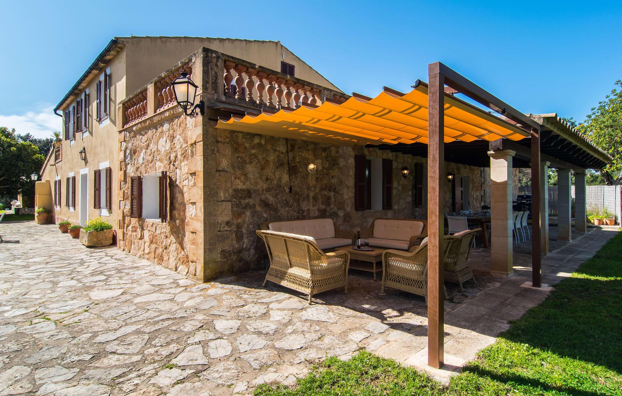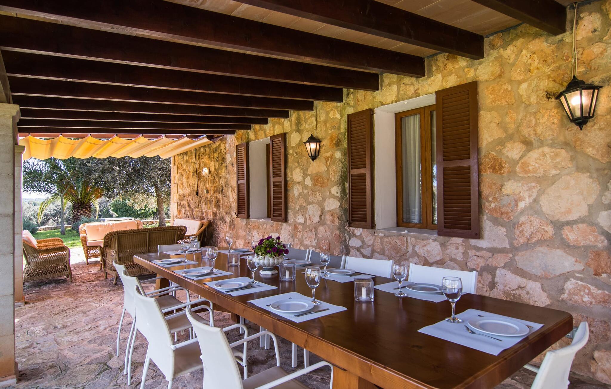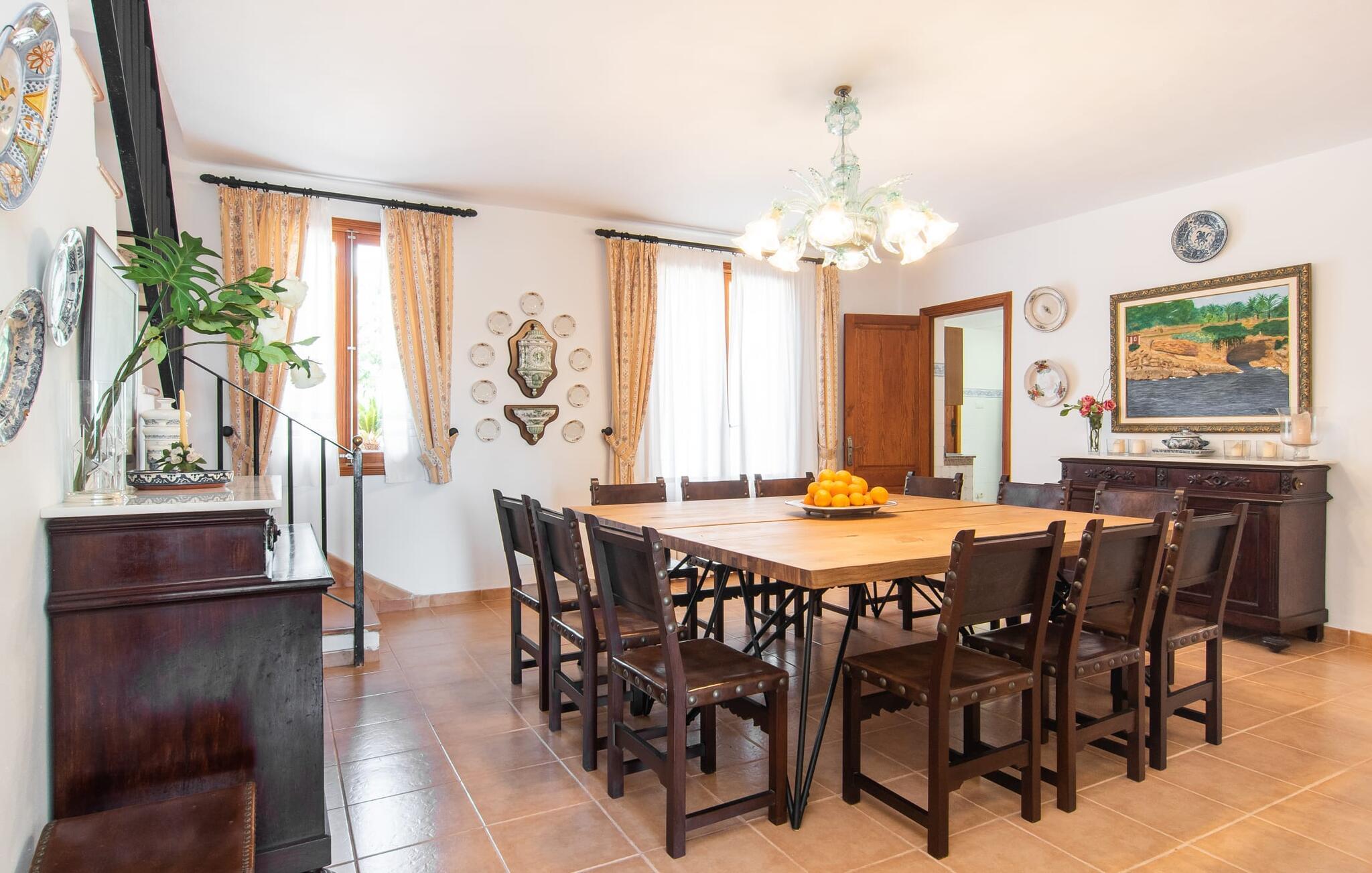 Enhver, der vælger villaen "Ses Cases de Son Isidros" kan føle sig som en stor grundejer under deres ophold på Mallorca med god samvittighed: Den omfattende ejendom minder om en vildt romantisk park, og hvorpå der vokser palmer og andre middelhavsplanter og træer. giver skygge, dækker et areal på næsten 100.000 m². Her kan I slentre som I vil, nyde de intenst lyse blomster, lege gemmeleg med de mindste, nyde eftermiddagste i et af de hyggelige siddeområder eller blot tage et forfriskende hop i det kølige vand i jeres herskabelige pool. Bagefter kan I dingle benene i vandet på kanten af stenen og fordybe jer i en underholdende ferielæsning. Fra poolterrassen, hvor flere liggestole inviterer til en lur i solen, fører stentrappe op til ejendommen, hvis stenbrudsfacade har en overdækket terrasse. I kan eventuelt sætte grillen op her sidst på eftermiddagen for at afslutte aftenen med øens kulinariske delikatesser. En stor tagterrasse og en altan er også ideelle steder at lade den milde ø-luft, som dufter behageligt af havet, blæse næsen. Huset imponerer med store rum, hvor sjælen kan ånde; Hertil bidrager harmonien mellem den dominerende hvide tone og de højkvalitets, delvist antikke træmøbler. I stuen kan I se knitren fra den flammende pejs fra de statelige lædersofaer eller, takket være moderne satellitteknologi, holde jer ajour med, hvad der sker derhjemme på widescreen-tv'et. Måske vil I helst holde jer helt væk fra hverdagens stress og jag i hele jeres ferie, så I kan fordybe jer i fred og afslapning lidt mere hver dag i disse fredfyldte omgivelser. I et sideværelse kan I spise på kurvestole eller afslutte aftenen med et sjovt brætspil. Køkkenet er fuldt udstyret; Et separat rum er reserveret til andre huslige pligter som tøjvask. Tre af de seks soveværelser og to af badeværelserne er i stueetagen, hvoraf det ene har en dobbeltseng, et en enkeltseng og et har to enkeltsenge. Ejerne lægger stor vægt på den atmosfæriske belysning af værelserne, og takket være vinduerne er interiøret lyst og venligt hele dagen lang. Det nyder også overetagen godt af, hvor de tre ekstra soveværelser er placeret - hvoraf de to har eget badeværelse. En dobbeltseng og to værelser med to enkeltsenge giver hver stor fleksibilitet i værelsesbelægningen. Og det faktum, at der er en privat stue ovenpå med en kæmpe skærm gør, at selv større grupper kan forvente et vist niveau af privatliv i denne villa. Fire af badeværelserne har endda badekar, så I kan runde dagen af med en forkælelsesoplevelse for jeres hud. Da villaen "Ses Cases de Son Isidros" ligger centralt, kan I sprede jer i alle retninger med jeres lejebil. Hvis I vælger øst, kan I være heldig at opdage en af de skjulte, uspolerede strande, der fører til blindgyder. I kan nå Manacor på 10 minutter i bil, hvor I kan nippe til en historisk cortado i en af gadecaféerne eller se travlheden på det ugentlige marked om mandagen. Den fjerne by Sant Llorenc er også perfekt til shopping. Colonia de Sant Pere er en halv times kørsel væk; Takket være bølgebryderne er kysten her særdeles velegnet til familier. Havnebyen Porto Cristo ligger 16 km væk; Her kan I se luksuriøse yachter og fiskerbåde sejle ud på havet, inden I vender tilbage til jeres villa i en vidunderlig fredelig beliggenhed. Villaen "Ses Cases de Son Isidros" overlader fiflet til andre: På grund af sin centrale beliggenhed kan I forvente dejlige udflugter fra alle fire retninger fra jeres enorme ejendom. I kan købe souvenirs til jeres kære i Manacor, 5 km væk - regionen har specialiseret sig i lædervarer. Strandene på østkysten er særligt forskellige; For eksempel kan I hoppe i havet i Porto Cristo, 20 minutters kørsel væk.