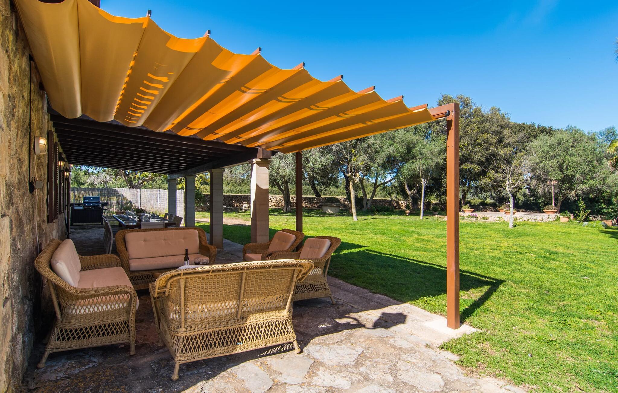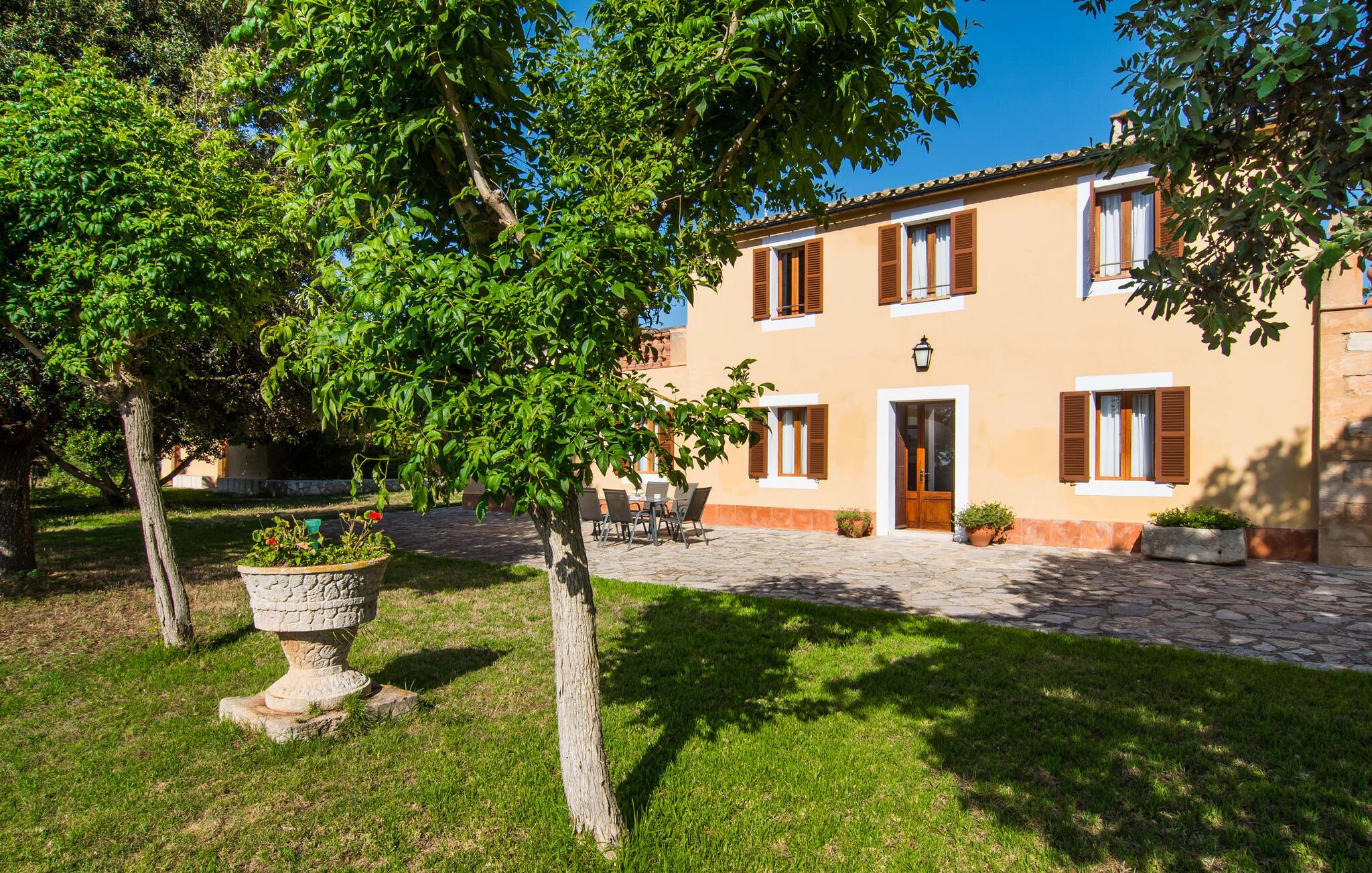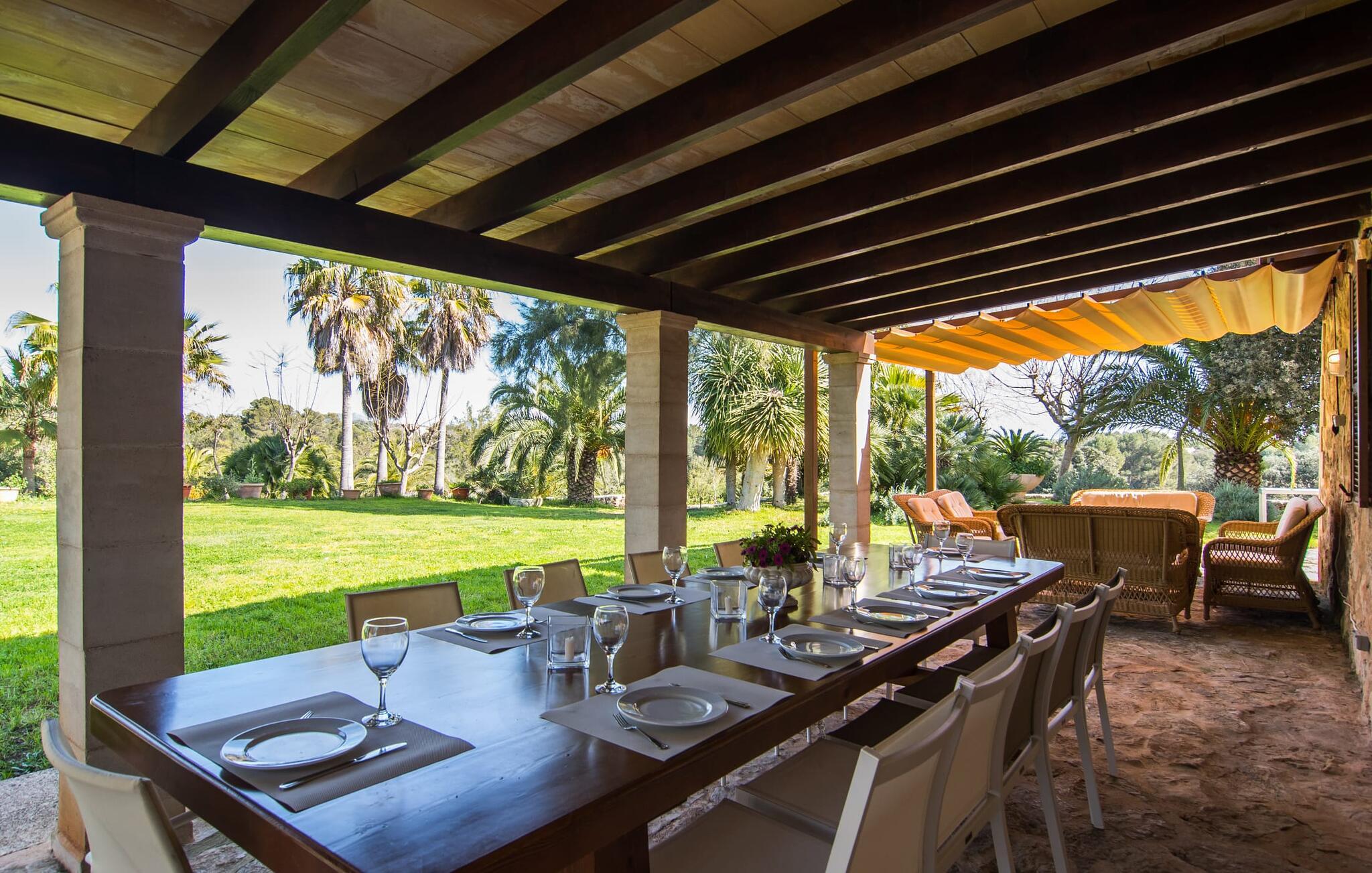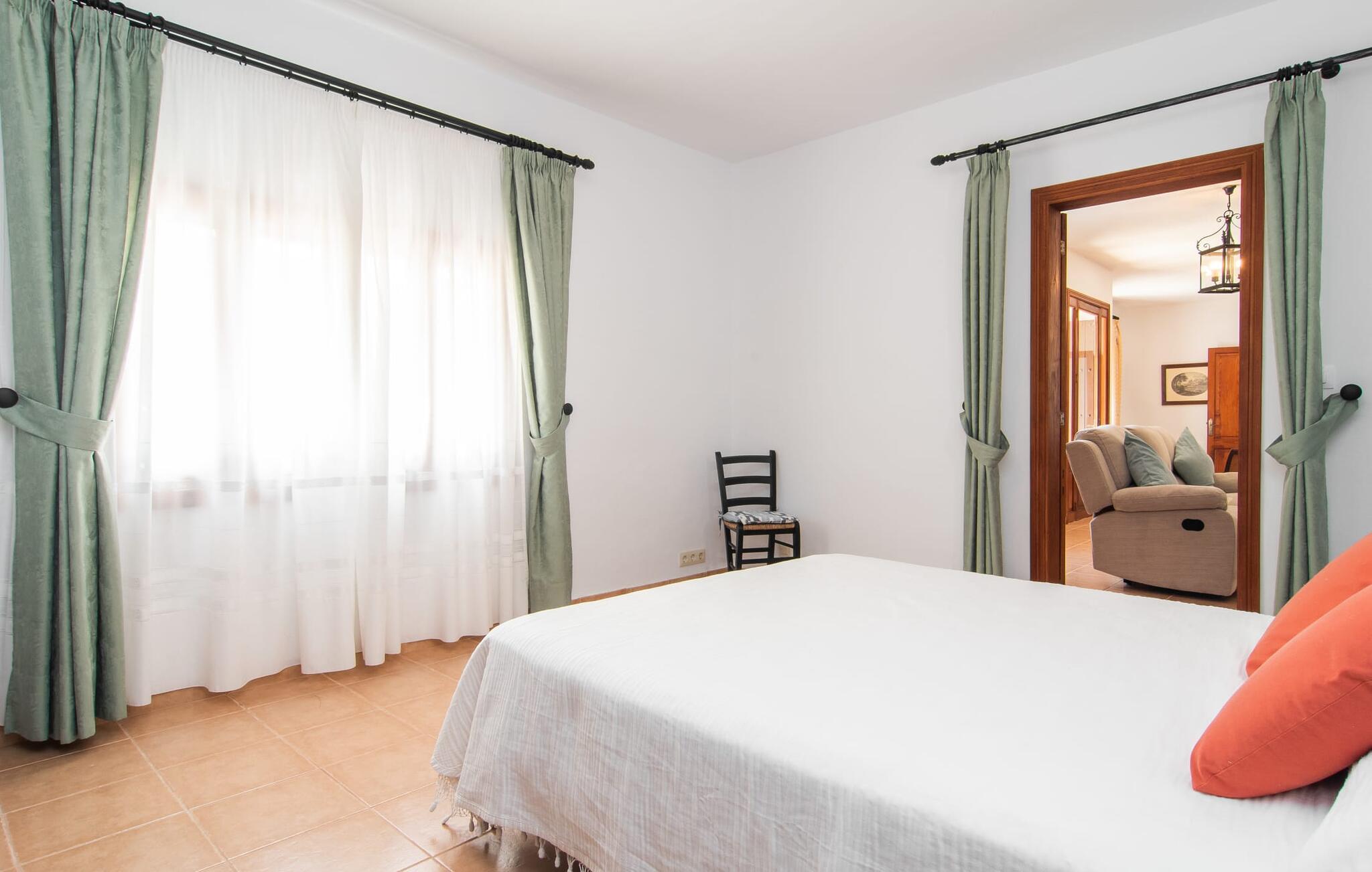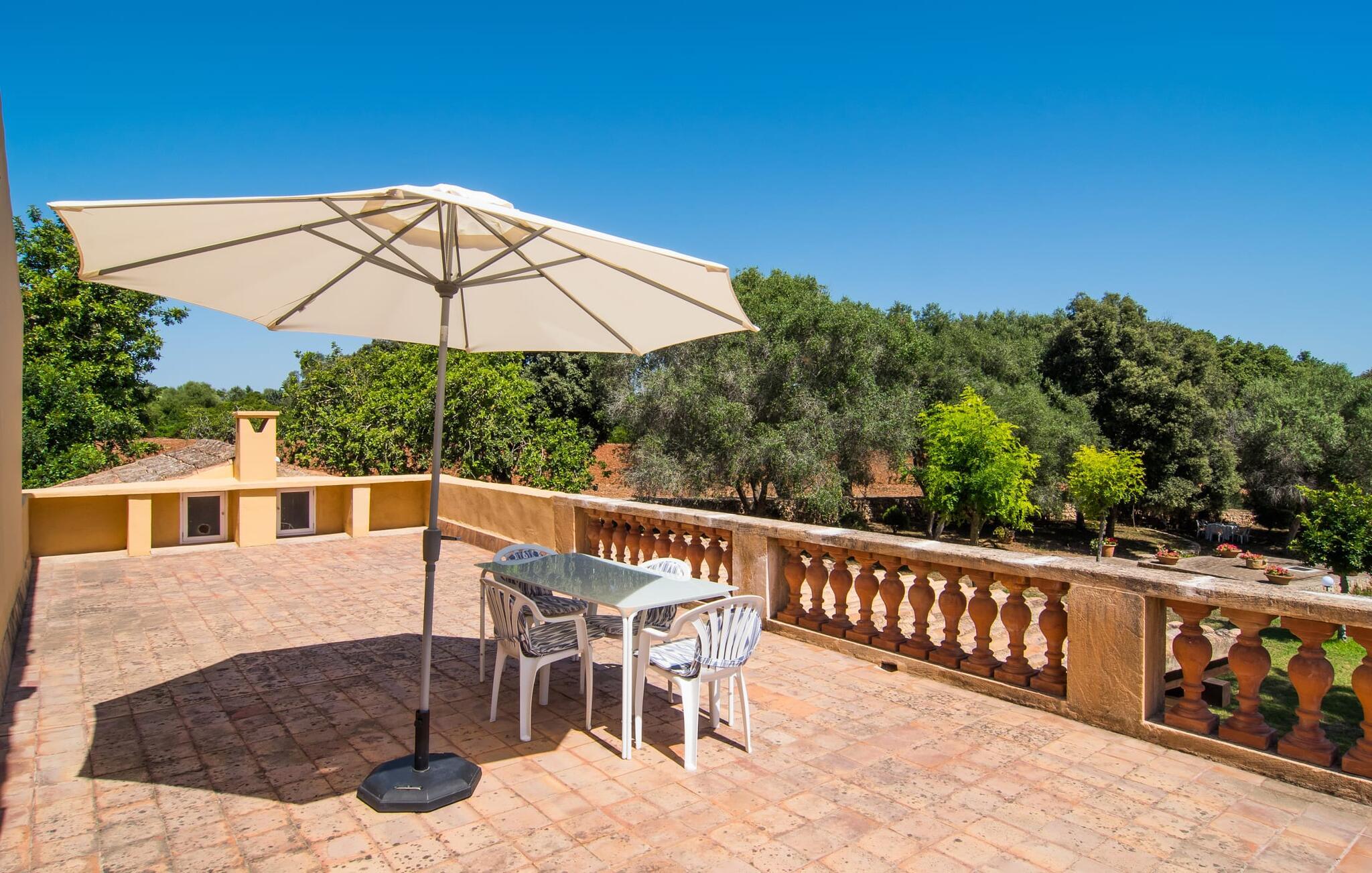 Enhver, der vælger villaen "Ses Cases de Son Isidros" kan føle sig som en stor grundejer under deres ophold på Mallorca med god samvittighed: Den omfattende ejendom minder om en vildt romantisk park, og hvorpå der vokser palmer og andre middelhavsplanter og træer. giver skygge, dækker et areal på næsten 100.000 m². Her kan I slentre som I vil, nyde de intenst lyse blomster, lege gemmeleg med de mindste, nyde eftermiddagste i et af de hyggelige siddeområder eller blot tage et forfriskende hop i det kølige vand i jeres herskabelige pool. Bagefter kan I dingle benene i vandet på kanten af stenen og fordybe jer i en underholdende ferielæsning. Fra poolterrassen, hvor flere liggestole inviterer til en lur i solen, fører stentrappe op til ejendommen, hvis stenbrudsfacade har en overdækket terrasse. I kan eventuelt sætte grillen op her sidst på eftermiddagen for at afslutte aftenen med øens kulinariske delikatesser. En stor tagterrasse og en altan er også ideelle steder at lade den milde ø-luft, som dufter behageligt af havet, blæse næsen. Huset imponerer med store rum, hvor sjælen kan ånde; Hertil bidrager harmonien mellem den dominerende hvide tone og de højkvalitets, delvist antikke træmøbler. I stuen kan I se knitren fra den flammende pejs fra de statelige lædersofaer eller, takket være moderne satellitteknologi, holde jer ajour med, hvad der sker derhjemme på widescreen-tv'et. Måske vil I helst holde jer helt væk fra hverdagens stress og jag i hele jeres ferie, så I kan fordybe jer i fred og afslapning lidt mere hver dag i disse fredfyldte omgivelser. I et sideværelse kan I spise på kurvestole eller afslutte aftenen med et sjovt brætspil. Køkkenet er fuldt udstyret; Et separat rum er reserveret til andre huslige pligter som tøjvask. Tre af de seks soveværelser og to af badeværelserne er i stueetagen, hvoraf det ene har en dobbeltseng, et en enkeltseng og et har to enkeltsenge. Ejerne lægger stor vægt på den atmosfæriske belysning af værelserne, og takket være vinduerne er interiøret lyst og venligt hele dagen lang. Det nyder også overetagen godt af, hvor de tre ekstra soveværelser er placeret - hvoraf de to har eget badeværelse. En dobbeltseng og to værelser med to enkeltsenge giver hver stor fleksibilitet i værelsesbelægningen. Og det faktum, at der er en privat stue ovenpå med en kæmpe skærm gør, at selv større grupper kan forvente et vist niveau af privatliv i denne villa. Fire af badeværelserne har endda badekar, så I kan runde dagen af med en forkælelsesoplevelse for jeres hud. Da villaen "Ses Cases de Son Isidros" ligger centralt, kan I sprede jer i alle retninger med jeres lejebil. Hvis I vælger øst, kan I være heldig at opdage en af de skjulte, uspolerede strande, der fører til blindgyder. I kan nå Manacor på 10 minutter i bil, hvor I kan nippe til en historisk cortado i en af gadecaféerne eller se travlheden på det ugentlige marked om mandagen. Den fjerne by Sant Llorenc er også perfekt til shopping. Colonia de Sant Pere er en halv times kørsel væk; Takket være bølgebryderne er kysten her særdeles velegnet til familier. Havnebyen Porto Cristo ligger 16 km væk; Her kan I se luksuriøse yachter og fiskerbåde sejle ud på havet, inden I vender tilbage til jeres villa i en vidunderlig fredelig beliggenhed. Villaen "Ses Cases de Son Isidros" overlader fiflet til andre: På grund af sin centrale beliggenhed kan I forvente dejlige udflugter fra alle fire retninger fra jeres enorme ejendom. I kan købe souvenirs til jeres kære i Manacor, 5 km væk - regionen har specialiseret sig i lædervarer. Strandene på østkysten er særligt forskellige; For eksempel kan I hoppe i havet i Porto Cristo, 20 minutters kørsel væk.