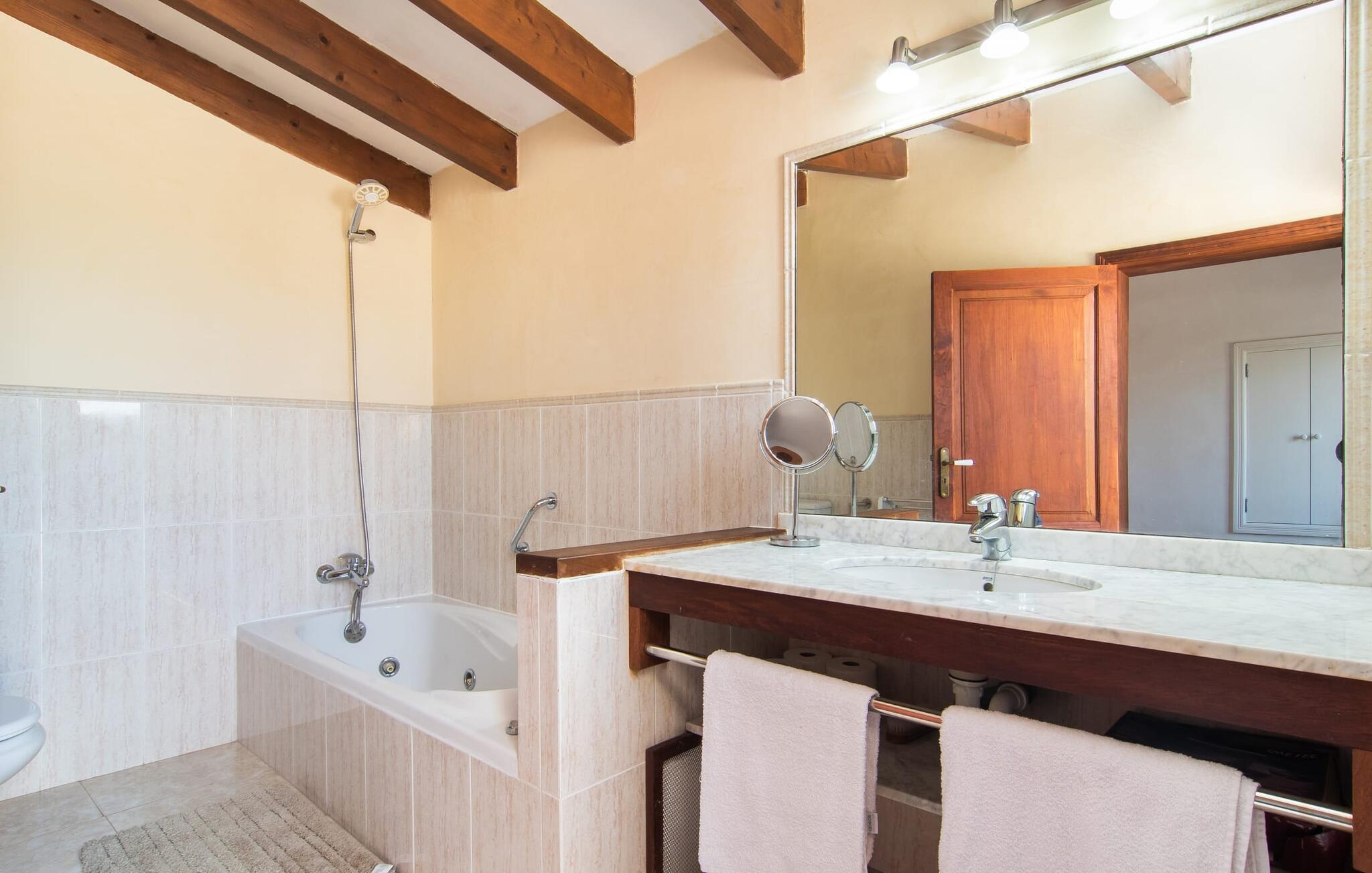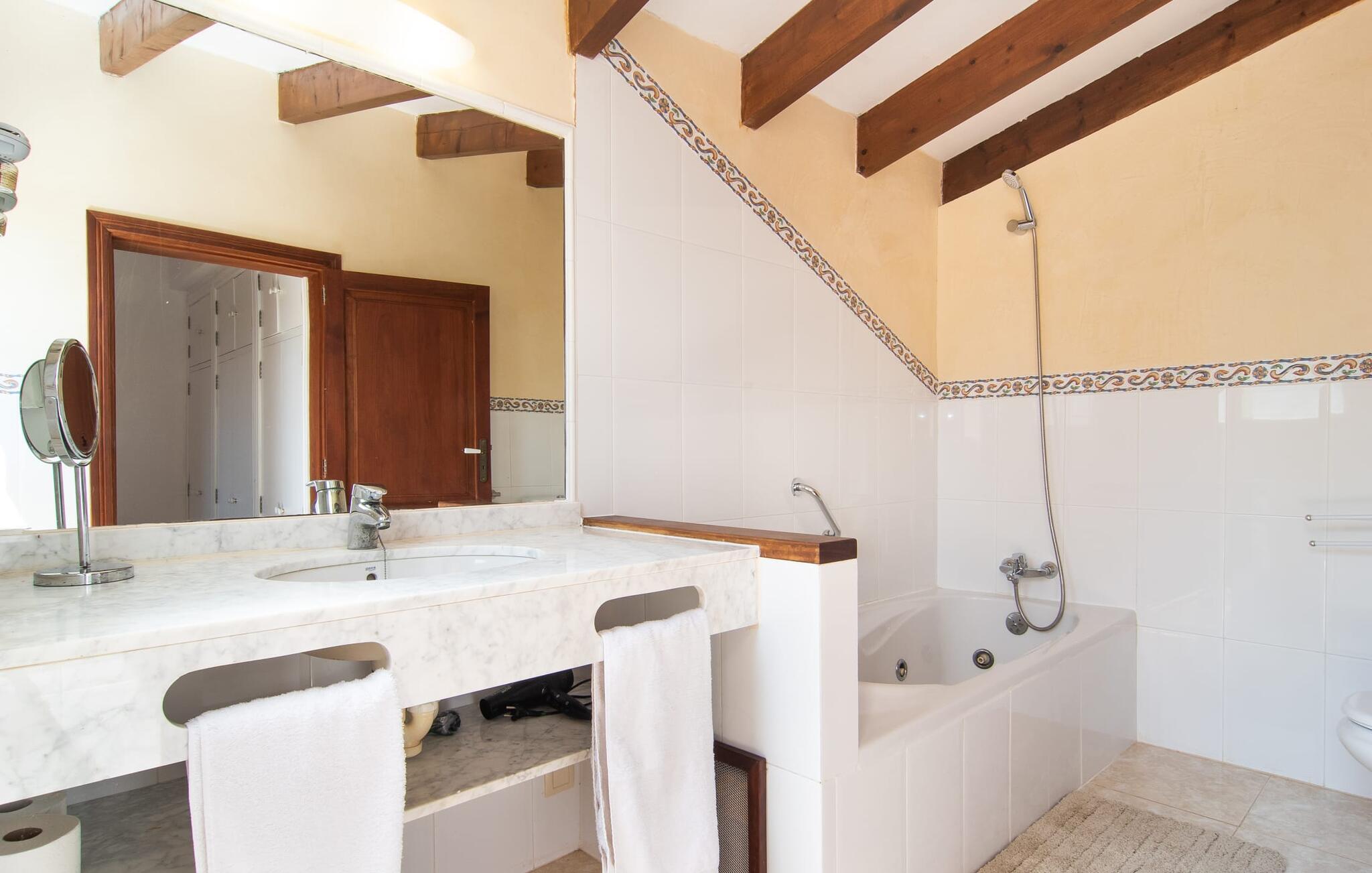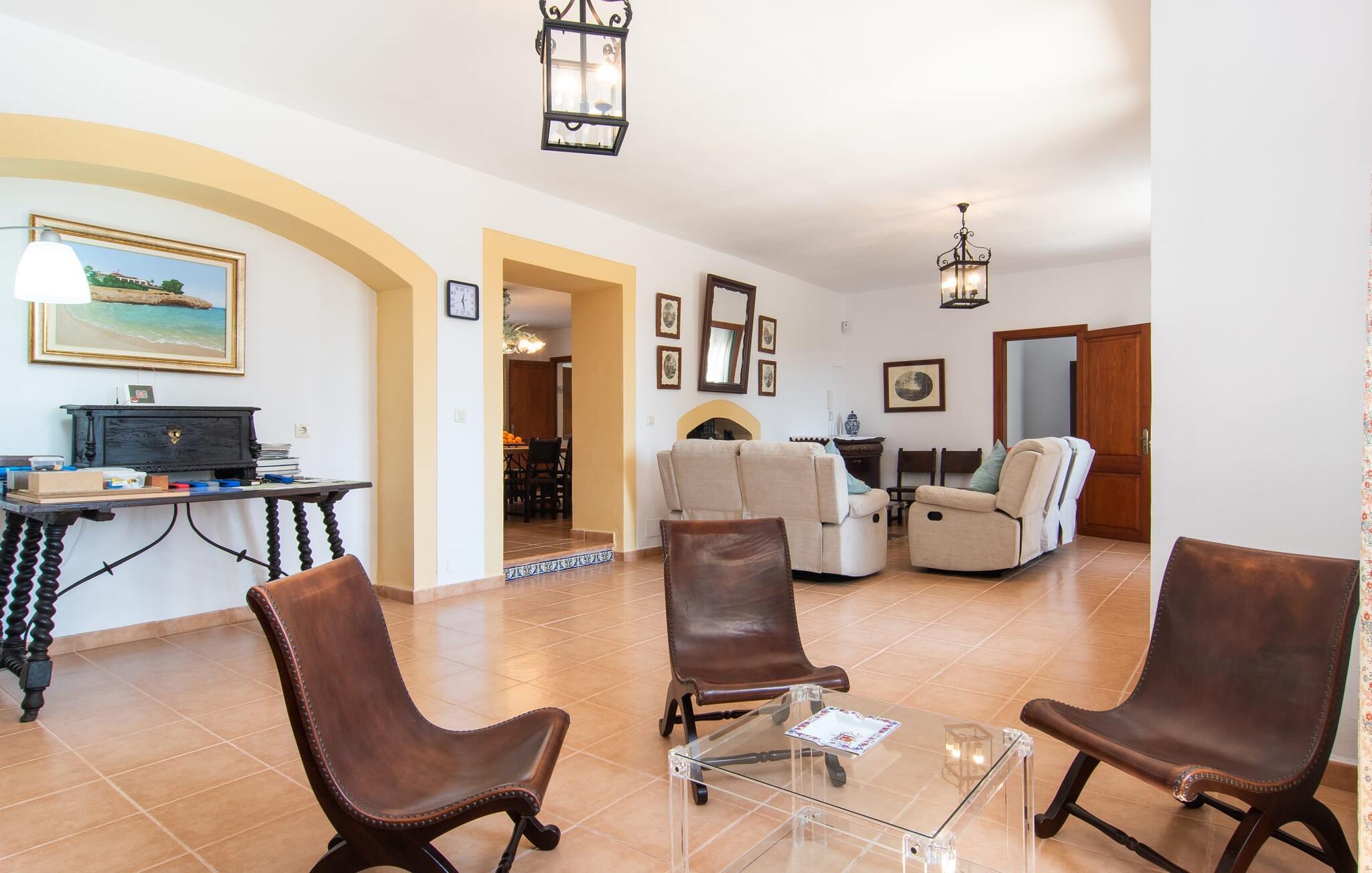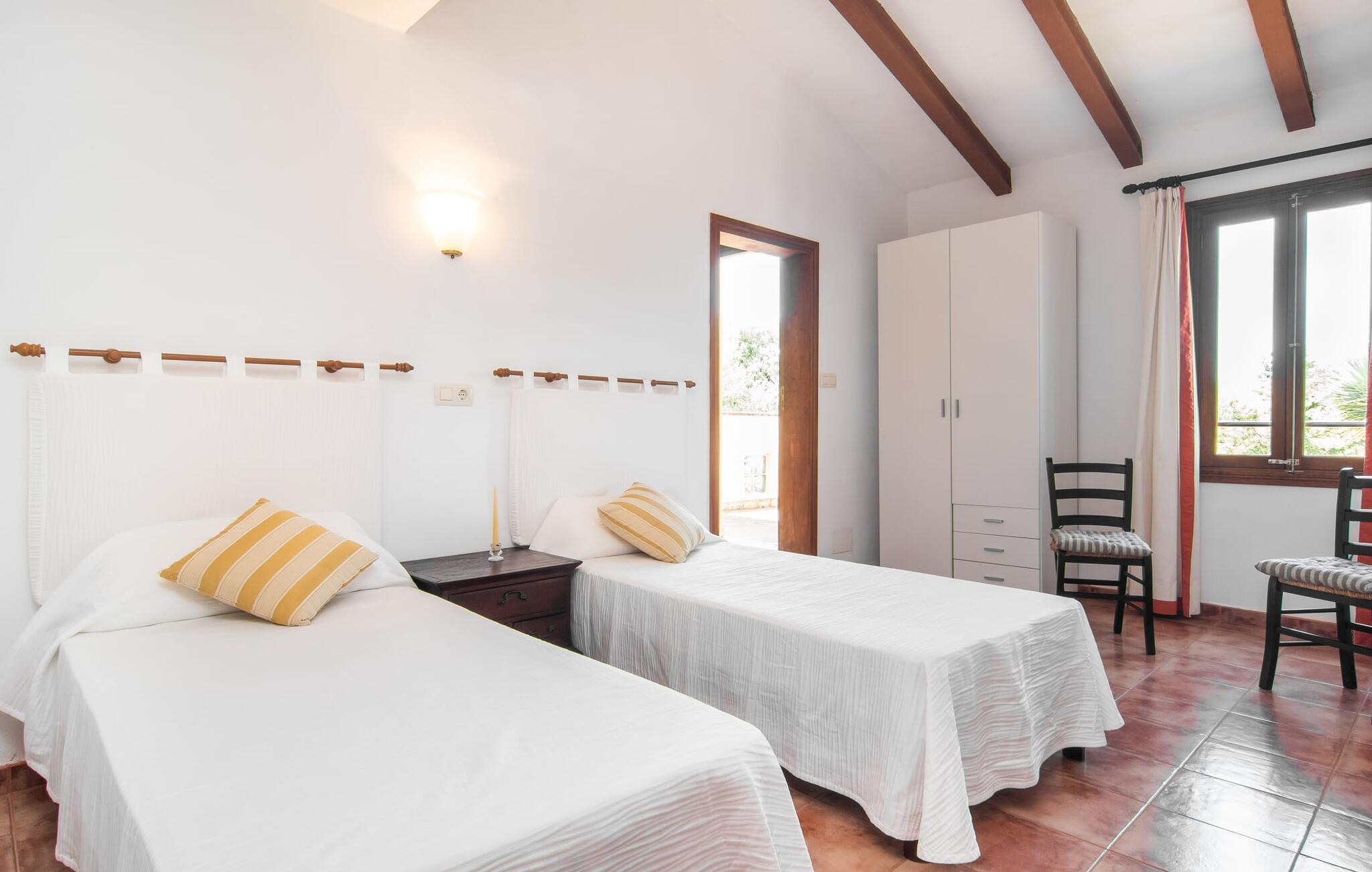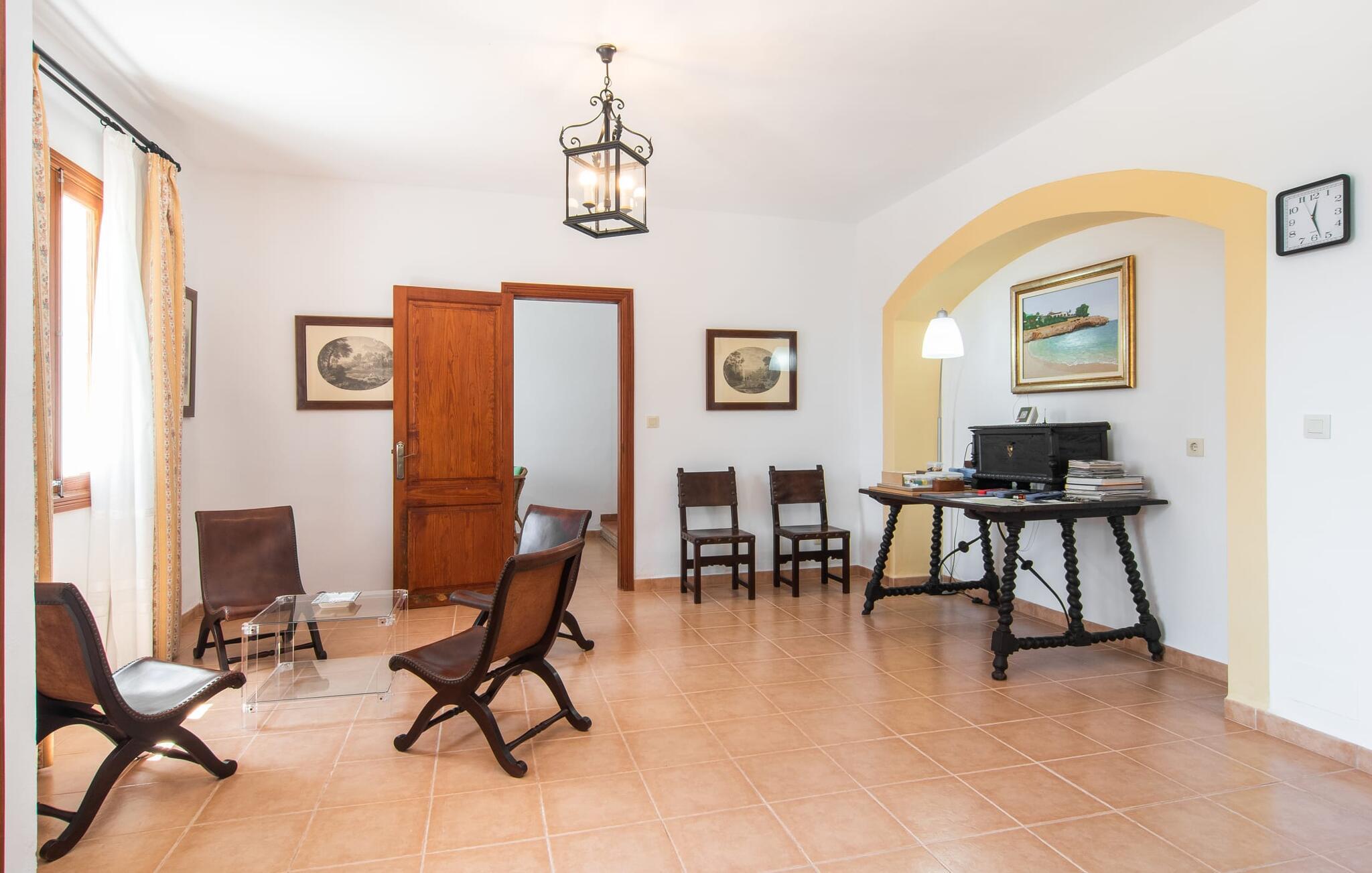 Enhver, der vælger villaen "Ses Cases de Son Isidros" kan føle sig som en stor grundejer under deres ophold på Mallorca med god samvittighed: Den omfattende ejendom minder om en vildt romantisk park, og hvorpå der vokser palmer og andre middelhavsplanter og træer. giver skygge, dækker et areal på næsten 100.000 m². Her kan I slentre som I vil, nyde de intenst lyse blomster, lege gemmeleg med de mindste, nyde eftermiddagste i et af de hyggelige siddeområder eller blot tage et forfriskende hop i det kølige vand i jeres herskabelige pool. Bagefter kan I dingle benene i vandet på kanten af stenen og fordybe jer i en underholdende ferielæsning. Fra poolterrassen, hvor flere liggestole inviterer til en lur i solen, fører stentrappe op til ejendommen, hvis stenbrudsfacade har en overdækket terrasse. I kan eventuelt sætte grillen op her sidst på eftermiddagen for at afslutte aftenen med øens kulinariske delikatesser. En stor tagterrasse og en altan er også ideelle steder at lade den milde ø-luft, som dufter behageligt af havet, blæse næsen. Huset imponerer med store rum, hvor sjælen kan ånde; Hertil bidrager harmonien mellem den dominerende hvide tone og de højkvalitets, delvist antikke træmøbler. I stuen kan I se knitren fra den flammende pejs fra de statelige lædersofaer eller, takket være moderne satellitteknologi, holde jer ajour med, hvad der sker derhjemme på widescreen-tv'et. Måske vil I helst holde jer helt væk fra hverdagens stress og jag i hele jeres ferie, så I kan fordybe jer i fred og afslapning lidt mere hver dag i disse fredfyldte omgivelser. I et sideværelse kan I spise på kurvestole eller afslutte aftenen med et sjovt brætspil. Køkkenet er fuldt udstyret; Et separat rum er reserveret til andre huslige pligter som tøjvask. Tre af de seks soveværelser og to af badeværelserne er i stueetagen, hvoraf det ene har en dobbeltseng, et en enkeltseng og et har to enkeltsenge. Ejerne lægger stor vægt på den atmosfæriske belysning af værelserne, og takket være vinduerne er interiøret lyst og venligt hele dagen lang. Det nyder også overetagen godt af, hvor de tre ekstra soveværelser er placeret - hvoraf de to har eget badeværelse. En dobbeltseng og to værelser med to enkeltsenge giver hver stor fleksibilitet i værelsesbelægningen. Og det faktum, at der er en privat stue ovenpå med en kæmpe skærm gør, at selv større grupper kan forvente et vist niveau af privatliv i denne villa. Fire af badeværelserne har endda badekar, så I kan runde dagen af med en forkælelsesoplevelse for jeres hud. Da villaen "Ses Cases de Son Isidros" ligger centralt, kan I sprede jer i alle retninger med jeres lejebil. Hvis I vælger øst, kan I være heldig at opdage en af de skjulte, uspolerede strande, der fører til blindgyder. I kan nå Manacor på 10 minutter i bil, hvor I kan nippe til en historisk cortado i en af gadecaféerne eller se travlheden på det ugentlige marked om mandagen. Den fjerne by Sant Llorenc er også perfekt til shopping. Colonia de Sant Pere er en halv times kørsel væk; Takket være bølgebryderne er kysten her særdeles velegnet til familier. Havnebyen Porto Cristo ligger 16 km væk; Her kan I se luksuriøse yachter og fiskerbåde sejle ud på havet, inden I vender tilbage til jeres villa i en vidunderlig fredelig beliggenhed. Villaen "Ses Cases de Son Isidros" overlader fiflet til andre: På grund af sin centrale beliggenhed kan I forvente dejlige udflugter fra alle fire retninger fra jeres enorme ejendom. I kan købe souvenirs til jeres kære i Manacor, 5 km væk - regionen har specialiseret sig i lædervarer. Strandene på østkysten er særligt forskellige; For eksempel kan I hoppe i havet i Porto Cristo, 20 minutters kørsel væk.