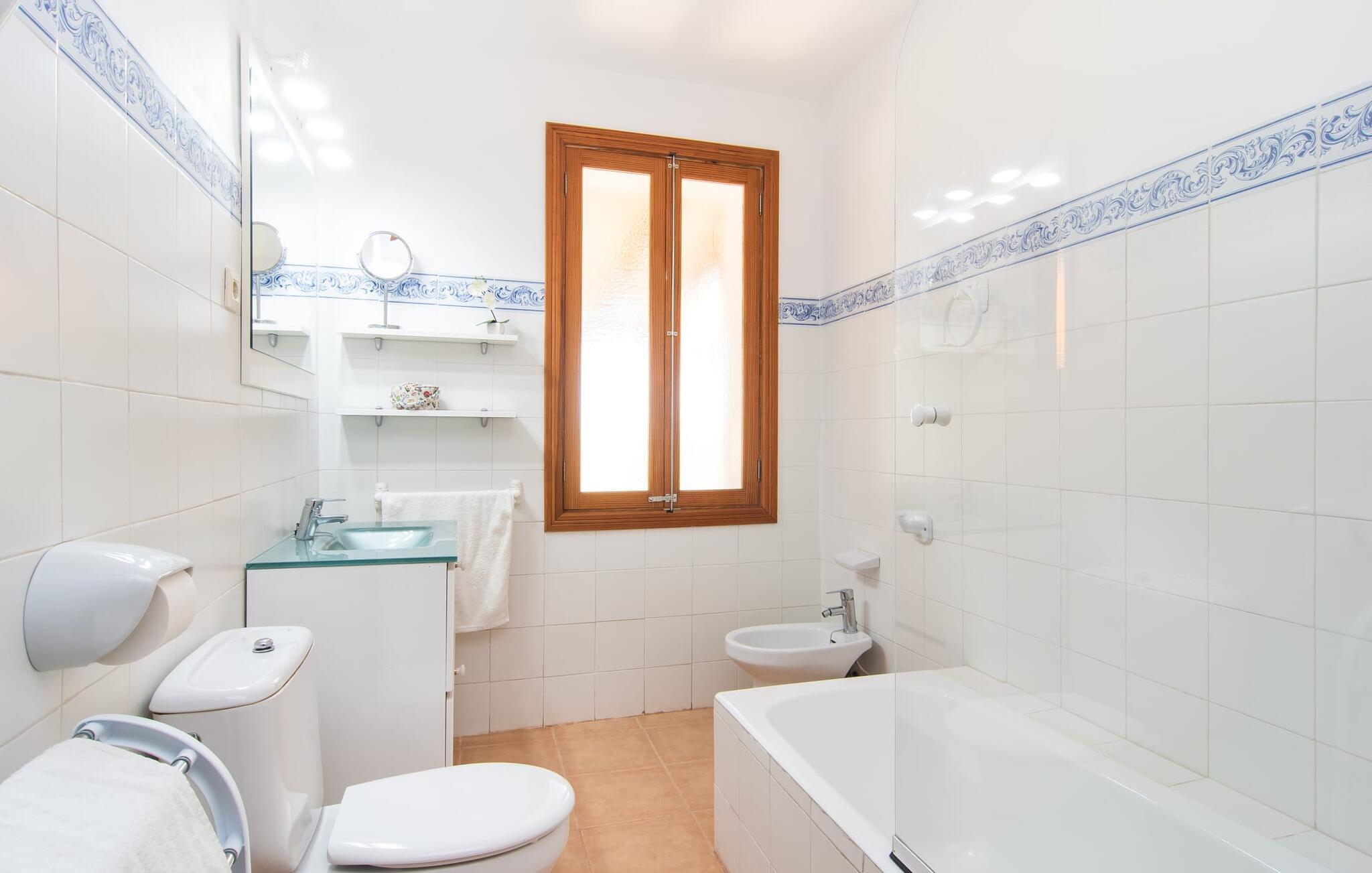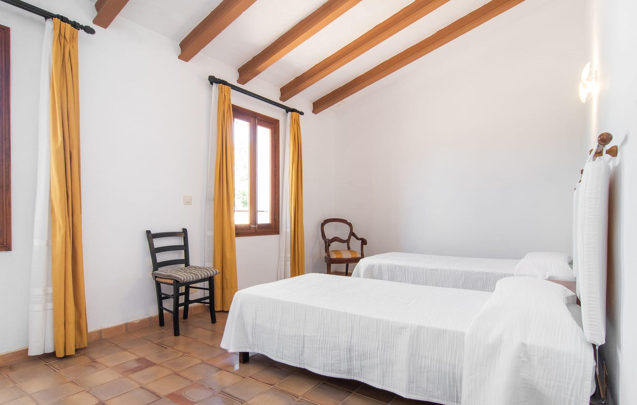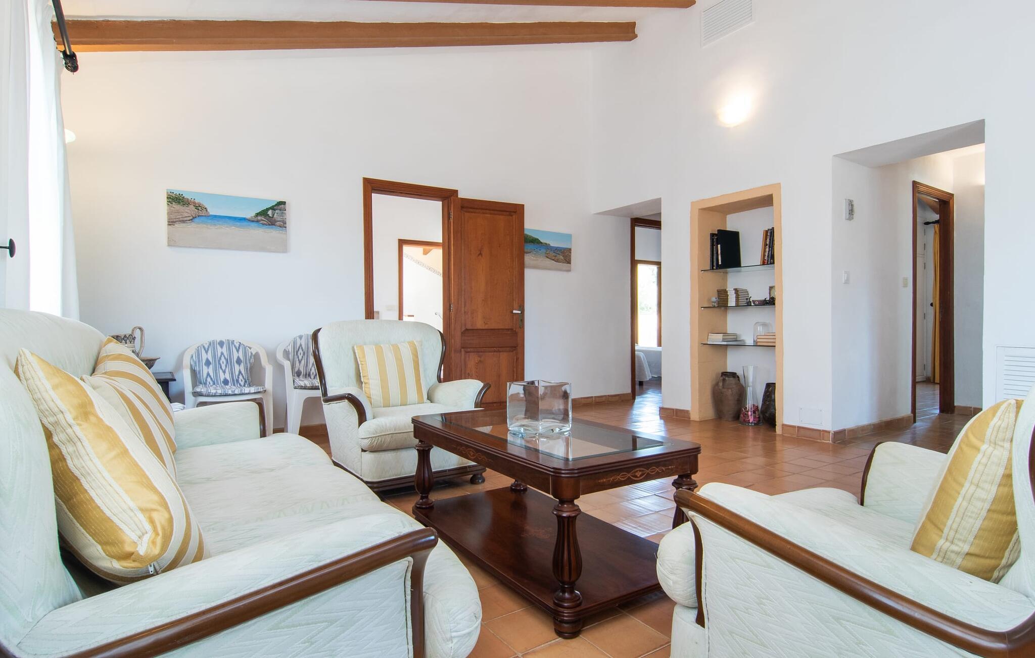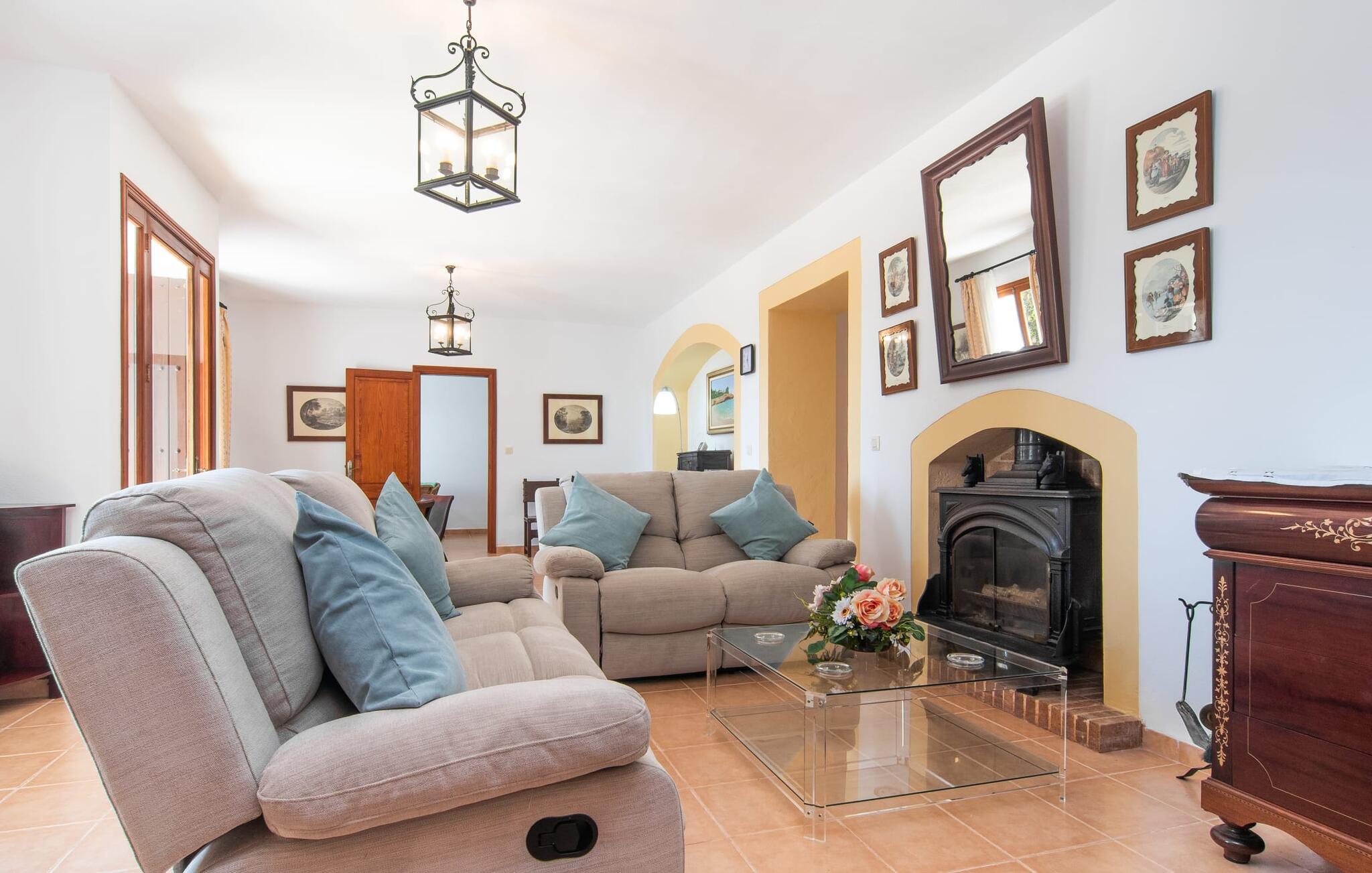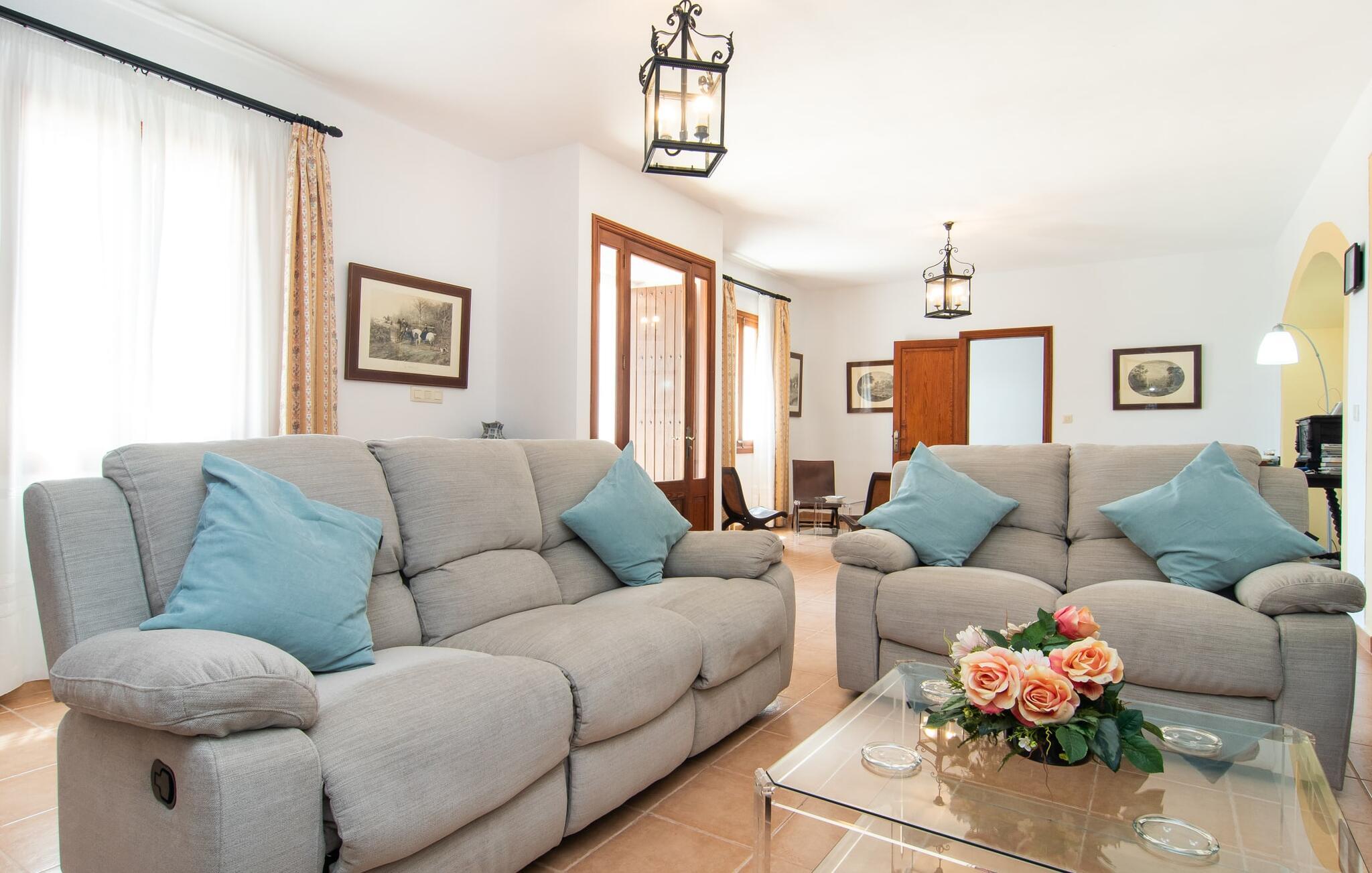 Enhver, der vælger villaen "Ses Cases de Son Isidros" kan føle sig som en stor grundejer under deres ophold på Mallorca med god samvittighed: Den omfattende ejendom minder om en vildt romantisk park, og hvorpå der vokser palmer og andre middelhavsplanter og træer. giver skygge, dækker et areal på næsten 100.000 m². Her kan I slentre som I vil, nyde de intenst lyse blomster, lege gemmeleg med de mindste, nyde eftermiddagste i et af de hyggelige siddeområder eller blot tage et forfriskende hop i det kølige vand i jeres herskabelige pool. Bagefter kan I dingle benene i vandet på kanten af stenen og fordybe jer i en underholdende ferielæsning. Fra poolterrassen, hvor flere liggestole inviterer til en lur i solen, fører stentrappe op til ejendommen, hvis stenbrudsfacade har en overdækket terrasse. I kan eventuelt sætte grillen op her sidst på eftermiddagen for at afslutte aftenen med øens kulinariske delikatesser. En stor tagterrasse og en altan er også ideelle steder at lade den milde ø-luft, som dufter behageligt af havet, blæse næsen. Huset imponerer med store rum, hvor sjælen kan ånde; Hertil bidrager harmonien mellem den dominerende hvide tone og de højkvalitets, delvist antikke træmøbler. I stuen kan I se knitren fra den flammende pejs fra de statelige lædersofaer eller, takket være moderne satellitteknologi, holde jer ajour med, hvad der sker derhjemme på widescreen-tv'et. Måske vil I helst holde jer helt væk fra hverdagens stress og jag i hele jeres ferie, så I kan fordybe jer i fred og afslapning lidt mere hver dag i disse fredfyldte omgivelser. I et sideværelse kan I spise på kurvestole eller afslutte aftenen med et sjovt brætspil. Køkkenet er fuldt udstyret; Et separat rum er reserveret til andre huslige pligter som tøjvask. Tre af de seks soveværelser og to af badeværelserne er i stueetagen, hvoraf det ene har en dobbeltseng, et en enkeltseng og et har to enkeltsenge. Ejerne lægger stor vægt på den atmosfæriske belysning af værelserne, og takket være vinduerne er interiøret lyst og venligt hele dagen lang. Det nyder også overetagen godt af, hvor de tre ekstra soveværelser er placeret - hvoraf de to har eget badeværelse. En dobbeltseng og to værelser med to enkeltsenge giver hver stor fleksibilitet i værelsesbelægningen. Og det faktum, at der er en privat stue ovenpå med en kæmpe skærm gør, at selv større grupper kan forvente et vist niveau af privatliv i denne villa. Fire af badeværelserne har endda badekar, så I kan runde dagen af med en forkælelsesoplevelse for jeres hud. Da villaen "Ses Cases de Son Isidros" ligger centralt, kan I sprede jer i alle retninger med jeres lejebil. Hvis I vælger øst, kan I være heldig at opdage en af de skjulte, uspolerede strande, der fører til blindgyder. I kan nå Manacor på 10 minutter i bil, hvor I kan nippe til en historisk cortado i en af gadecaféerne eller se travlheden på det ugentlige marked om mandagen. Den fjerne by Sant Llorenc er også perfekt til shopping. Colonia de Sant Pere er en halv times kørsel væk; Takket være bølgebryderne er kysten her særdeles velegnet til familier. Havnebyen Porto Cristo ligger 16 km væk; Her kan I se luksuriøse yachter og fiskerbåde sejle ud på havet, inden I vender tilbage til jeres villa i en vidunderlig fredelig beliggenhed. Villaen "Ses Cases de Son Isidros" overlader fiflet til andre: På grund af sin centrale beliggenhed kan I forvente dejlige udflugter fra alle fire retninger fra jeres enorme ejendom. I kan købe souvenirs til jeres kære i Manacor, 5 km væk - regionen har specialiseret sig i lædervarer. Strandene på østkysten er særligt forskellige; For eksempel kan I hoppe i havet i Porto Cristo, 20 minutters kørsel væk.