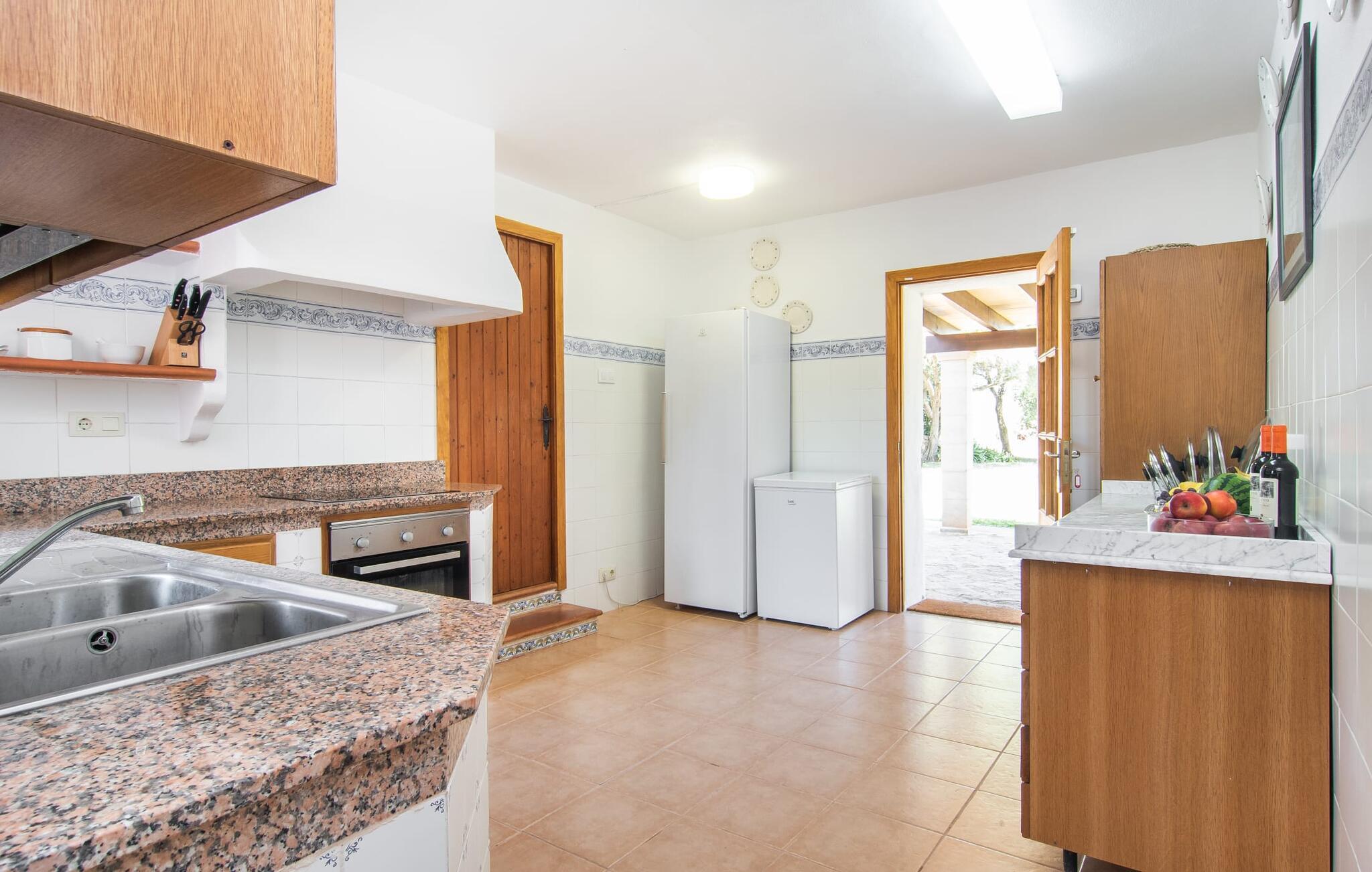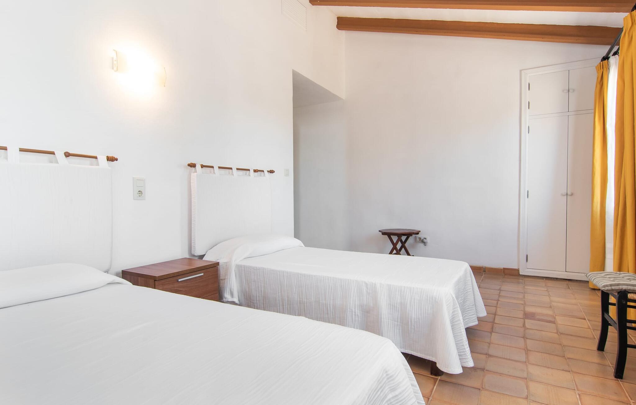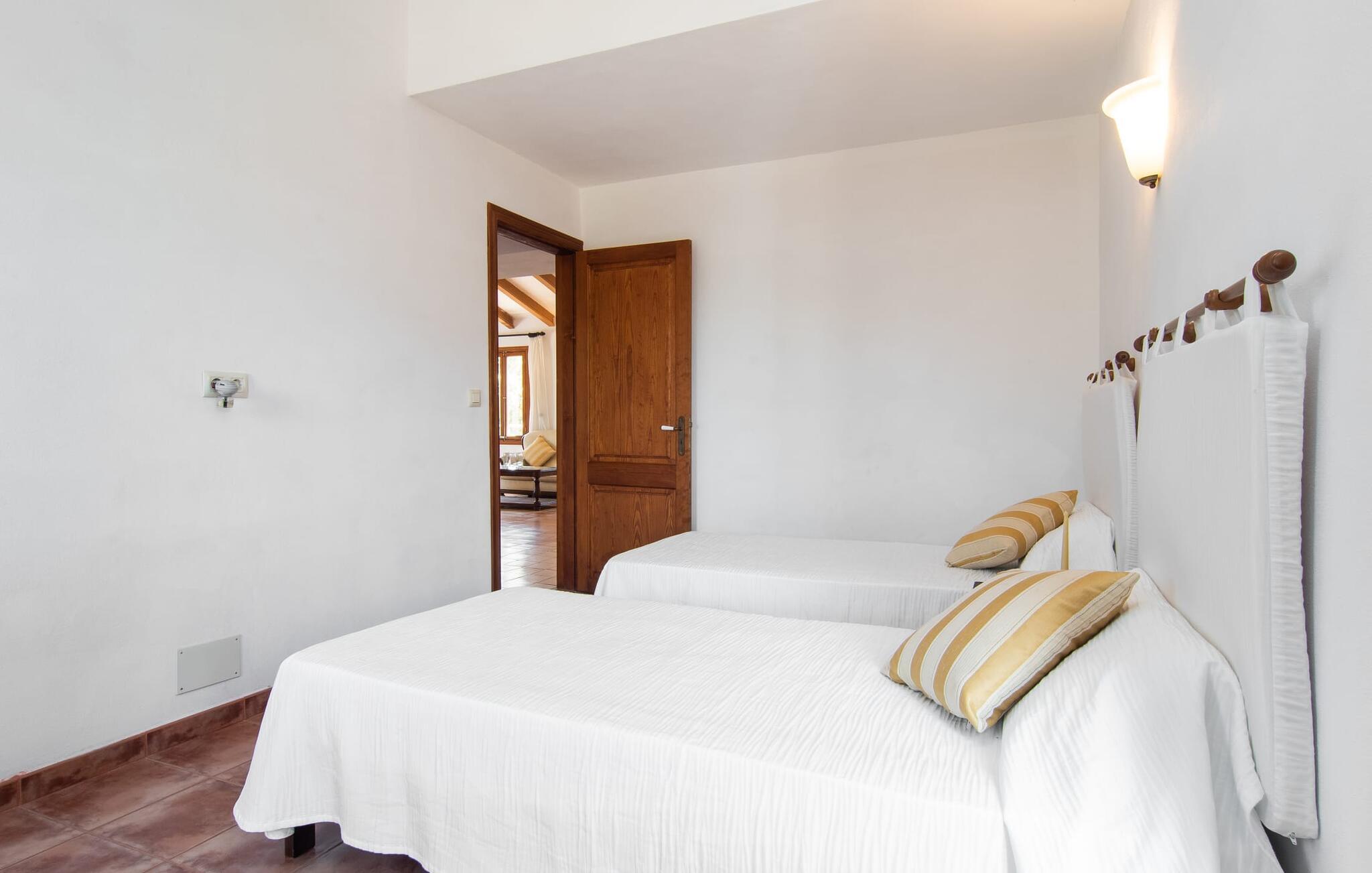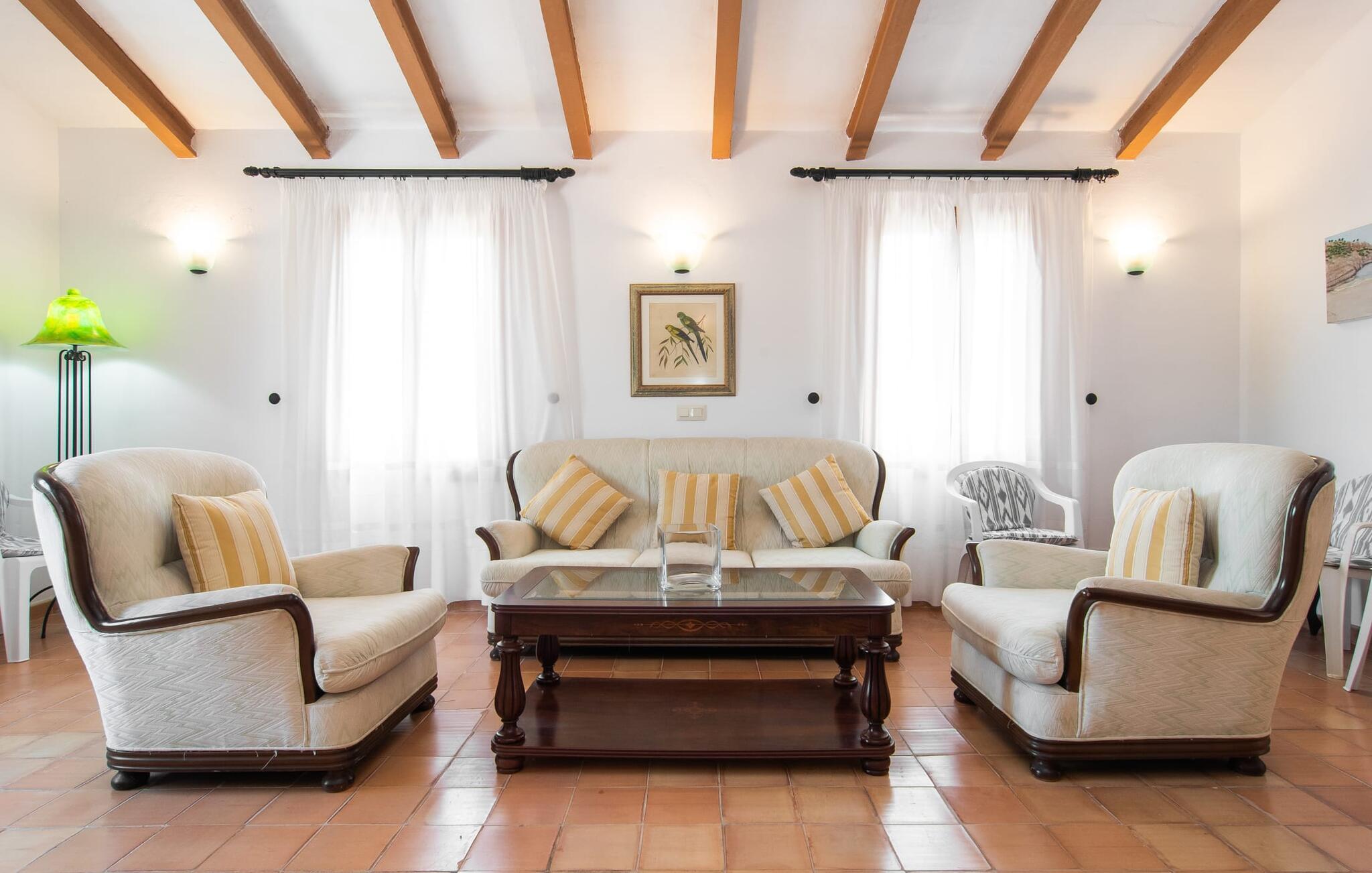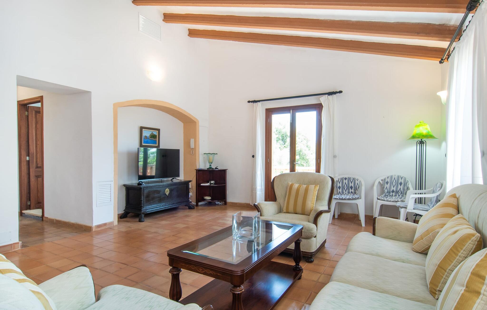 Enhver, der vælger villaen "Ses Cases de Son Isidros" kan føle sig som en stor grundejer under deres ophold på Mallorca med god samvittighed: Den omfattende ejendom minder om en vildt romantisk park, og hvorpå der vokser palmer og andre middelhavsplanter og træer. giver skygge, dækker et areal på næsten 100.000 m². Her kan I slentre som I vil, nyde de intenst lyse blomster, lege gemmeleg med de mindste, nyde eftermiddagste i et af de hyggelige siddeområder eller blot tage et forfriskende hop i det kølige vand i jeres herskabelige pool. Bagefter kan I dingle benene i vandet på kanten af stenen og fordybe jer i en underholdende ferielæsning. Fra poolterrassen, hvor flere liggestole inviterer til en lur i solen, fører stentrappe op til ejendommen, hvis stenbrudsfacade har en overdækket terrasse. I kan eventuelt sætte grillen op her sidst på eftermiddagen for at afslutte aftenen med øens kulinariske delikatesser. En stor tagterrasse og en altan er også ideelle steder at lade den milde ø-luft, som dufter behageligt af havet, blæse næsen. Huset imponerer med store rum, hvor sjælen kan ånde; Hertil bidrager harmonien mellem den dominerende hvide tone og de højkvalitets, delvist antikke træmøbler. I stuen kan I se knitren fra den flammende pejs fra de statelige lædersofaer eller, takket være moderne satellitteknologi, holde jer ajour med, hvad der sker derhjemme på widescreen-tv'et. Måske vil I helst holde jer helt væk fra hverdagens stress og jag i hele jeres ferie, så I kan fordybe jer i fred og afslapning lidt mere hver dag i disse fredfyldte omgivelser. I et sideværelse kan I spise på kurvestole eller afslutte aftenen med et sjovt brætspil. Køkkenet er fuldt udstyret; Et separat rum er reserveret til andre huslige pligter som tøjvask. Tre af de seks soveværelser og to af badeværelserne er i stueetagen, hvoraf det ene har en dobbeltseng, et en enkeltseng og et har to enkeltsenge. Ejerne lægger stor vægt på den atmosfæriske belysning af værelserne, og takket være vinduerne er interiøret lyst og venligt hele dagen lang. Det nyder også overetagen godt af, hvor de tre ekstra soveværelser er placeret - hvoraf de to har eget badeværelse. En dobbeltseng og to værelser med to enkeltsenge giver hver stor fleksibilitet i værelsesbelægningen. Og det faktum, at der er en privat stue ovenpå med en kæmpe skærm gør, at selv større grupper kan forvente et vist niveau af privatliv i denne villa. Fire af badeværelserne har endda badekar, så I kan runde dagen af med en forkælelsesoplevelse for jeres hud. Da villaen "Ses Cases de Son Isidros" ligger centralt, kan I sprede jer i alle retninger med jeres lejebil. Hvis I vælger øst, kan I være heldig at opdage en af de skjulte, uspolerede strande, der fører til blindgyder. I kan nå Manacor på 10 minutter i bil, hvor I kan nippe til en historisk cortado i en af gadecaféerne eller se travlheden på det ugentlige marked om mandagen. Den fjerne by Sant Llorenc er også perfekt til shopping. Colonia de Sant Pere er en halv times kørsel væk; Takket være bølgebryderne er kysten her særdeles velegnet til familier. Havnebyen Porto Cristo ligger 16 km væk; Her kan I se luksuriøse yachter og fiskerbåde sejle ud på havet, inden I vender tilbage til jeres villa i en vidunderlig fredelig beliggenhed. Villaen "Ses Cases de Son Isidros" overlader fiflet til andre: På grund af sin centrale beliggenhed kan I forvente dejlige udflugter fra alle fire retninger fra jeres enorme ejendom. I kan købe souvenirs til jeres kære i Manacor, 5 km væk - regionen har specialiseret sig i lædervarer. Strandene på østkysten er særligt forskellige; For eksempel kan I hoppe i havet i Porto Cristo, 20 minutters kørsel væk.