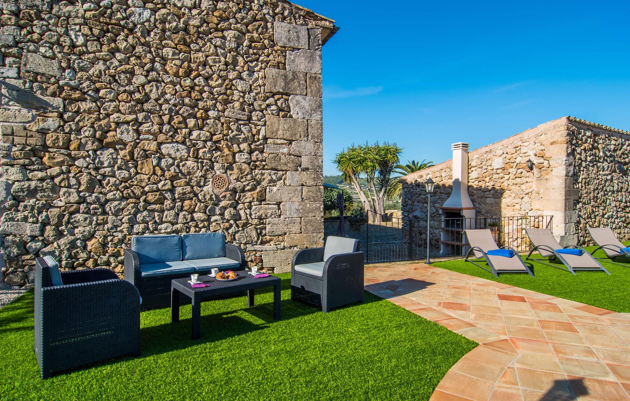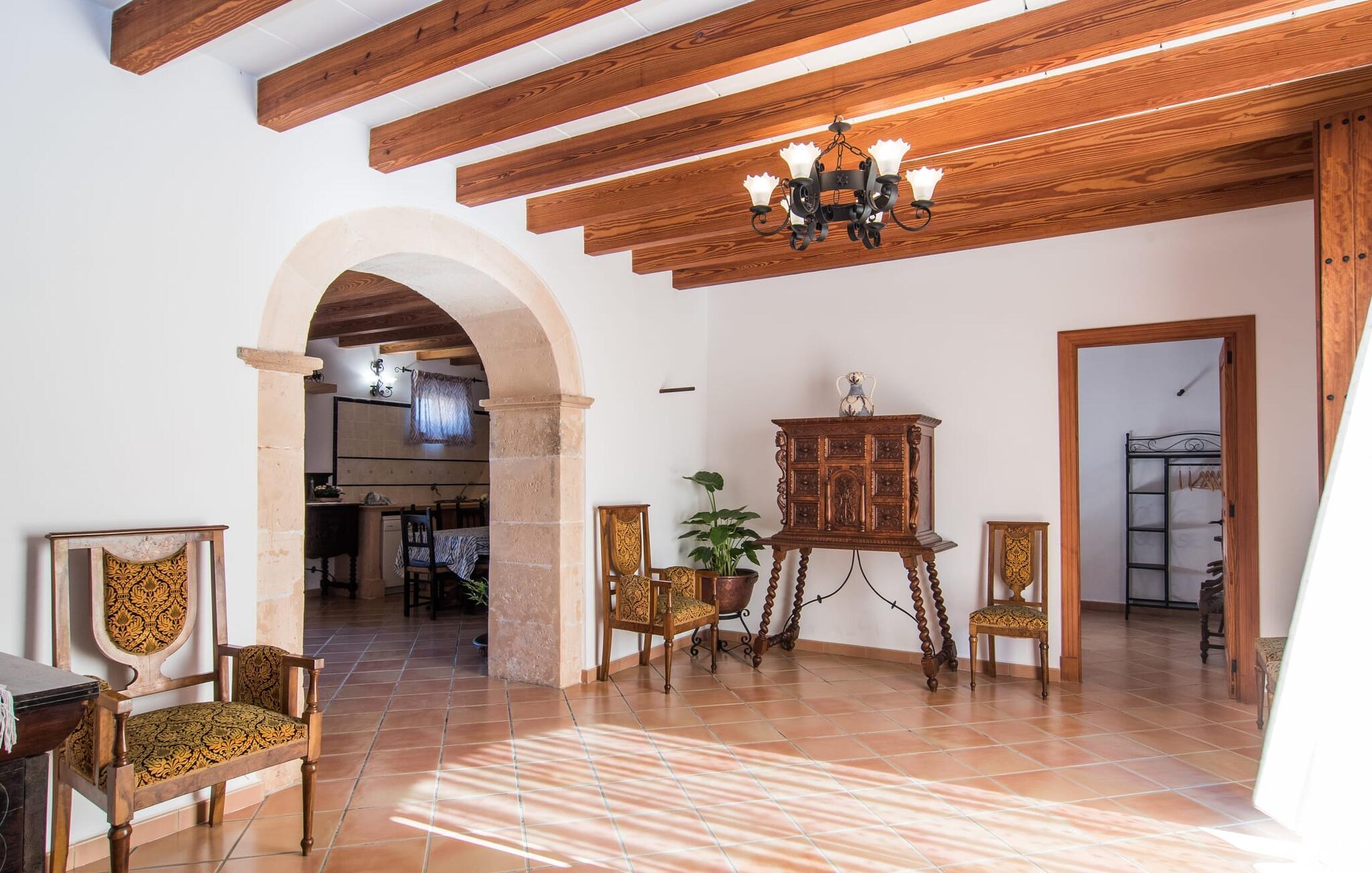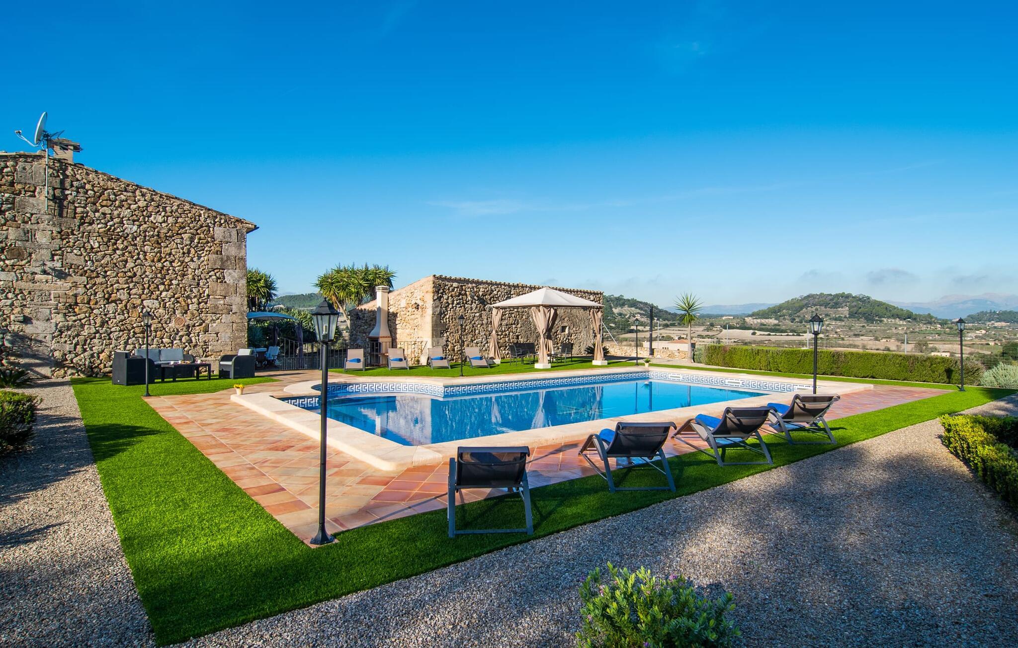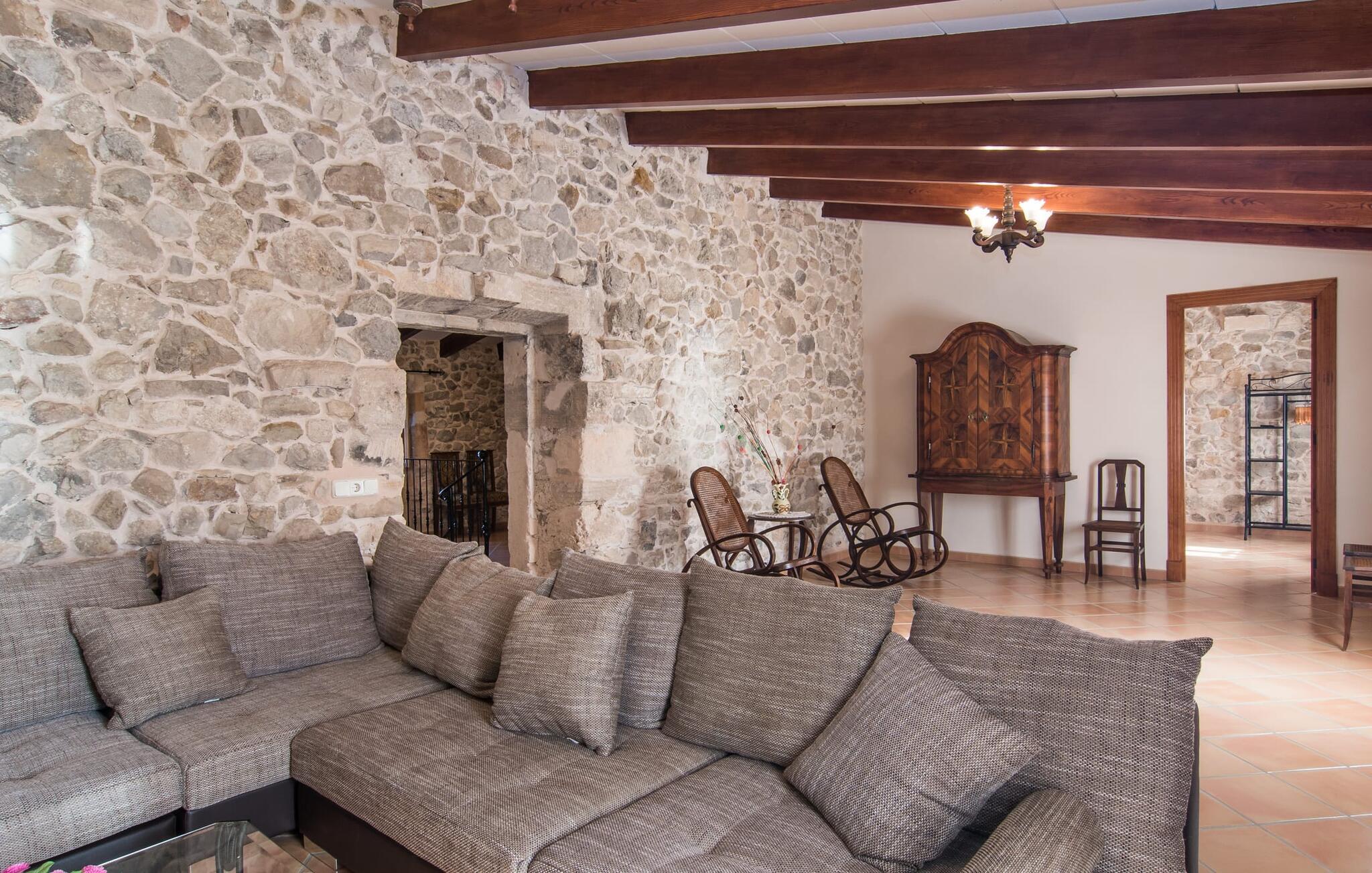 Hvis I leder efter noget særligt, er villaen "Ses Cases de Son Roig" kommet til det rigtige sted: historien om denne landejendom går imponerende 200 år tilbage. De rustikke gamle vægge har tilbudt et hjem og beskyttelse så længe - og siden renoveringen har de også levet op til de højeste standarder. Lad os starte vores tur i den elegante have: Omgivet af et frodigt grønt landskab og skove, vil I nyde panoramaudsigten i fugleperspektiv over det mallorcanske bagland og det slående omrids af Tramuntana-bjergene bagved. Når I har fået jeres badeshorts på, er I klar til den glitrende blå pool. jeres ferie skal jo også forynge jeres hud. En stor del af dette er indtaget af D-vitamin – heldigvis er solen aldrig en mangelvare. Spørgsmålet er kun, hvilken lille plads på ejendommen I har lyst til at nyde solskinnet. Blandt kandidaterne kan nævnes den panoramiske loungeterrasse lige ved siden af ??poolen, tagterrassen, der bringer jer lidt tættere på himlen på jorden, og et hjørne af den parklignende og yderst velplejede have - eller måske den lyse terrasse inde i huset med dens komfortable rattanmøbler? Er varmen for meget for jer, er der også en pergola til rådighed. Når solen endelig går ned, er det tid til den indbyggede grill, jeres trofaste følgesvend, når I tilbereder lækre delikatesser. Når I træder ind i huset, bliver I mødt af den rustikke hygge i de komfortabelt indrettede lokaler, som får en sund dosis lys i løbet af dagen. Om aftenen kan køkkenet blive et socialt mødested, især hvis I beslutter jer for at tænde den åbne pejs. To af dobbeltværelserne er i stueetagen samt et rummeligt badeværelse, mens de to øvrige soveværelser ligger på første sal, hvor der også er stuen med en kæmpe sofa, fladskærms-tv og autentisk naturstensvæg. Et af soveværelserne har en stor dobbeltseng, det andet har to store dobbeltsenge og en anden stor seng adskilt af en foldeskærm. Møbelstilen understreger værdifulde, antikke smykker, der tilføjer elegance til atmosfæren. Her er endnu et badeværelse, der ligesom sit modstykke i stueetagen også har et badekar til en eftertænksom afslutning på dagen. Det lille feriested Sant Joan ligger kun 3 km væk. Der vil I finde alt, hvad I har brug for til jeres daglige behov, forundre jer over den enorme kirke Sant Joan Baptista med dens alabastprædikestol eller finde ud af, hvordan baronerne på øen levede i feudal tid. Om torsdagen er der et ugentligt marked med friske varer i byen. Vinkendere ønsker måske at afslutte deres shoppingtur på La Reserva Rotana Resort, 22 km væk, hvor de kan deltage i en smagning på stedets bodega. I kan også spille golf her. Den populære sandstrand Can Picafort er kun en halv time væk med jeres lejebil. Byerne Sineu, Sencelles og Costitx er også et besøg værd. De ligger alle ud for kysten, en del af Mallorca kendt for lækker mad, gamle vindmøller og fantastiske landskaber. Den historiske villa "Ses Cases de Son Roig" byder på en vidunderlig blanding af idyllisk landskab og god infrastruktur 3 km nord for den rolige landsby Sant Joan. I kan selv gøre jeres daglige indkøb i byen. Hvis I føler jer tiltrukket af havet, er Can Picafort, 30 minutter væk, en glimrende mulighed. Men østkystens mangfoldighed er også kun en kort køretur væk.