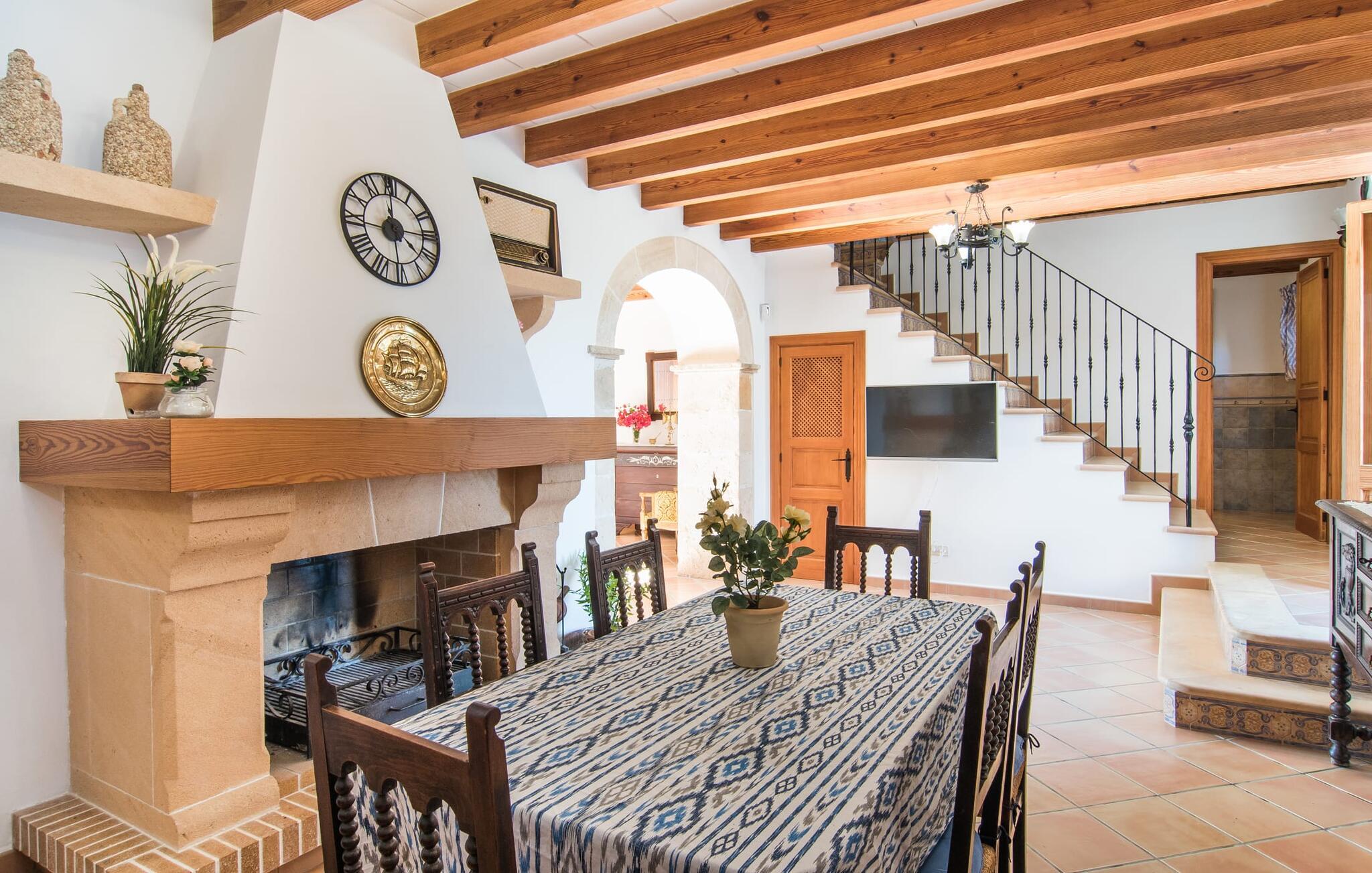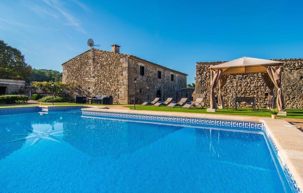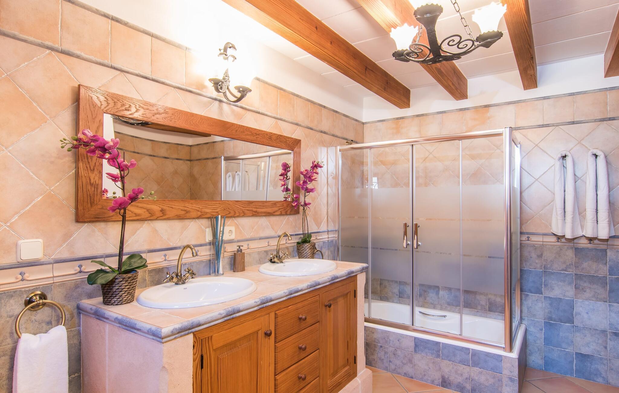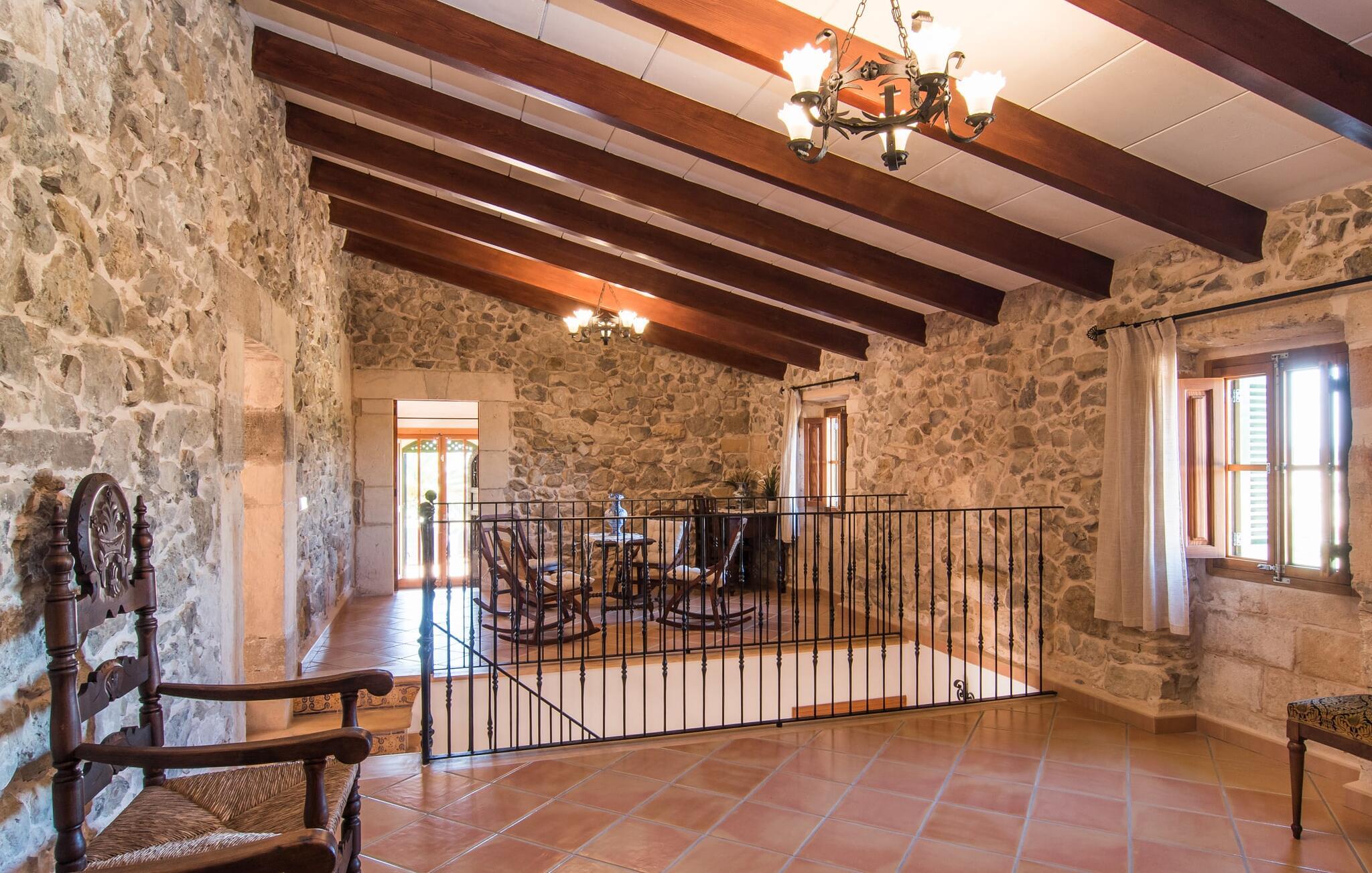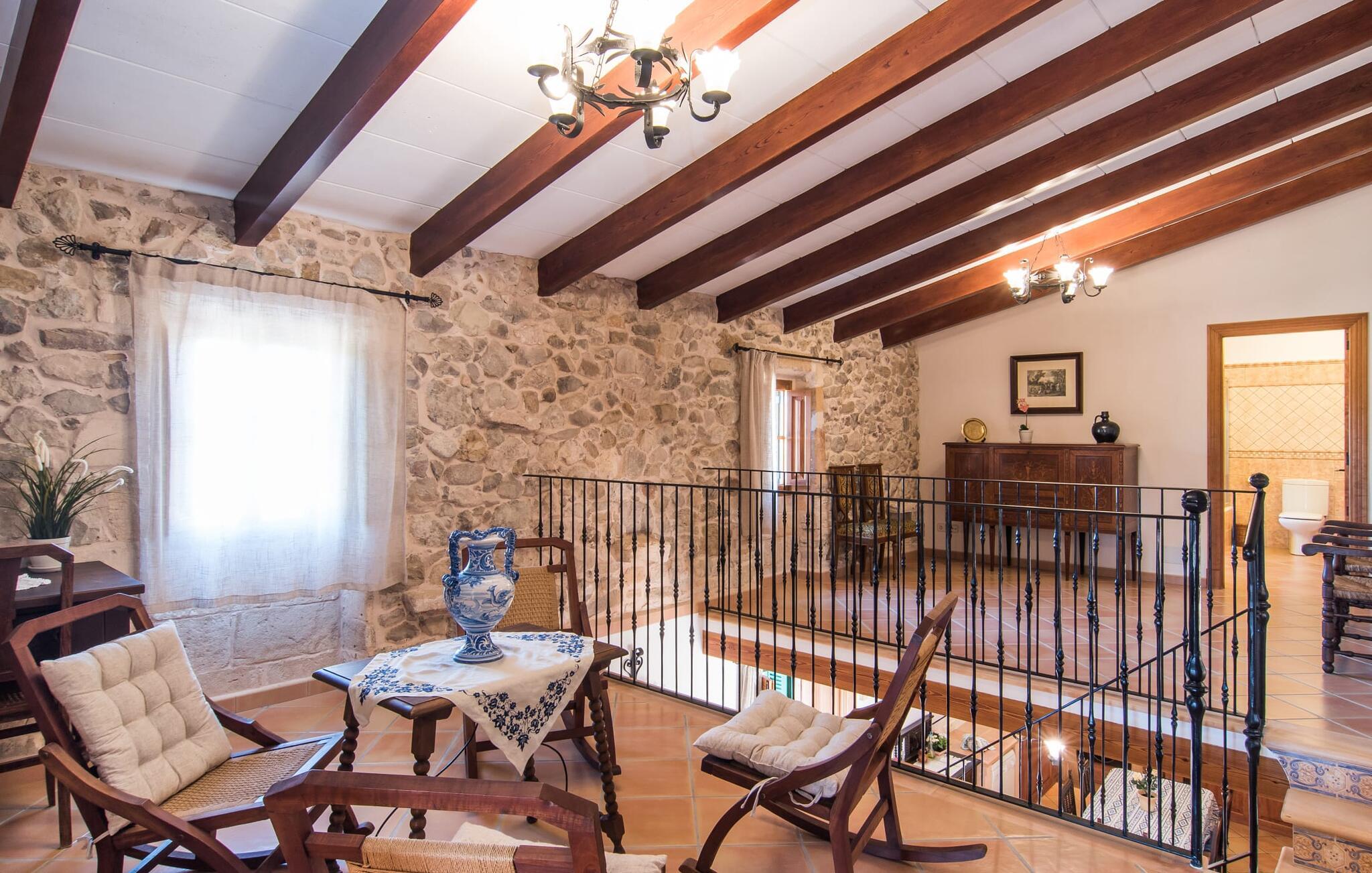 Hvis I leder efter noget særligt, er villaen "Ses Cases de Son Roig" kommet til det rigtige sted: historien om denne landejendom går imponerende 200 år tilbage. De rustikke gamle vægge har tilbudt et hjem og beskyttelse så længe - og siden renoveringen har de også levet op til de højeste standarder. Lad os starte vores tur i den elegante have: Omgivet af et frodigt grønt landskab og skove, vil I nyde panoramaudsigten i fugleperspektiv over det mallorcanske bagland og det slående omrids af Tramuntana-bjergene bagved. Når I har fået jeres badeshorts på, er I klar til den glitrende blå pool. jeres ferie skal jo også forynge jeres hud. En stor del af dette er indtaget af D-vitamin – heldigvis er solen aldrig en mangelvare. Spørgsmålet er kun, hvilken lille plads på ejendommen I har lyst til at nyde solskinnet. Blandt kandidaterne kan nævnes den panoramiske loungeterrasse lige ved siden af ??poolen, tagterrassen, der bringer jer lidt tættere på himlen på jorden, og et hjørne af den parklignende og yderst velplejede have - eller måske den lyse terrasse inde i huset med dens komfortable rattanmøbler? Er varmen for meget for jer, er der også en pergola til rådighed. Når solen endelig går ned, er det tid til den indbyggede grill, jeres trofaste følgesvend, når I tilbereder lækre delikatesser. Når I træder ind i huset, bliver I mødt af den rustikke hygge i de komfortabelt indrettede lokaler, som får en sund dosis lys i løbet af dagen. Om aftenen kan køkkenet blive et socialt mødested, især hvis I beslutter jer for at tænde den åbne pejs. To af dobbeltværelserne er i stueetagen samt et rummeligt badeværelse, mens de to øvrige soveværelser ligger på første sal, hvor der også er stuen med en kæmpe sofa, fladskærms-tv og autentisk naturstensvæg. Et af soveværelserne har en stor dobbeltseng, det andet har to store dobbeltsenge og en anden stor seng adskilt af en foldeskærm. Møbelstilen understreger værdifulde, antikke smykker, der tilføjer elegance til atmosfæren. Her er endnu et badeværelse, der ligesom sit modstykke i stueetagen også har et badekar til en eftertænksom afslutning på dagen. Det lille feriested Sant Joan ligger kun 3 km væk. Der vil I finde alt, hvad I har brug for til jeres daglige behov, forundre jer over den enorme kirke Sant Joan Baptista med dens alabastprædikestol eller finde ud af, hvordan baronerne på øen levede i feudal tid. Om torsdagen er der et ugentligt marked med friske varer i byen. Vinkendere ønsker måske at afslutte deres shoppingtur på La Reserva Rotana Resort, 22 km væk, hvor de kan deltage i en smagning på stedets bodega. I kan også spille golf her. Den populære sandstrand Can Picafort er kun en halv time væk med jeres lejebil. Byerne Sineu, Sencelles og Costitx er også et besøg værd. De ligger alle ud for kysten, en del af Mallorca kendt for lækker mad, gamle vindmøller og fantastiske landskaber. Den historiske villa "Ses Cases de Son Roig" byder på en vidunderlig blanding af idyllisk landskab og god infrastruktur 3 km nord for den rolige landsby Sant Joan. I kan selv gøre jeres daglige indkøb i byen. Hvis I føler jer tiltrukket af havet, er Can Picafort, 30 minutter væk, en glimrende mulighed. Men østkystens mangfoldighed er også kun en kort køretur væk.