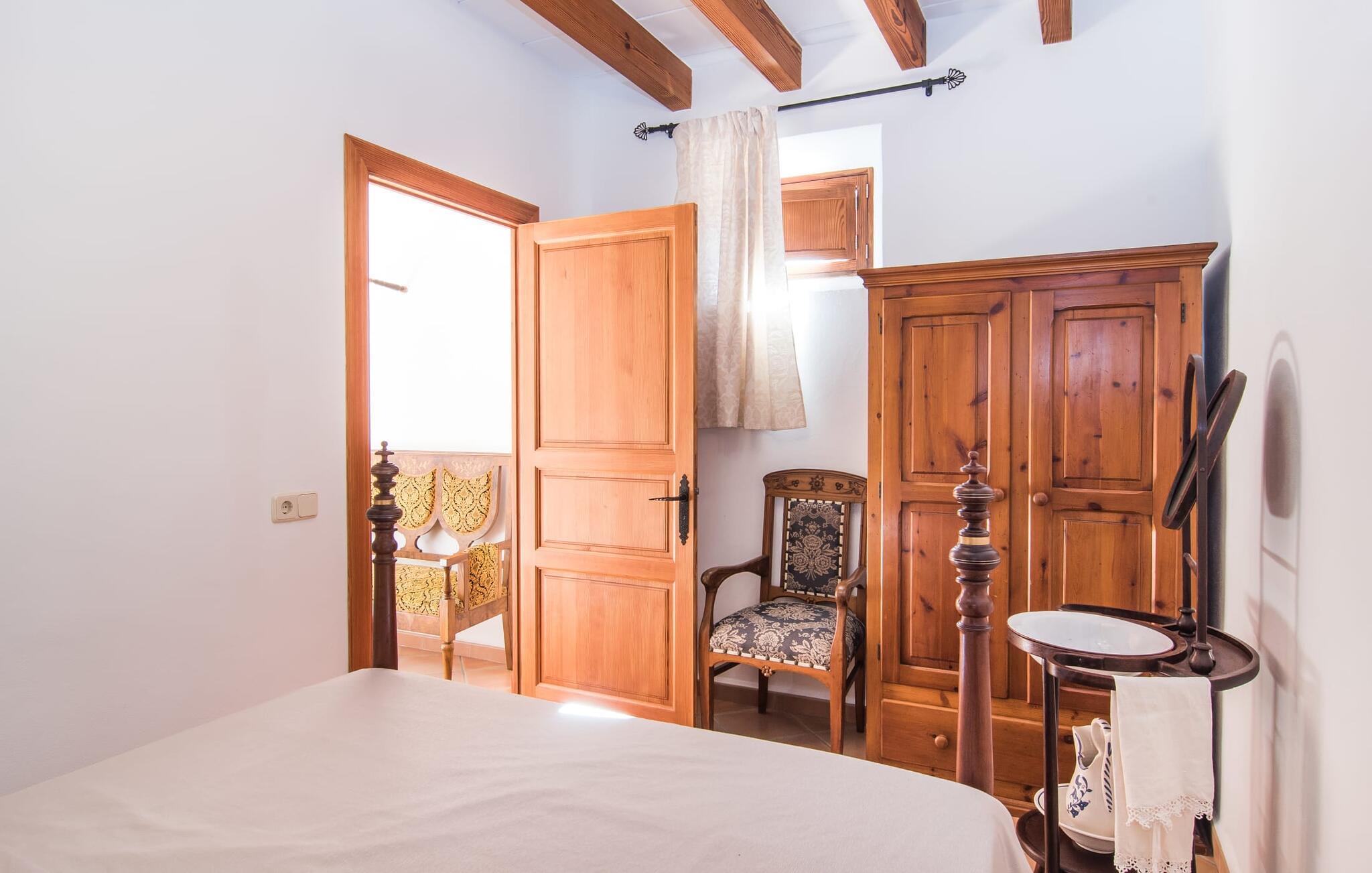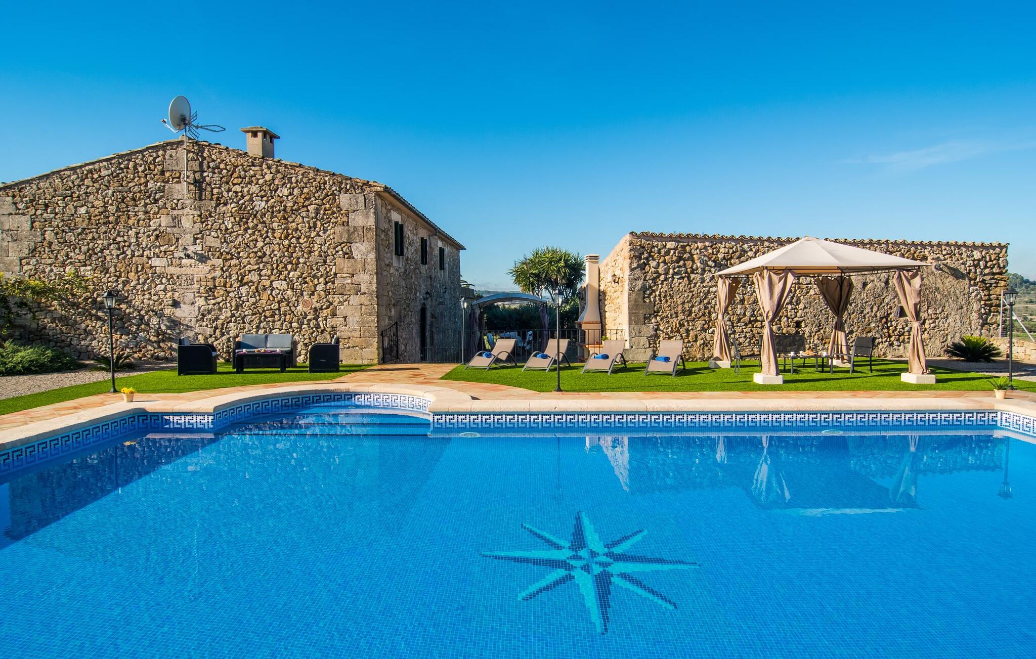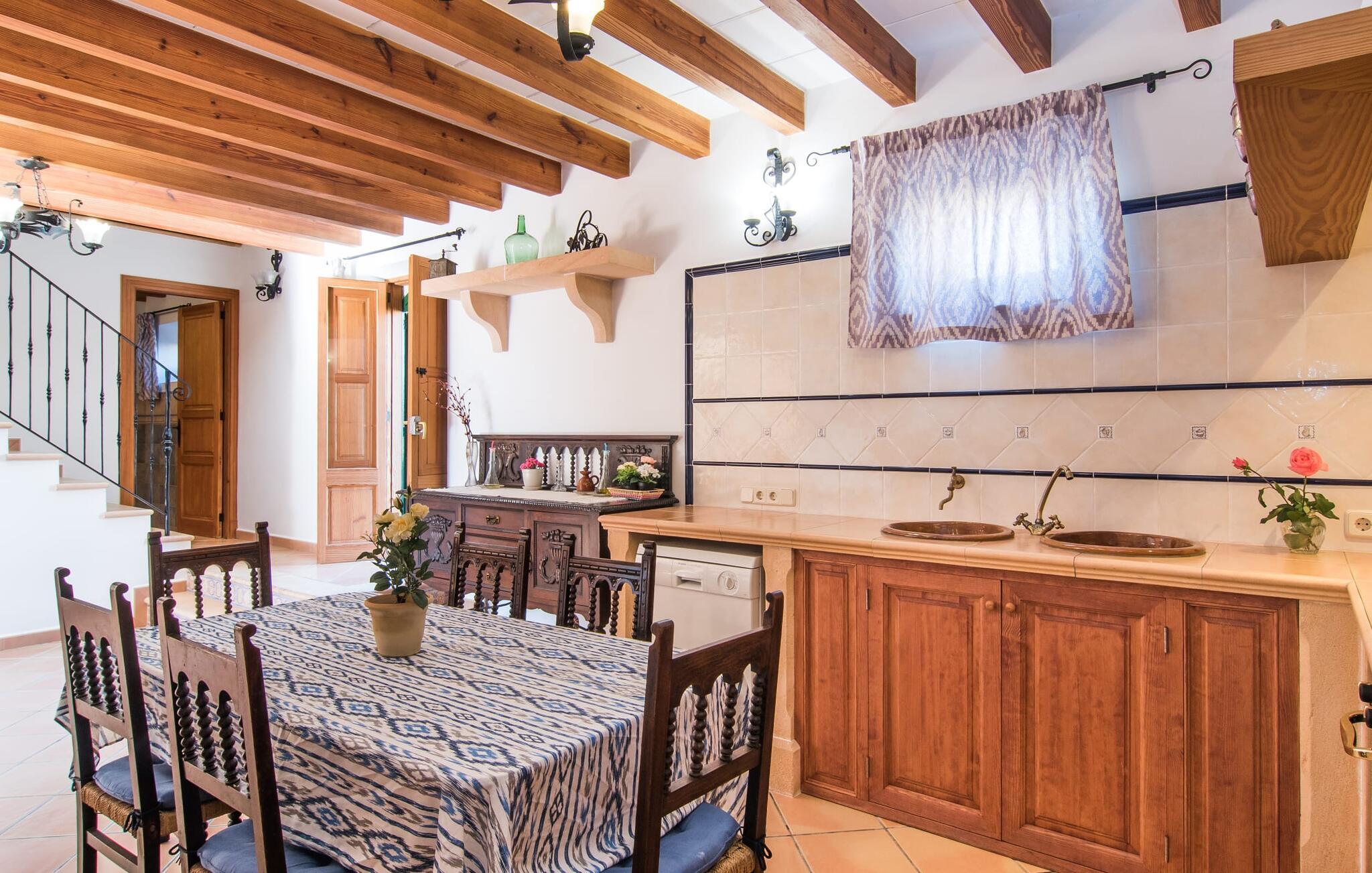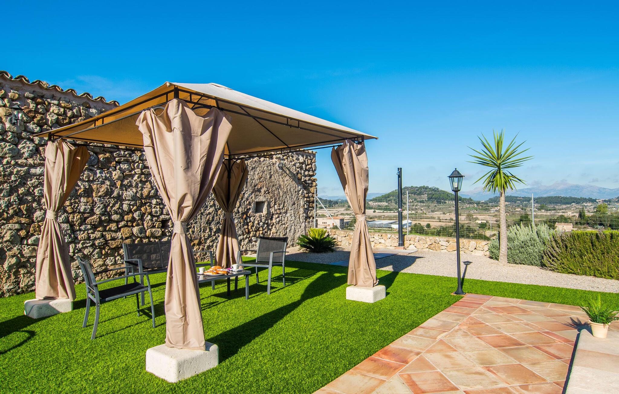 Hvis I leder efter noget særligt, er villaen "Ses Cases de Son Roig" kommet til det rigtige sted: historien om denne landejendom går imponerende 200 år tilbage. De rustikke gamle vægge har tilbudt et hjem og beskyttelse så længe - og siden renoveringen har de også levet op til de højeste standarder. Lad os starte vores tur i den elegante have: Omgivet af et frodigt grønt landskab og skove, vil I nyde panoramaudsigten i fugleperspektiv over det mallorcanske bagland og det slående omrids af Tramuntana-bjergene bagved. Når I har fået jeres badeshorts på, er I klar til den glitrende blå pool. jeres ferie skal jo også forynge jeres hud. En stor del af dette er indtaget af D-vitamin – heldigvis er solen aldrig en mangelvare. Spørgsmålet er kun, hvilken lille plads på ejendommen I har lyst til at nyde solskinnet. Blandt kandidaterne kan nævnes den panoramiske loungeterrasse lige ved siden af ??poolen, tagterrassen, der bringer jer lidt tættere på himlen på jorden, og et hjørne af den parklignende og yderst velplejede have - eller måske den lyse terrasse inde i huset med dens komfortable rattanmøbler? Er varmen for meget for jer, er der også en pergola til rådighed. Når solen endelig går ned, er det tid til den indbyggede grill, jeres trofaste følgesvend, når I tilbereder lækre delikatesser. Når I træder ind i huset, bliver I mødt af den rustikke hygge i de komfortabelt indrettede lokaler, som får en sund dosis lys i løbet af dagen. Om aftenen kan køkkenet blive et socialt mødested, især hvis I beslutter jer for at tænde den åbne pejs. To af dobbeltværelserne er i stueetagen samt et rummeligt badeværelse, mens de to øvrige soveværelser ligger på første sal, hvor der også er stuen med en kæmpe sofa, fladskærms-tv og autentisk naturstensvæg. Et af soveværelserne har en stor dobbeltseng, det andet har to store dobbeltsenge og en anden stor seng adskilt af en foldeskærm. Møbelstilen understreger værdifulde, antikke smykker, der tilføjer elegance til atmosfæren. Her er endnu et badeværelse, der ligesom sit modstykke i stueetagen også har et badekar til en eftertænksom afslutning på dagen. Det lille feriested Sant Joan ligger kun 3 km væk. Der vil I finde alt, hvad I har brug for til jeres daglige behov, forundre jer over den enorme kirke Sant Joan Baptista med dens alabastprædikestol eller finde ud af, hvordan baronerne på øen levede i feudal tid. Om torsdagen er der et ugentligt marked med friske varer i byen. Vinkendere ønsker måske at afslutte deres shoppingtur på La Reserva Rotana Resort, 22 km væk, hvor de kan deltage i en smagning på stedets bodega. I kan også spille golf her. Den populære sandstrand Can Picafort er kun en halv time væk med jeres lejebil. Byerne Sineu, Sencelles og Costitx er også et besøg værd. De ligger alle ud for kysten, en del af Mallorca kendt for lækker mad, gamle vindmøller og fantastiske landskaber. Den historiske villa "Ses Cases de Son Roig" byder på en vidunderlig blanding af idyllisk landskab og god infrastruktur 3 km nord for den rolige landsby Sant Joan. I kan selv gøre jeres daglige indkøb i byen. Hvis I føler jer tiltrukket af havet, er Can Picafort, 30 minutter væk, en glimrende mulighed. Men østkystens mangfoldighed er også kun en kort køretur væk.
