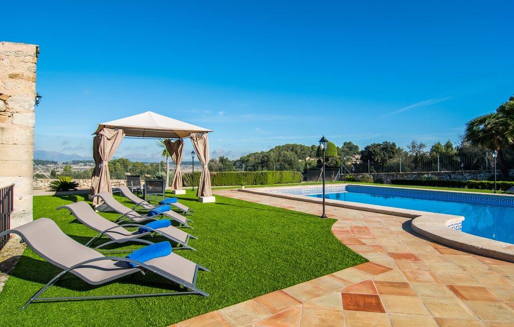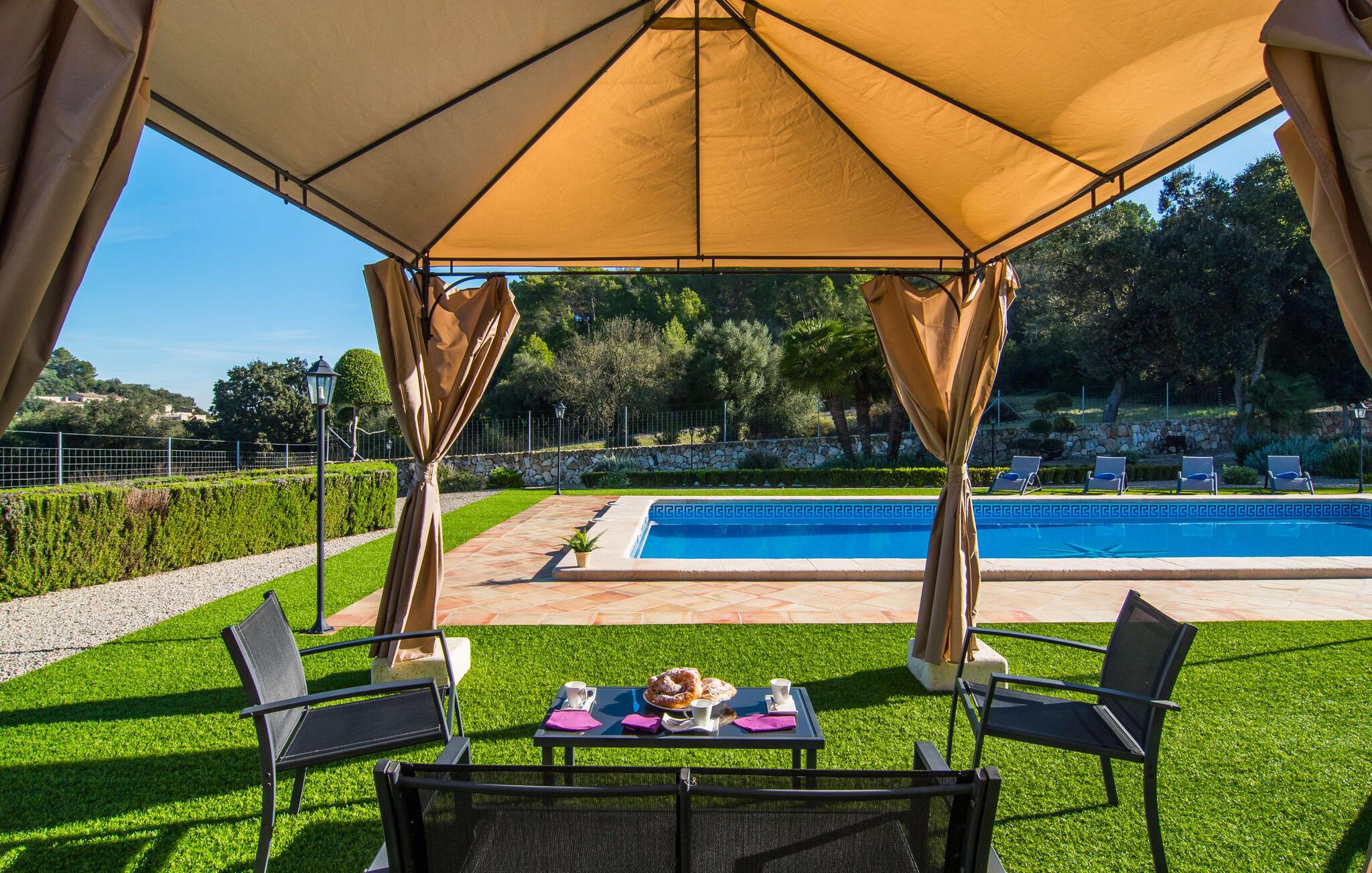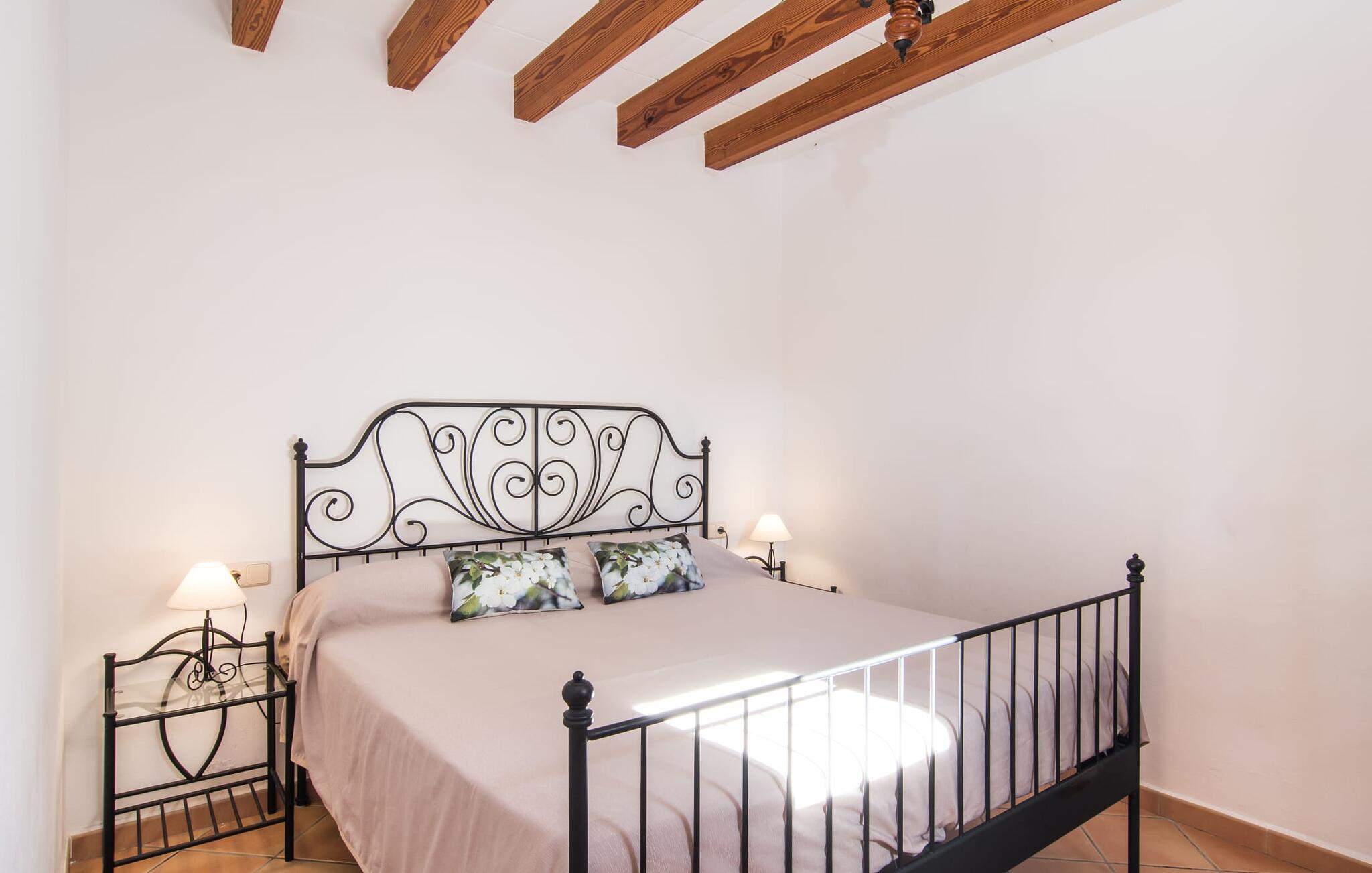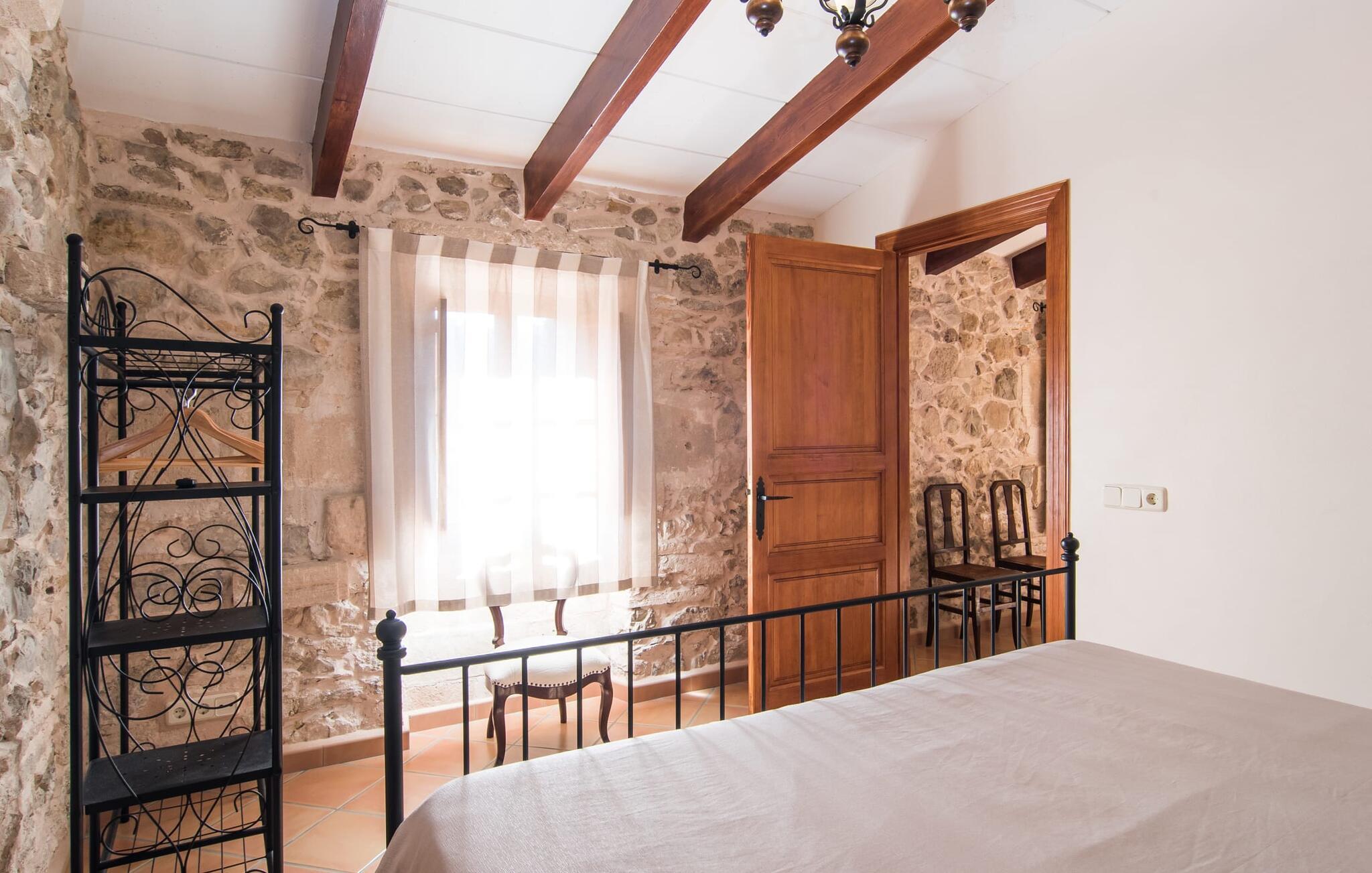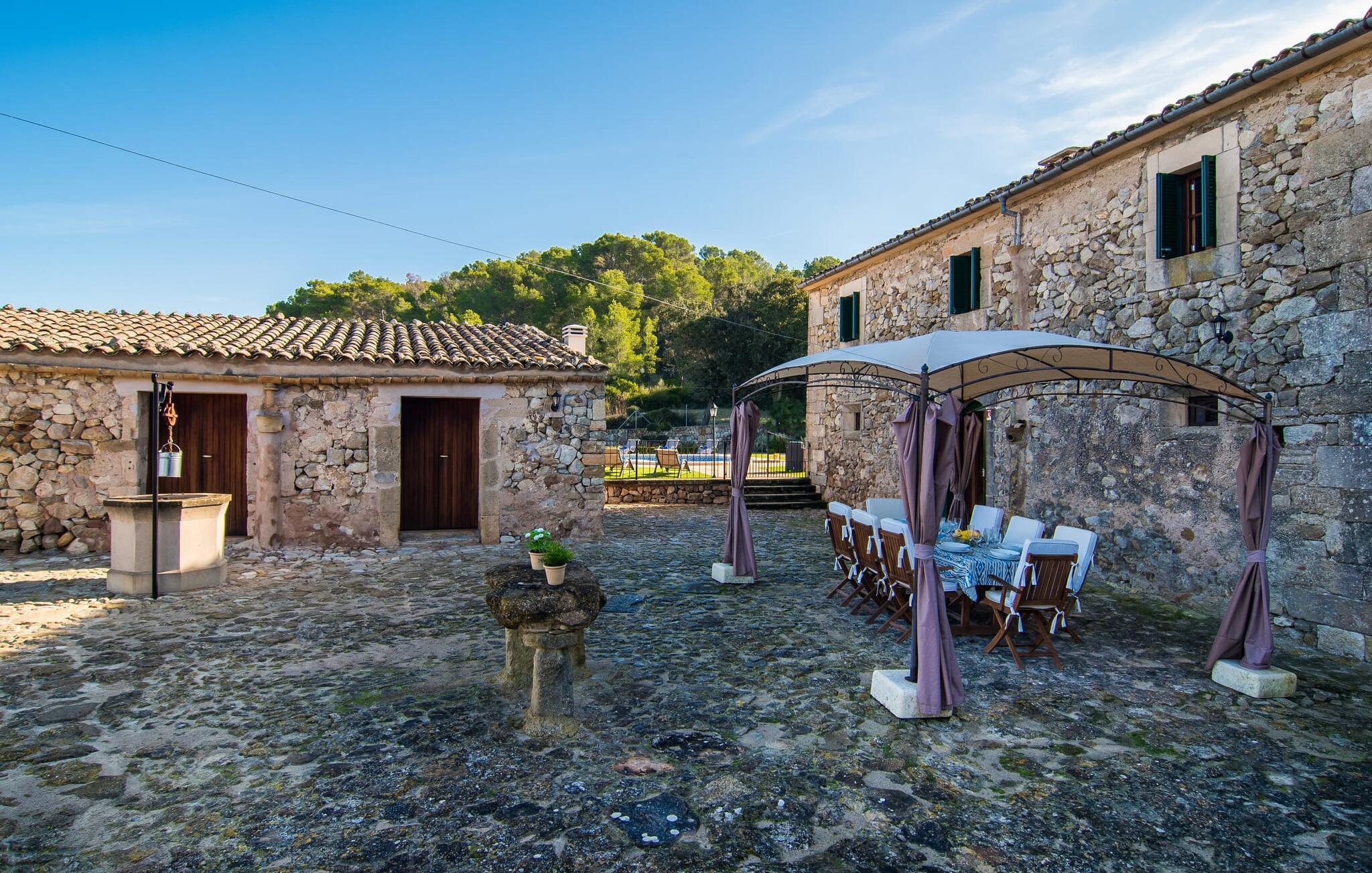 Hvis I leder efter noget særligt, er villaen "Ses Cases de Son Roig" kommet til det rigtige sted: historien om denne landejendom går imponerende 200 år tilbage. De rustikke gamle vægge har tilbudt et hjem og beskyttelse så længe - og siden renoveringen har de også levet op til de højeste standarder. Lad os starte vores tur i den elegante have: Omgivet af et frodigt grønt landskab og skove, vil I nyde panoramaudsigten i fugleperspektiv over det mallorcanske bagland og det slående omrids af Tramuntana-bjergene bagved. Når I har fået jeres badeshorts på, er I klar til den glitrende blå pool. jeres ferie skal jo også forynge jeres hud. En stor del af dette er indtaget af D-vitamin – heldigvis er solen aldrig en mangelvare. Spørgsmålet er kun, hvilken lille plads på ejendommen I har lyst til at nyde solskinnet. Blandt kandidaterne kan nævnes den panoramiske loungeterrasse lige ved siden af ??poolen, tagterrassen, der bringer jer lidt tættere på himlen på jorden, og et hjørne af den parklignende og yderst velplejede have - eller måske den lyse terrasse inde i huset med dens komfortable rattanmøbler? Er varmen for meget for jer, er der også en pergola til rådighed. Når solen endelig går ned, er det tid til den indbyggede grill, jeres trofaste følgesvend, når I tilbereder lækre delikatesser. Når I træder ind i huset, bliver I mødt af den rustikke hygge i de komfortabelt indrettede lokaler, som får en sund dosis lys i løbet af dagen. Om aftenen kan køkkenet blive et socialt mødested, især hvis I beslutter jer for at tænde den åbne pejs. To af dobbeltværelserne er i stueetagen samt et rummeligt badeværelse, mens de to øvrige soveværelser ligger på første sal, hvor der også er stuen med en kæmpe sofa, fladskærms-tv og autentisk naturstensvæg. Et af soveværelserne har en stor dobbeltseng, det andet har to store dobbeltsenge og en anden stor seng adskilt af en foldeskærm. Møbelstilen understreger værdifulde, antikke smykker, der tilføjer elegance til atmosfæren. Her er endnu et badeværelse, der ligesom sit modstykke i stueetagen også har et badekar til en eftertænksom afslutning på dagen. Det lille feriested Sant Joan ligger kun 3 km væk. Der vil I finde alt, hvad I har brug for til jeres daglige behov, forundre jer over den enorme kirke Sant Joan Baptista med dens alabastprædikestol eller finde ud af, hvordan baronerne på øen levede i feudal tid. Om torsdagen er der et ugentligt marked med friske varer i byen. Vinkendere ønsker måske at afslutte deres shoppingtur på La Reserva Rotana Resort, 22 km væk, hvor de kan deltage i en smagning på stedets bodega. I kan også spille golf her. Den populære sandstrand Can Picafort er kun en halv time væk med jeres lejebil. Byerne Sineu, Sencelles og Costitx er også et besøg værd. De ligger alle ud for kysten, en del af Mallorca kendt for lækker mad, gamle vindmøller og fantastiske landskaber. Den historiske villa "Ses Cases de Son Roig" byder på en vidunderlig blanding af idyllisk landskab og god infrastruktur 3 km nord for den rolige landsby Sant Joan. I kan selv gøre jeres daglige indkøb i byen. Hvis I føler jer tiltrukket af havet, er Can Picafort, 30 minutter væk, en glimrende mulighed. Men østkystens mangfoldighed er også kun en kort køretur væk.