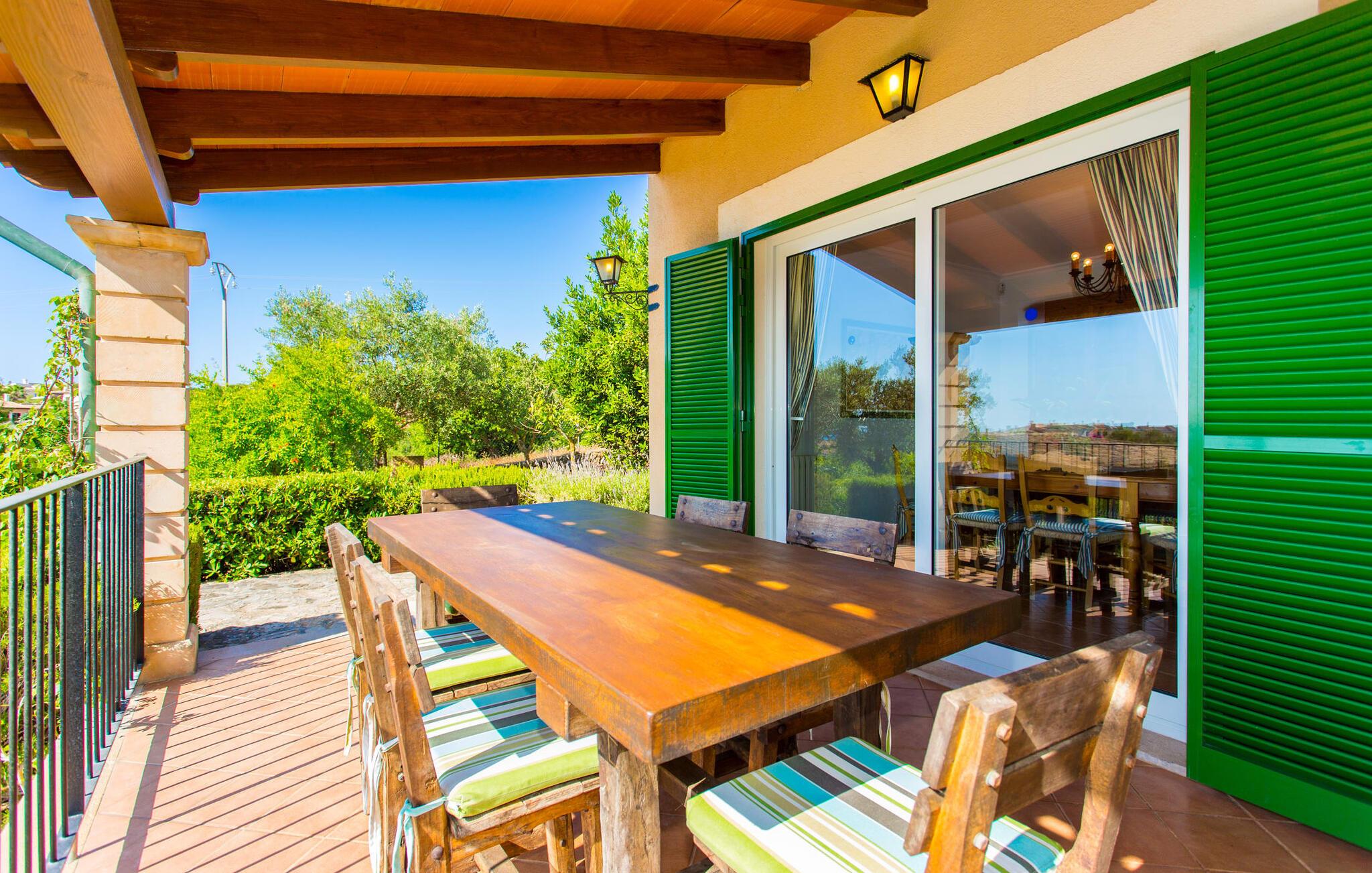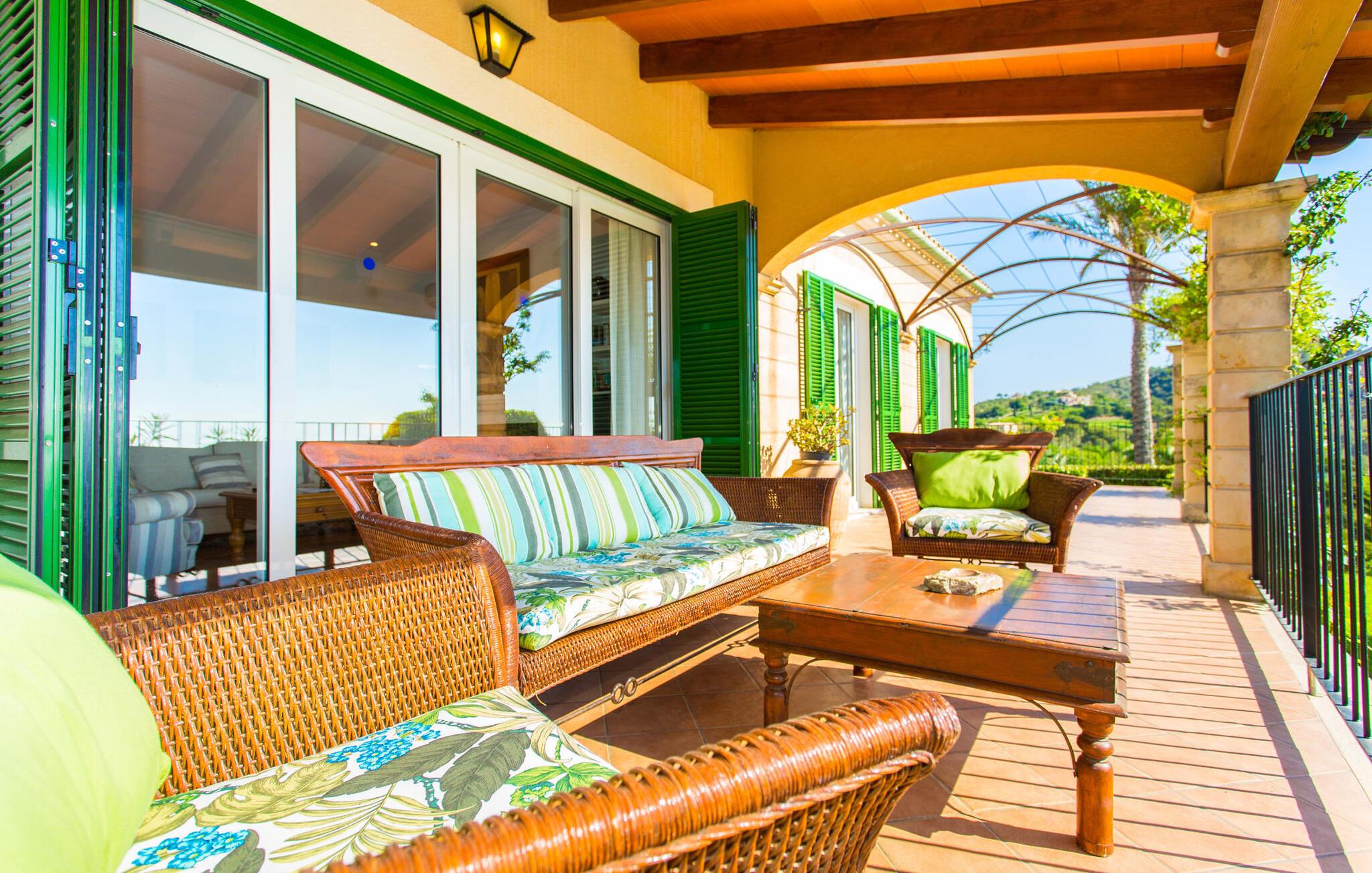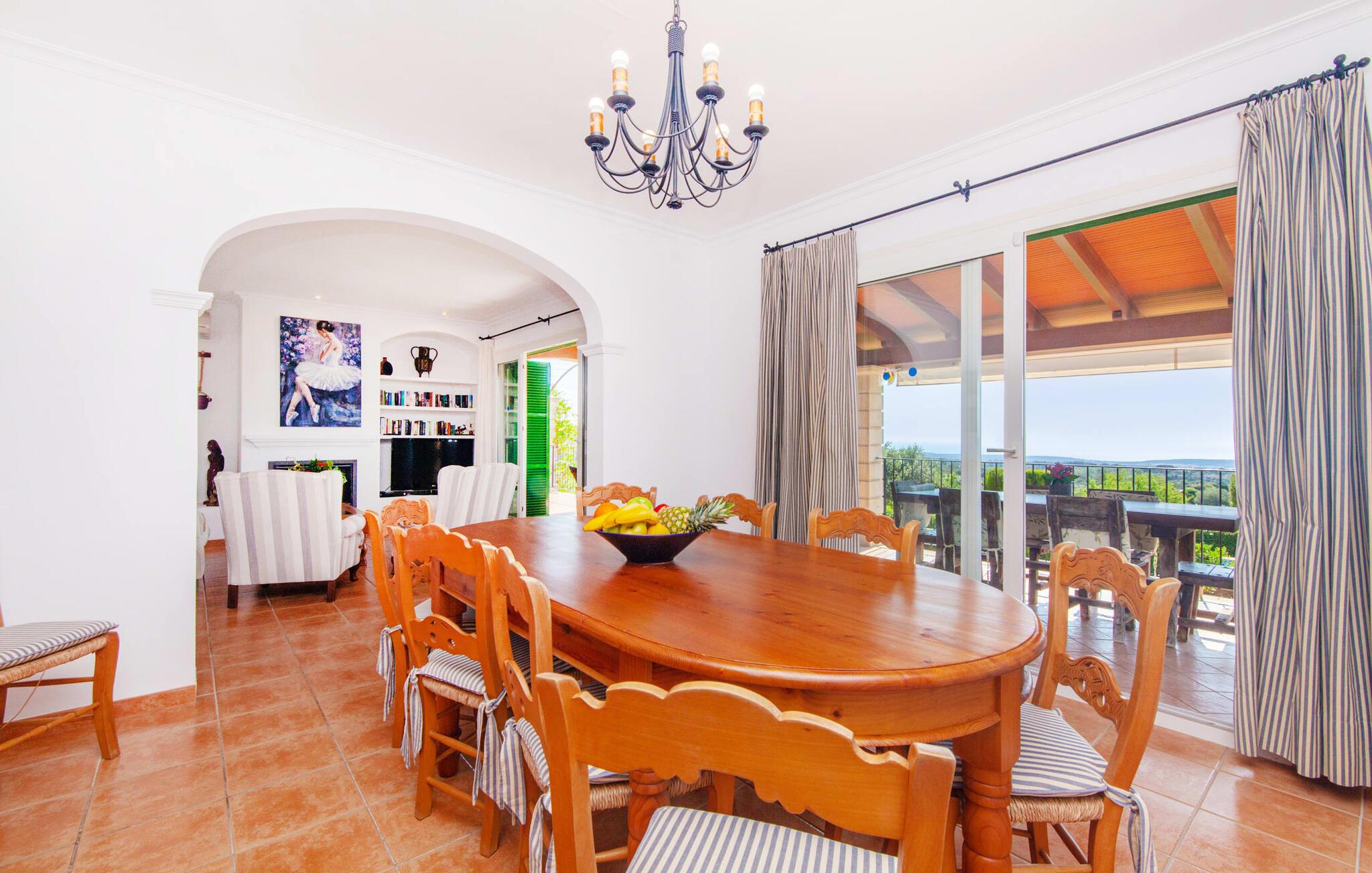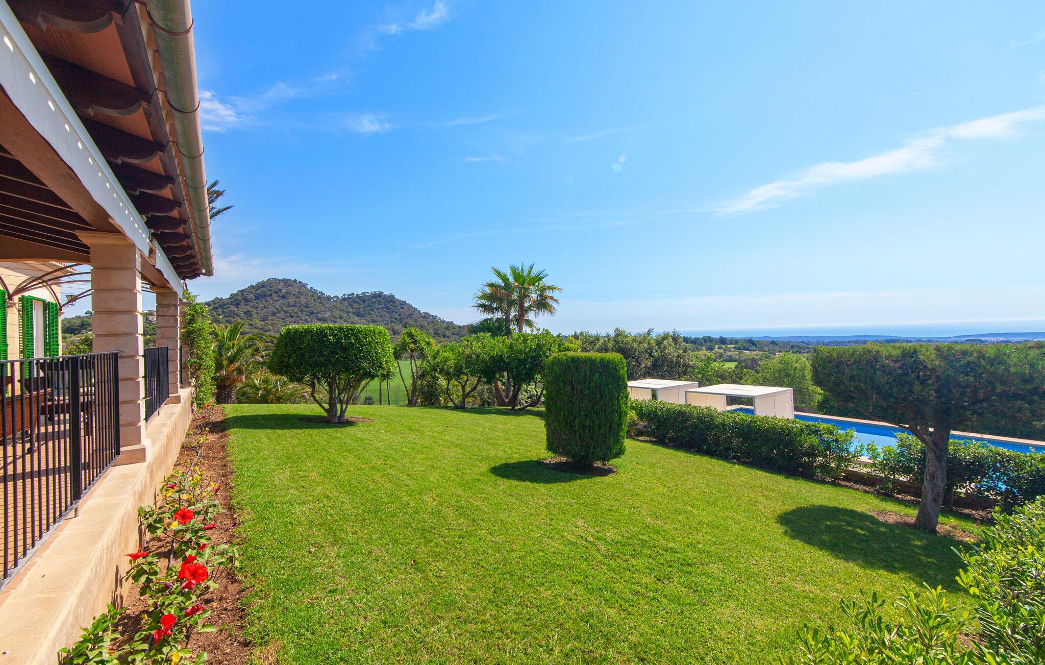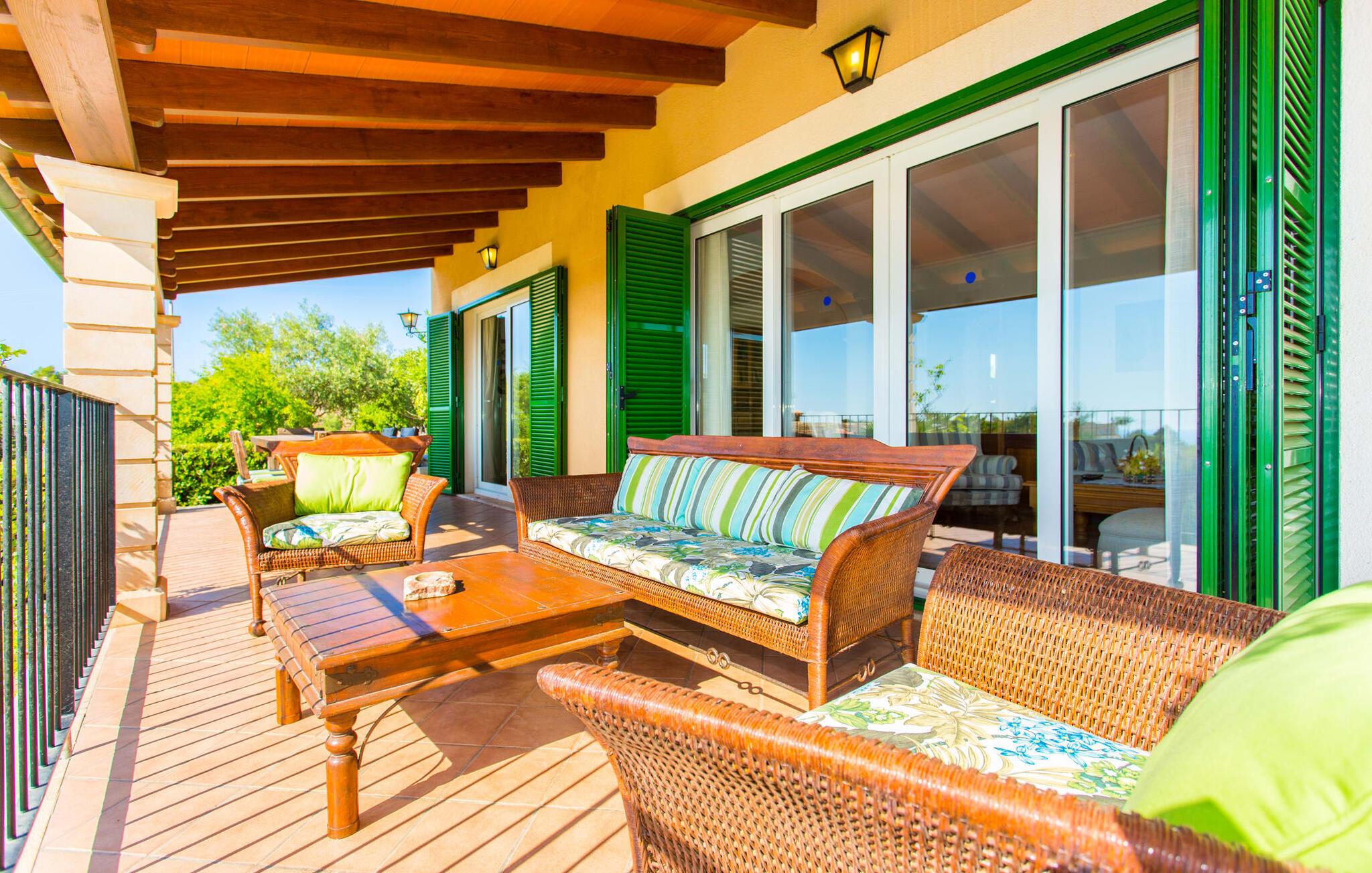 Takket være sin højde over det omkringliggende landskab tilbyder Villa "Ses Mamellas" en vidunderlig panoramaudsigt over havet, som I kan nyde fra den brede veranda foran huset med en kølig drink i hånden. Med komfortable udendørsmøbler og masser af skygge er det et fantastisk sted at sidde og slappe af eller dele måltider sammen. Nær poolen er der endnu en overdækket terrasse med udendørs køkken, grill og spiseplads, perfekt til livlige aftener omkring grillen. Dette overdækkede område har også et bordtennisbord, hvis I har lyst til at dyrke sport uden for poolen. Herfra og fra de komfortable liggestole ved poolen har I en betagende udsigt hele vejen til havet. Den rummelige og ugenerte ejendom omfatter en kærligt vedligeholdt have med palmer og blomster af enhver art, som vil glæde naturelskere. I kan parkere biler på indkørslen, som giver masser af skygge på solrige dage. Den to-etagers villa er indrettet i en smagfuld, klassisk stil. Fra foyeren kommer man ind i stuen, som er meget hyggelig og oversvømmet med lys. Det er et godt sted at afslutte dagen foran det store fladskærms-tv eller slappe af med en af bøgerne fra bogreolen. Og hvis I ikke har lyst til at være fuldstændig isoleret fra omverdenen, kan I gå online via DSL internetforbindelsen. Stuen er dekoreret med kunst, der skaber en varm og indbydende atmosfære. Både stuen og den tilhørende spiseplads har store panoramavinduer, hvilket giver en fantastisk udsigt over det spektakulære landskab udenfor. Det rummelige køkken er fuldt udstyret med komfur, opvaskemaskine, kaffemaskine, køleskab, elkedel og mikroovn. I stueetagen er der også to af de tre indbydende og komfortabelt indrettede dobbeltværelser og to badeværelser, hvoraf det ene er en-suite. Hver seng, med elegant udskårne trærammer, giver et smukt rum til en eftermiddagssiesta eller en afslappende nats søvn. Villaen "Ses Mamellas" ligger lige ved siden af Vall d'Or golfbanen og er derfor et perfekt sted for golfspillere. Men hvis I kan lide at bruge jeres ferie på at udforske, er I kommet til det rigtige sted: i de små byer Cala Murada og Cala Marçal samt de smukke strande i Cala Marçal, Platja de s'Arenal og Cala Brafi, er alt let tilgængelig i bil. Et sted I bestemt ikke bør gå glip af er Santuari de San Salvador, kun 15 km væk. Med sine 509 m ligger dette middelalderkloster på det højeste punkt af Serra de Llevant og er stadig et valfartssted i dag. Blandt de mere interessante seværdigheder er det betagende smukke kapel og dets alabastalter. Og det er kun 20 minutters kørsel til Parc Natural de Mondragó. Denne charmerende villa i den sydøstlige del af øen byder på en vidunderlig panoramaudsigt. Den afsondrede bakketop ejendom er meget indbydende med sin velplejede have fuld af palmer, blomster og frodige grønne områder. Villaen ligger meget tæt på Vall d'Or golfbanen og de tre smukke strande Cala Marçal, Platja de s'Arenal og Cala Brafi. Det er kun omkring fem minutter i bil til den rolige by Portocolom.