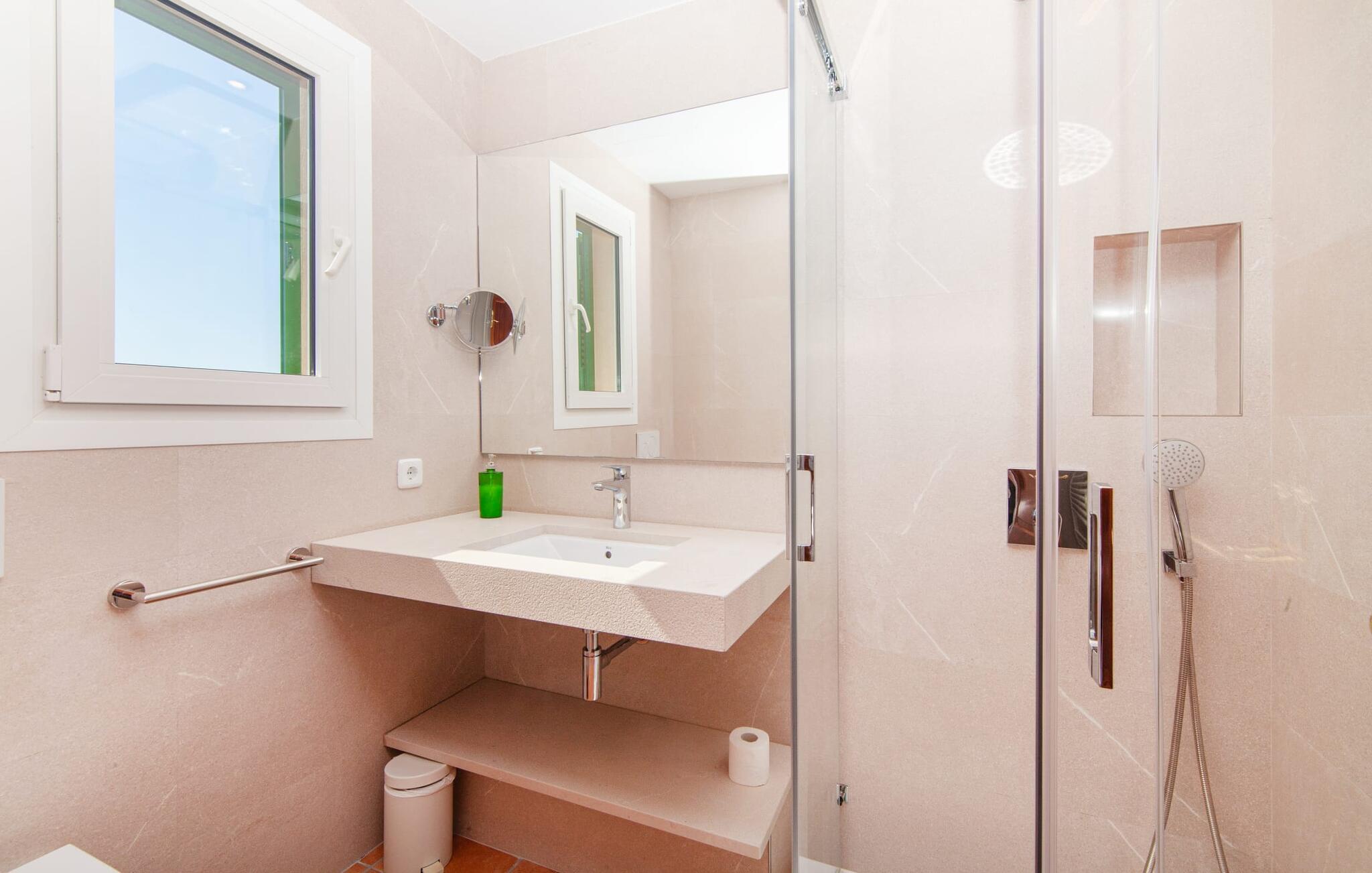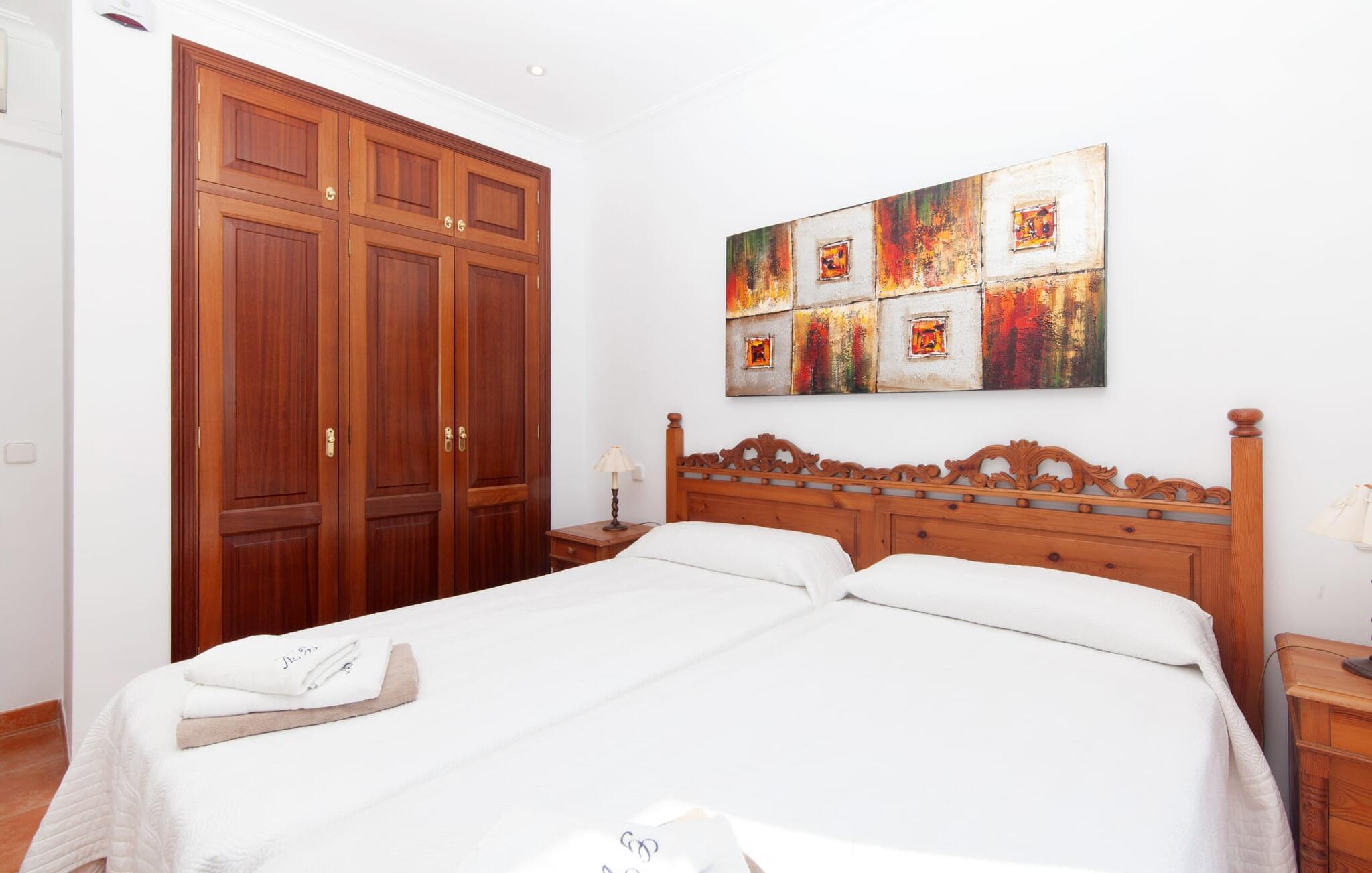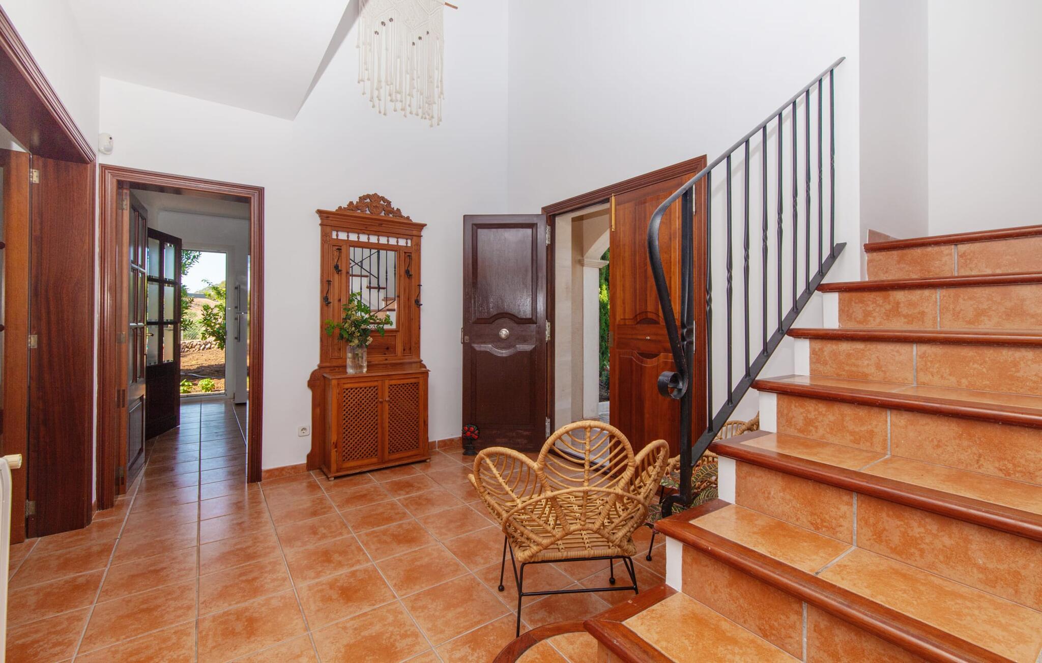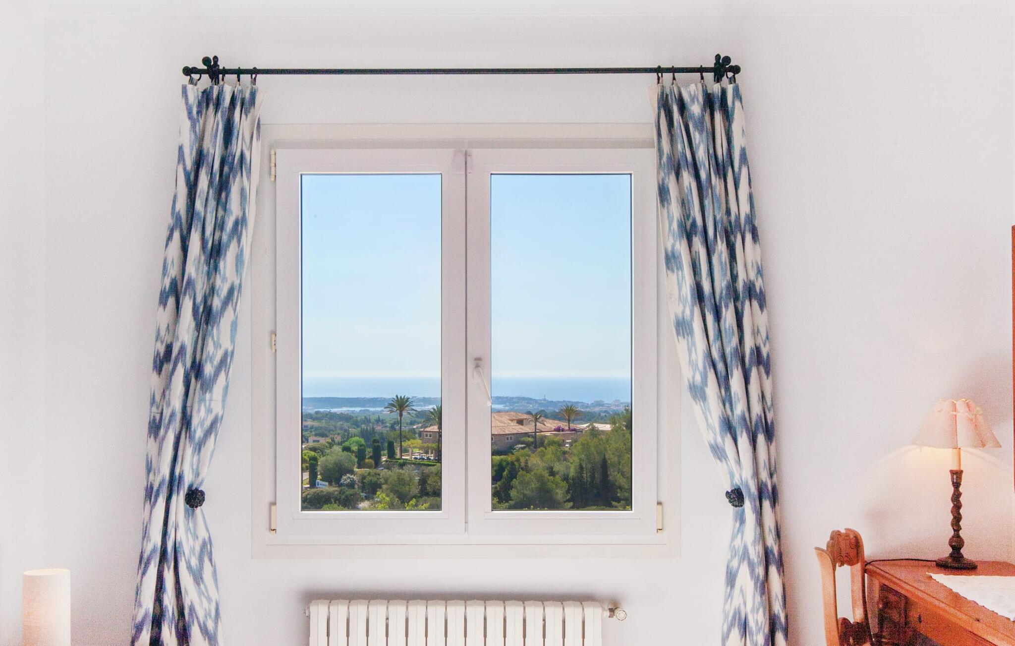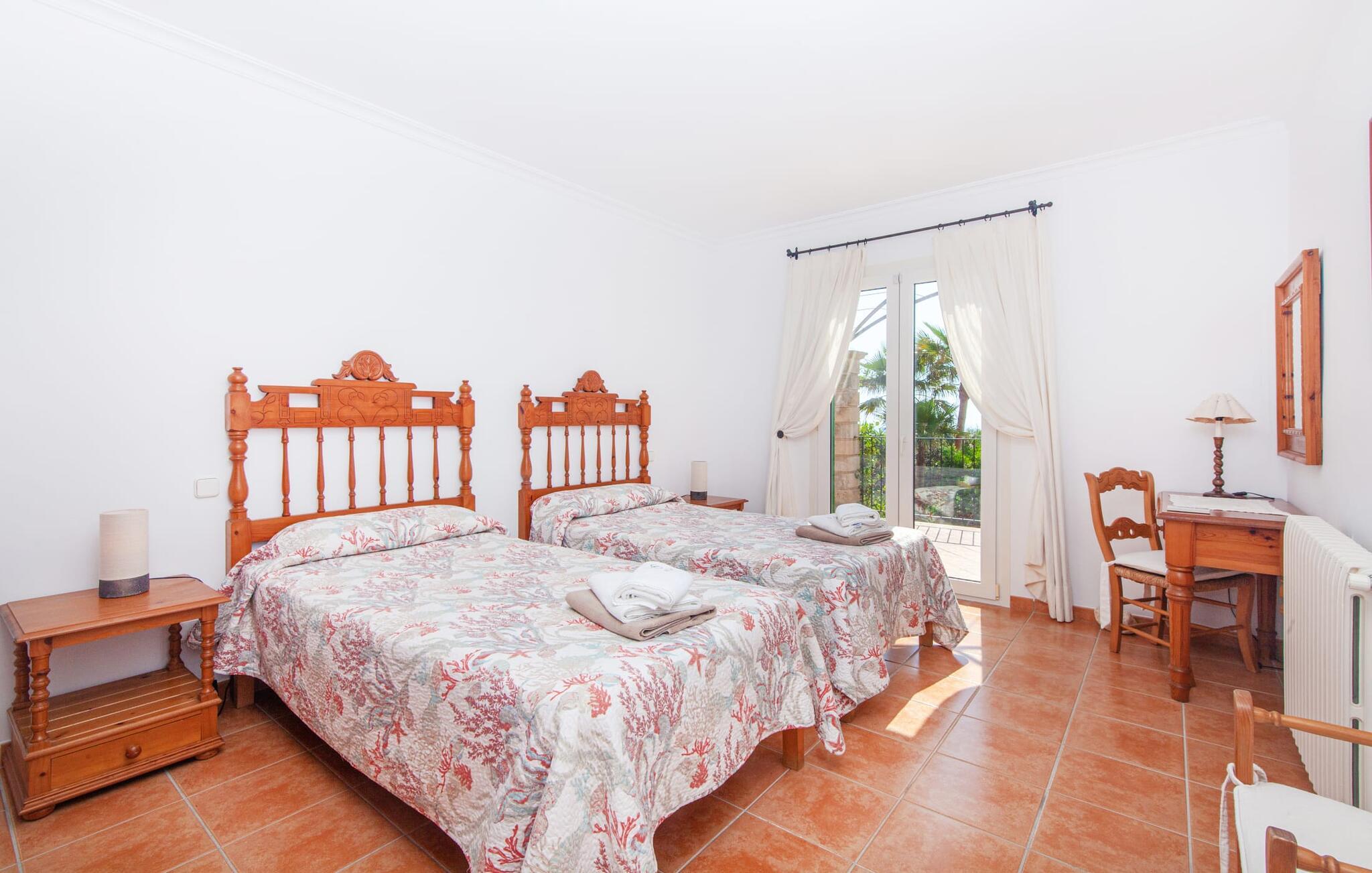 Takket være sin højde over det omkringliggende landskab tilbyder Villa "Ses Mamellas" en vidunderlig panoramaudsigt over havet, som I kan nyde fra den brede veranda foran huset med en kølig drink i hånden. Med komfortable udendørsmøbler og masser af skygge er det et fantastisk sted at sidde og slappe af eller dele måltider sammen. Nær poolen er der endnu en overdækket terrasse med udendørs køkken, grill og spiseplads, perfekt til livlige aftener omkring grillen. Dette overdækkede område har også et bordtennisbord, hvis I har lyst til at dyrke sport uden for poolen. Herfra og fra de komfortable liggestole ved poolen har I en betagende udsigt hele vejen til havet. Den rummelige og ugenerte ejendom omfatter en kærligt vedligeholdt have med palmer og blomster af enhver art, som vil glæde naturelskere. I kan parkere biler på indkørslen, som giver masser af skygge på solrige dage. Den to-etagers villa er indrettet i en smagfuld, klassisk stil. Fra foyeren kommer man ind i stuen, som er meget hyggelig og oversvømmet med lys. Det er et godt sted at afslutte dagen foran det store fladskærms-tv eller slappe af med en af bøgerne fra bogreolen. Og hvis I ikke har lyst til at være fuldstændig isoleret fra omverdenen, kan I gå online via DSL internetforbindelsen. Stuen er dekoreret med kunst, der skaber en varm og indbydende atmosfære. Både stuen og den tilhørende spiseplads har store panoramavinduer, hvilket giver en fantastisk udsigt over det spektakulære landskab udenfor. Det rummelige køkken er fuldt udstyret med komfur, opvaskemaskine, kaffemaskine, køleskab, elkedel og mikroovn. I stueetagen er der også to af de tre indbydende og komfortabelt indrettede dobbeltværelser og to badeværelser, hvoraf det ene er en-suite. Hver seng, med elegant udskårne trærammer, giver et smukt rum til en eftermiddagssiesta eller en afslappende nats søvn. Villaen "Ses Mamellas" ligger lige ved siden af Vall d'Or golfbanen og er derfor et perfekt sted for golfspillere. Men hvis I kan lide at bruge jeres ferie på at udforske, er I kommet til det rigtige sted: i de små byer Cala Murada og Cala Marçal samt de smukke strande i Cala Marçal, Platja de s'Arenal og Cala Brafi, er alt let tilgængelig i bil. Et sted I bestemt ikke bør gå glip af er Santuari de San Salvador, kun 15 km væk. Med sine 509 m ligger dette middelalderkloster på det højeste punkt af Serra de Llevant og er stadig et valfartssted i dag. Blandt de mere interessante seværdigheder er det betagende smukke kapel og dets alabastalter. Og det er kun 20 minutters kørsel til Parc Natural de Mondragó. Denne charmerende villa i den sydøstlige del af øen byder på en vidunderlig panoramaudsigt. Den afsondrede bakketop ejendom er meget indbydende med sin velplejede have fuld af palmer, blomster og frodige grønne områder. Villaen ligger meget tæt på Vall d'Or golfbanen og de tre smukke strande Cala Marçal, Platja de s'Arenal og Cala Brafi. Det er kun omkring fem minutter i bil til den rolige by Portocolom.