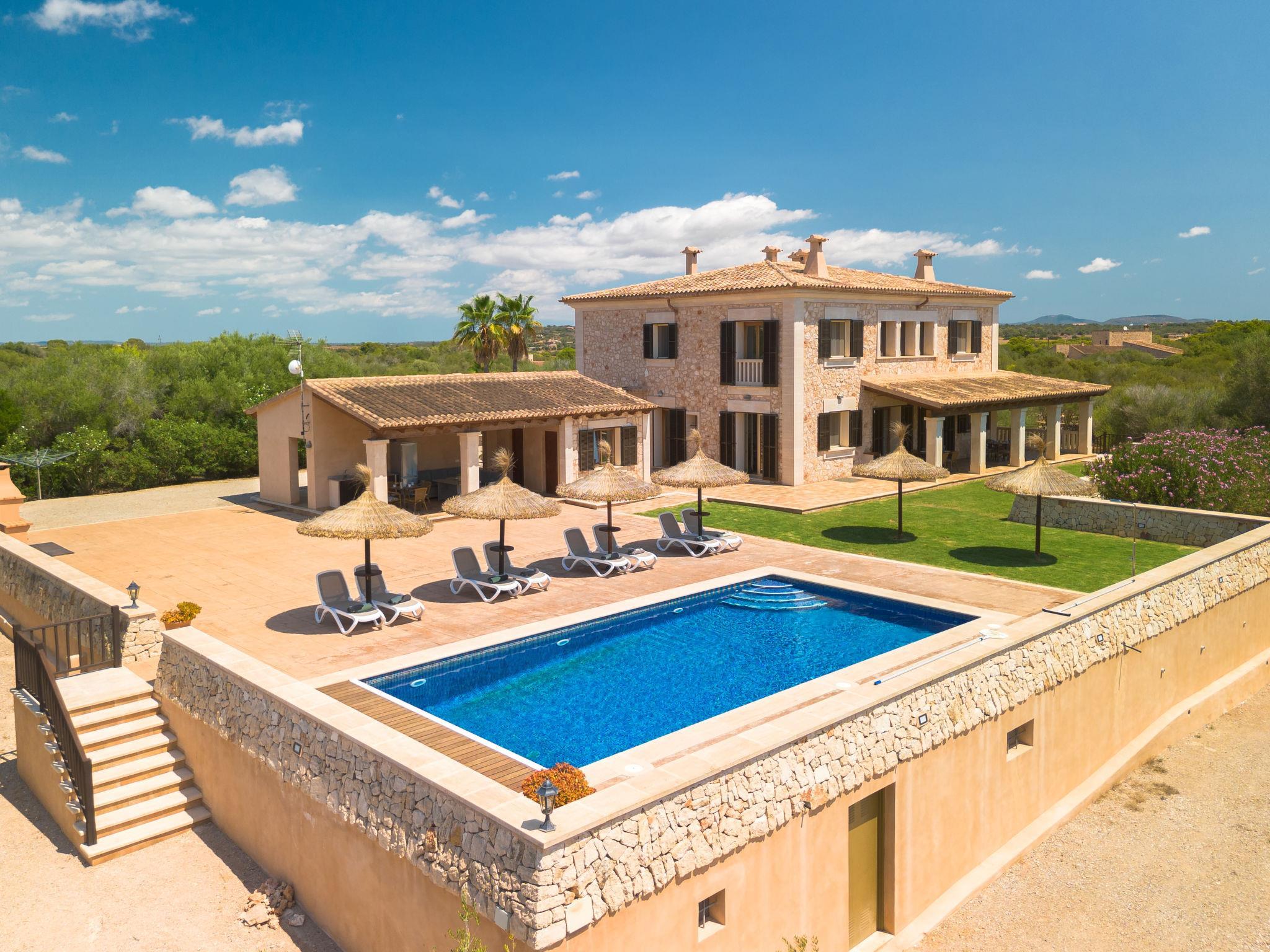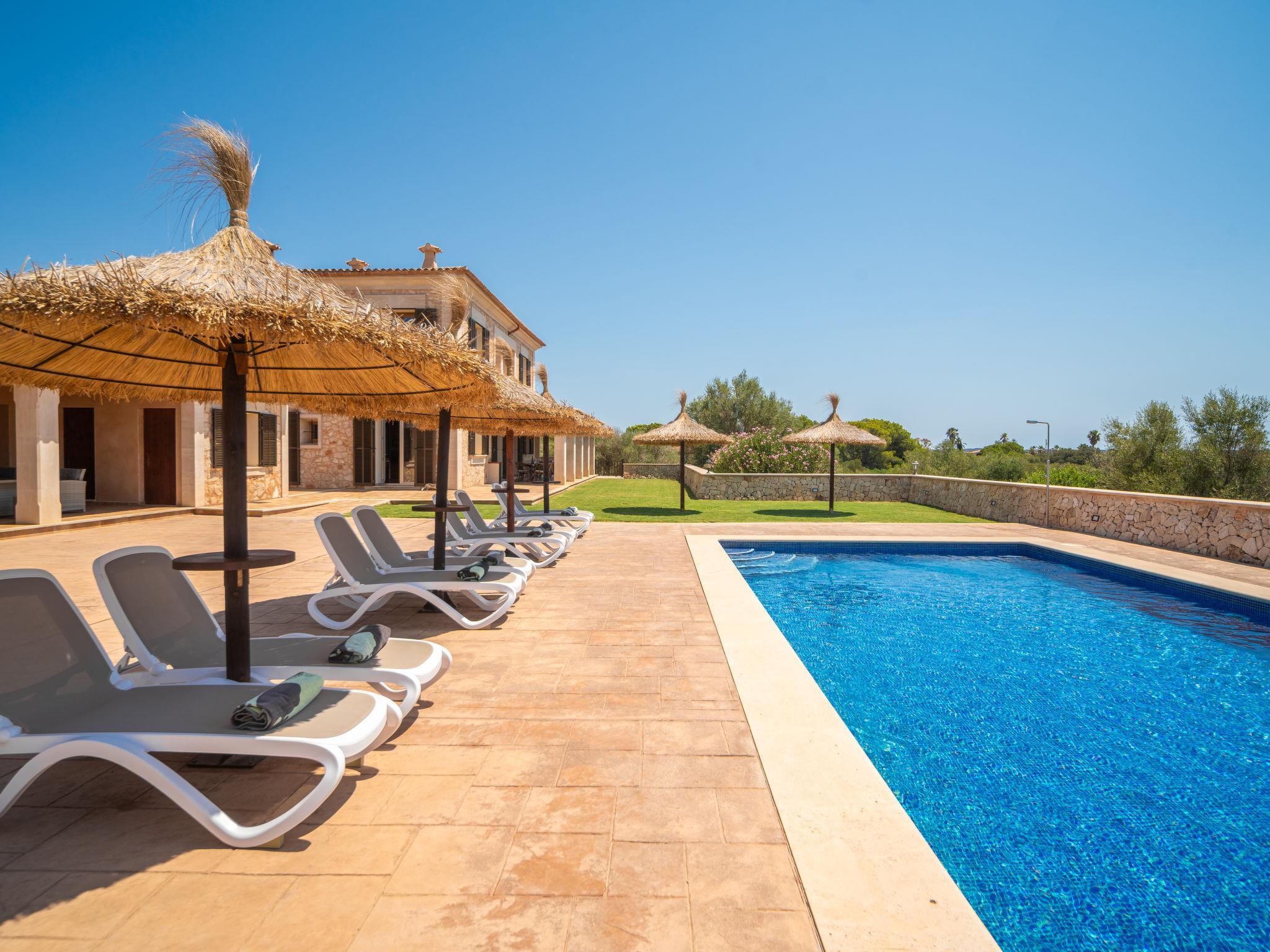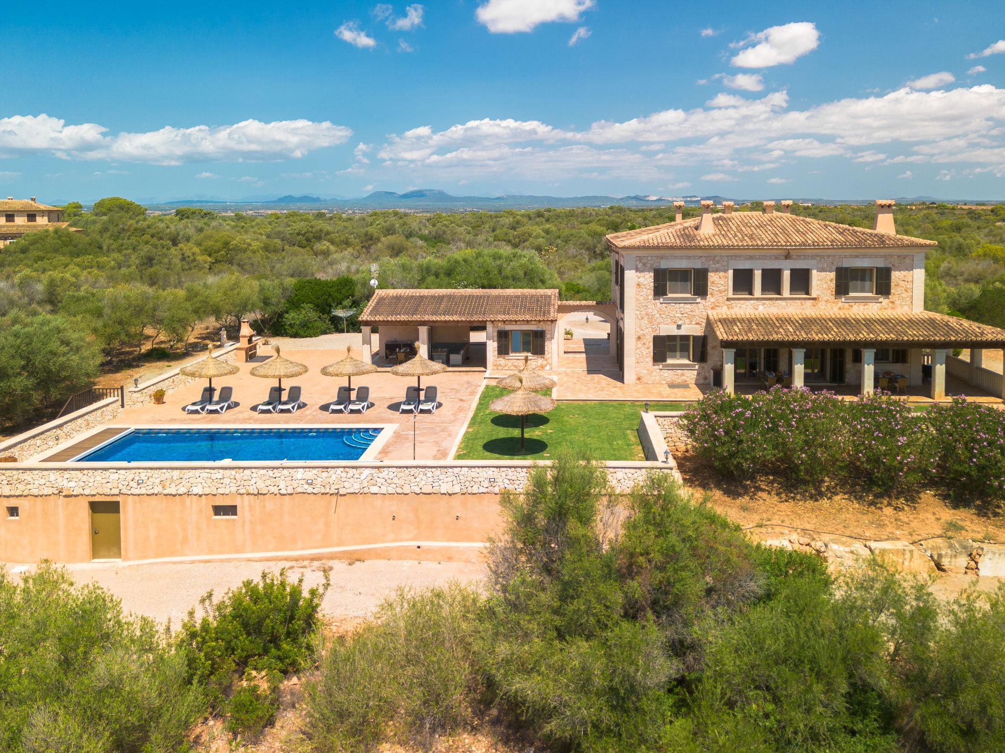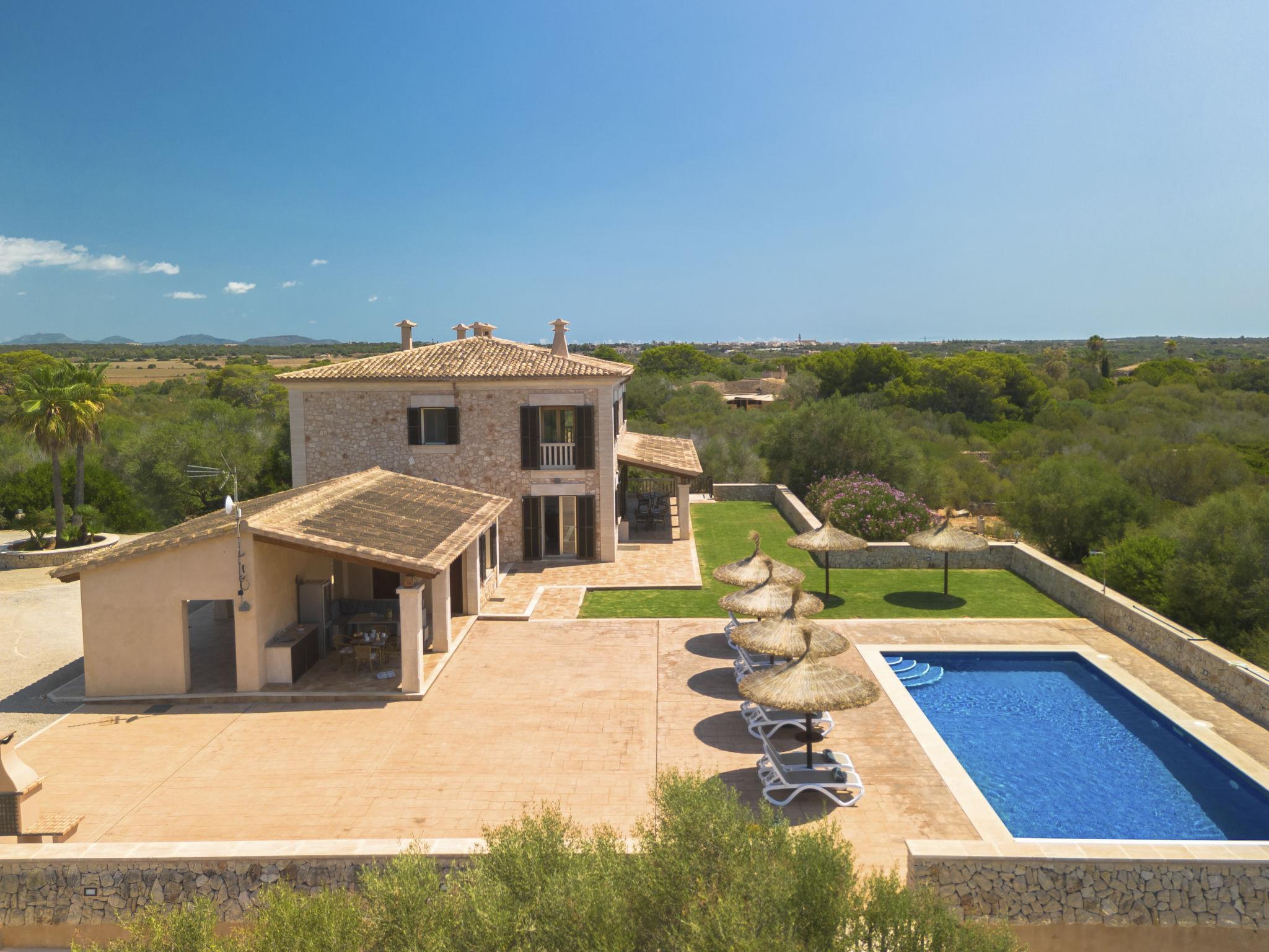 3 km from Ses Salines: Large farm estate "Casa Eva", detached, surrounded by fields. 3 km from the centre of Ses Salines, 4 km from the centre of Colonia Sant Jordi, 13 km from the centre of Campos, 5 km from the sea, south facing position. Private: natural state property 16'000 m2 (fenced) with lawn, swimming pool (10 x 5 m, seasonal availability: 01.Jan. - 31.Dec.) with salt-electrolysis pool-cleaning system. Shower/WC in the pool area, outdoor shower, pool maintenance by the owner/gardener. In the house: central heating system. Roofed, parking (for 3 cars) on the premises. Bus stop "Ses Salines" 3 km, railway station "Manacor" 37 km, sandy beach "Es Trenc" 5 km. Please note: car recommended. The owner does not accept any youth groups.