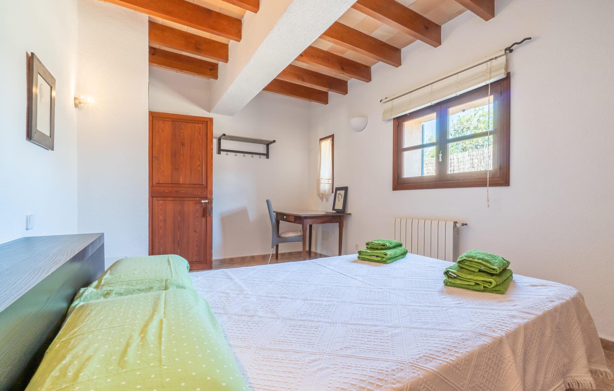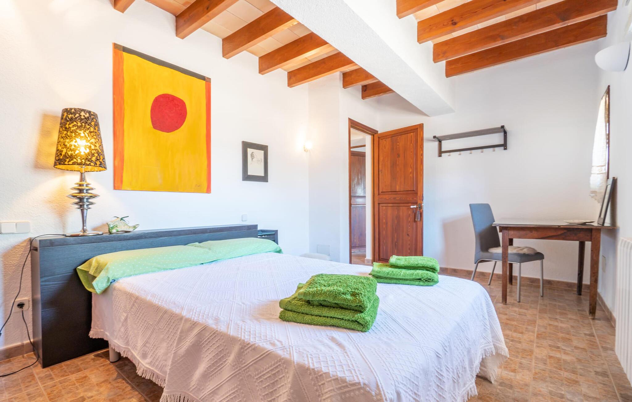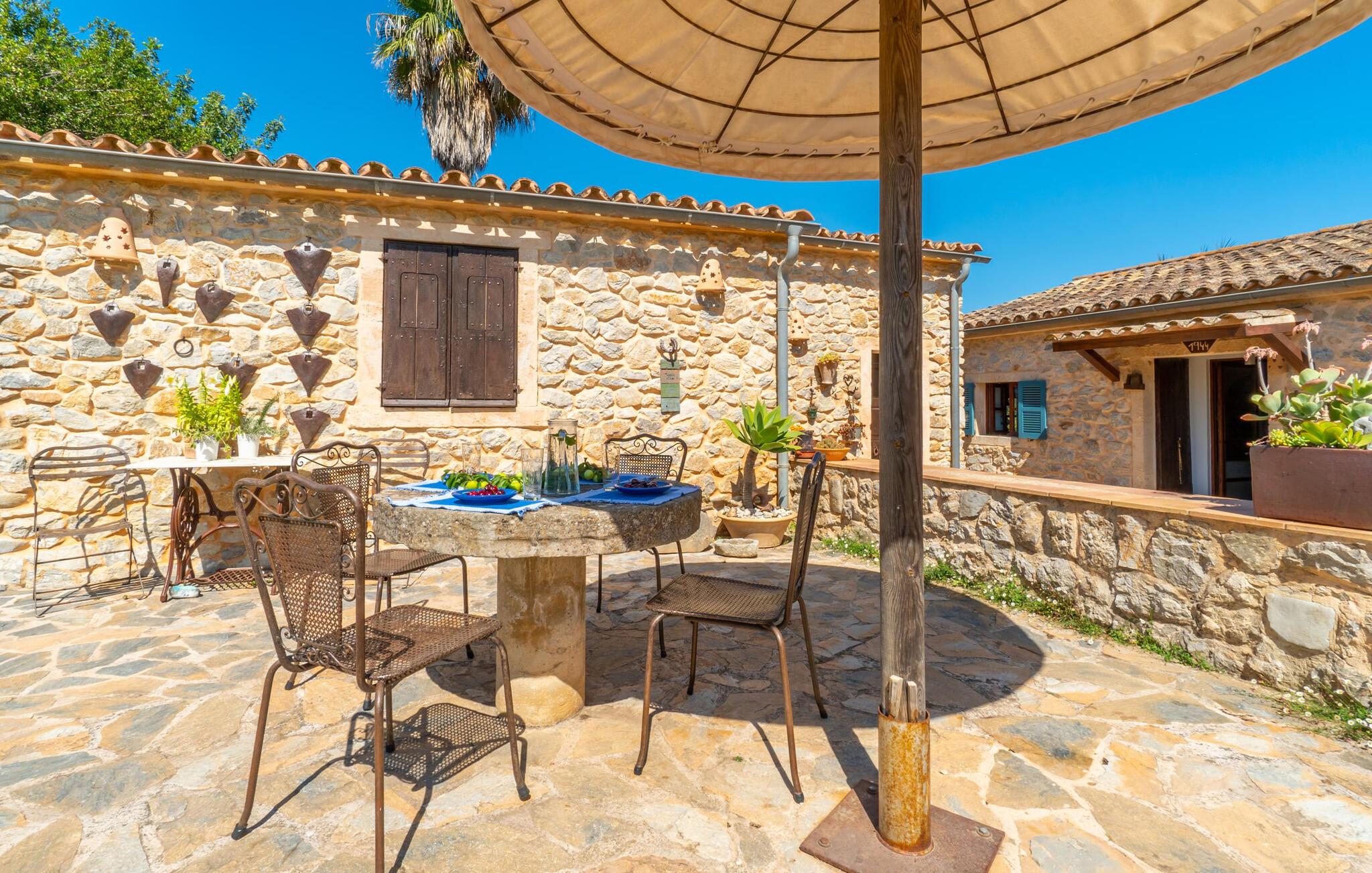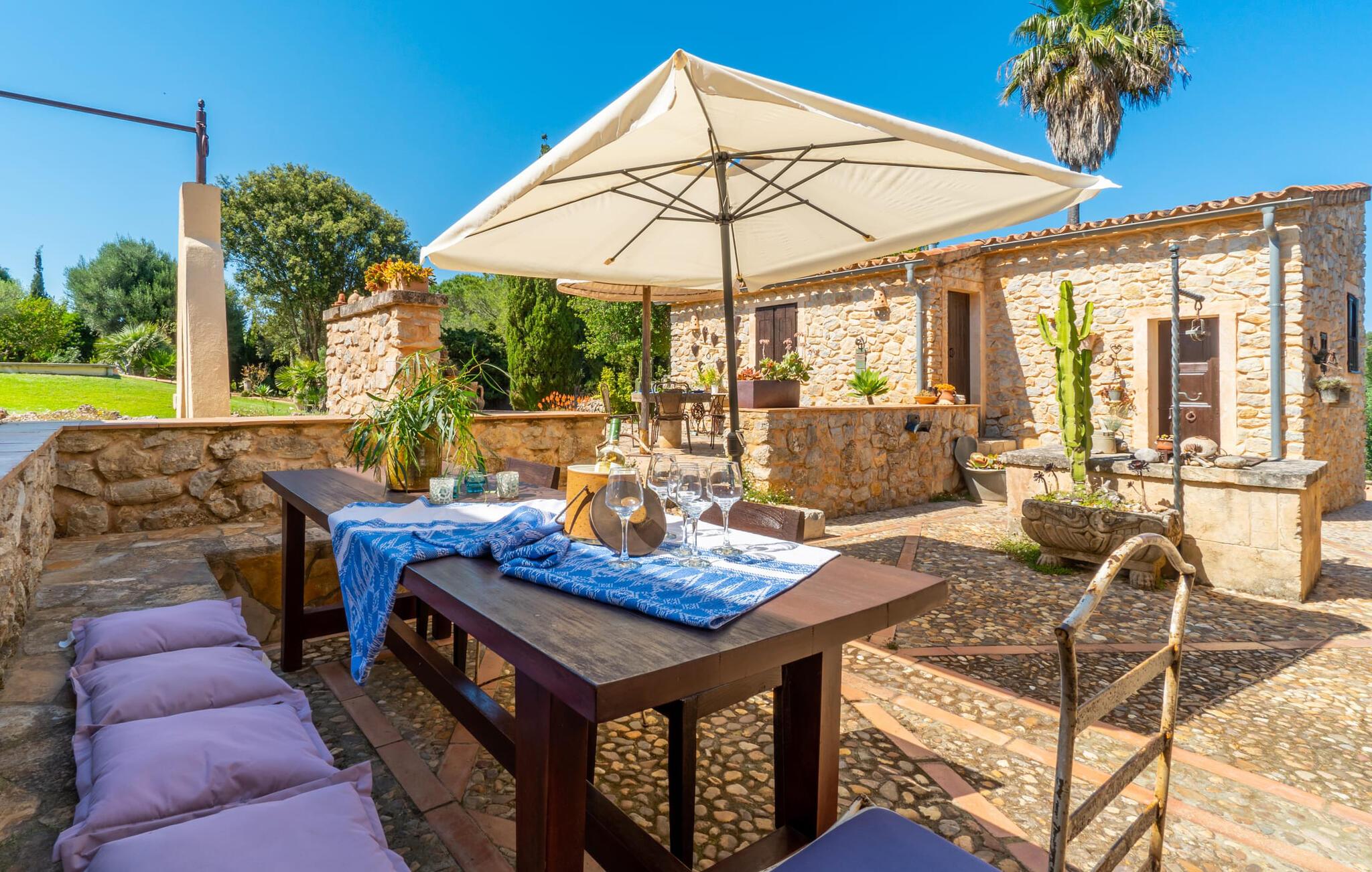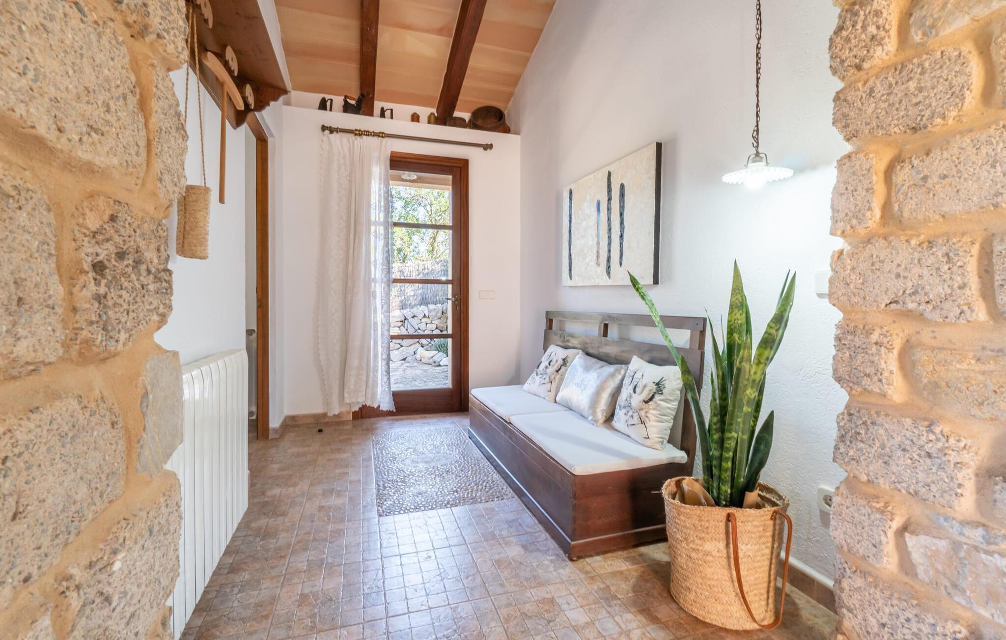 En absolut fortryllende atmosfære byder gæsterne velkommen til villaen "Ses Velletes". Ejendommen ligger i en dejlig idyllisk og rolig beliggenhed, er helt indhegnet og afspærret af en port til indgangen. På den omfattende ejendom, præget af græsplæner og mange middelhavsplanter, finder I smukke, åbne og overdækkede terrasser med en række blomster og designdetaljer, der inviterer jer til at gå på opdagelse og udforske. Kærligt indrettede siddepladser inviterer jer til at slappe af og dvæle udendørs, mens I altid leder efter nye yndlingssteder. Det rustikke spisebord med murstensbænke er velegnet til hyggelige måltider på ethvert tidspunkt af dagen, som I kan nyde komfortabelt og med en vidunderlig udsigt over haven. Hvis I ønsker det, kan I også blot tilberede maden i udekøkkenet og nyde den lige her. I kan tilberede alle mulige friske regionale delikatesser på grillen og måske alle sammen fejre en kulinarisk grillaften. Små nicher, trapper og vægge giver udearealet et særligt malerisk og hjemligt præg. Den søde dam er endda hjemsted for skildpadder. Hjertet i haven er den 7 x 4 m store pool, dekoreret med dekorative lyseblå fliser og udstyret med en komfortabel trappe. Her vil både unge og gamle finde en behagelig forfriskning af hjertens lyst. Der er komfortable liggestole til rådighed til omfattende solbadning, samt flere parasoller, hvis UV-strålerne bliver for stærke. Gør simpelthen ingenting og lad jeres bekymringer ligge - I kan nyde det på en ekstraordinær måde her. I husets stueetage er der køkken med tilhørende spiseplads, soveværelse og to badeværelser. Stuen er på øverste etage. Naturstenselementer, massive fritlagte bjælkelofter samt lette vægge og materialer sikrer en yderst behagelig og samtidig meget æstetisk atmosfære. Det er stemningsfuldt forstærket af varieret rustik udsmykning i form af billeder, gårdmøbler og andre hverdagsting samt andre imponerende individuelle stykker. Det åbne køkken, der kun er løst adskilt fra stuen af en disk, er fuldt udstyret og tilbyder udover moderne apparater også tilstrækkelig opbevarings- og arbejdsplads. En kedel og en italiensk og amerikansk kaffemaskine er kun inkluderet. Ved spisebordet lige ved siden af kan I nyde en indendørs middag sammen i en rustik atmosfære. Stuen har en super behagelig sofazone. Her kan I slappe af som I vil, måske med en god bog eller en underholdende film, da fjernsynet med satellitforbindelse er installeret her. De meget individuelt designede værelser byder jer hjertelig velkommen til en god nats søvn. Vi er sikre på, at alle vil finde deres perfekte sted at sove her. Oprindeligt designede badeværelser byder på naturligt lys og indretning af høj kvalitet. Strygejern og hårtørrer er tilgængelige på stedet, så I ikke behøver at bekymre jer om selv at pakke dem. Der er endnu et dobbeltværelse (uden badeværelse) til rådighed i annekset, så der i alt kan indkvarteres syv personer. Artà er en særdeles smuk by uden store hoteller og med omkring 6.500 indbyggere. Hver tirsdag er der et ugentligt marked i byens centrum, som uden tvivl er et besøg værd. Her finder I et rigt og mangfoldigt udvalg af regionale kulinariske specialiteter samt smukt kunsthåndværk, der er typisk for øen. Strande, der er både smukke og let tilgængelige fra villaen, kan findes i Cala Ratjada, Canyamel, Cala Bona, Costa de los Pinos og Cala Millor Bay. Der er fire golfbaner i området omkring villaen. Den to-etagers naturstensvilla "Ses Velletes" har en rolig beliggenhed, kun 5 minutter i bil nordvest for Artà. Det giver masser af plads til at slappe af og slappe af. Den maleriske gamle bydel i Artà med sine små gader, barer, restauranter og butikker er særligt indbydende. Flere smukke strande kan nås i bil på cirka 20 minutter.