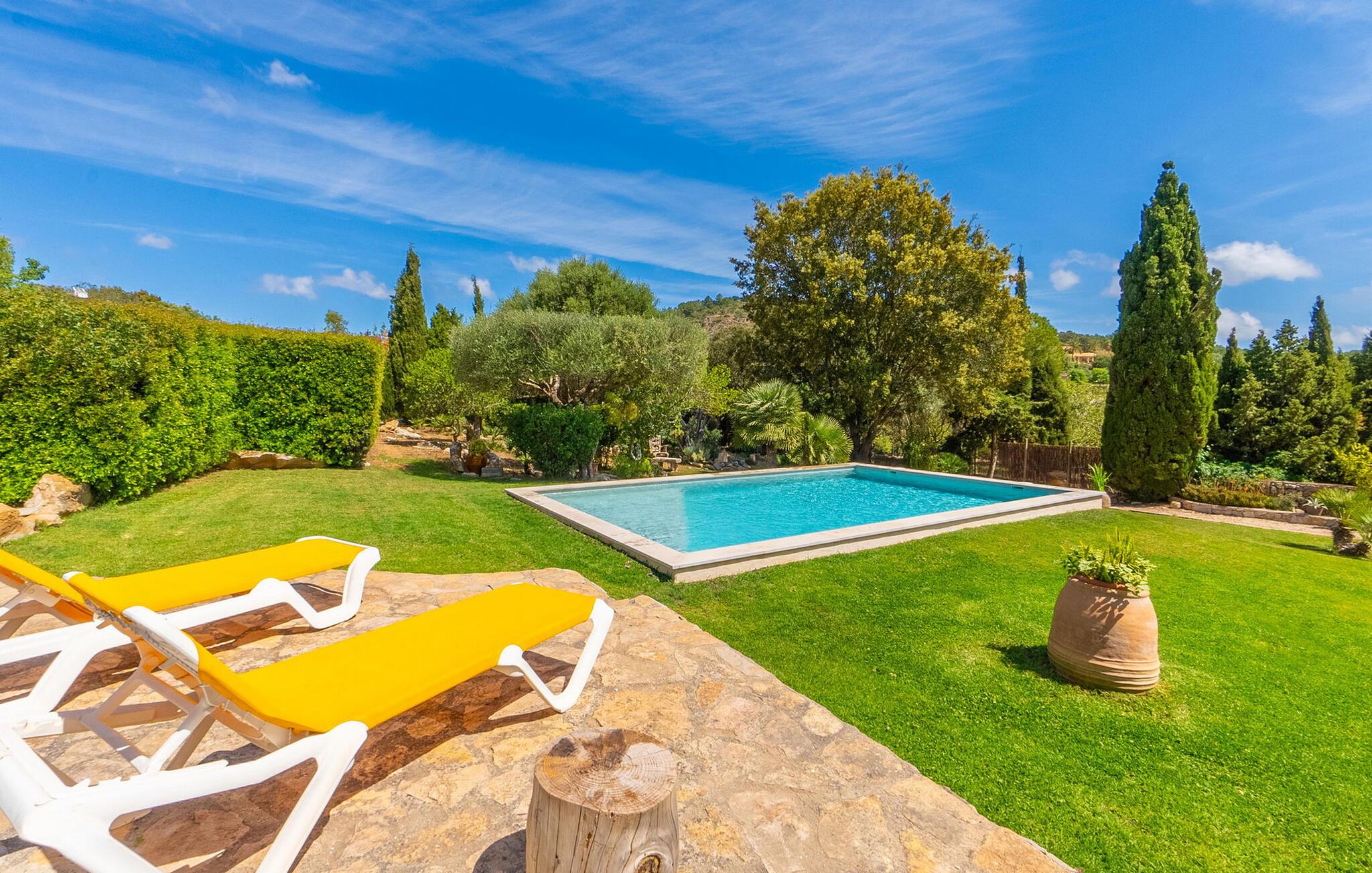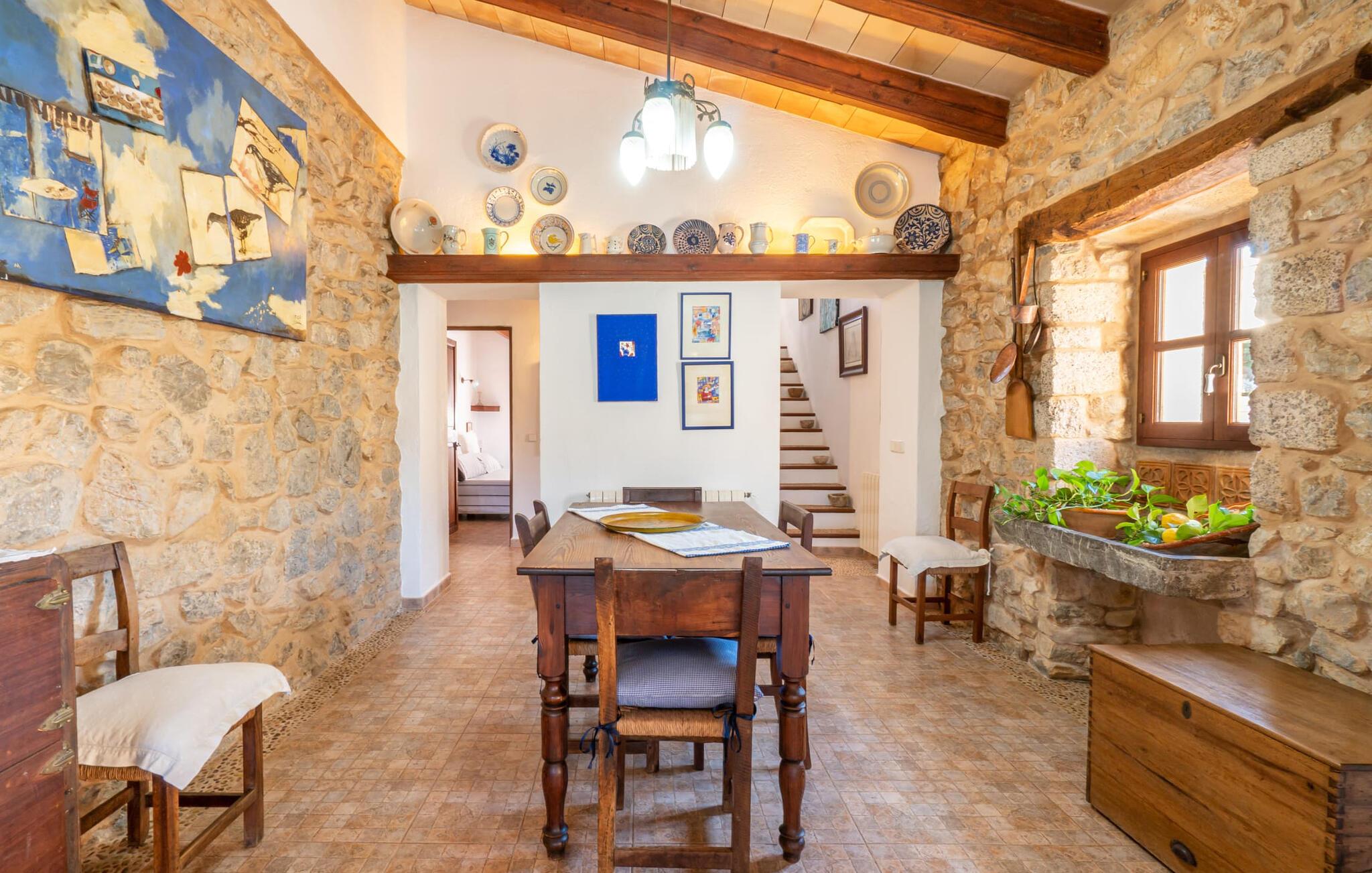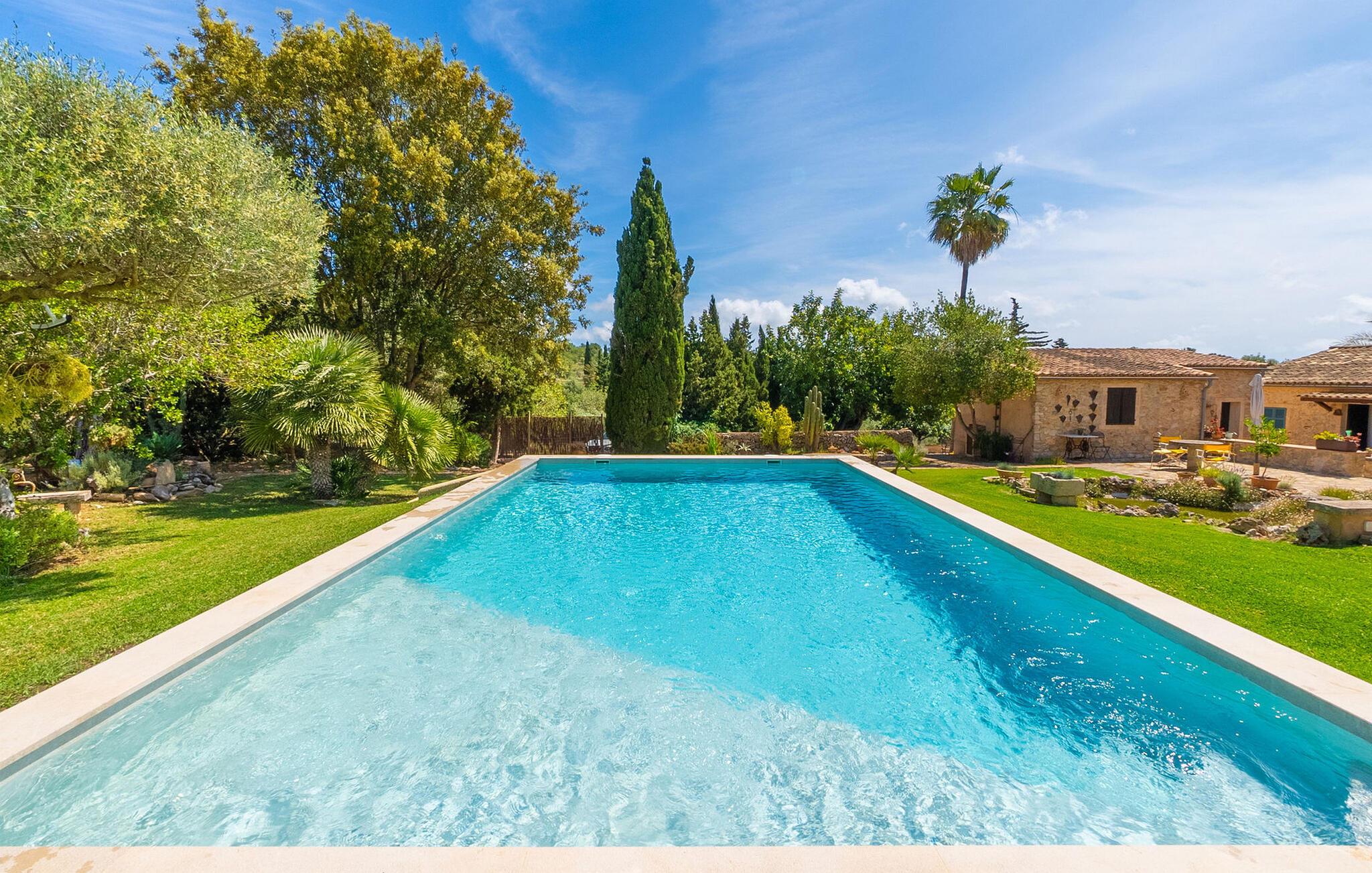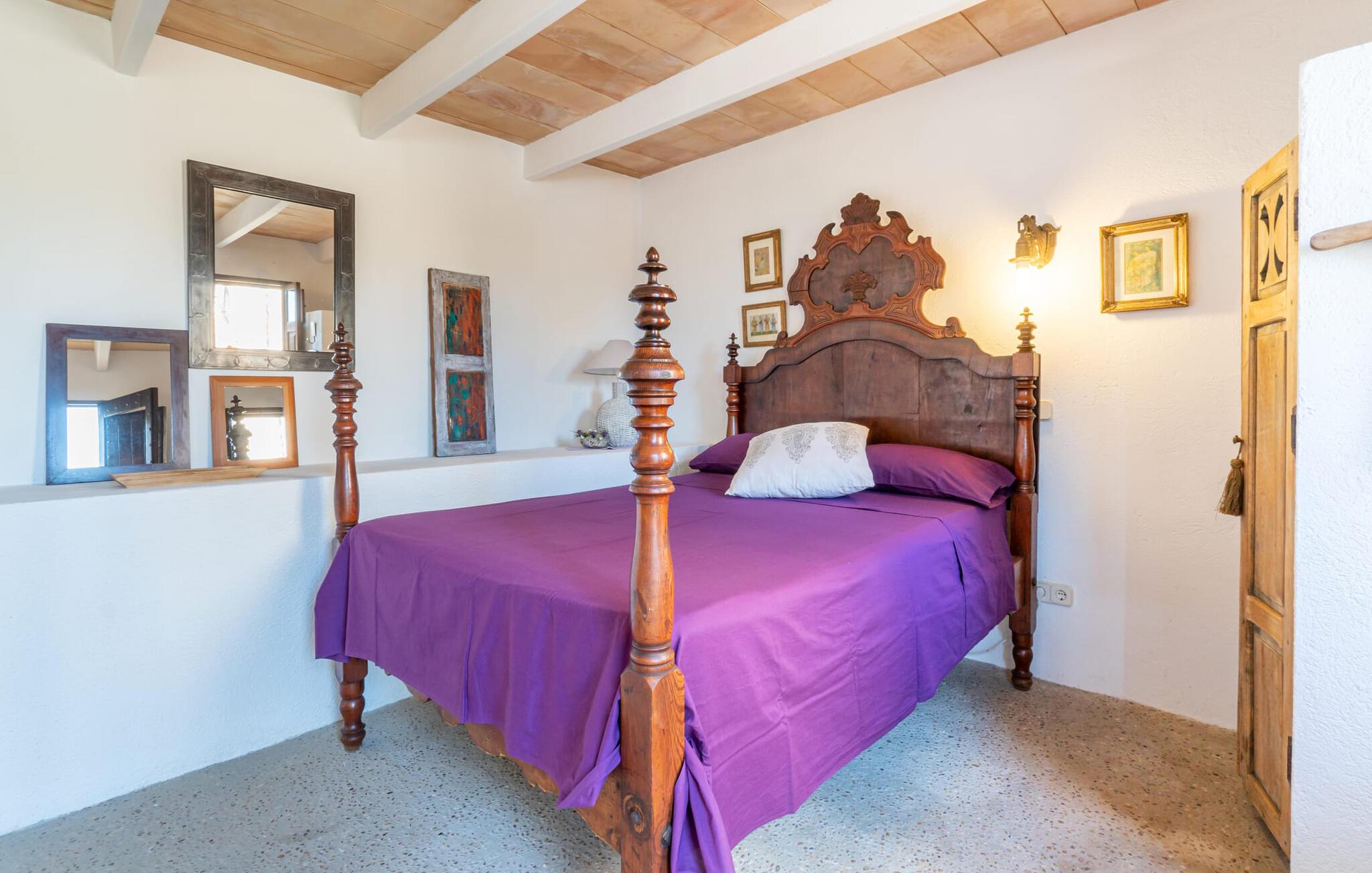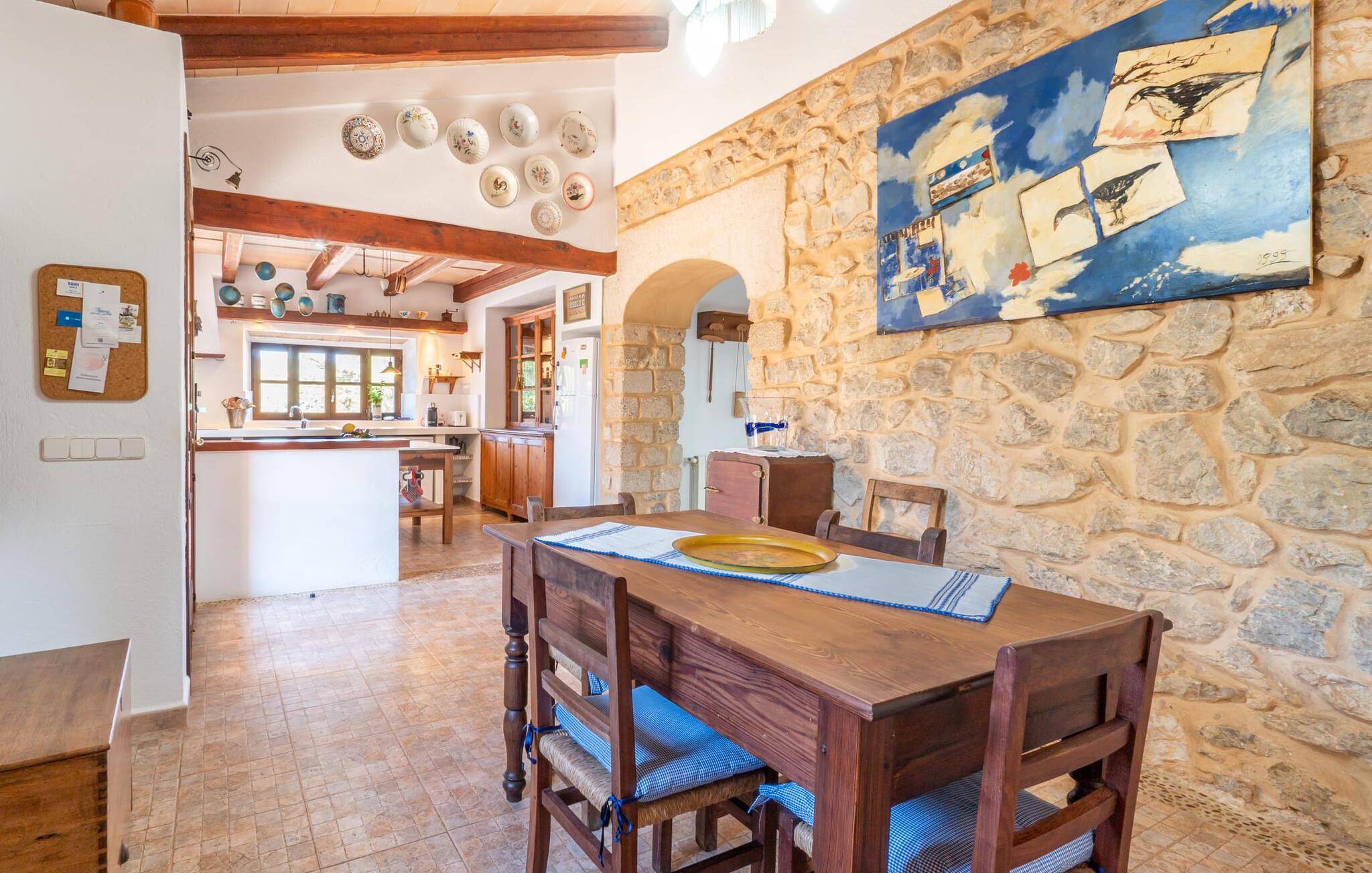 En absolut fortryllende atmosfære byder gæsterne velkommen til villaen "Ses Velletes". Ejendommen ligger i en dejlig idyllisk og rolig beliggenhed, er helt indhegnet og afspærret af en port til indgangen. På den omfattende ejendom, præget af græsplæner og mange middelhavsplanter, finder I smukke, åbne og overdækkede terrasser med en række blomster og designdetaljer, der inviterer jer til at gå på opdagelse og udforske. Kærligt indrettede siddepladser inviterer jer til at slappe af og dvæle udendørs, mens I altid leder efter nye yndlingssteder. Det rustikke spisebord med murstensbænke er velegnet til hyggelige måltider på ethvert tidspunkt af dagen, som I kan nyde komfortabelt og med en vidunderlig udsigt over haven. Hvis I ønsker det, kan I også blot tilberede maden i udekøkkenet og nyde den lige her. I kan tilberede alle mulige friske regionale delikatesser på grillen og måske alle sammen fejre en kulinarisk grillaften. Små nicher, trapper og vægge giver udearealet et særligt malerisk og hjemligt præg. Den søde dam er endda hjemsted for skildpadder. Hjertet i haven er den 7 x 4 m store pool, dekoreret med dekorative lyseblå fliser og udstyret med en komfortabel trappe. Her vil både unge og gamle finde en behagelig forfriskning af hjertens lyst. Der er komfortable liggestole til rådighed til omfattende solbadning, samt flere parasoller, hvis UV-strålerne bliver for stærke. Gør simpelthen ingenting og lad jeres bekymringer ligge - I kan nyde det på en ekstraordinær måde her. I husets stueetage er der køkken med tilhørende spiseplads, soveværelse og to badeværelser. Stuen er på øverste etage. Naturstenselementer, massive fritlagte bjælkelofter samt lette vægge og materialer sikrer en yderst behagelig og samtidig meget æstetisk atmosfære. Det er stemningsfuldt forstærket af varieret rustik udsmykning i form af billeder, gårdmøbler og andre hverdagsting samt andre imponerende individuelle stykker. Det åbne køkken, der kun er løst adskilt fra stuen af en disk, er fuldt udstyret og tilbyder udover moderne apparater også tilstrækkelig opbevarings- og arbejdsplads. En kedel og en italiensk og amerikansk kaffemaskine er kun inkluderet. Ved spisebordet lige ved siden af kan I nyde en indendørs middag sammen i en rustik atmosfære. Stuen har en super behagelig sofazone. Her kan I slappe af som I vil, måske med en god bog eller en underholdende film, da fjernsynet med satellitforbindelse er installeret her. De meget individuelt designede værelser byder jer hjertelig velkommen til en god nats søvn. Vi er sikre på, at alle vil finde deres perfekte sted at sove her. Oprindeligt designede badeværelser byder på naturligt lys og indretning af høj kvalitet. Strygejern og hårtørrer er tilgængelige på stedet, så I ikke behøver at bekymre jer om selv at pakke dem. Der er endnu et dobbeltværelse (uden badeværelse) til rådighed i annekset, så der i alt kan indkvarteres syv personer. Artà er en særdeles smuk by uden store hoteller og med omkring 6.500 indbyggere. Hver tirsdag er der et ugentligt marked i byens centrum, som uden tvivl er et besøg værd. Her finder I et rigt og mangfoldigt udvalg af regionale kulinariske specialiteter samt smukt kunsthåndværk, der er typisk for øen. Strande, der er både smukke og let tilgængelige fra villaen, kan findes i Cala Ratjada, Canyamel, Cala Bona, Costa de los Pinos og Cala Millor Bay. Der er fire golfbaner i området omkring villaen. Den to-etagers naturstensvilla "Ses Velletes" har en rolig beliggenhed, kun 5 minutter i bil nordvest for Artà. Det giver masser af plads til at slappe af og slappe af. Den maleriske gamle bydel i Artà med sine små gader, barer, restauranter og butikker er særligt indbydende. Flere smukke strande kan nås i bil på cirka 20 minutter.