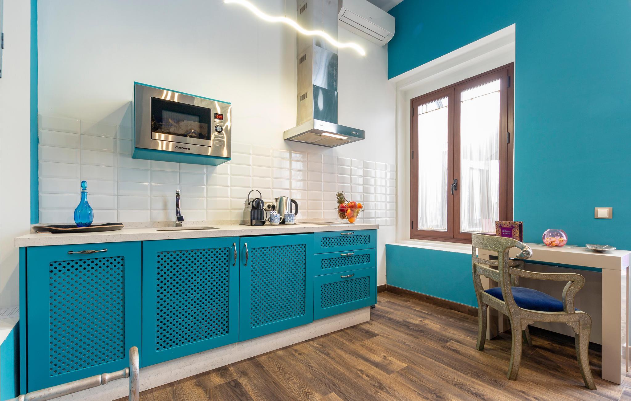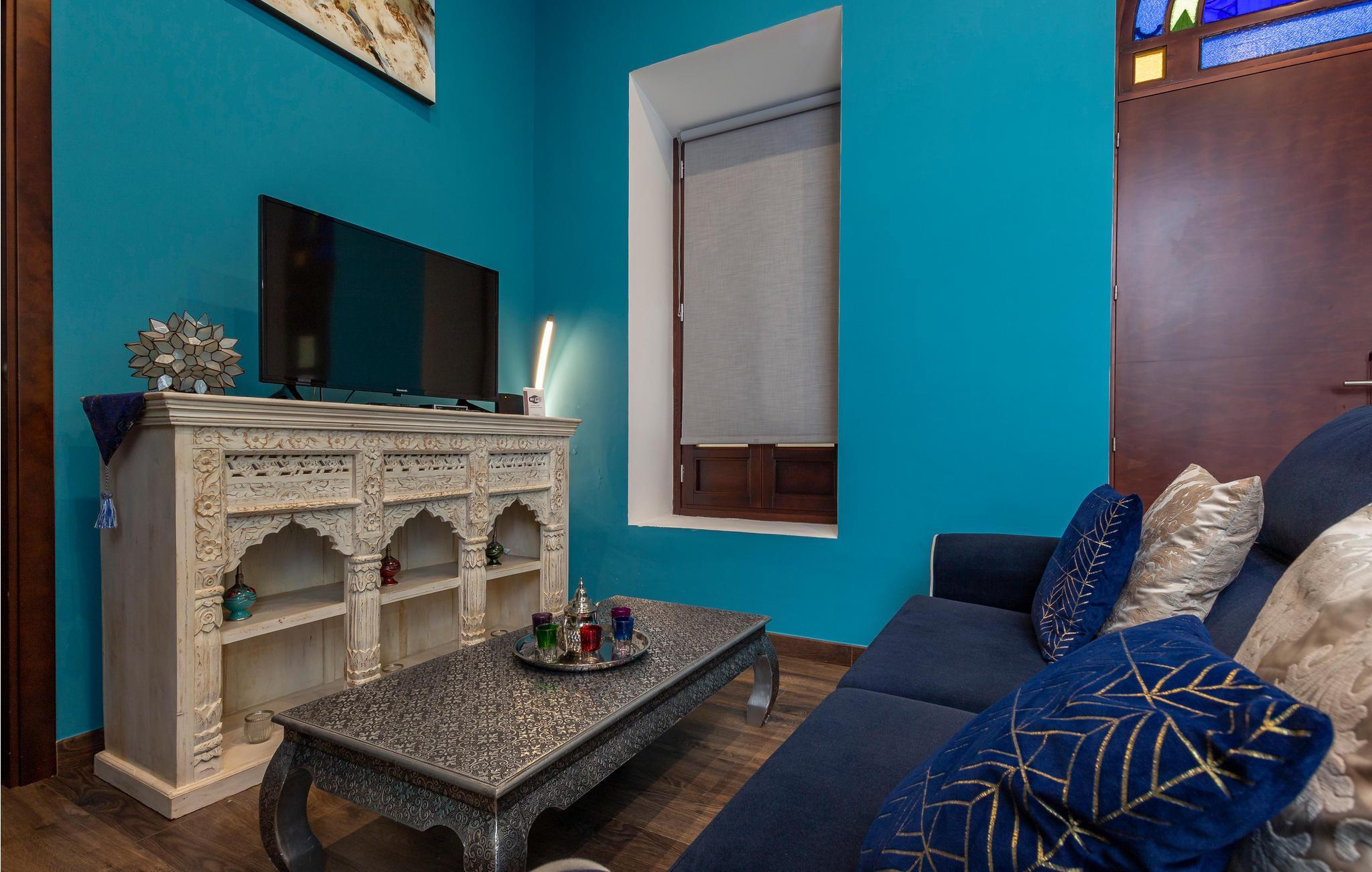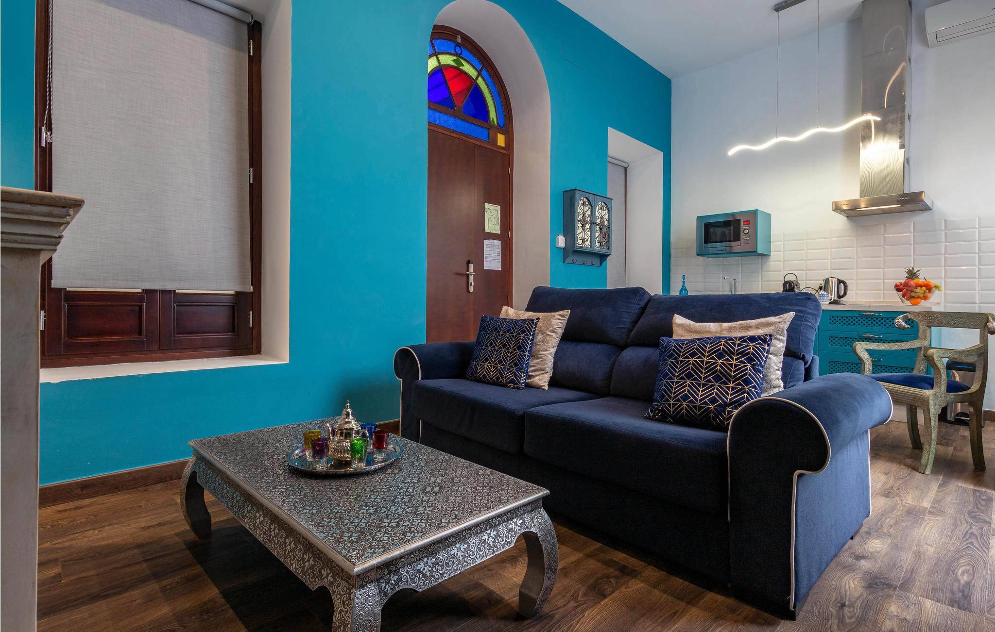 Træd indenfor i en havblå lejlighed i det historiske centrum af Sevilla.
