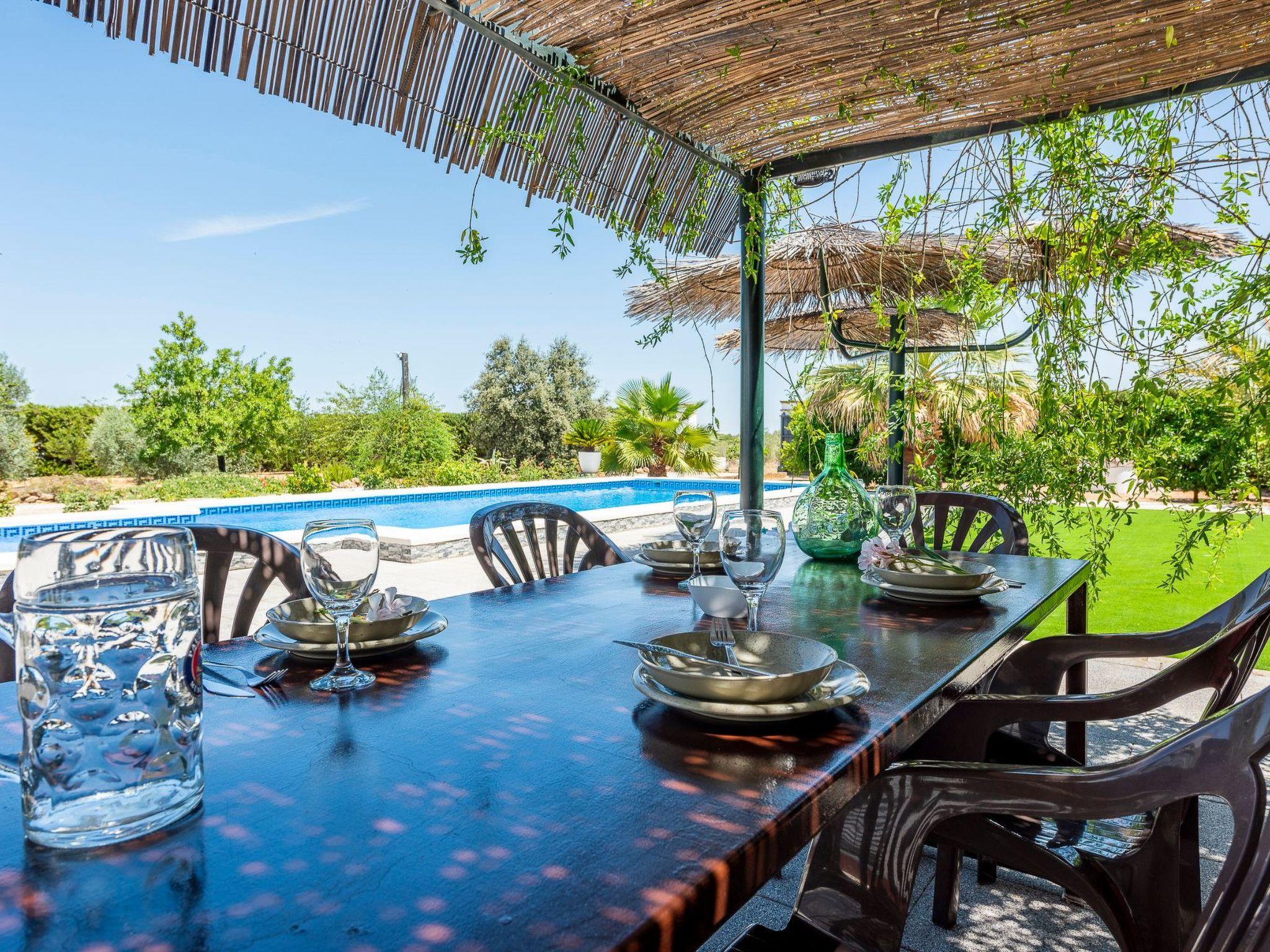 Barbecue area, pergola and lawn area, swimming pool with large sunshade.