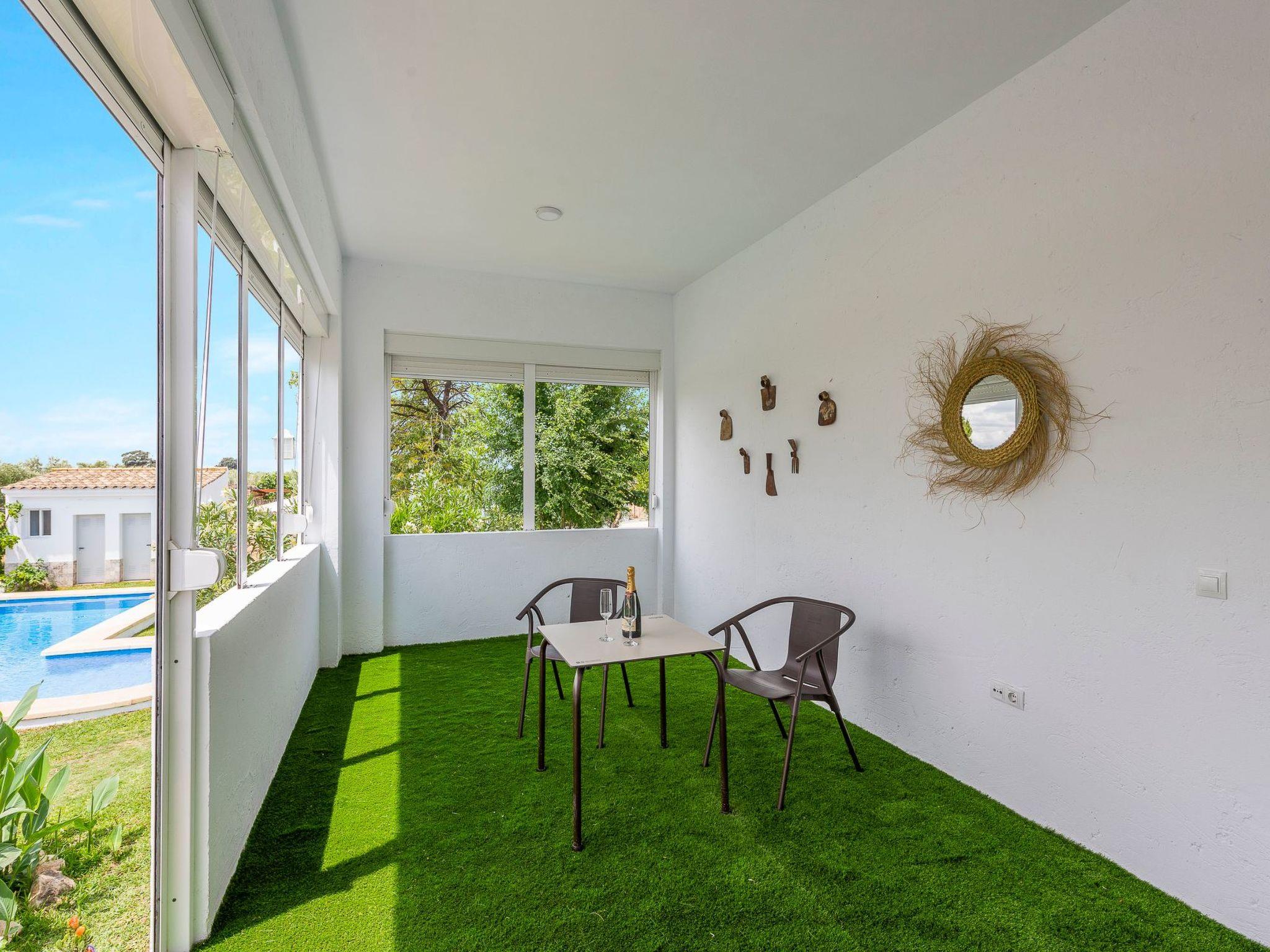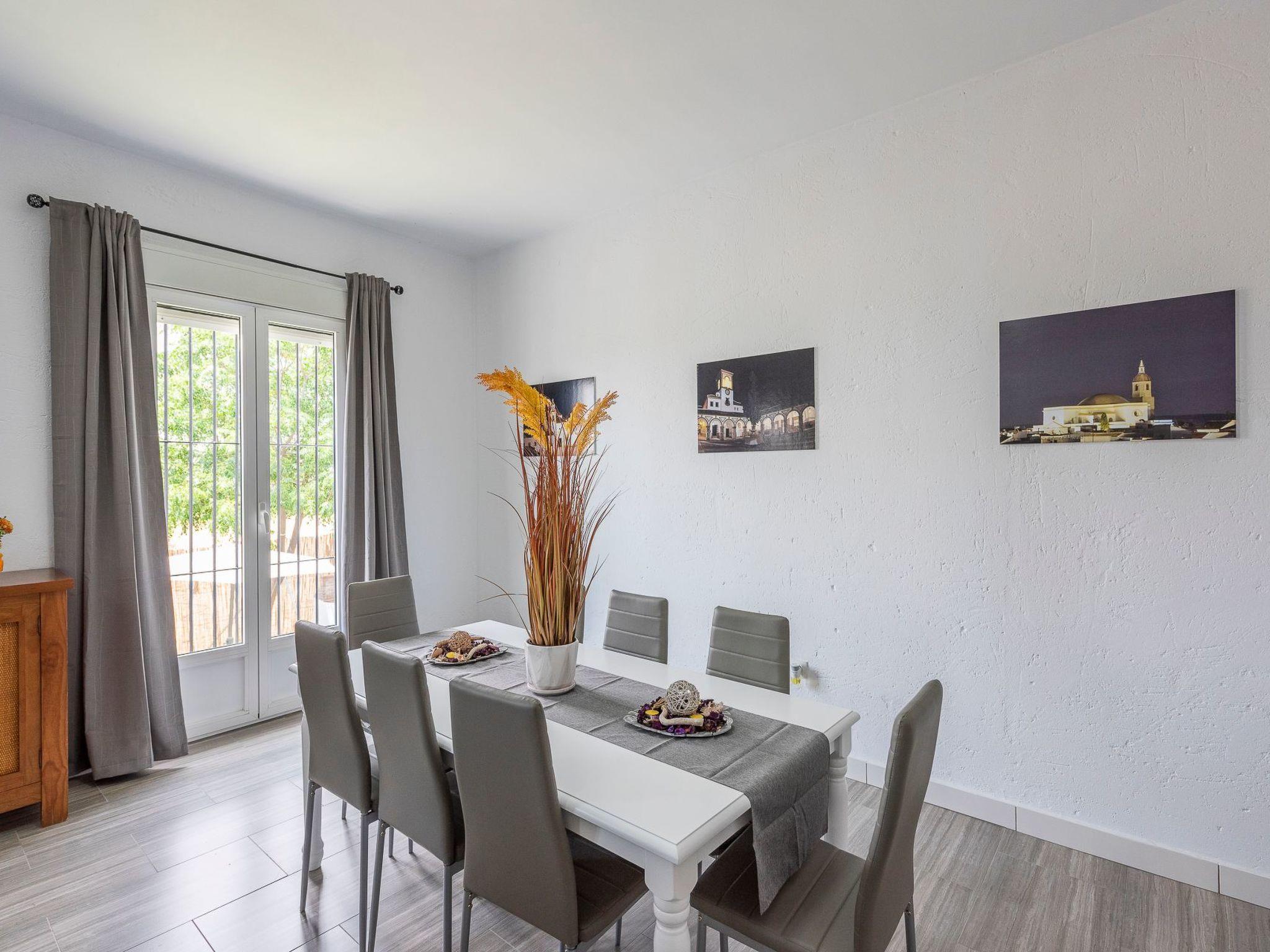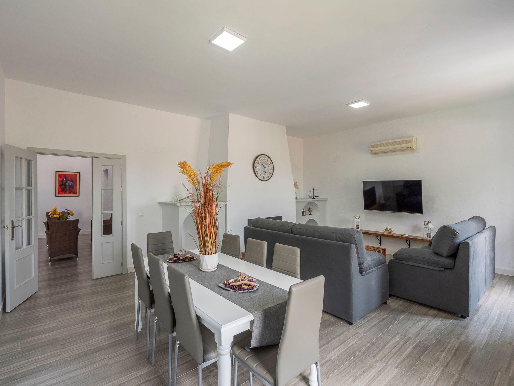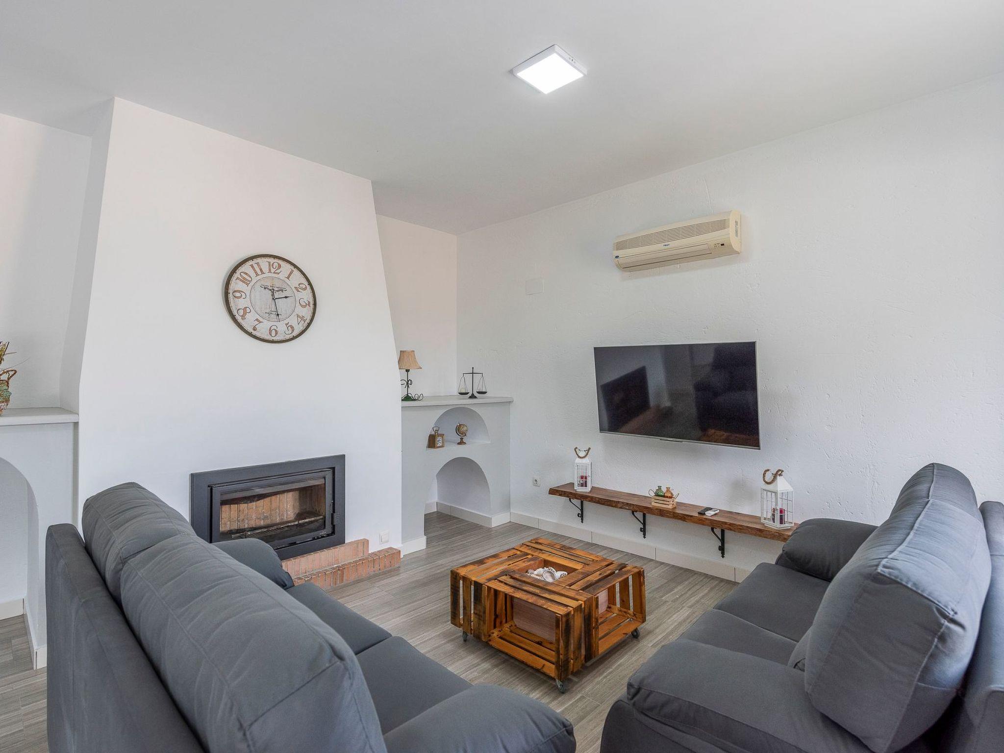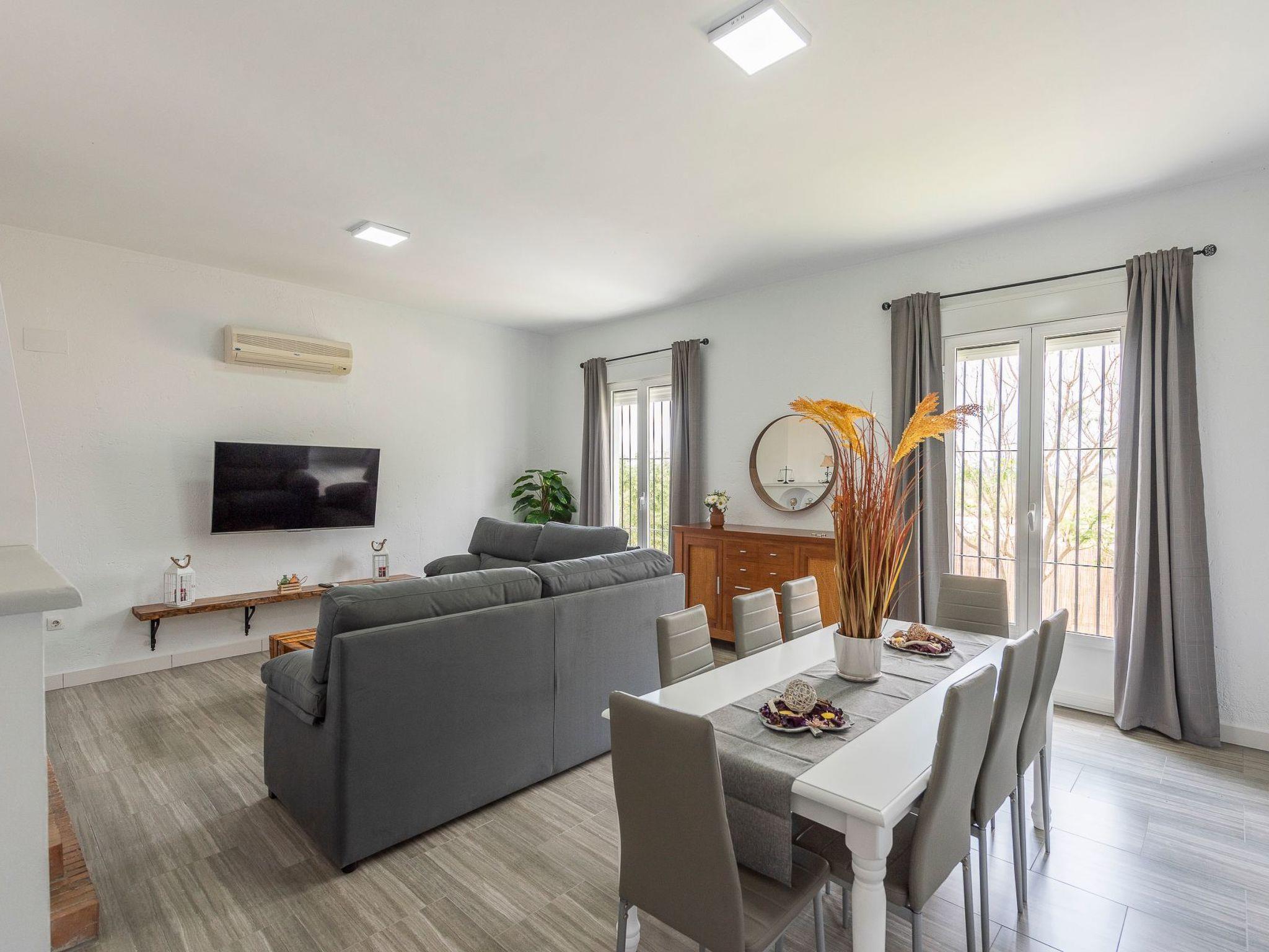 Dining room with fireplace of 35 m., TV 50 inches international channels, Wifi. Air conditioning, windows with views of the countryside and pool area.