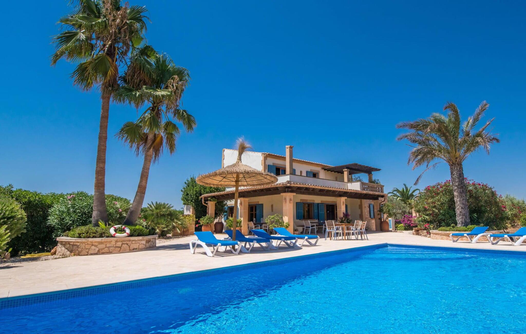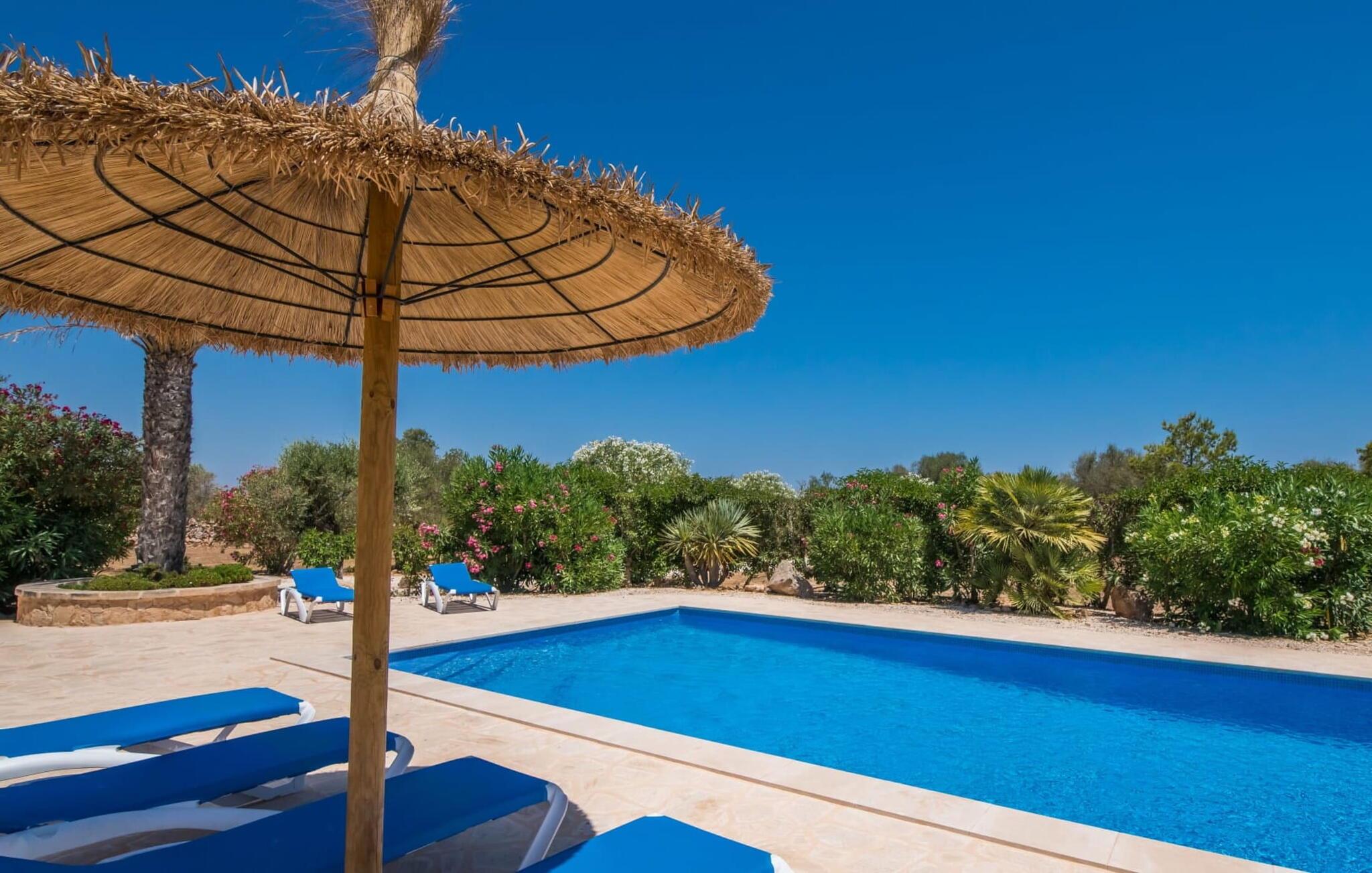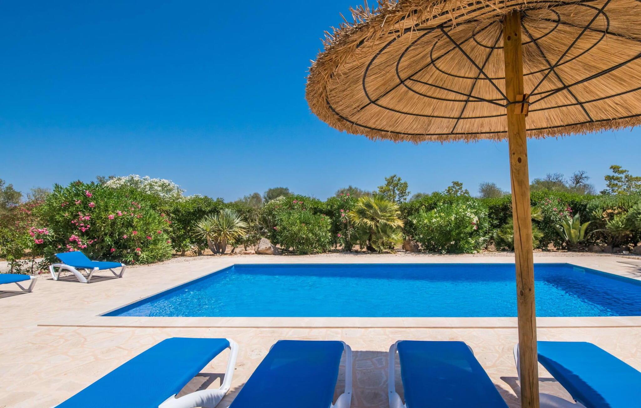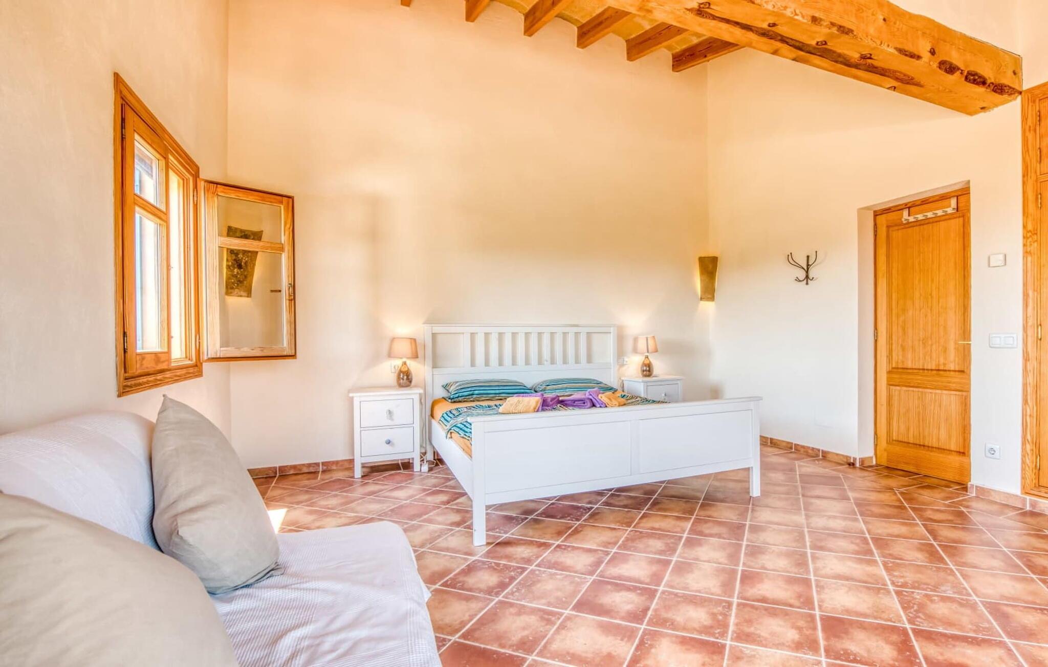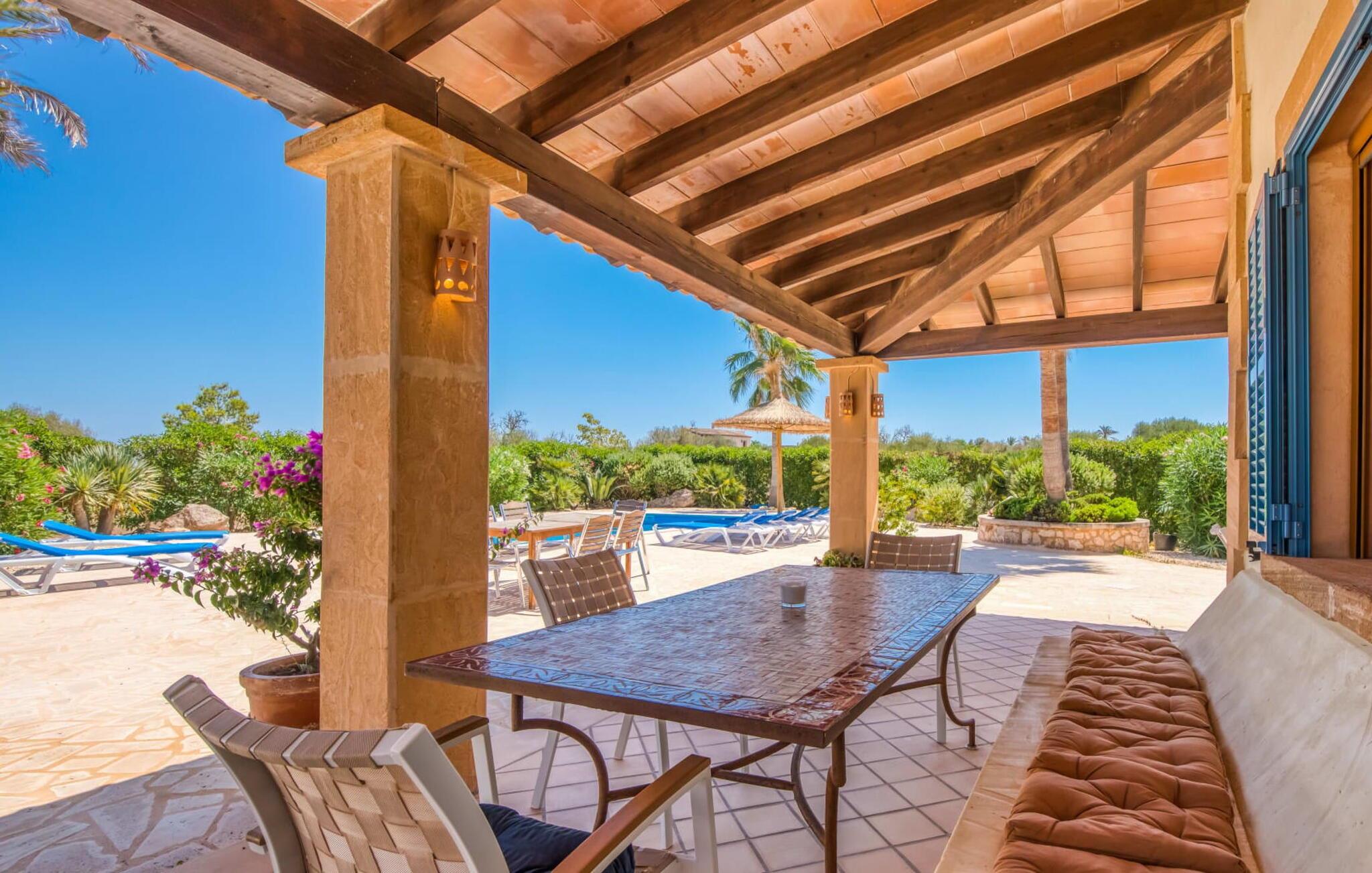 Den familievenlige villa "Sila" imponerer med sin unikke, rolige og helt afsondrede beliggenhed på en grund på næsten 10.000 m² dækket med palmer og oleander. jeres blik strækker sig langt ud over ejendommens grænser, mens I nyder afsondretheden i denne fortryllende villa på baggrund af olivenlunde og landbrugsparceller. Huset ligger dog på ingen måde isoleret, men derimod ved porten til den smukke by Santanyí. I vil hurtigt bemærke, at I bor i nærheden af et af de smukkeste steder på den sydlige del af øen – om ikke med det samme, så helt sikkert, når I nyder den eventyrlige udsigt fra den rummelige altan på øverste etage. I når til huset via en lang indkørsel - den muntre villa med smukke lyseblå skodder og talrige terrasser fremstår så fredfyldt og stille, at I straks vil føle jer helt velkommen. Alt på hele ejendommen og i villaen fremstår særligt naturligt og autentisk - dette understreges også af den frodige have, der omgiver villaen. Den blå himmel afspejles i pool-liggestolene og azurblå skodder omkring den store, private pool på 50 m² med en stor, omgivende naturstenterrasse. Solbad på den indbydende poolterrasse og nyd middagen med hele gruppen i ejendommens overdækkede udendørsarealer. Værelserne er lyse og venlige. Et åbent opholdsområde med to komfortable sofaer inviterer jer til at tilbringe en hyggelig aften med at se tv. Fra stuen er der udgang til en spiseplads med en påklædningsstol til de yngste gæster. Dette opholdsområde byder på letplejede terracotta-farvede fliser, vægge i bløde jordfarver, honningfarvede trævinduer og fliser omdannet til lamper og monteret på væggen, hvilket fremhæver husets særlige naturlige atmosfære. Det komfortable køkken er placeret bag spisepladsen og er funktionelt udstyret med opvaskemaskine, komfur med gas- og keramiske kogeplader, stort fritstående køleskab, kaffemaskine (Nespresso, I skal selv medbringe puder) og meget mere . Med de ægte mallorcanske fliser på vægge og arbejdsflader bidrager dette rum til husets autentiske stil. Af sikkerhedsmæssige årsager bør forældre med små børn bemærke, at trapperne er åbne og kan udgøre en potentiel fare. Der er plads nok til at op til 6 personer (plus en baby) kan slappe af i villaens tre utroligt rummelige og komfortable soveværelser. I soveværelserne finder I de samme smukke gulvfliser, lyse, muntre vægge og delvist fritlagte træbjælker. Begge badeværelser er udstyret med natursten. Hvis I har lyst til en dag på stranden, er de smukkeste strande i den sydlige del af øen kun få minutter væk. Cala Llombards ligger blot 2 km fra villaen. Mange mallorcanere og rejseguider anser det for at være en af de smukkeste badebugter på Mallorca. Den fjordlignende bugt Cala Figuera, kun 4 km væk, er også et besøg værd. Santanyí ligger kun 4,3 km væk, hvilket gør det nemt at komme dertil for at slentre, shoppe, natteliv og sightseeing. Uanset hvordan I ønsker at personliggøre jeres ferie - og aktiviteterne her er næsten ubegrænsede - er vi sikre på, at I vil nyde jeres ferie i landvillaen "Sila" fuldt ud. Villaen "Sila" ligger mellem høje palmer og oleandere på en afsondret ejendom i en rolig beliggenhed nær Santanyí på den sydlige spids af øen. Santanyí ligger kun 4,3 km væk og byder på adskillige butikker og supermarkeder samt gode restauranter og barer. Ikke langt fra Santanyí ligger Cap de ses Salines, som markerer øens sydligste punkt. De smukkeste strande på den 35 km lange kystlinje, herunder Calo des Moro eller Cala Llombard, ligger kun 2 km væk.