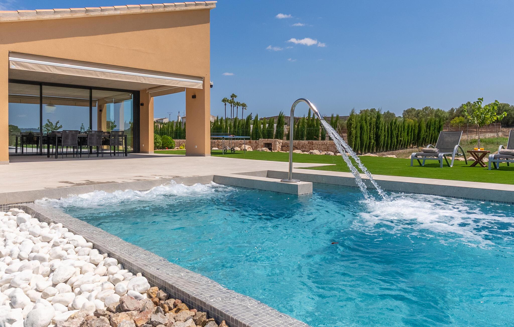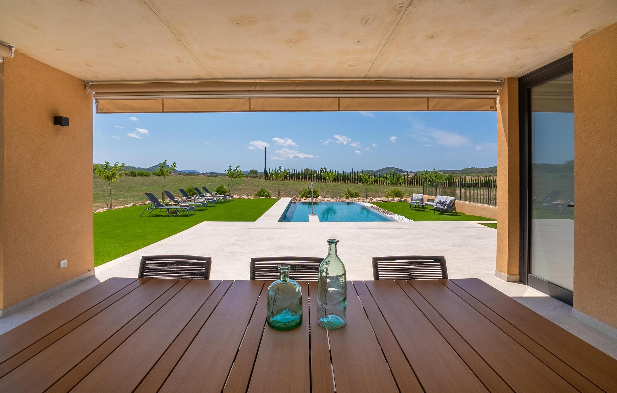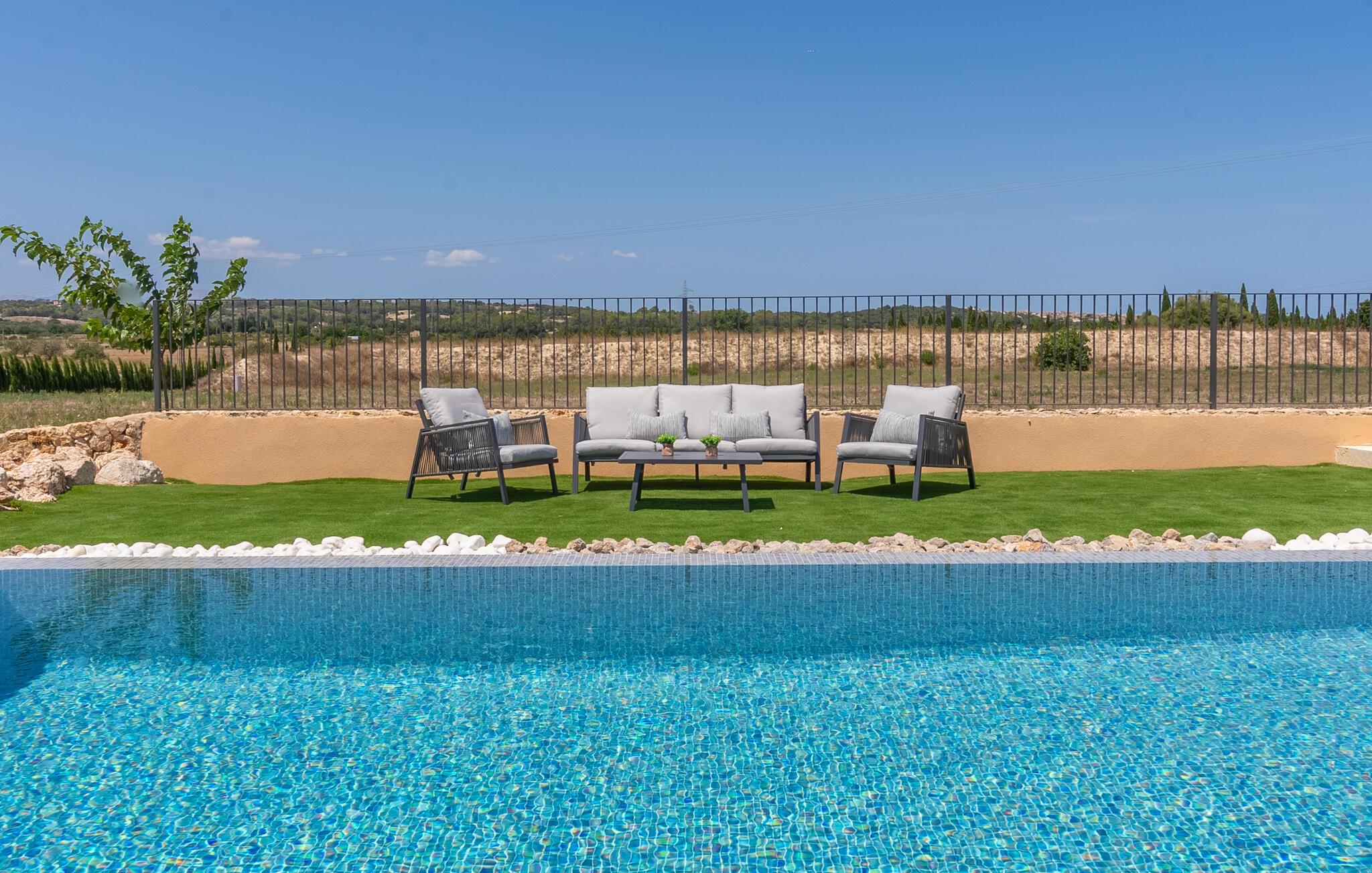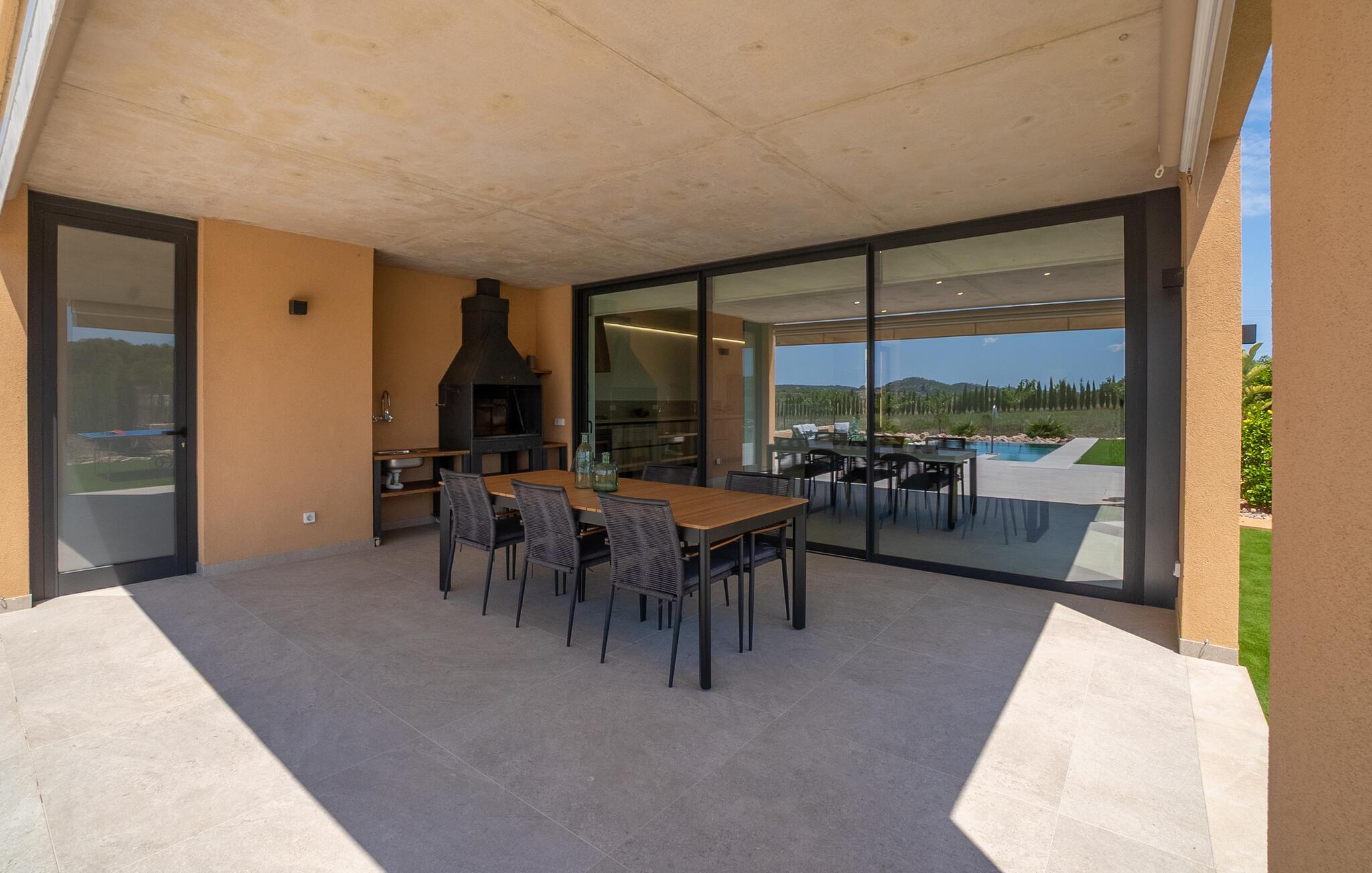 Udnyt det rummelige udendørsområde til ren afslapning. Svøm i den indbydende pool omgivet af komfortable liggestole. Nyd et glas vin i det stilfulde siddeområde eller spis i den overdækkede spiseplads med grill, mens I nyder det rolige landskab.