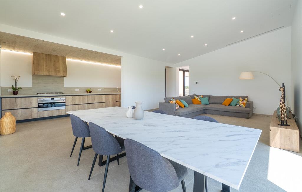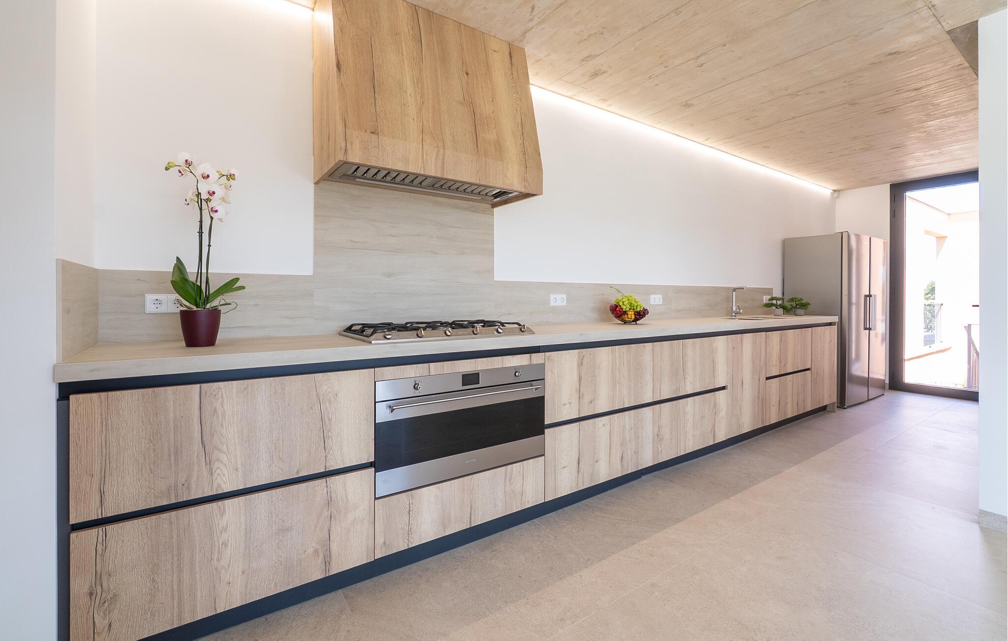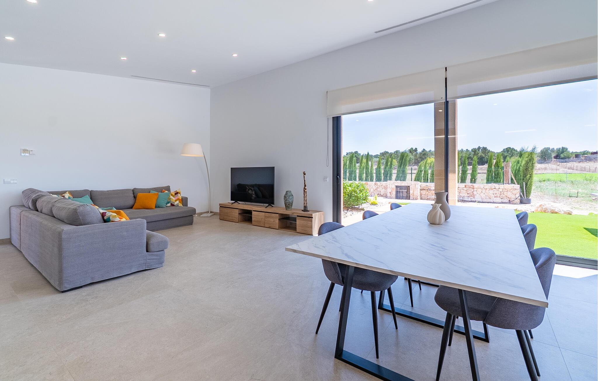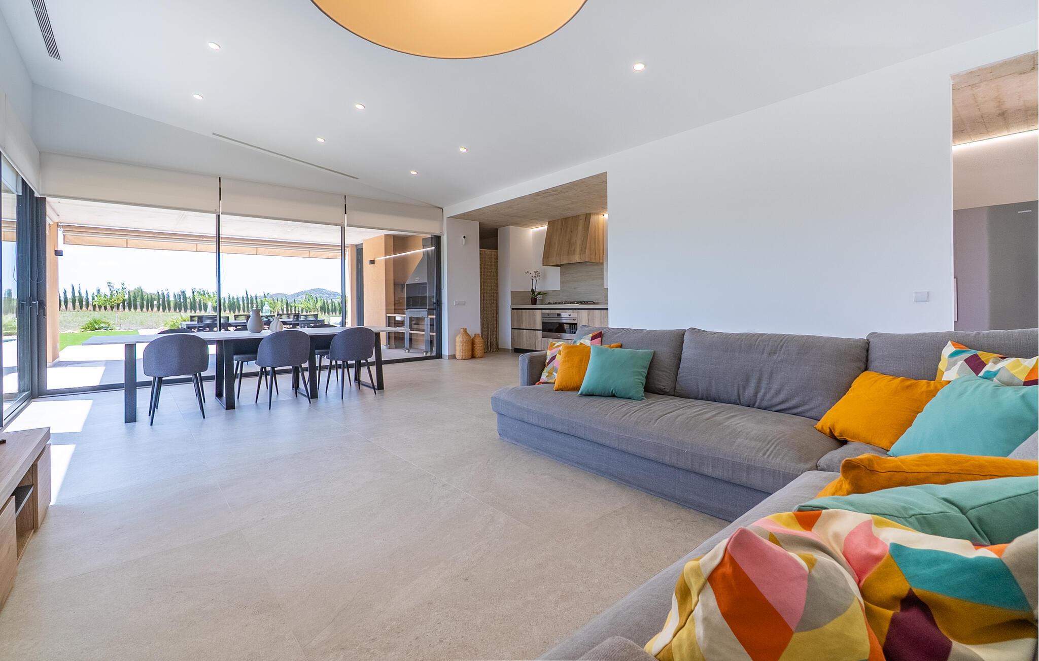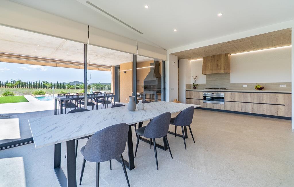Velkommen til et hus, der kombinerer moderne design med en rolig beliggenhed. Her finder I en skøn oase for afslappende timer og uforglemmelige ferieøjeblikke. Træd indenfor og bliv budt velkommen af de lyse rum. Sæt jer til rette i den rummelige opholdsstue på den komfortable, generøse sofa og se en film. Tilbered lækre måltider i det moderne køkken med elegante træskabe og nyd dem ved det store spisebord med direkte udsigt over haven. gulv til loft-vinduer forbinder harmonisk interiøret med den solrige terrasse.