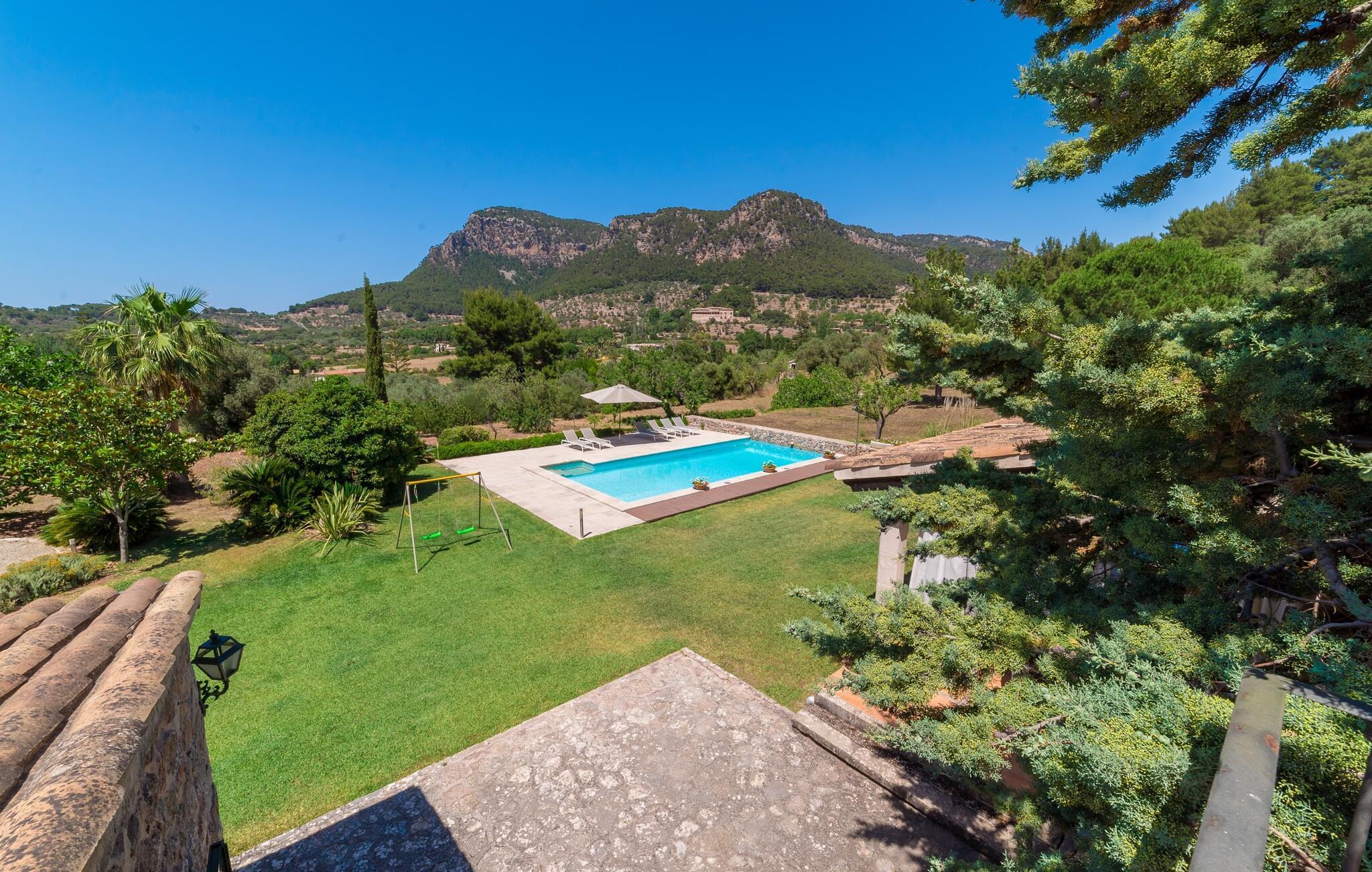 Denne ejendom er et must for alle, der værdsætter en rolig og eksklusiv atmosfære på ferien. Villaen “Son Beltran” opfylder begge krav på en særdeles tilfredsstillende måde. Den enorme ejendom på ikke mindre end 15.000 m² inviterer gæster til at blive hængende og slappe af, som de ønsker. Den parklignende atmosfære på denne ejendom forstærkes af store græsplæner, luftige pladser med naturlig skygge under storslåede træer, blomsterbede, stier og små vægge. I vil straks føle jer hjemme her. Havens højdepunkt er naturligvis den smukke pool, hvor I kan svømme længder over en længde på 11 m. Poolen er meget let tilgængelig via trapper. Den udendørs bruser, der er installeret lige ved siden af poolen, giver jer mulighed for at tage et hurtigt, forfriskende brusebad, hvorefter I kan finde jer tilpas på en af de komfortable liggestole under middelhavssolen og måske slappe af for en stund. Har I brug for beskyttelse mod de stærke UV-stråler, er der to parasoller til rådighed. Der blev også taget højde for de små gæsters behov, da haven blev designet. Der er også en gynge på den store græsplæne, hvor man kan boltre sig og slappe af. Udearealet byder på særligt attraktive terrassearealer, dygtigt designet og fordelt på forskellige niveauer af denne bolig med en unik grundplan. De flisebelagte overdækkede terrasser er i stueetagen, og stenterrassen er lidt højere og byder på en fortryllende udsigt. Dette område kan tilgås udefra via en rustik trappe, der fører til tagterrassen, som måske er den mest luksuriøse udendørs siddeplads denne ejendom har at tilbyde. Smagfulde udendørsmøbler inviterer jer til at slappe af på en af terrasserne eller spise en hyggelig middag ved spisebordet. I kan tilberede og nyde friske, regionale delikatesser på den udendørs grill, mens I nyder den fantastiske udsigt over den fortryllende haveidyl. Når man træder ind i huset, står det med det samme klart, at den dygtige udformning af udearealet i hvert fald matcher interiøret. Her finder vi en meget vellykket kombination af æstetiske materialer og møbler samt dygtigt brugte dekorative elementer, især i form af inspirerende kunstværker på væggene. Stuen imponerer med sin rummelige naturstensvæg og den matchende brede sofa, som er yderst behagelig og inviterer jer til at slappe af på ethvert tidspunkt af dagen. På kølige dage kan I endda bruge pejsen til at holde jer varm og dermed sikre en uforlignelig komfort. Det bidrager de klassiske træbjælkelofter og de smukke gulvfliser bestemt til. Køkkenområdet er præget af et meget originalt design. Her finder I ikke kun et elegant designet og fuldt udstyret køkken med elkedel og Nespresso kaffemaskine. Køkkenet har også et meget karakteristisk opholdsområde med stenvægge, lidt adskilt fra resten af rummet, perfekt til at sidde og nyde et måltid. De runde buer, der understøtter de enkelte siddepladser, samt det usædvanlige loftdesign gør dette til et helt specielt sted. En anden mulighed for spisning finder I udenfor køkkenet ved det smukke, massive træbord, som kan rumme op til seks personer. Alle soveværelser (et med eget badeværelse) er indrettet til en høj standard og har smukke og unikke designs. Alle vil finde den rigtige rasteplads, der passer til deres smag. Følgende senge er tilgængelige for gæster: tre senge på 1,80 x 2,20 m og to senge på 0,90 x 1,90 m. Badeværelserne er også smagfuldt indrettede. De er generøst store og indrettede i en komfortabel og moderne stil. I behøver ikke at medbringe en hårtørrer. Valldemossa blev engang kåret som den smukkeste landsby i Spanien og er bestemt et besøg værd. Der er forskellige smukke strande i nærheden af denne maleriske landsby. For eksempel: Cala Deìa (13 km væk) med sit krystalklare vand eller den lille stenstrand i Port de Valldemosse (6 km). Den nærmeste sandstrand ligger omkring 20 km væk i Puerto de Sóller. Den livlige ø-metropol og dens smukke gamle bydel kan nås på omkring 35 minutter. Villaen “Son Beltran” med havudsigt er et særdeles smagfuldt renoveret feriehus med en fantastisk beliggenhed på den vestlige del af øen. De maleriske landsbyer Deìa og Valldemossa med utallige barer, restauranter og indkøbsmuligheder ligger hver kun få minutter væk i bil. Den smukke badebugt "Cala de Deìa" er også let at nå. Palma de Mallorca lufthavn ligger omkring 27 kilometer væk.