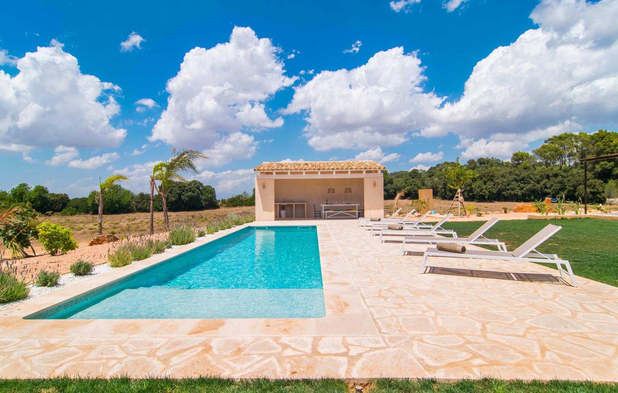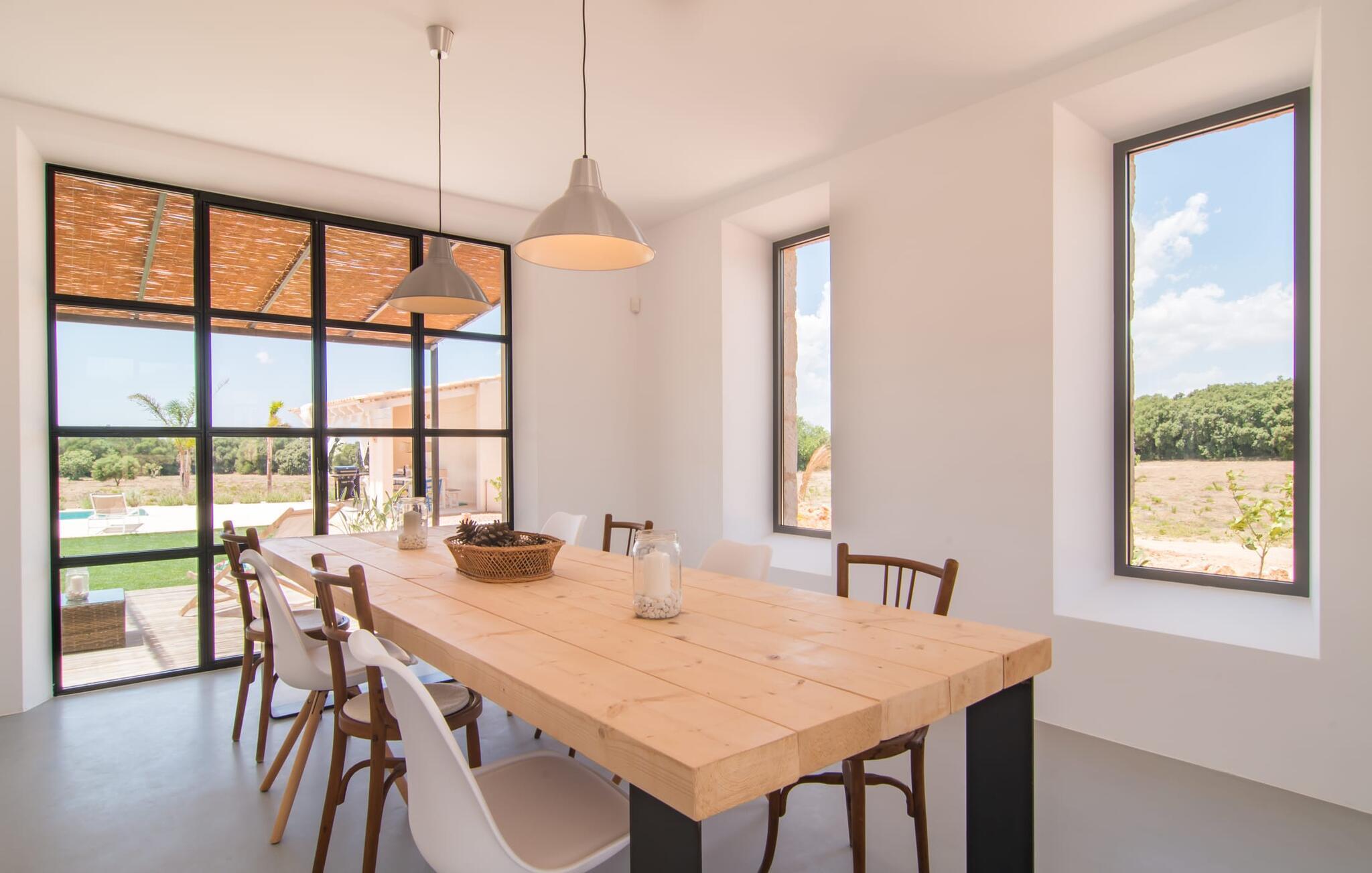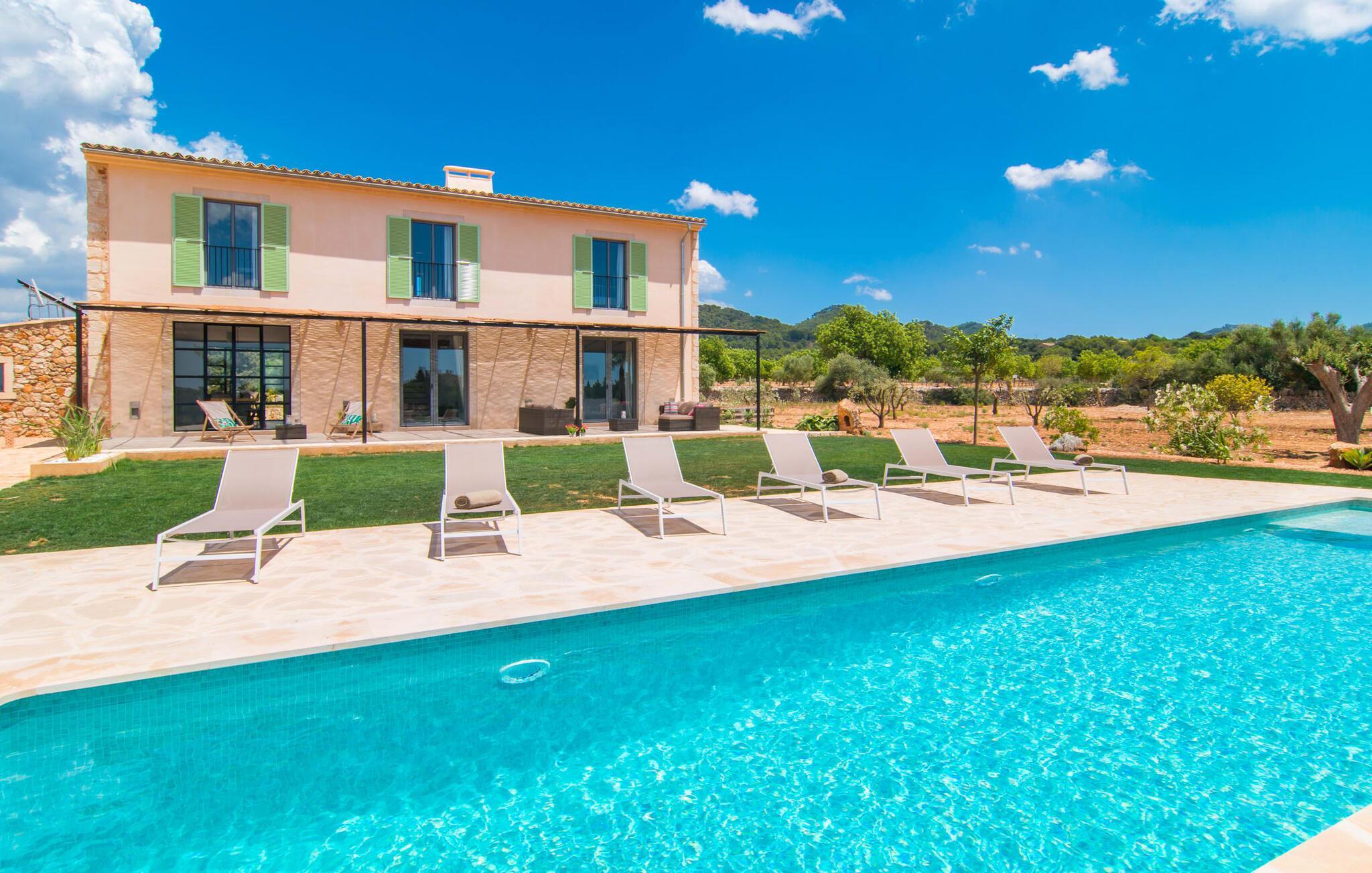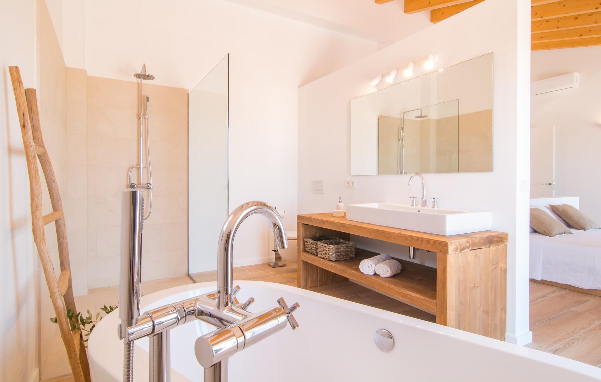 Villaen "Son Benassar Ses Figueres" er et imponerende bevis på, at "landligt" og "stilfuldt" ikke behøver at udelukke hinanden. Det nybyggede hus med sine smukke grønne skodder og store vinduer i stueetagen ligger i en absolut rolig beliggenhed nær byen Felanitx på det sydlige Mallorca. Enhver, der kigger ud fra den overdækkede terrasse med trendy udendørsmøbler, vil ikke se andet end det vidunderlige, typisk mallorcanske landskab, som indbyder til f.eks. lange cykelture. Selve ejendommen på 38.000 m², med sin smukt anlagte have og fantastiske pool med græsplæne til solbadning, naturstenssolterrasse og overdækket udekøkken, indbyder også til en afslappende gåtur. Dette er et Fincallorca feriehus. Indersiden af villaen er en sand drøm! Hvide vægge, lyse gulve, klare linjer og store vinduespartier dominerer indretningen - og skaber en behagelig moderne og meget stilfuld boligatmosfære, der får dig til at føle dig godt tilpas. Værelserne er rummelige, især den aflange opholds- og spisestue i stueetagen. Hvis du kan lide at se en spændende krimi med et glas rødvin, kan du finde dig tilpas i den store, komfortable sofa. Lige ved siden af er der et attraktivt spisebord i træ med designerstole, hvor du kan tilbringe lange aftener med god mad og nyde udsigten til den uberørte natur gennem de store vinduespartier. Du har også en vidunderlig udsigt fra det åbne og stilfuldt udstyrede køkken. Udover et gæstebadeværelse er der også et dobbeltværelse i stueplan, indrettet med stor smag og flair for pæne detaljer, samt et tilhørende en-suite badeværelse. På øverste etage, hvor brune træbjælker kan ses overalt på lofterne, er der endnu en stue - udstyret med indbydende sækkestole, hvor man kan slappe af. Yderligere to smarte soveværelser med virkelig fantastiske en-suite badeværelser - for eksempel med et fritstående badekar eller en rustik stenvask - sikrer fuld komfort på første sal. Drømmer du om en ferie på landet, men vil du ikke gå glip af moderne komfort og en stilfuld stemning? Så er den nybyggede villa "Son Benassar Ses Figueres" nær byen Felanitx på den sydlige del af øen lige noget for dig! Det smukke hus er ekstremt stille midt i et smukt landskab og scorer også point med den store pool i haven. Den nærmeste strand "Cala Gran" er kun ca. 13 km væk med lejebil. Bemærk venligst, at denne ejendom ikke accepterer ungdomsgrupper eller polterabender. En ungdomsgruppe på denne ejendom består af personer på 27 år eller derunder. Book ikke denne ejendom, hvis du er en ungdomsgruppe eller polterabend, da din reservation vil blive afvist, når den er booket, hvilket også kan være tilfældet ved ankomst til ejendommen eller under dit ophold, og du vil ikke modtage en refusion