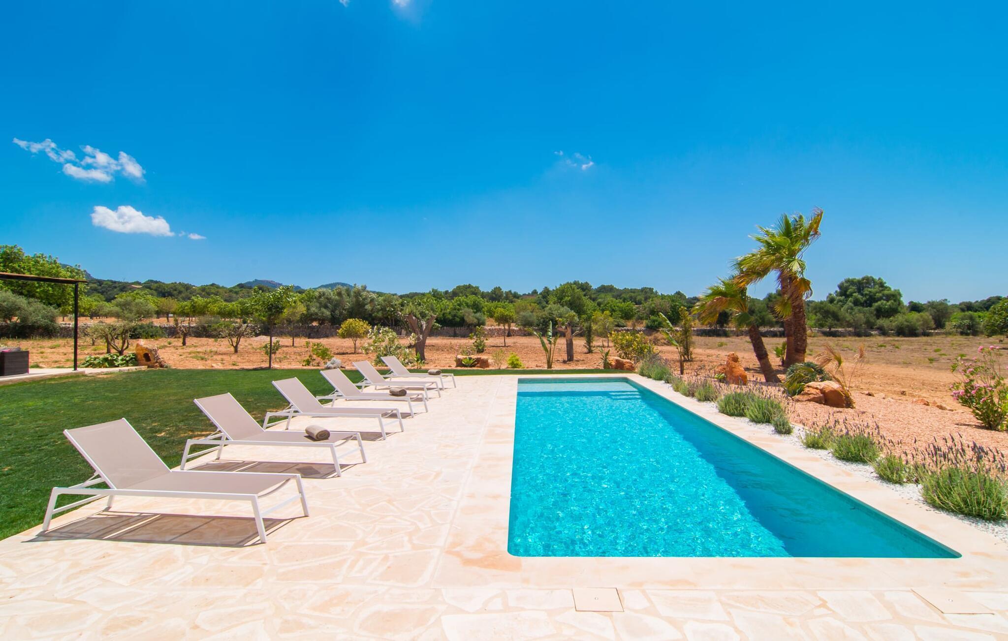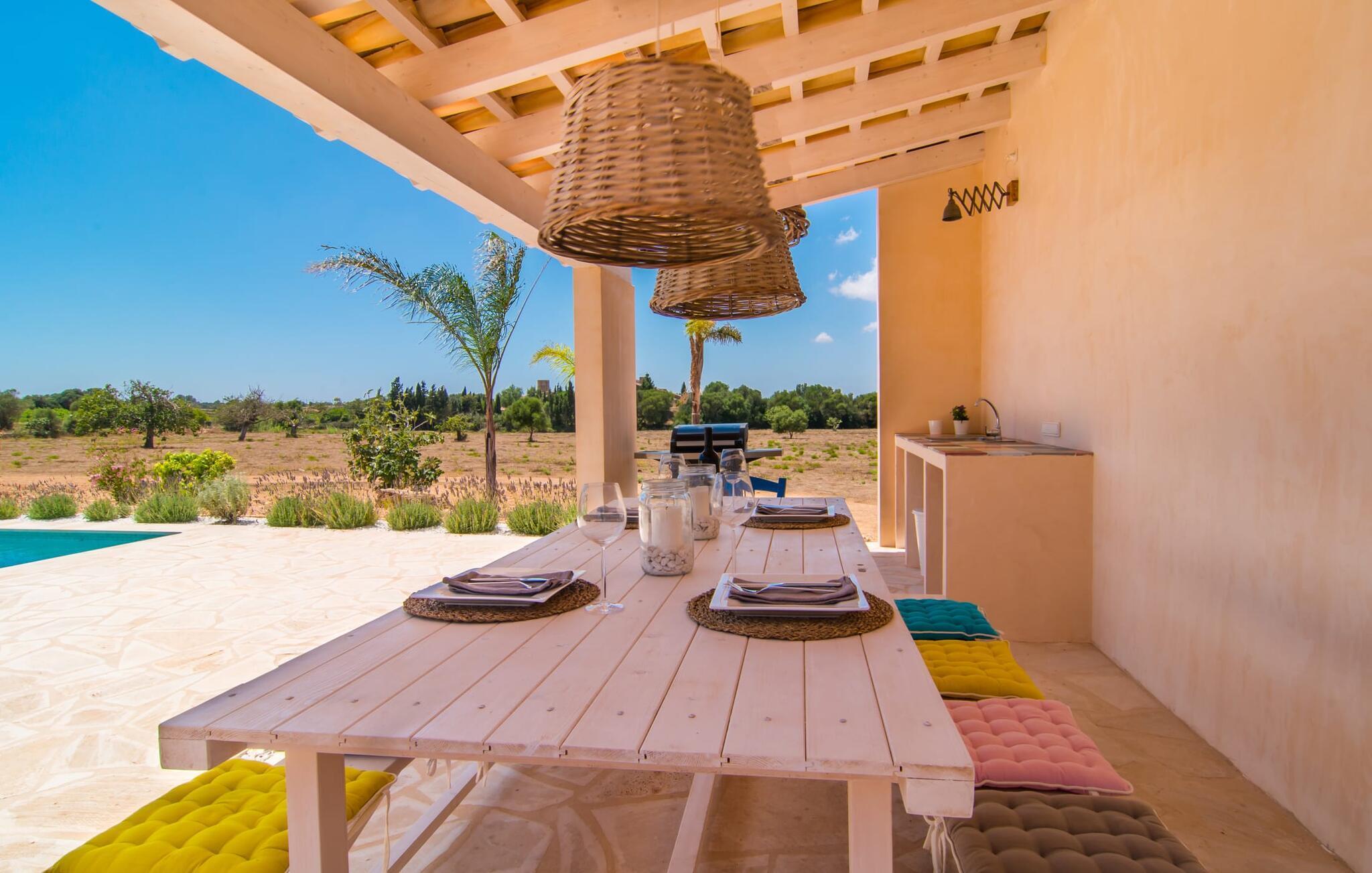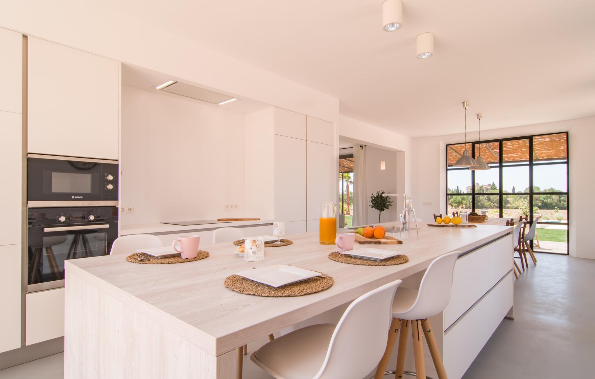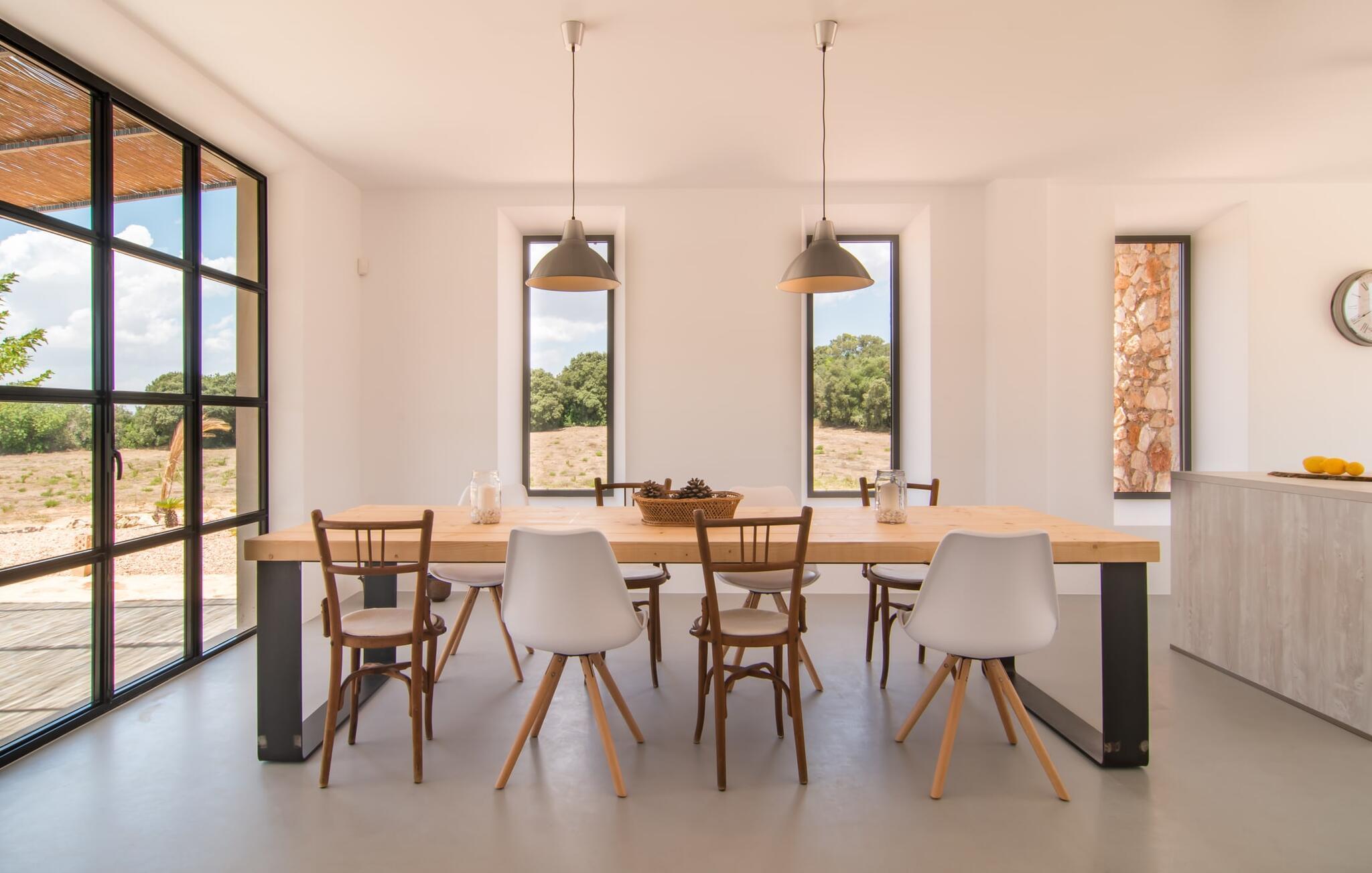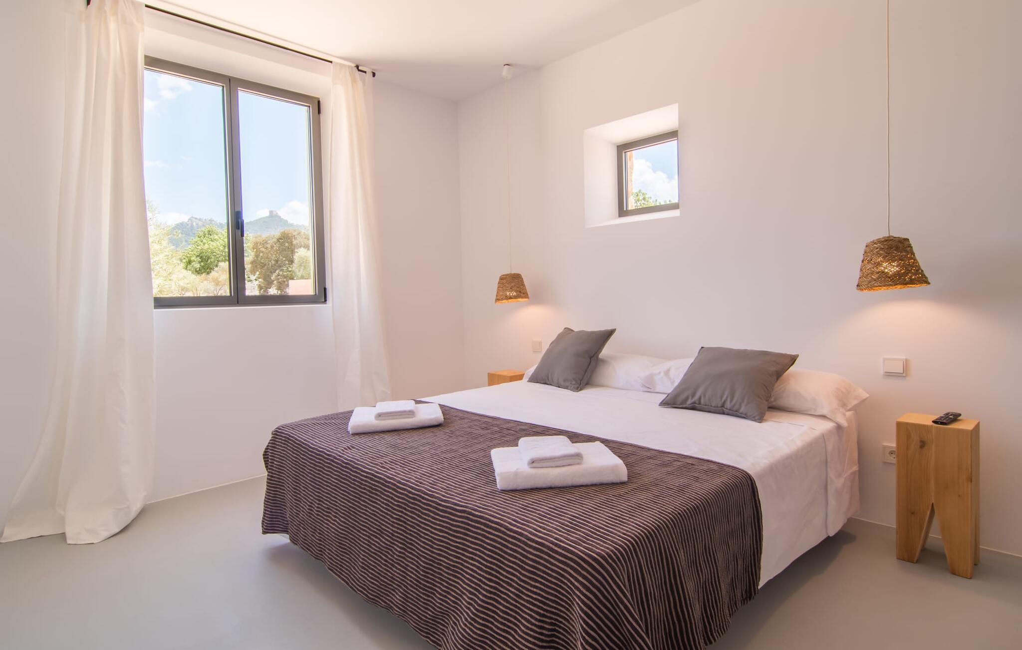 Villaen "Son Benassar Ses Figueres" er et imponerende bevis på, at "landligt" og "stilfuldt" ikke behøver at udelukke hinanden. Det nybyggede hus med sine smukke grønne skodder og store vinduer i stueetagen ligger i en absolut rolig beliggenhed nær byen Felanitx på det sydlige Mallorca. Enhver, der kigger ud fra den overdækkede terrasse med trendy udendørsmøbler, vil ikke se andet end det vidunderlige, typisk mallorcanske landskab, som indbyder til f.eks. lange cykelture. Selve ejendommen på 38.000 m², med sin smukt anlagte have og fantastiske pool med græsplæne til solbadning, naturstenssolterrasse og overdækket udekøkken, indbyder også til en afslappende gåtur. Dette er et Fincallorca feriehus. Indersiden af villaen er en sand drøm! Hvide vægge, lyse gulve, klare linjer og store vinduespartier dominerer indretningen - og skaber en behagelig moderne og meget stilfuld boligatmosfære, der får dig til at føle dig godt tilpas. Værelserne er rummelige, især den aflange opholds- og spisestue i stueetagen. Hvis du kan lide at se en spændende krimi med et glas rødvin, kan du finde dig tilpas i den store, komfortable sofa. Lige ved siden af er der et attraktivt spisebord i træ med designerstole, hvor du kan tilbringe lange aftener med god mad og nyde udsigten til den uberørte natur gennem de store vinduespartier. Du har også en vidunderlig udsigt fra det åbne og stilfuldt udstyrede køkken. Udover et gæstebadeværelse er der også et dobbeltværelse i stueplan, indrettet med stor smag og flair for pæne detaljer, samt et tilhørende en-suite badeværelse. På øverste etage, hvor brune træbjælker kan ses overalt på lofterne, er der endnu en stue - udstyret med indbydende sækkestole, hvor man kan slappe af. Yderligere to smarte soveværelser med virkelig fantastiske en-suite badeværelser - for eksempel med et fritstående badekar eller en rustik stenvask - sikrer fuld komfort på første sal. Drømmer du om en ferie på landet, men vil du ikke gå glip af moderne komfort og en stilfuld stemning? Så er den nybyggede villa "Son Benassar Ses Figueres" nær byen Felanitx på den sydlige del af øen lige noget for dig! Det smukke hus er ekstremt stille midt i et smukt landskab og scorer også point med den store pool i haven. Den nærmeste strand "Cala Gran" er kun ca. 13 km væk med lejebil. Bemærk venligst, at denne ejendom ikke accepterer ungdomsgrupper eller polterabender. En ungdomsgruppe på denne ejendom består af personer på 27 år eller derunder. Book ikke denne ejendom, hvis du er en ungdomsgruppe eller polterabend, da din reservation vil blive afvist, når den er booket, hvilket også kan være tilfældet ved ankomst til ejendommen eller under dit ophold, og du vil ikke modtage en refusion