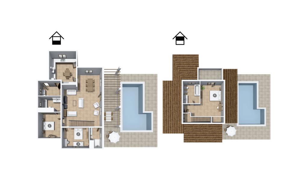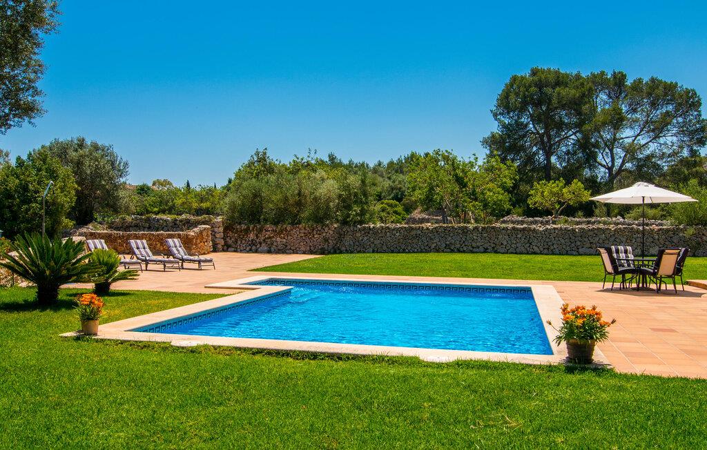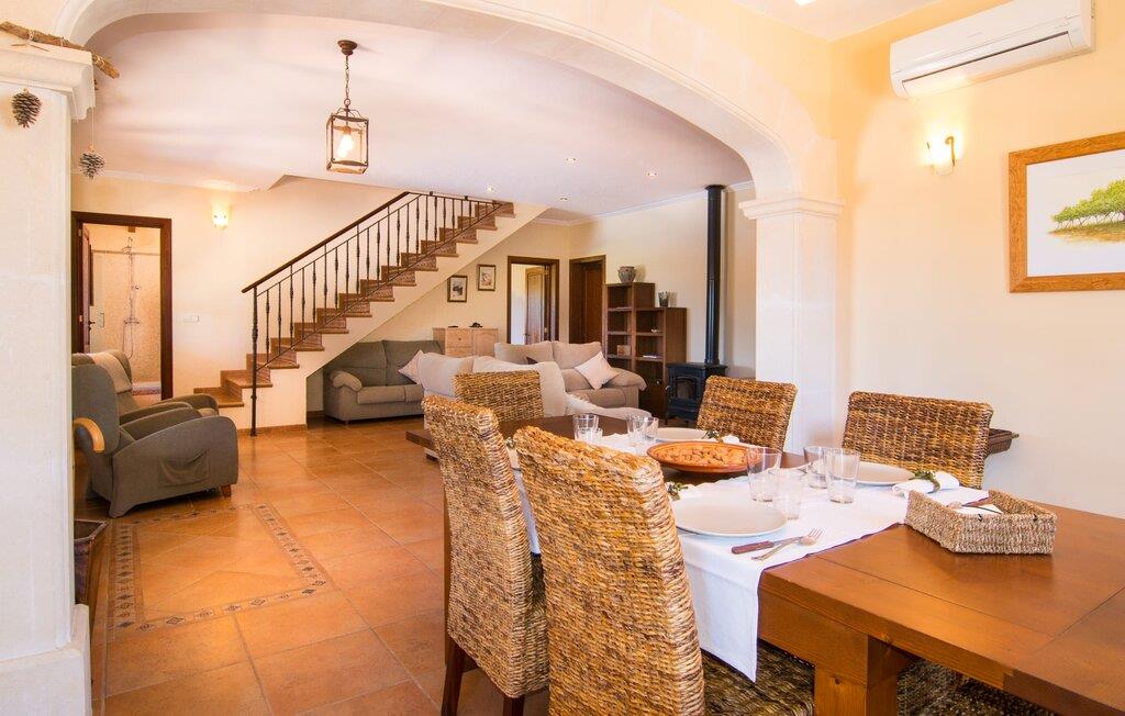 Den familievenlige villa “Son Bielo” imponerer med sin unikke, afsides beliggenhed på en 20.000 m² stor grund, med en meget velholdt have, der er frodigt anlagt alt efter årstiden. Et udvalg af middelhavsplanter, kærligt plantede urtepotter og de lave naturstensvægge giver ejendommen et særligt venligt udseende. Fordi der ikke er høje hegn eller lignende, er følelsen af rummelighed imponerende og kan opleves direkte. Havearealet består stort set af frodige græsplæner og omfattende terrassearealer. Ved at dække huset har I mulighed for at nyde en række skønne steder at slappe af i solen eller i den luftige skygge, alt efter jeres præferencer. Komfortable liggestole inviterer jer til at slappe af, og det samme gør elegante loungesiddeområder. Poolen med sin usædvanlige L-form harmonerer perfekt med villaen, som også ser legende og munter ud takket være dens let sammenlåsende struktur. Udformningen af den verandalignende terrasse lige ved siden af huset fremstår herligt rustikt og elegant. Her er fliserne og naturstensfacaden i kombination med de buede vinduer perfekt afstemt. Når vejret er godt, kan I blot spise alle jeres måltider udendørs og nyde den uhindrede udsigt til den dybblå morgenhimmel under morgenmaden og en tilfredsstillende ferie om aftenen. Villaens indre byder også på møbler af høj kvalitet, som er synlige ved første øjekast. Husets centrum er den kombinerede stue/spisestue, som både rummer en flot spisegruppe og et lyst indrettet sofahjørne med TV og behagelige siddepladser. På køligere aftener kan I endda slappe af ved en hyggelig pejs og varmen fra et bål. Smagfuld udsmykning blev brugt sparsomt og dygtigt, så rummene ikke mistede den klarhed og elegance, som de naturligt udstråler. En ekstra spiseplads er placeret i det yderst rummelige og stilfulde køkken, som er fuldt udstyret og tilbyder gæsterne køleskab, ovn, komfur, mikroovn, opvaskemaskine/kaffemaskine og masser af opbevaringsplads. Smukt designede soveværelser med et meget hjemligt præg inviterer jer til en afslappende nattesøvn. Lyse farver kombineret med elegante møbler i massivt træ skaber en meget varm atmosfære. Det tredje soveværelse forklarer muligheden for belægning af syv personer: her er der en dobbeltseng og en ekstra enkeltseng, så rummet kan optages af tre personer, hvis det er nødvendigt. To til tre babysenge og høje stole er også tilgængelige. Tre lyse badeværelser er smagfuldt designet og funktionelt udstyret. I kan også nyde et hydromassagesystem i badekarret. I kan nemt lade jeres hårtørrer og strygejern blive derhjemme. Lloret de Vistalegre er et meget smukt sted og kun fem minutter væk i bil. Hver mandag morgen har I mulighed for at købe friske varer fra lokale landmænd på det ugentlige marked. En tur til Inca vil bestemt være det værd. Inca har en lang tradition inden for læder- og skohåndværk. Området omkring byen er præget af en række kendte virksomheder i skobranchen (f.eks. Camper-mærket). Villaen "Son Bielo" er en moderne og særdeles velholdt ejendom i den nordlige del af Lloret de Vistalegre i centrum af øen. Herfra tager køreturen til Inca kun 20 minutter. Strandene på den nordøstlige kyst, herunder de smukke strande i Alcúdia-bugten, er let tilgængelige med lejebil.
