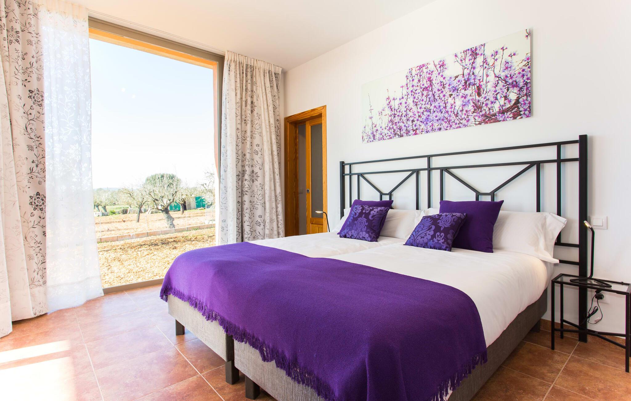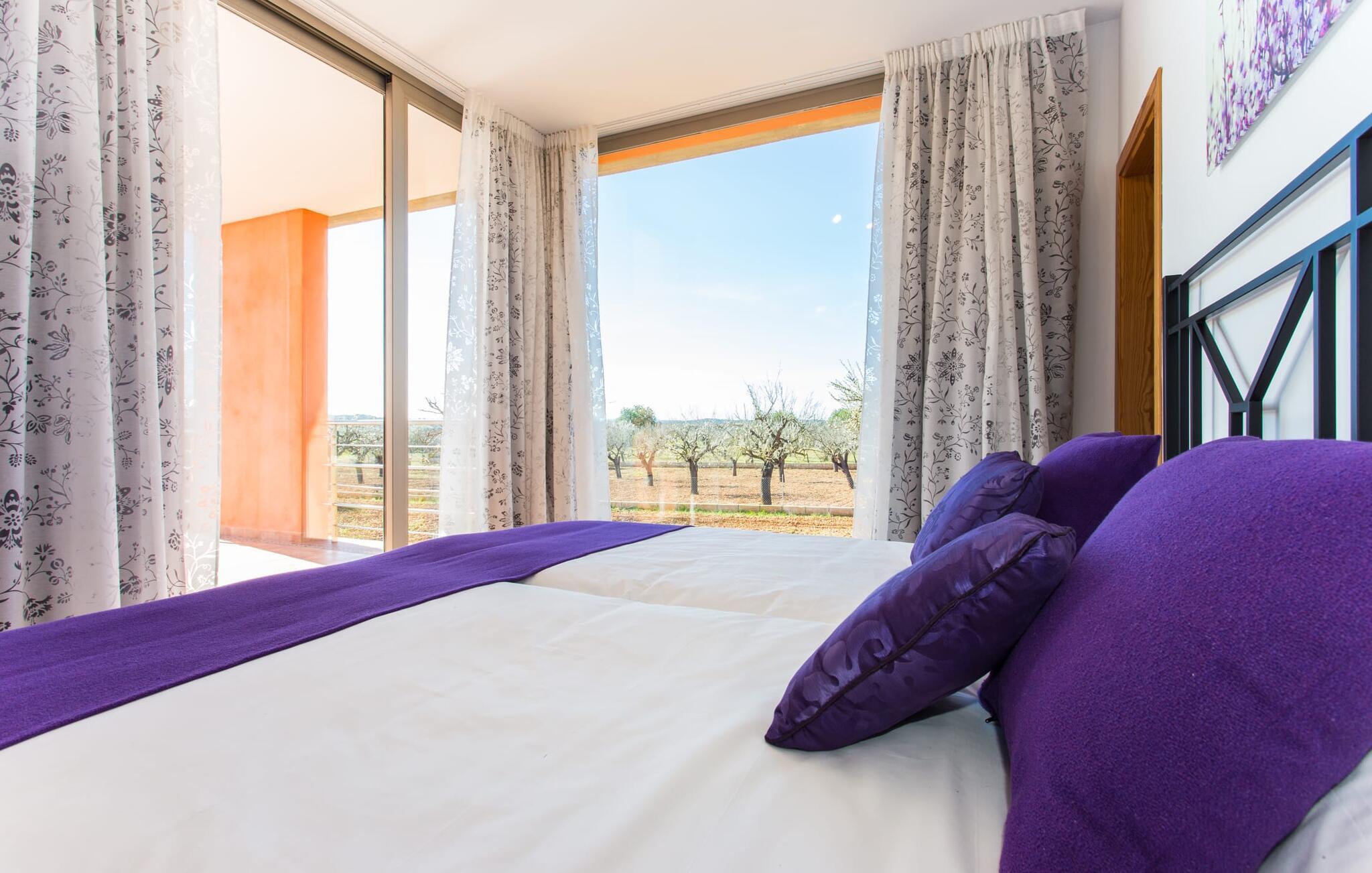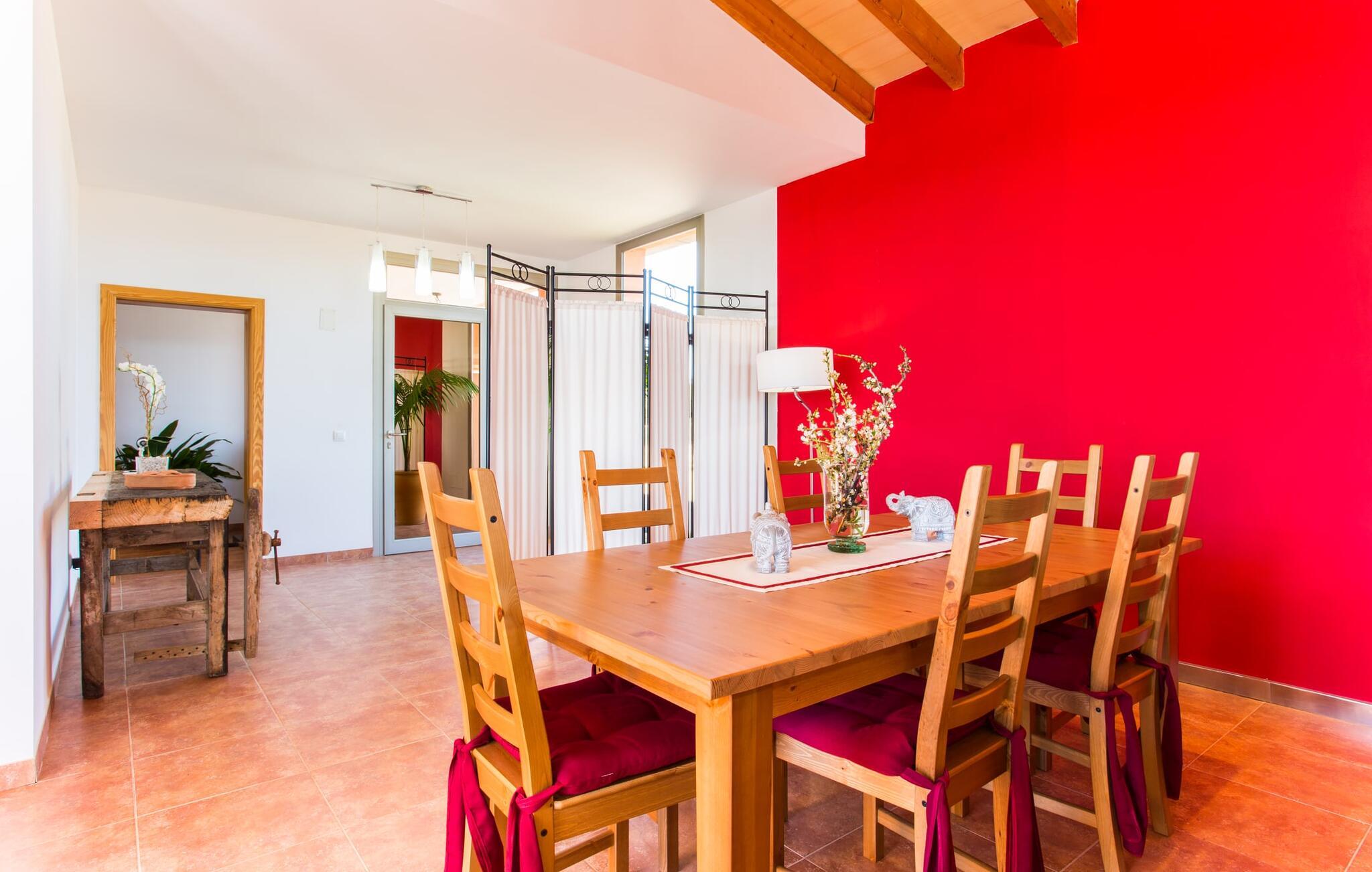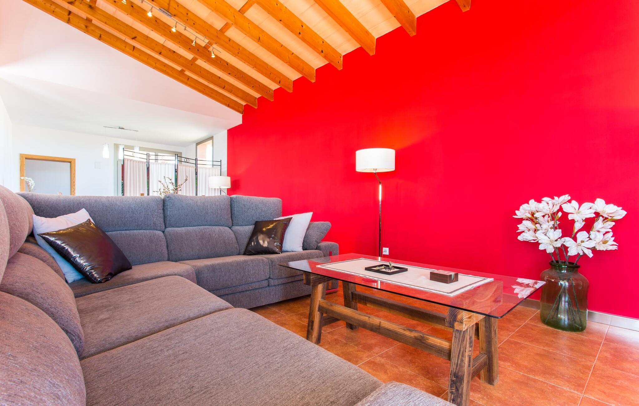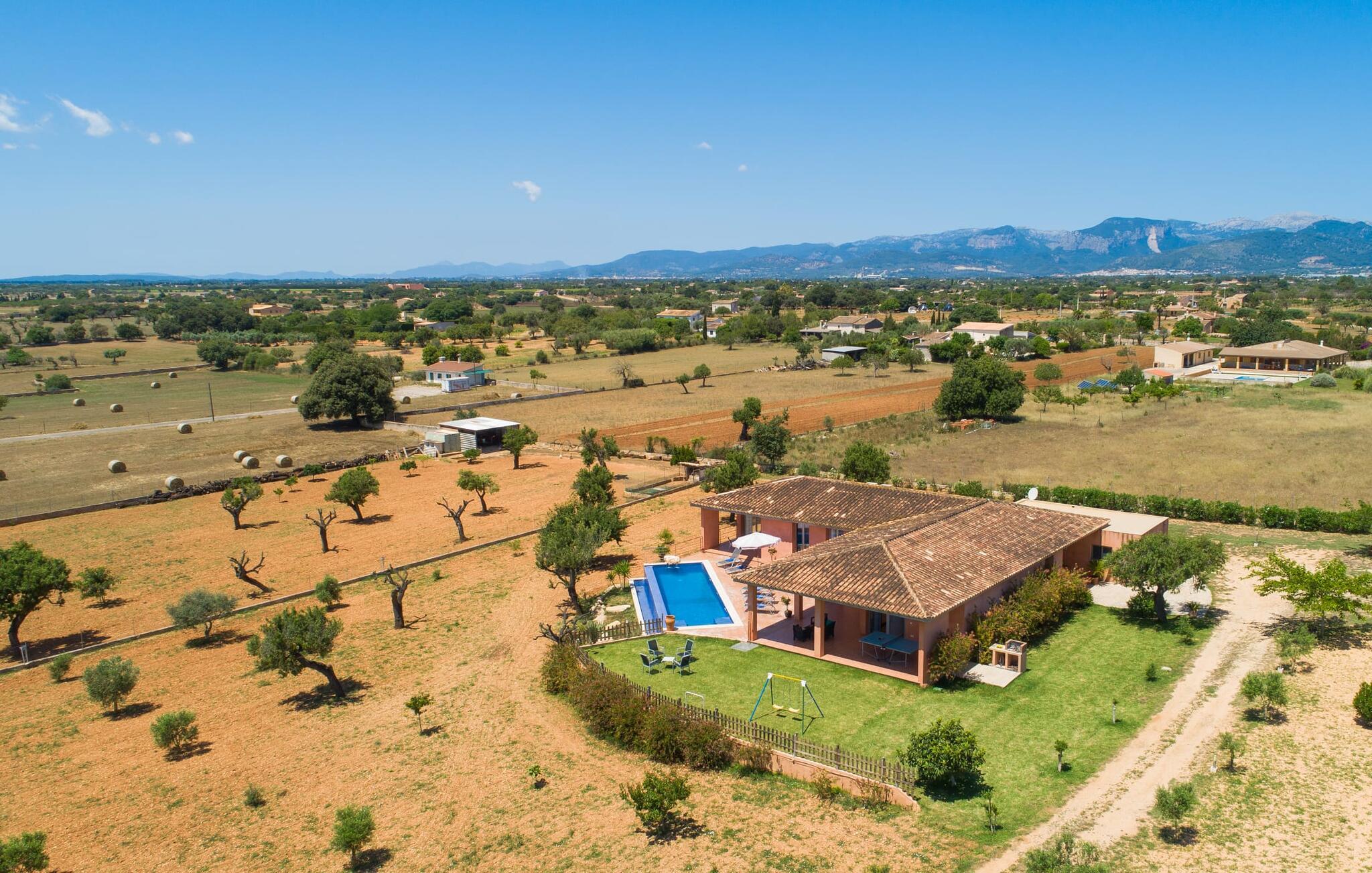 "Son Bordils Petit" har karakter af en ung, frugtig Prosecco frem for en langsomt modnet sen høst, som den dyrkes og sælges i den nærliggende "Ses Bordils"-vingård. Begge vil dog lige byde feinschmeckere, der værdsætter fordelene ved begge dele. Og denne villa har så meget at byde på, som vil fortrylle dig: dens smukke L-form med overdækkede terrasser, der fanger så meget lys - I kan se alt og alle her og bevæge jer med solen; infinity-poolen med dens komfortable trin og udsigt over mandeltræerne - I vil føle, at I blomstrer med dem, mens I svømmer runder; det lille grønne område med gynger - børn nyder deres egen legeplads; I er velkommen til at plukke frugt fra villaens figen-, blomme-, mispel- og abrikostræer, og friske æg er gratis - I vil ikke have for noget. Selvom ejendommen har "petit" i sit navn, er det eneste, der får det til at virke lille, de fjerne bjerge, der får det til at virke endnu mere betydningsfuldt. Et panorama at skåle for, med Coll-familiens prisvindende vin ved siden af... Der er også noget sprudlende over interiøret - hvis I ser rød, pink, blå og lilla, er det ikke fordi, I har haft lidt for meget til drikke. Den dristige brug af farve på individuelle vægge i stuen og soveværelset gør hvert værelse særpræget og suppleres smagfuldt af matchende billeder og møbler. Sådan ser livsstilen ud kombineret med livsglæde og fortjener bestemt navnet "Gran Reserva". Uanset hvilket soveværelse I vælger, kan I hoppe direkte ud af sengen ud i det fri og poolen - selvom der kan være skænderier om det ensuite badeværelse og walk-in closet! Det moderne, kompakte køkken med gulv-til-loft glasdøre udstråler kvalitet og lader intet tilbage at ønske; Med blot et par enkle trin kan I forvandle jeres indendørs og udendørs rum til jeres egen vinbar og bistro, der holder åbent til langt ud på natten. Og når det bliver varmt – hvad med et forfriskende brusebad? Eller, hvis I foretrækker det, et langt, afslappende bad i et badekar med levende lys? Da der er tre badeværelser, kan I sagtens tillade jer at indtage det ene i en periode. Mallorcas centrum inviterer jer til at finde jeres naturlige balance! By og land, centralt beliggende, men stadig lidt væk fra alfarvej - den tætte nærhed til Ma-3240 til Sineu (hørbar uden for villaen) betyder, at I kan være på farten næsten med det samme. Derfra er det kun 7 minutters kørsel nordpå til Inca, en af øens livlige hovedbyer. Traditionelle kældertaverner som Celler Can Amer på Carrer de la Pau byder på et udpluk af regionens specialiteter, og I kan ofte finde et kup i de mange læderværksteder. Eller se over skuldrene på skomagerne i det nærliggende Lloseta, og forkæl jer selv med et par Bestard-bjergstøvler til en vandretur i Serra de Tramuntana-bjergene. Når I rejser gennem en region fuld af vindmøller mod Sineu og Costitx, vil I finde andre traditionelle attraktioner som det populære ugentlige marked (med middelalderlige omgivelser), det eneste observatorium på Mallorca og mange kulinariske overraskelser. Og selvfølgelig god vin lagret under den spanske sol... Med sin bjergrige kulisse, der passer til et filmsæt, sine vinstokke og frugttræer, bekvemt placeret mellem byen Inca - berømt for sit læder - og landlige Costitx i hjertet. -etagers, moderne villa "Son Bordils Petit" med en vidunderlig pool og stor grund venter jer på øen. På den ene side er der endeløse timers shopping, på den anden side venter vindmøller, et observatorium og øens historie på at forføre jer. Havet er heller ikke langt væk: I finder smukke strande inden for en radius af 30 km.