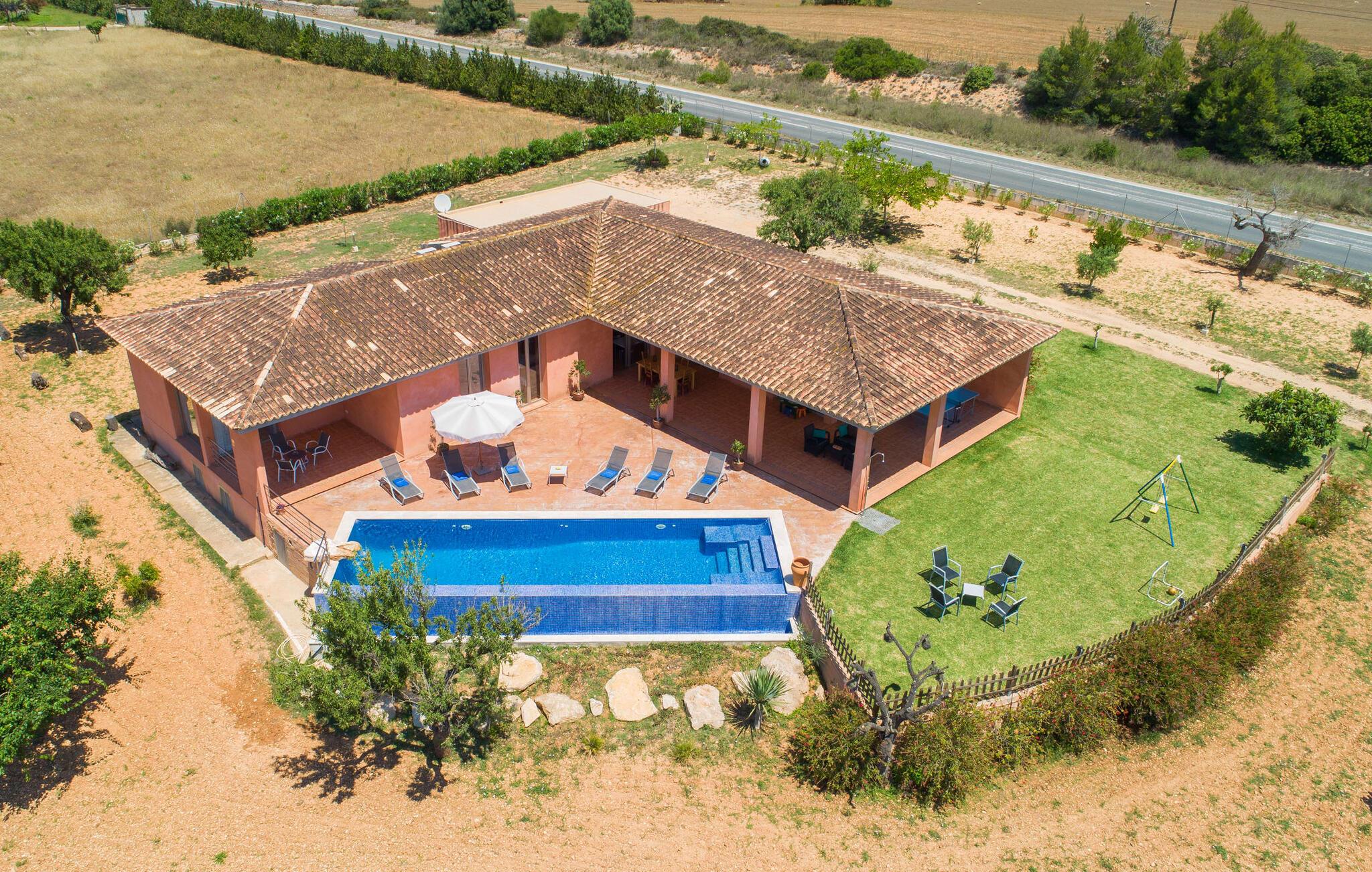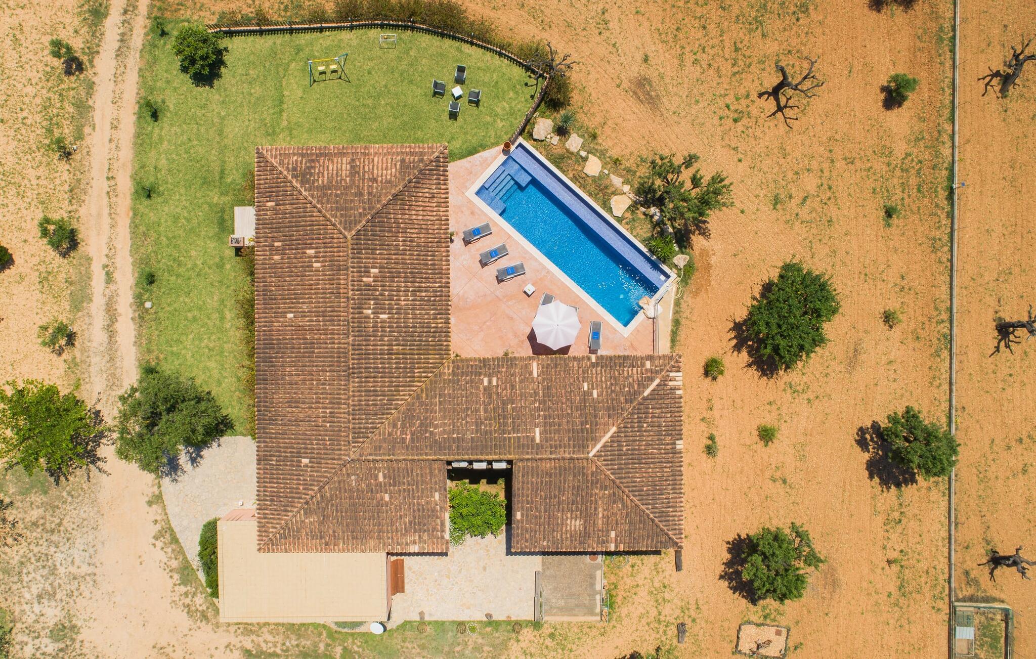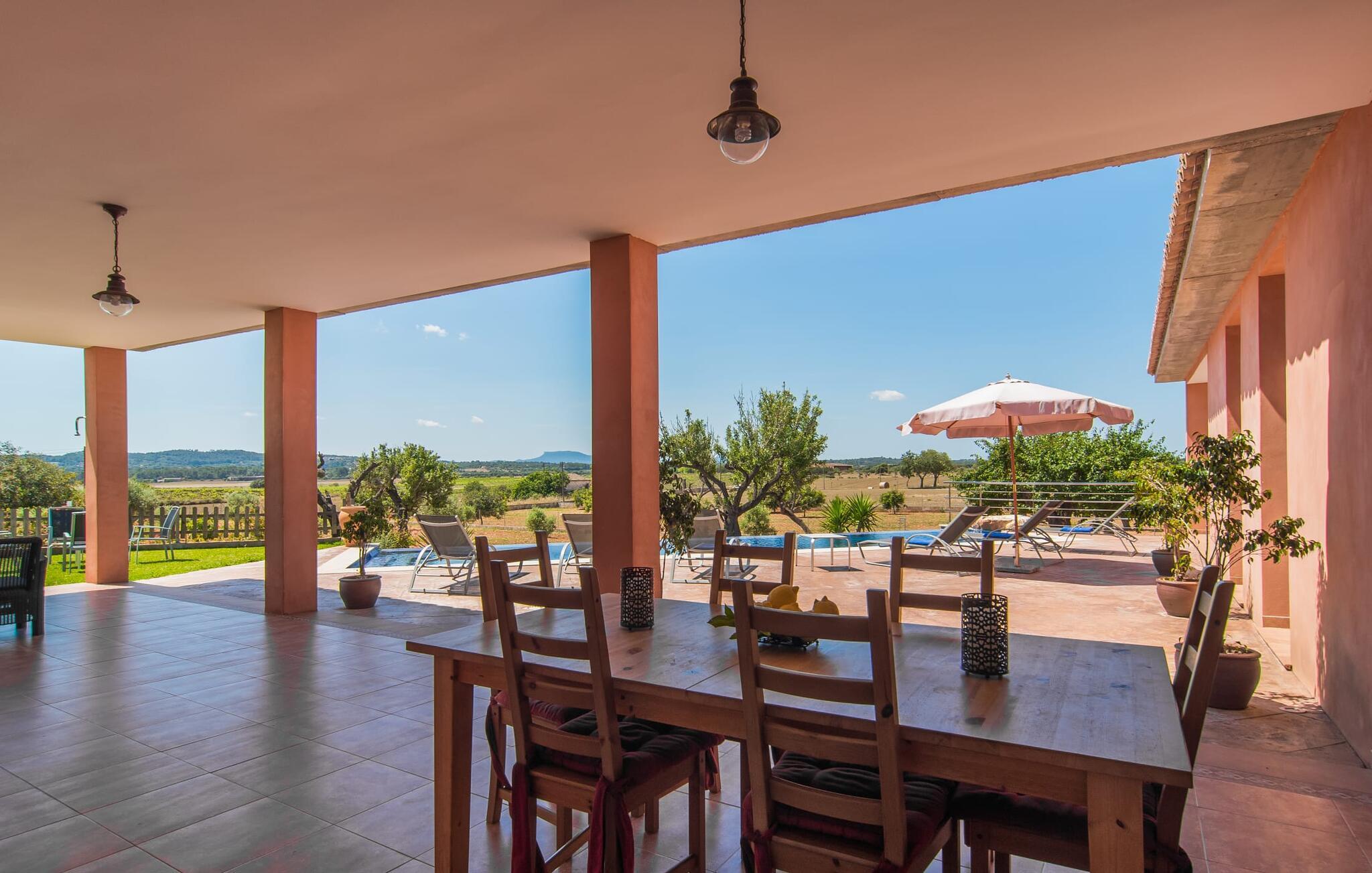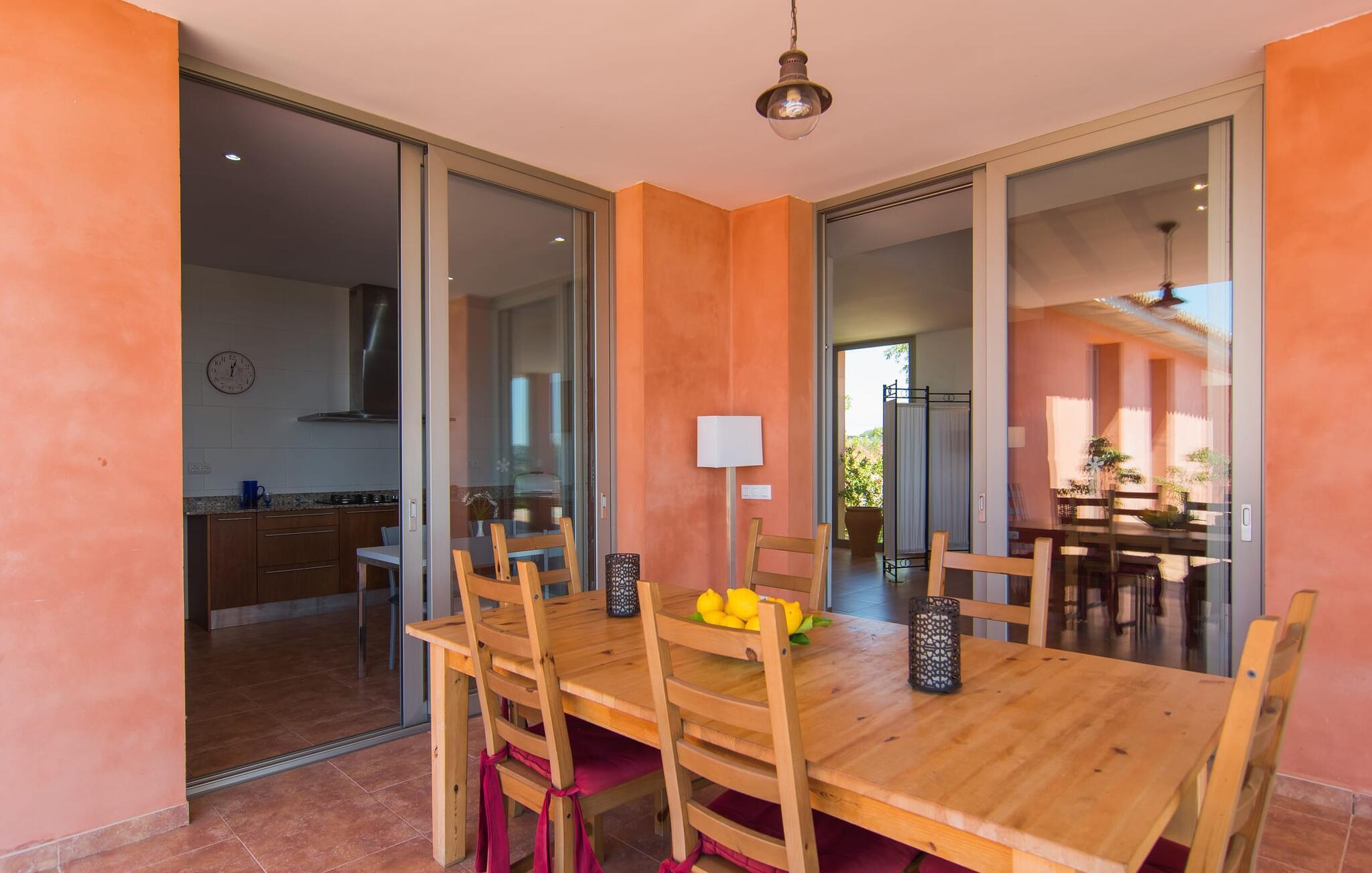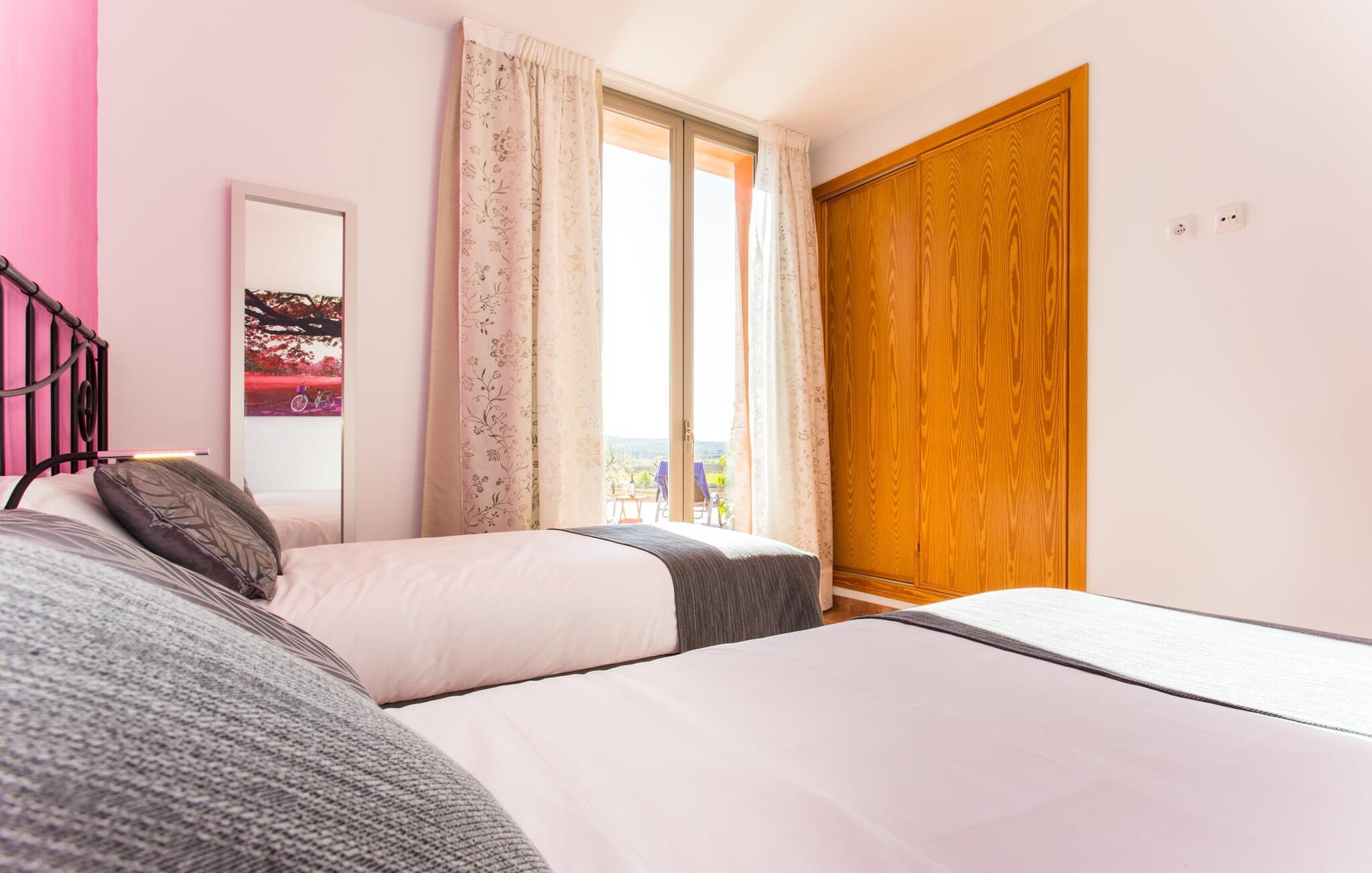 "Son Bordils Petit" har karakter af en ung, frugtig Prosecco frem for en langsomt modnet sen høst, som den dyrkes og sælges i den nærliggende "Ses Bordils"-vingård. Begge vil dog lige byde feinschmeckere, der værdsætter fordelene ved begge dele. Og denne villa har så meget at byde på, som vil fortrylle dig: dens smukke L-form med overdækkede terrasser, der fanger så meget lys - I kan se alt og alle her og bevæge jer med solen; infinity-poolen med dens komfortable trin og udsigt over mandeltræerne - I vil føle, at I blomstrer med dem, mens I svømmer runder; det lille grønne område med gynger - børn nyder deres egen legeplads; I er velkommen til at plukke frugt fra villaens figen-, blomme-, mispel- og abrikostræer, og friske æg er gratis - I vil ikke have for noget. Selvom ejendommen har "petit" i sit navn, er det eneste, der får det til at virke lille, de fjerne bjerge, der får det til at virke endnu mere betydningsfuldt. Et panorama at skåle for, med Coll-familiens prisvindende vin ved siden af... Der er også noget sprudlende over interiøret - hvis I ser rød, pink, blå og lilla, er det ikke fordi, I har haft lidt for meget til drikke. Den dristige brug af farve på individuelle vægge i stuen og soveværelset gør hvert værelse særpræget og suppleres smagfuldt af matchende billeder og møbler. Sådan ser livsstilen ud kombineret med livsglæde og fortjener bestemt navnet "Gran Reserva". Uanset hvilket soveværelse I vælger, kan I hoppe direkte ud af sengen ud i det fri og poolen - selvom der kan være skænderier om det ensuite badeværelse og walk-in closet! Det moderne, kompakte køkken med gulv-til-loft glasdøre udstråler kvalitet og lader intet tilbage at ønske; Med blot et par enkle trin kan I forvandle jeres indendørs og udendørs rum til jeres egen vinbar og bistro, der holder åbent til langt ud på natten. Og når det bliver varmt – hvad med et forfriskende brusebad? Eller, hvis I foretrækker det, et langt, afslappende bad i et badekar med levende lys? Da der er tre badeværelser, kan I sagtens tillade jer at indtage det ene i en periode. Mallorcas centrum inviterer jer til at finde jeres naturlige balance! By og land, centralt beliggende, men stadig lidt væk fra alfarvej - den tætte nærhed til Ma-3240 til Sineu (hørbar uden for villaen) betyder, at I kan være på farten næsten med det samme. Derfra er det kun 7 minutters kørsel nordpå til Inca, en af øens livlige hovedbyer. Traditionelle kældertaverner som Celler Can Amer på Carrer de la Pau byder på et udpluk af regionens specialiteter, og I kan ofte finde et kup i de mange læderværksteder. Eller se over skuldrene på skomagerne i det nærliggende Lloseta, og forkæl jer selv med et par Bestard-bjergstøvler til en vandretur i Serra de Tramuntana-bjergene. Når I rejser gennem en region fuld af vindmøller mod Sineu og Costitx, vil I finde andre traditionelle attraktioner som det populære ugentlige marked (med middelalderlige omgivelser), det eneste observatorium på Mallorca og mange kulinariske overraskelser. Og selvfølgelig god vin lagret under den spanske sol... Med sin bjergrige kulisse, der passer til et filmsæt, sine vinstokke og frugttræer, bekvemt placeret mellem byen Inca - berømt for sit læder - og landlige Costitx i hjertet. -etagers, moderne villa "Son Bordils Petit" med en vidunderlig pool og stor grund venter jer på øen. På den ene side er der endeløse timers shopping, på den anden side venter vindmøller, et observatorium og øens historie på at forføre jer. Havet er heller ikke langt væk: I finder smukke strande inden for en radius af 30 km.
