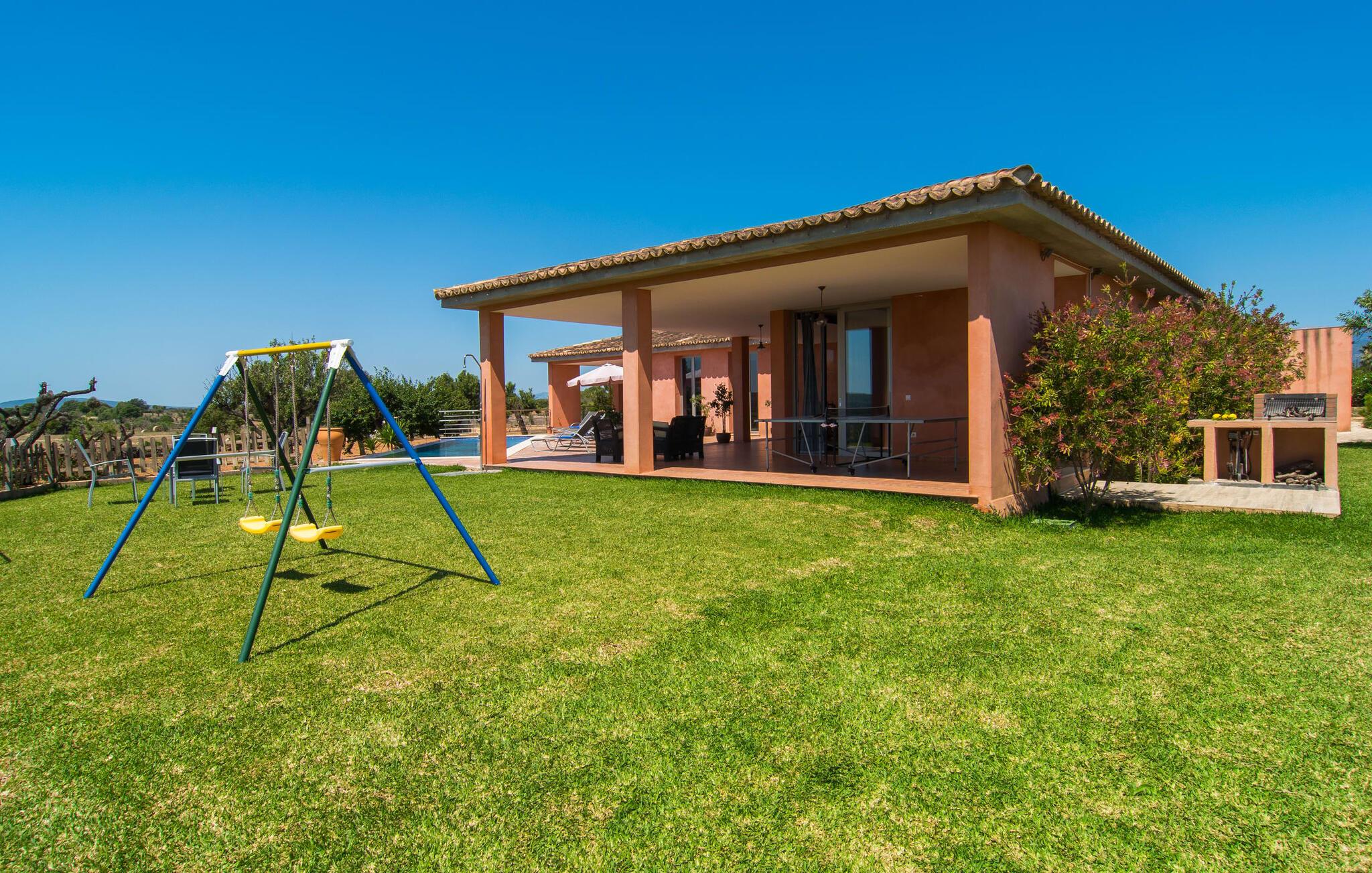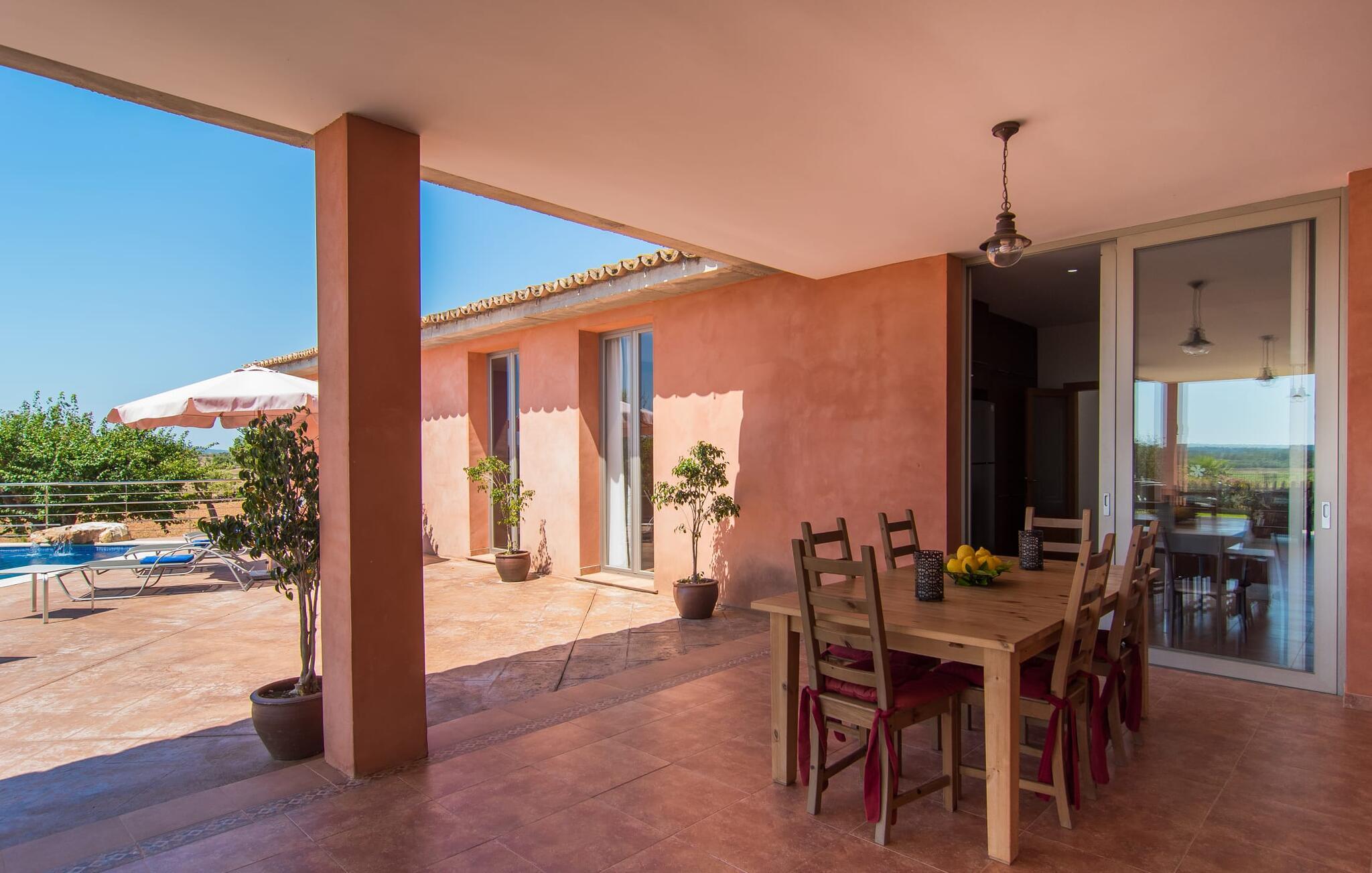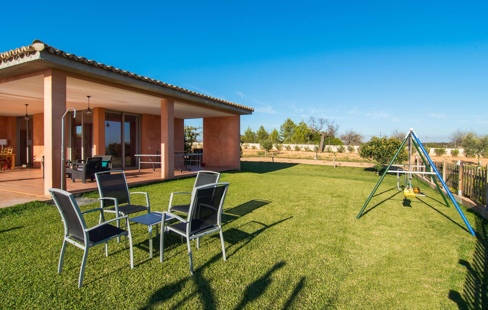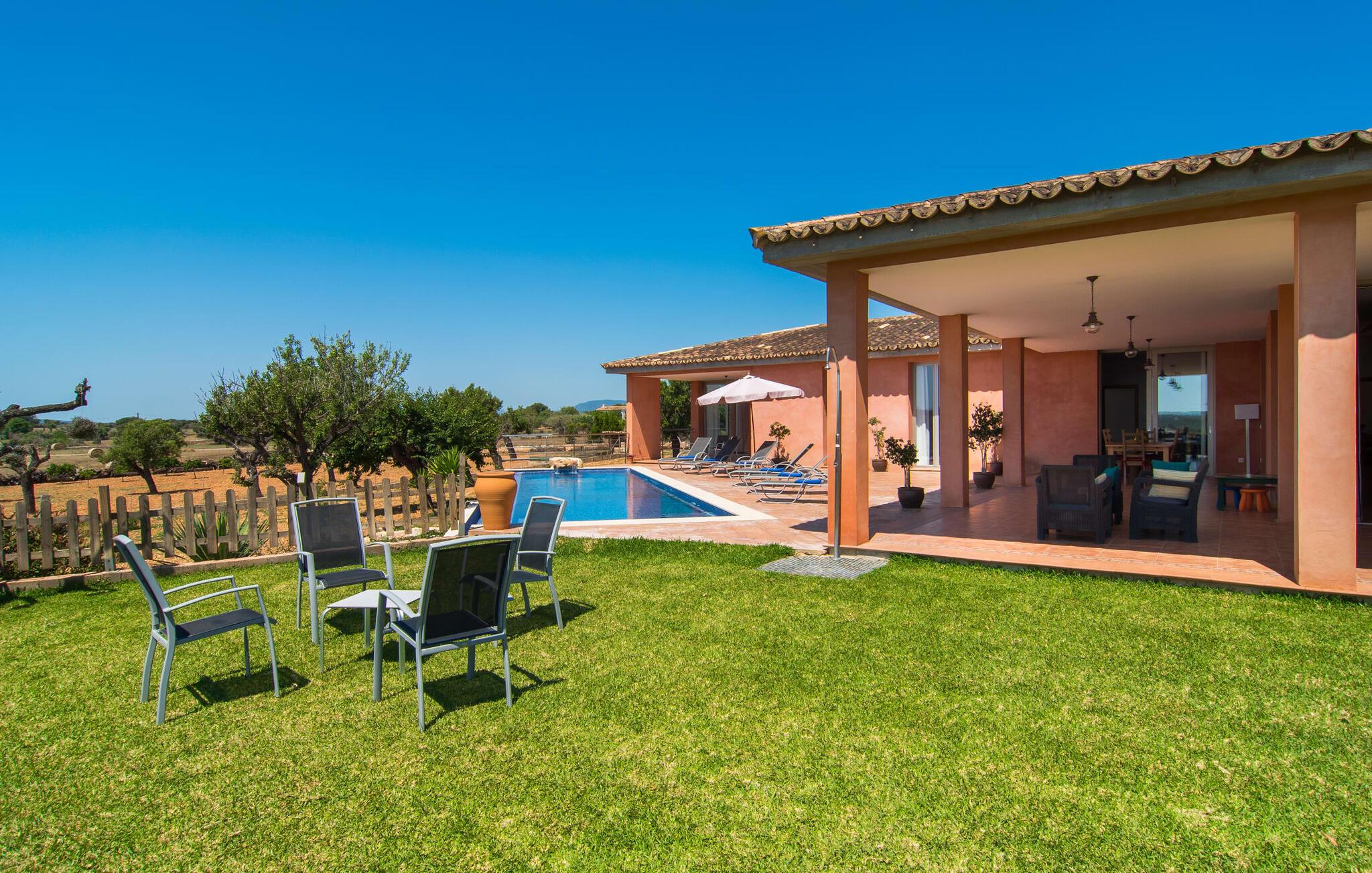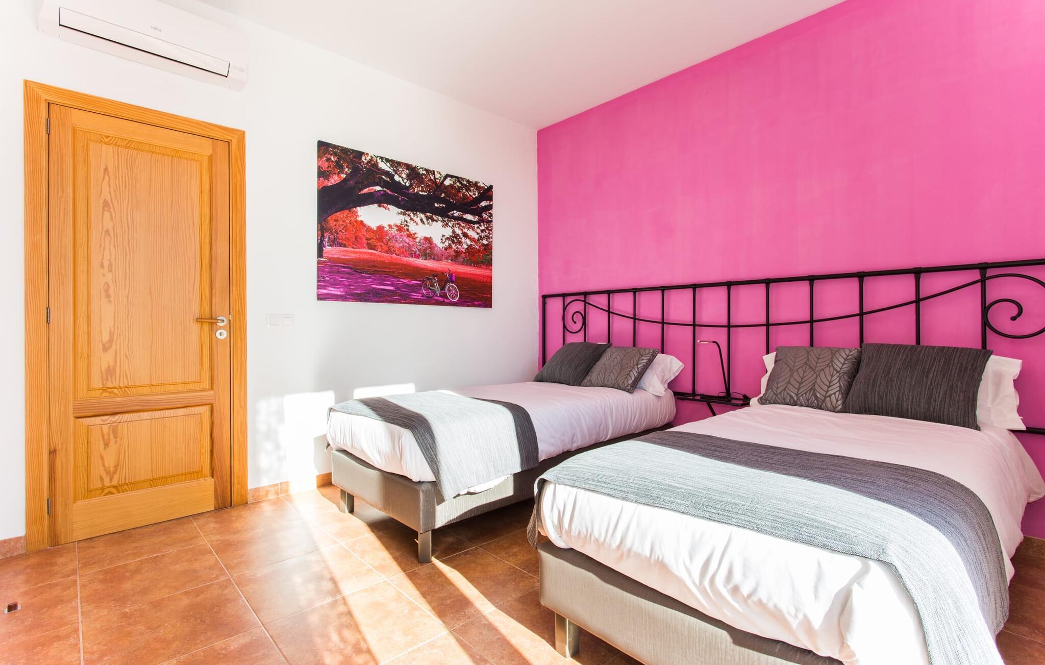 "Son Bordils Petit" har karakter af en ung, frugtig Prosecco frem for en langsomt modnet sen høst, som den dyrkes og sælges i den nærliggende "Ses Bordils"-vingård. Begge vil dog lige byde feinschmeckere, der værdsætter fordelene ved begge dele. Og denne villa har så meget at byde på, som vil fortrylle dig: dens smukke L-form med overdækkede terrasser, der fanger så meget lys - I kan se alt og alle her og bevæge jer med solen; infinity-poolen med dens komfortable trin og udsigt over mandeltræerne - I vil føle, at I blomstrer med dem, mens I svømmer runder; det lille grønne område med gynger - børn nyder deres egen legeplads; I er velkommen til at plukke frugt fra villaens figen-, blomme-, mispel- og abrikostræer, og friske æg er gratis - I vil ikke have for noget. Selvom ejendommen har "petit" i sit navn, er det eneste, der får det til at virke lille, de fjerne bjerge, der får det til at virke endnu mere betydningsfuldt. Et panorama at skåle for, med Coll-familiens prisvindende vin ved siden af... Der er også noget sprudlende over interiøret - hvis I ser rød, pink, blå og lilla, er det ikke fordi, I har haft lidt for meget til drikke. Den dristige brug af farve på individuelle vægge i stuen og soveværelset gør hvert værelse særpræget og suppleres smagfuldt af matchende billeder og møbler. Sådan ser livsstilen ud kombineret med livsglæde og fortjener bestemt navnet "Gran Reserva". Uanset hvilket soveværelse I vælger, kan I hoppe direkte ud af sengen ud i det fri og poolen - selvom der kan være skænderier om det ensuite badeværelse og walk-in closet! Det moderne, kompakte køkken med gulv-til-loft glasdøre udstråler kvalitet og lader intet tilbage at ønske; Med blot et par enkle trin kan I forvandle jeres indendørs og udendørs rum til jeres egen vinbar og bistro, der holder åbent til langt ud på natten. Og når det bliver varmt – hvad med et forfriskende brusebad? Eller, hvis I foretrækker det, et langt, afslappende bad i et badekar med levende lys? Da der er tre badeværelser, kan I sagtens tillade jer at indtage det ene i en periode. Mallorcas centrum inviterer jer til at finde jeres naturlige balance! By og land, centralt beliggende, men stadig lidt væk fra alfarvej - den tætte nærhed til Ma-3240 til Sineu (hørbar uden for villaen) betyder, at I kan være på farten næsten med det samme. Derfra er det kun 7 minutters kørsel nordpå til Inca, en af øens livlige hovedbyer. Traditionelle kældertaverner som Celler Can Amer på Carrer de la Pau byder på et udpluk af regionens specialiteter, og I kan ofte finde et kup i de mange læderværksteder. Eller se over skuldrene på skomagerne i det nærliggende Lloseta, og forkæl jer selv med et par Bestard-bjergstøvler til en vandretur i Serra de Tramuntana-bjergene. Når I rejser gennem en region fuld af vindmøller mod Sineu og Costitx, vil I finde andre traditionelle attraktioner som det populære ugentlige marked (med middelalderlige omgivelser), det eneste observatorium på Mallorca og mange kulinariske overraskelser. Og selvfølgelig god vin lagret under den spanske sol... Med sin bjergrige kulisse, der passer til et filmsæt, sine vinstokke og frugttræer, bekvemt placeret mellem byen Inca - berømt for sit læder - og landlige Costitx i hjertet. -etagers, moderne villa "Son Bordils Petit" med en vidunderlig pool og stor grund venter jer på øen. På den ene side er der endeløse timers shopping, på den anden side venter vindmøller, et observatorium og øens historie på at forføre jer. Havet er heller ikke langt væk: I finder smukke strande inden for en radius af 30 km.