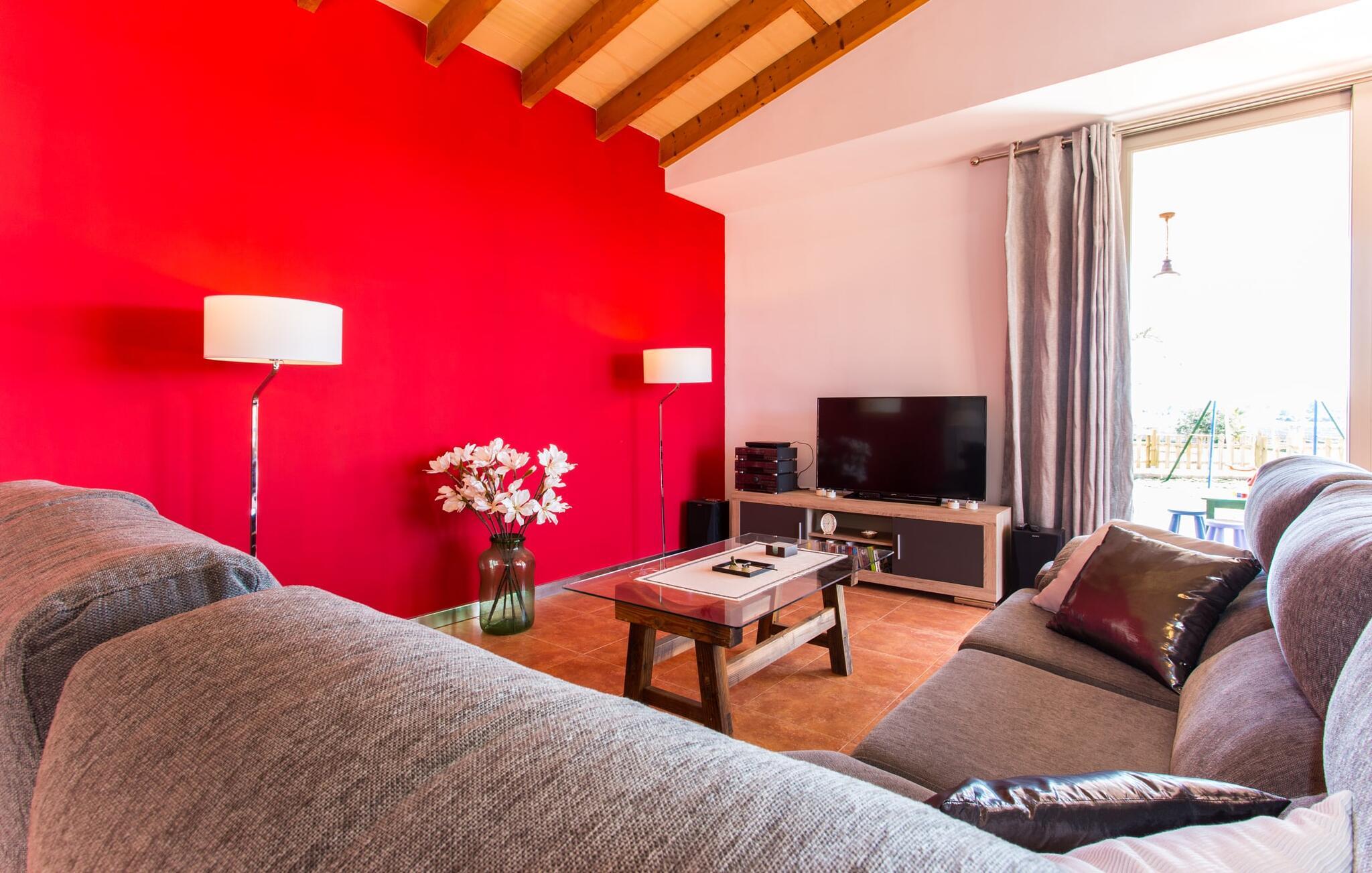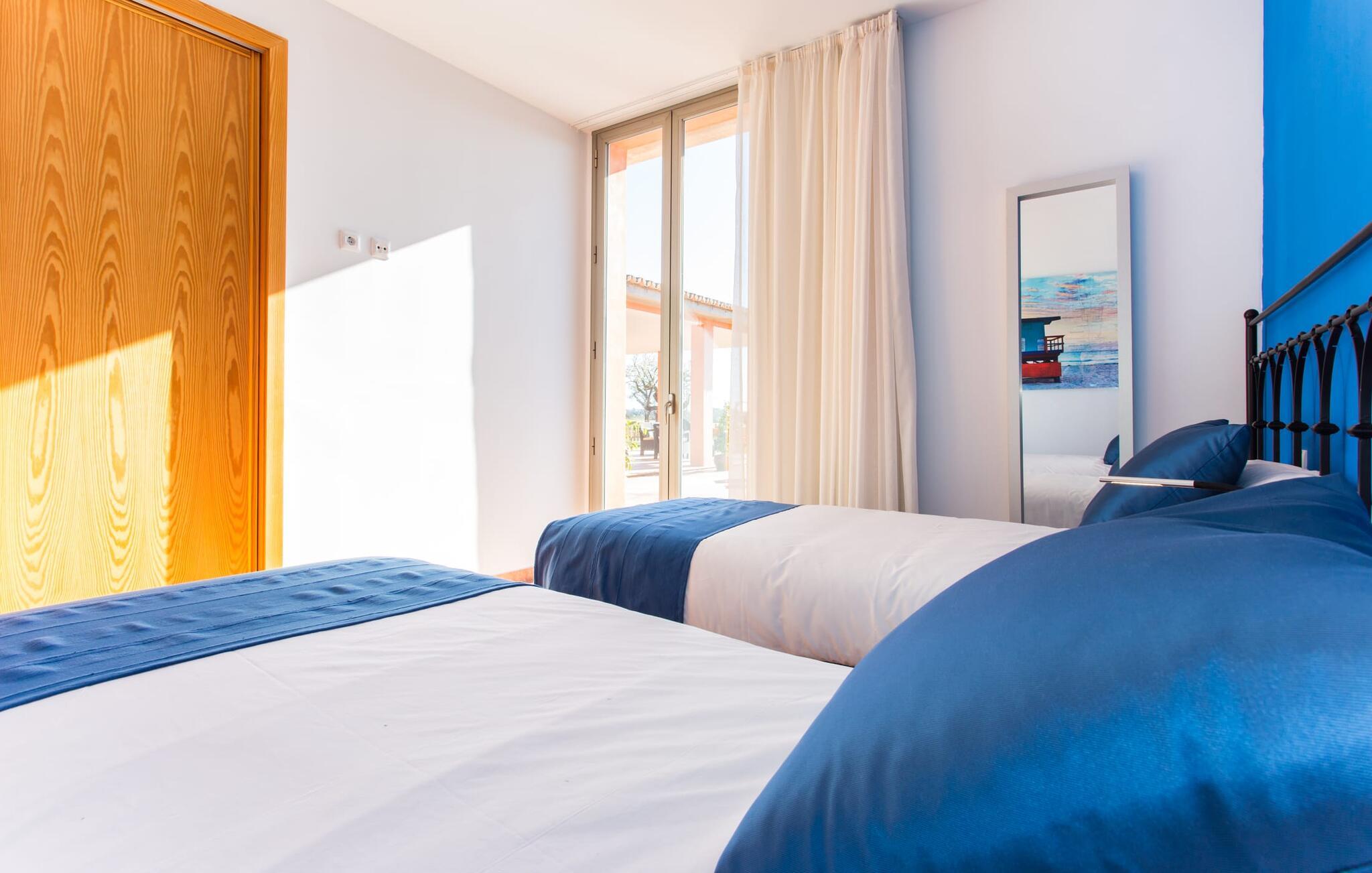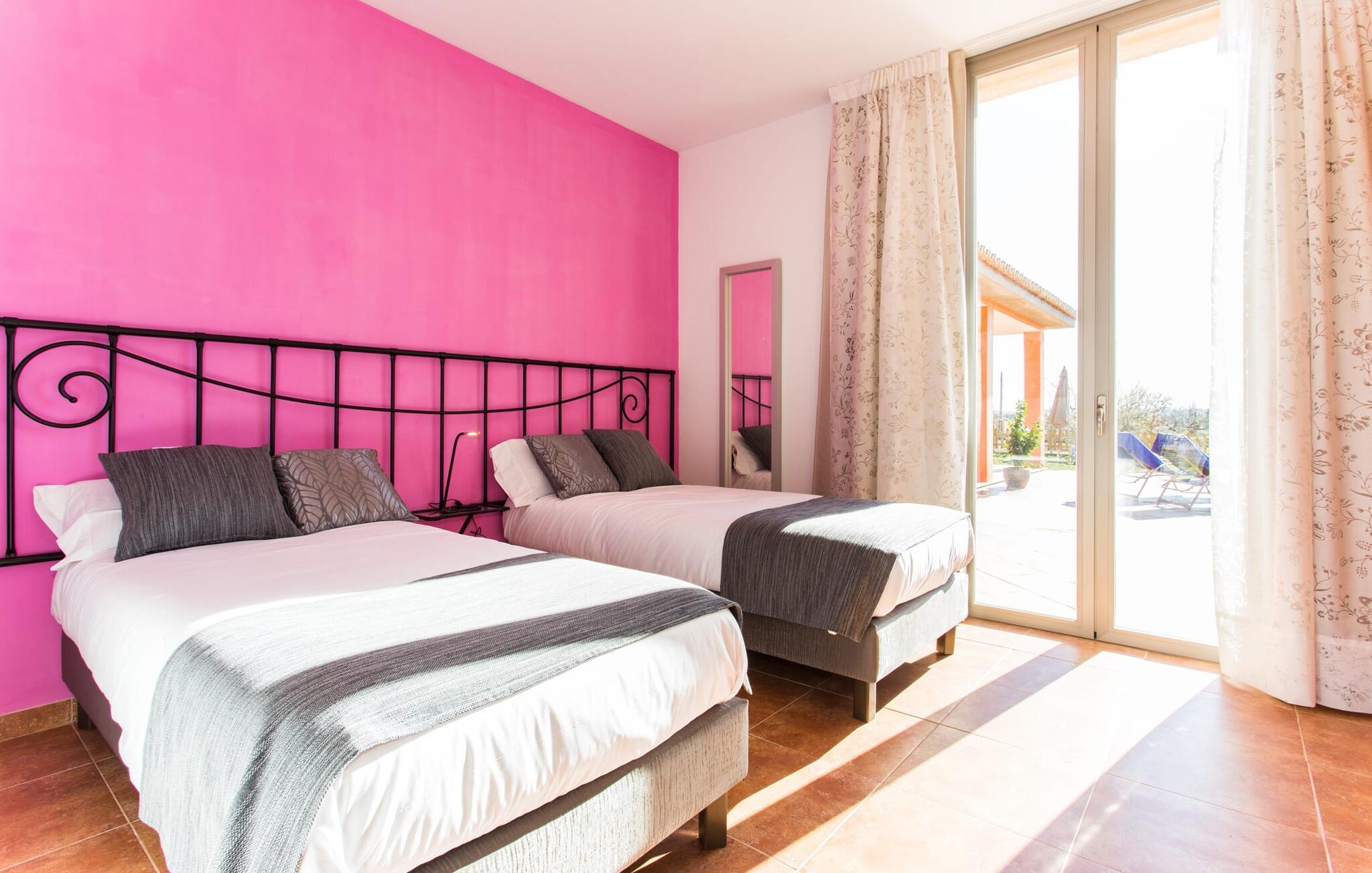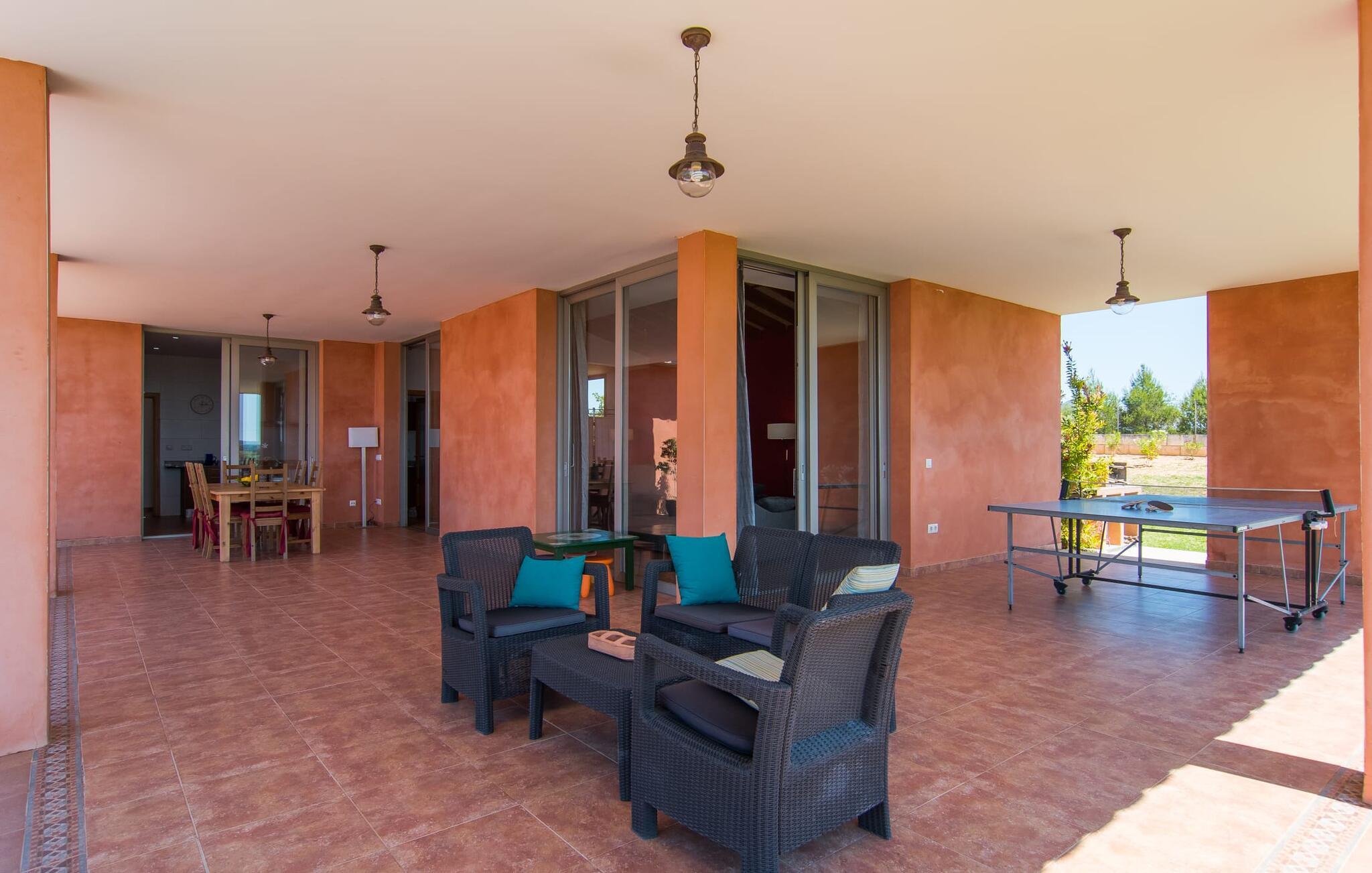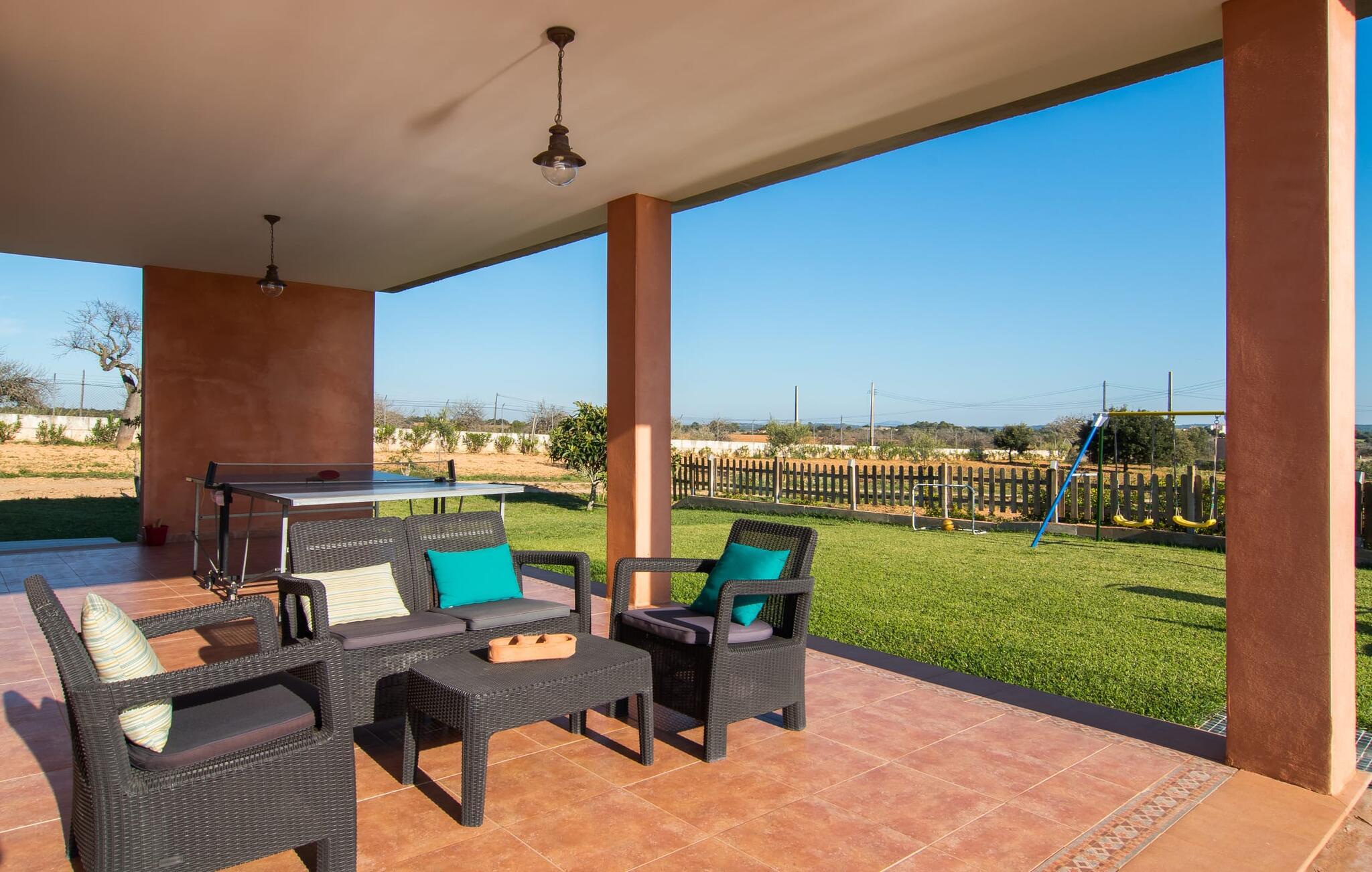 "Son Bordils Petit" har karakter af en ung, frugtig Prosecco frem for en langsomt modnet sen høst, som den dyrkes og sælges i den nærliggende "Ses Bordils"-vingård. Begge vil dog lige byde feinschmeckere, der værdsætter fordelene ved begge dele. Og denne villa har så meget at byde på, som vil fortrylle dig: dens smukke L-form med overdækkede terrasser, der fanger så meget lys - I kan se alt og alle her og bevæge jer med solen; infinity-poolen med dens komfortable trin og udsigt over mandeltræerne - I vil føle, at I blomstrer med dem, mens I svømmer runder; det lille grønne område med gynger - børn nyder deres egen legeplads; I er velkommen til at plukke frugt fra villaens figen-, blomme-, mispel- og abrikostræer, og friske æg er gratis - I vil ikke have for noget. Selvom ejendommen har "petit" i sit navn, er det eneste, der får det til at virke lille, de fjerne bjerge, der får det til at virke endnu mere betydningsfuldt. Et panorama at skåle for, med Coll-familiens prisvindende vin ved siden af... Der er også noget sprudlende over interiøret - hvis I ser rød, pink, blå og lilla, er det ikke fordi, I har haft lidt for meget til drikke. Den dristige brug af farve på individuelle vægge i stuen og soveværelset gør hvert værelse særpræget og suppleres smagfuldt af matchende billeder og møbler. Sådan ser livsstilen ud kombineret med livsglæde og fortjener bestemt navnet "Gran Reserva". Uanset hvilket soveværelse I vælger, kan I hoppe direkte ud af sengen ud i det fri og poolen - selvom der kan være skænderier om det ensuite badeværelse og walk-in closet! Det moderne, kompakte køkken med gulv-til-loft glasdøre udstråler kvalitet og lader intet tilbage at ønske; Med blot et par enkle trin kan I forvandle jeres indendørs og udendørs rum til jeres egen vinbar og bistro, der holder åbent til langt ud på natten. Og når det bliver varmt – hvad med et forfriskende brusebad? Eller, hvis I foretrækker det, et langt, afslappende bad i et badekar med levende lys? Da der er tre badeværelser, kan I sagtens tillade jer at indtage det ene i en periode. Mallorcas centrum inviterer jer til at finde jeres naturlige balance! By og land, centralt beliggende, men stadig lidt væk fra alfarvej - den tætte nærhed til Ma-3240 til Sineu (hørbar uden for villaen) betyder, at I kan være på farten næsten med det samme. Derfra er det kun 7 minutters kørsel nordpå til Inca, en af øens livlige hovedbyer. Traditionelle kældertaverner som Celler Can Amer på Carrer de la Pau byder på et udpluk af regionens specialiteter, og I kan ofte finde et kup i de mange læderværksteder. Eller se over skuldrene på skomagerne i det nærliggende Lloseta, og forkæl jer selv med et par Bestard-bjergstøvler til en vandretur i Serra de Tramuntana-bjergene. Når I rejser gennem en region fuld af vindmøller mod Sineu og Costitx, vil I finde andre traditionelle attraktioner som det populære ugentlige marked (med middelalderlige omgivelser), det eneste observatorium på Mallorca og mange kulinariske overraskelser. Og selvfølgelig god vin lagret under den spanske sol... Med sin bjergrige kulisse, der passer til et filmsæt, sine vinstokke og frugttræer, bekvemt placeret mellem byen Inca - berømt for sit læder - og landlige Costitx i hjertet. -etagers, moderne villa "Son Bordils Petit" med en vidunderlig pool og stor grund venter jer på øen. På den ene side er der endeløse timers shopping, på den anden side venter vindmøller, et observatorium og øens historie på at forføre jer. Havet er heller ikke langt væk: I finder smukke strande inden for en radius af 30 km.
