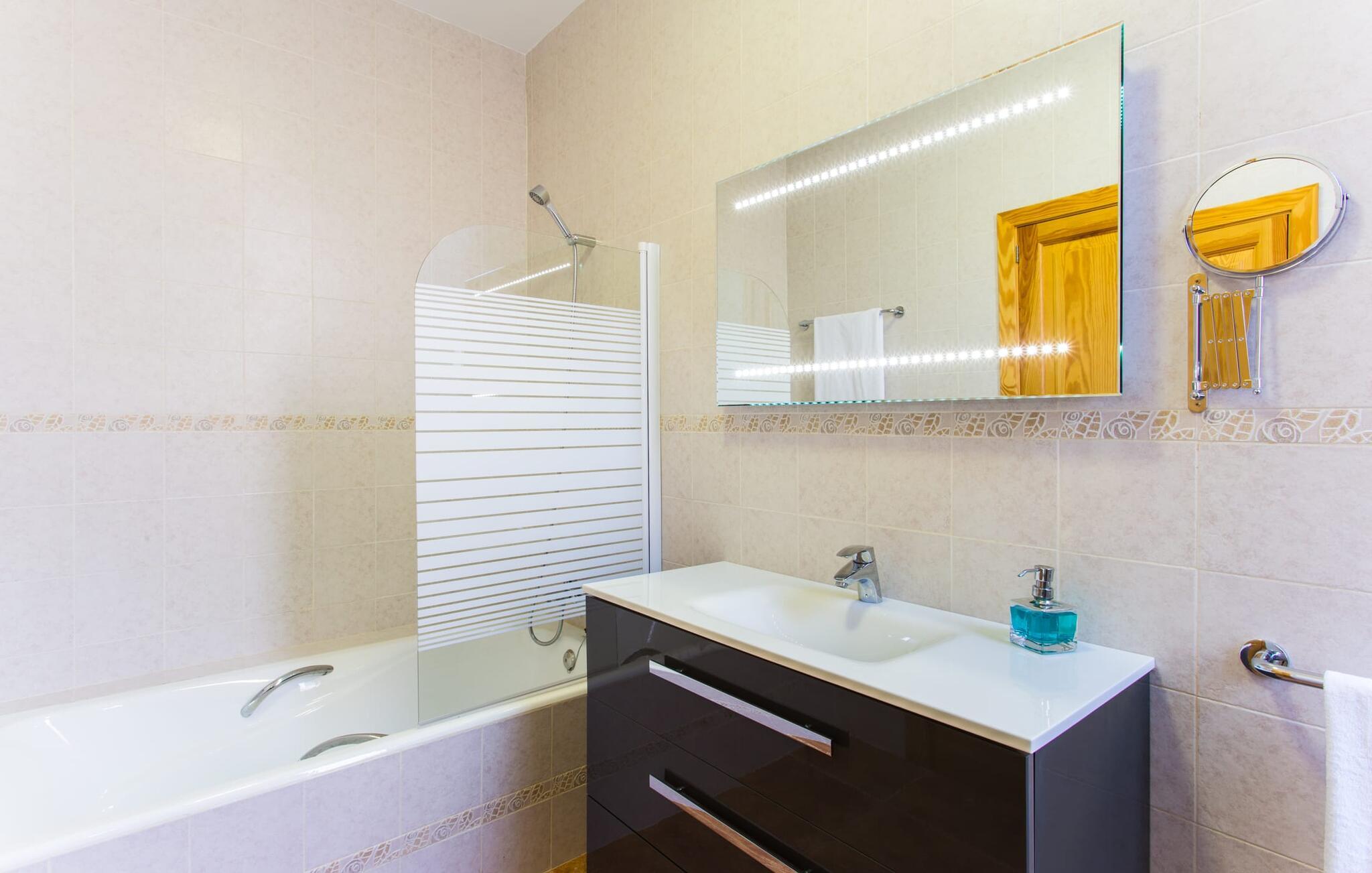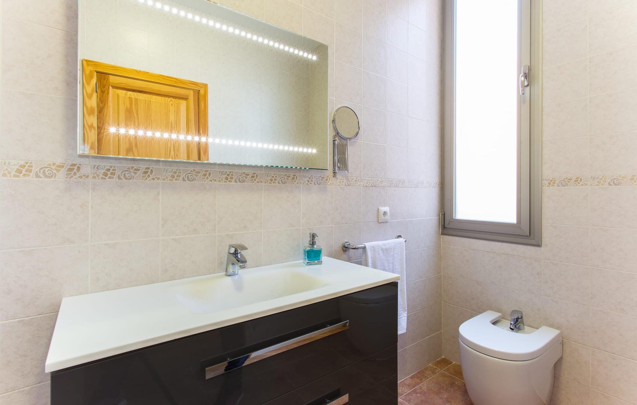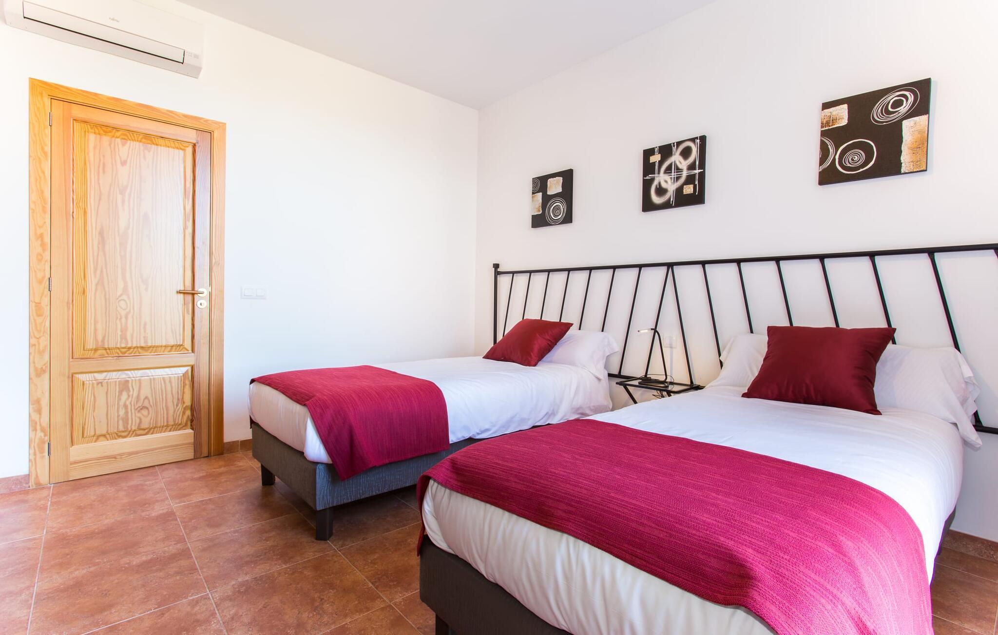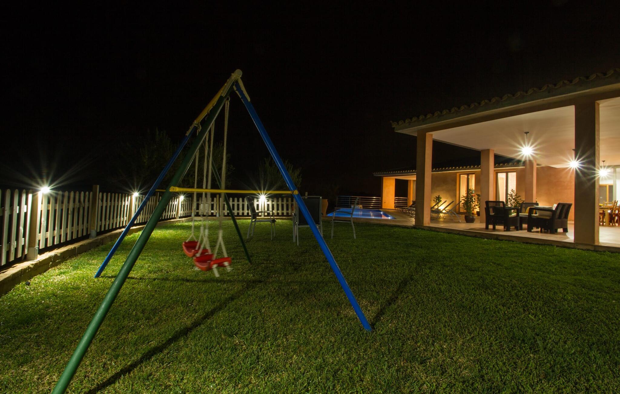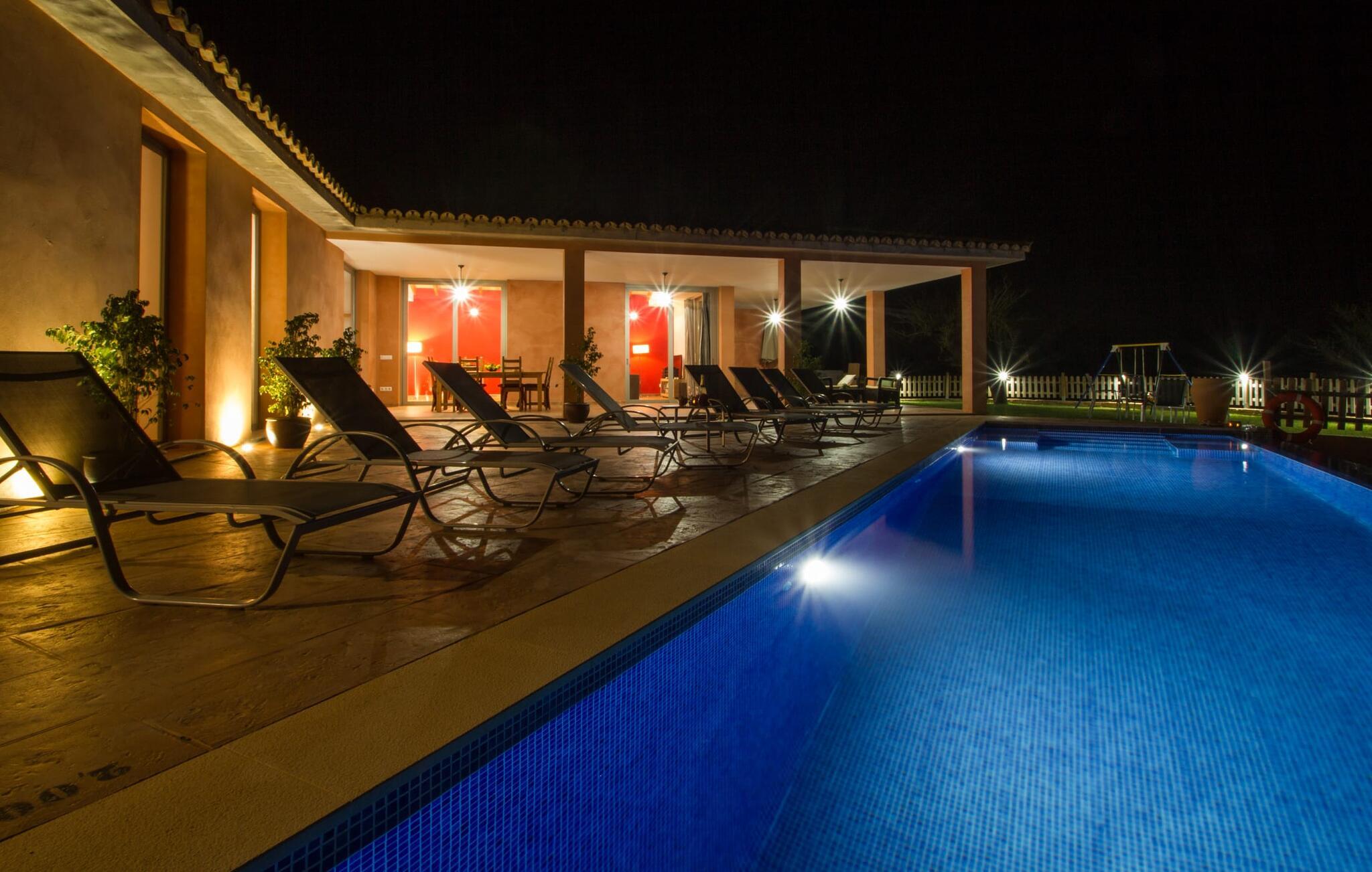"Son Bordils Petit" har karakter af en ung, frugtig Prosecco frem for en langsomt modnet sen høst, som den dyrkes og sælges i den nærliggende "Ses Bordils"-vingård. Begge vil dog lige byde feinschmeckere, der værdsætter fordelene ved begge dele. Og denne villa har så meget at byde på, som vil fortrylle dig: dens smukke L-form med overdækkede terrasser, der fanger så meget lys - I kan se alt og alle her og bevæge jer med solen; infinity-poolen med dens komfortable trin og udsigt over mandeltræerne - I vil føle, at I blomstrer med dem, mens I svømmer runder; det lille grønne område med gynger - børn nyder deres egen legeplads; I er velkommen til at plukke frugt fra villaens figen-, blomme-, mispel- og abrikostræer, og friske æg er gratis - I vil ikke have for noget. Selvom ejendommen har "petit" i sit navn, er det eneste, der får det til at virke lille, de fjerne bjerge, der får det til at virke endnu mere betydningsfuldt. Et panorama at skåle for, med Coll-familiens prisvindende vin ved siden af... Der er også noget sprudlende over interiøret - hvis I ser rød, pink, blå og lilla, er det ikke fordi, I har haft lidt for meget til drikke. Den dristige brug af farve på individuelle vægge i stuen og soveværelset gør hvert værelse særpræget og suppleres smagfuldt af matchende billeder og møbler. Sådan ser livsstilen ud kombineret med livsglæde og fortjener bestemt navnet "Gran Reserva". Uanset hvilket soveværelse I vælger, kan I hoppe direkte ud af sengen ud i det fri og poolen - selvom der kan være skænderier om det ensuite badeværelse og walk-in closet! Det moderne, kompakte køkken med gulv-til-loft glasdøre udstråler kvalitet og lader intet tilbage at ønske; Med blot et par enkle trin kan I forvandle jeres indendørs og udendørs rum til jeres egen vinbar og bistro, der holder åbent til langt ud på natten. Og når det bliver varmt – hvad med et forfriskende brusebad? Eller, hvis I foretrækker det, et langt, afslappende bad i et badekar med levende lys? Da der er tre badeværelser, kan I sagtens tillade jer at indtage det ene i en periode. Mallorcas centrum inviterer jer til at finde jeres naturlige balance! By og land, centralt beliggende, men stadig lidt væk fra alfarvej - den tætte nærhed til Ma-3240 til Sineu (hørbar uden for villaen) betyder, at I kan være på farten næsten med det samme. Derfra er det kun 7 minutters kørsel nordpå til Inca, en af øens livlige hovedbyer. Traditionelle kældertaverner som Celler Can Amer på Carrer de la Pau byder på et udpluk af regionens specialiteter, og I kan ofte finde et kup i de mange læderværksteder. Eller se over skuldrene på skomagerne i det nærliggende Lloseta, og forkæl jer selv med et par Bestard-bjergstøvler til en vandretur i Serra de Tramuntana-bjergene. Når I rejser gennem en region fuld af vindmøller mod Sineu og Costitx, vil I finde andre traditionelle attraktioner som det populære ugentlige marked (med middelalderlige omgivelser), det eneste observatorium på Mallorca og mange kulinariske overraskelser. Og selvfølgelig god vin lagret under den spanske sol... Med sin bjergrige kulisse, der passer til et filmsæt, sine vinstokke og frugttræer, bekvemt placeret mellem byen Inca - berømt for sit læder - og landlige Costitx i hjertet. -etagers, moderne villa "Son Bordils Petit" med en vidunderlig pool og stor grund venter jer på øen. På den ene side er der endeløse timers shopping, på den anden side venter vindmøller, et observatorium og øens historie på at forføre jer. Havet er heller ikke langt væk: I finder smukke strande inden for en radius af 30 km.