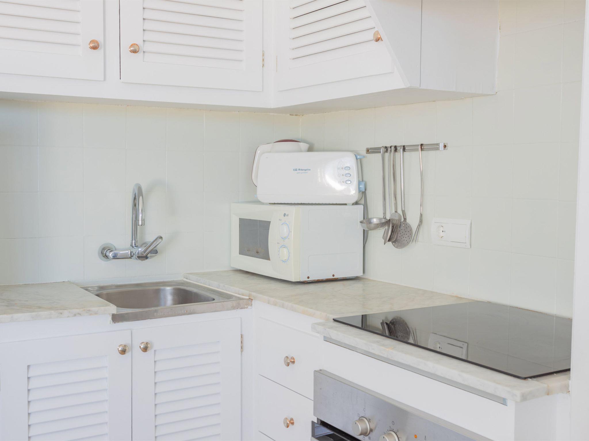 "Son Bou Gardens Plus", 3-room apartment 45 m2. Object suitable for 4 adults. Simple and cosy furnishings: living/dining room with digital TV. 1 double bedroom with 1 bed (150 cm, length 200 cm). 1 double bedroom with 2 beds (90 cm, length 200 cm). Kitchenette (4 hot plates, oven, toaster, microwave, freezer) with dining table. Shower/WC. Terrace furniture. View of the swimming pool, the garden and the countryside. Facilities: iron, children's high chair, baby cot for up to 2 year olds, hair dryer. Internet (WiFi, free). Please note: suitable for families. Non-smokers only. APM1880