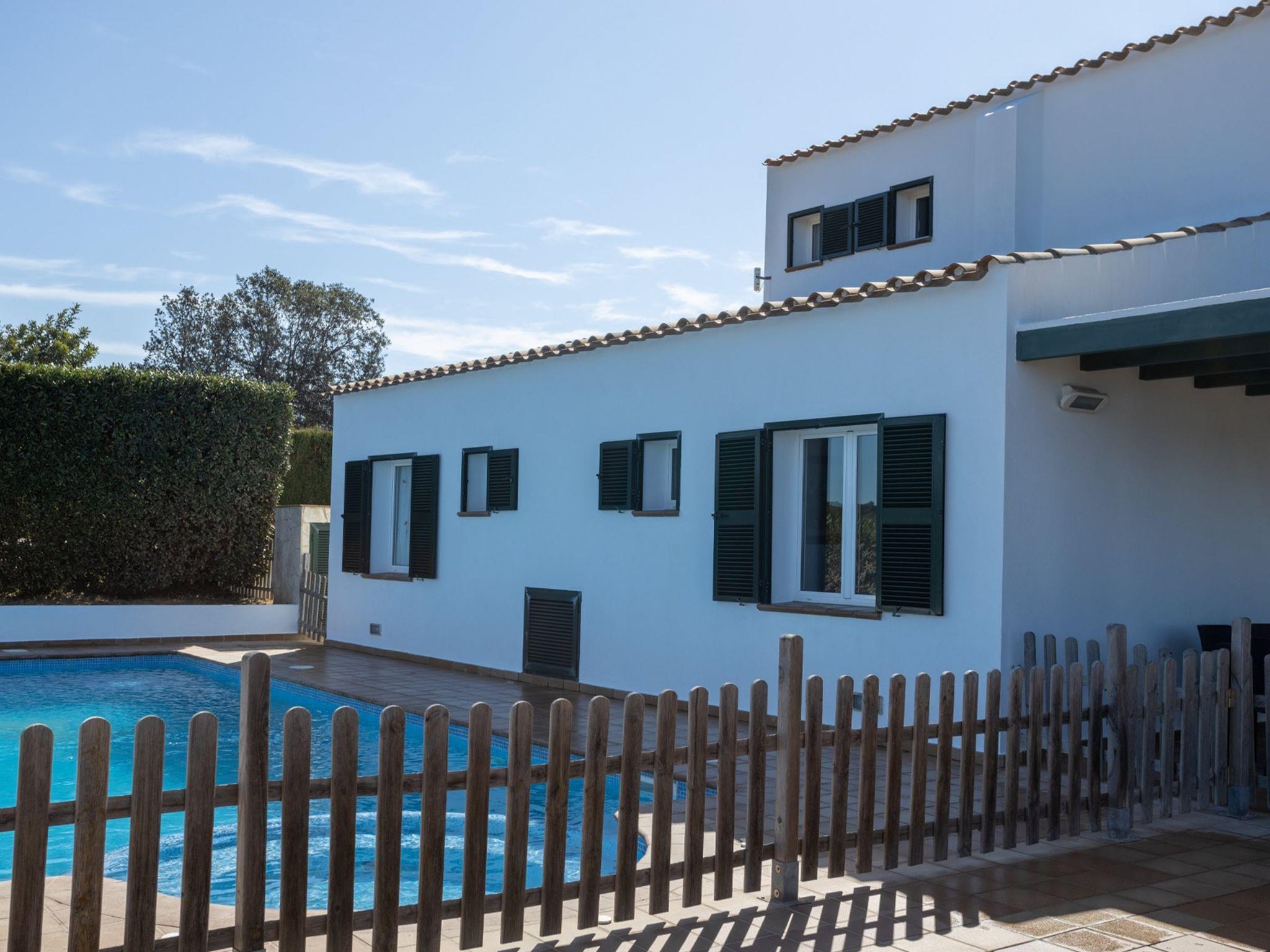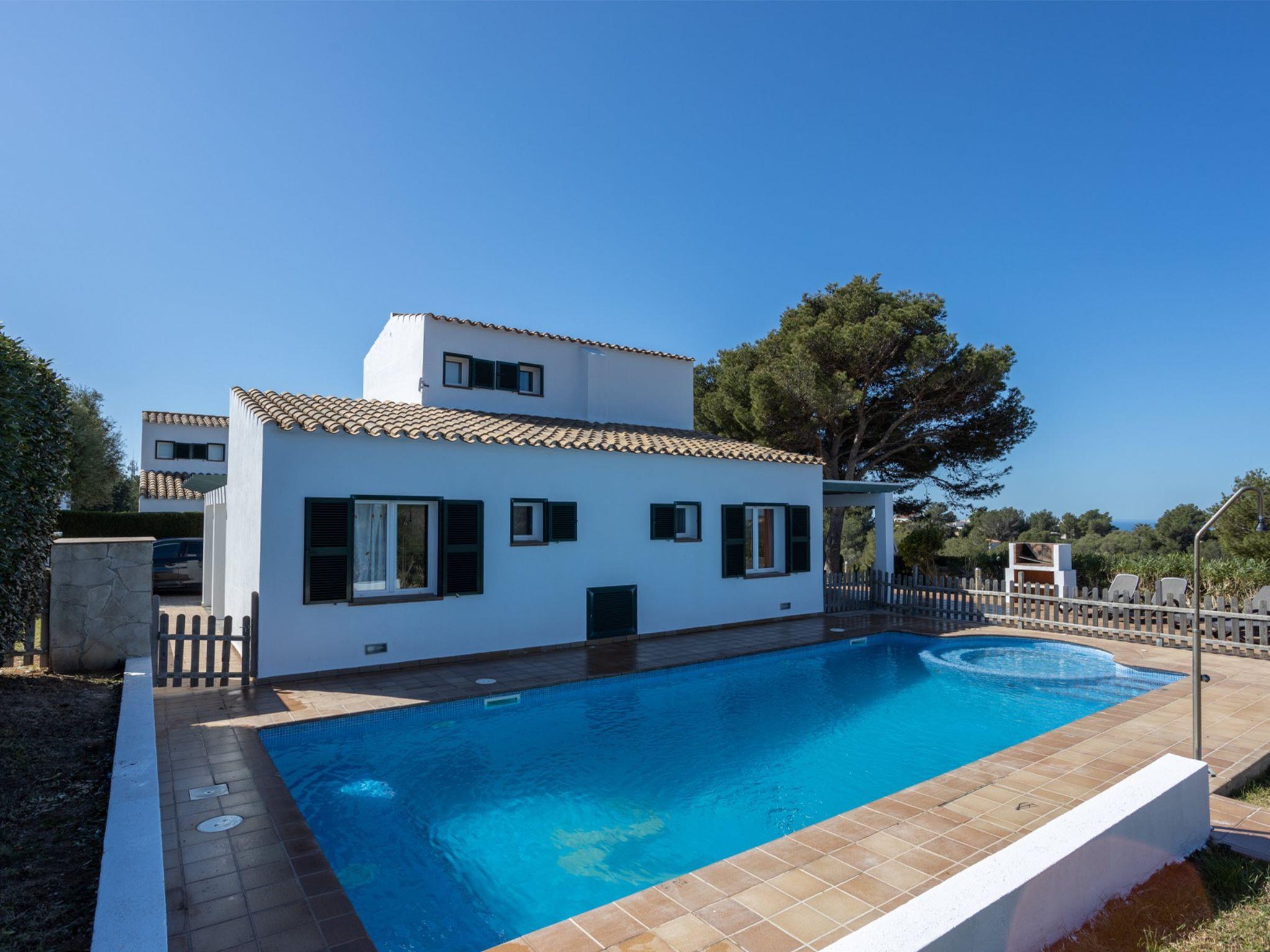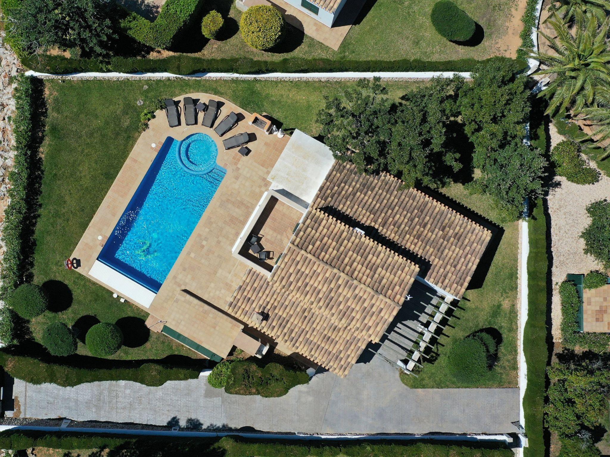 Son Bou: Modern, beautiful, luxurious villa "Villa Finesse Type 2 Duplex", surrounded by trees. On the outskirts Son Bou, in a sunny, elevated position, 2 km from the sea. Private: property, garden, swimming pool (4 x 10 m, seasonal availability: 30.Apr. - 24.Oct.). In the house: WiFi, air conditioning, washing machine. Parking at the house on the premises. Shop 2 km, grocery 2 km, supermarket 1 km, restaurant 2 km, bus stop "Son Bou" 450 m, sandy beach 2 km. Golf course (18 hole) 20 km, tennis 1.9 km, riding stable 1 km. Please note: car recommended. Suitable for families, suitable for seniors. Object suitable for 6 adults groups of teenagers on request only. Loading and unloading of baggage is possible at the holiday house. Airfield 20 km from the property.