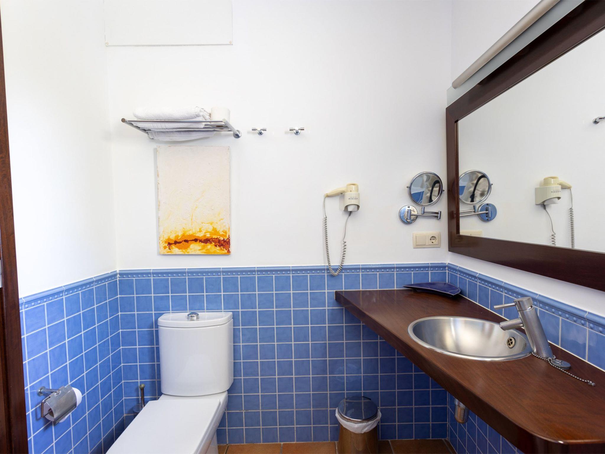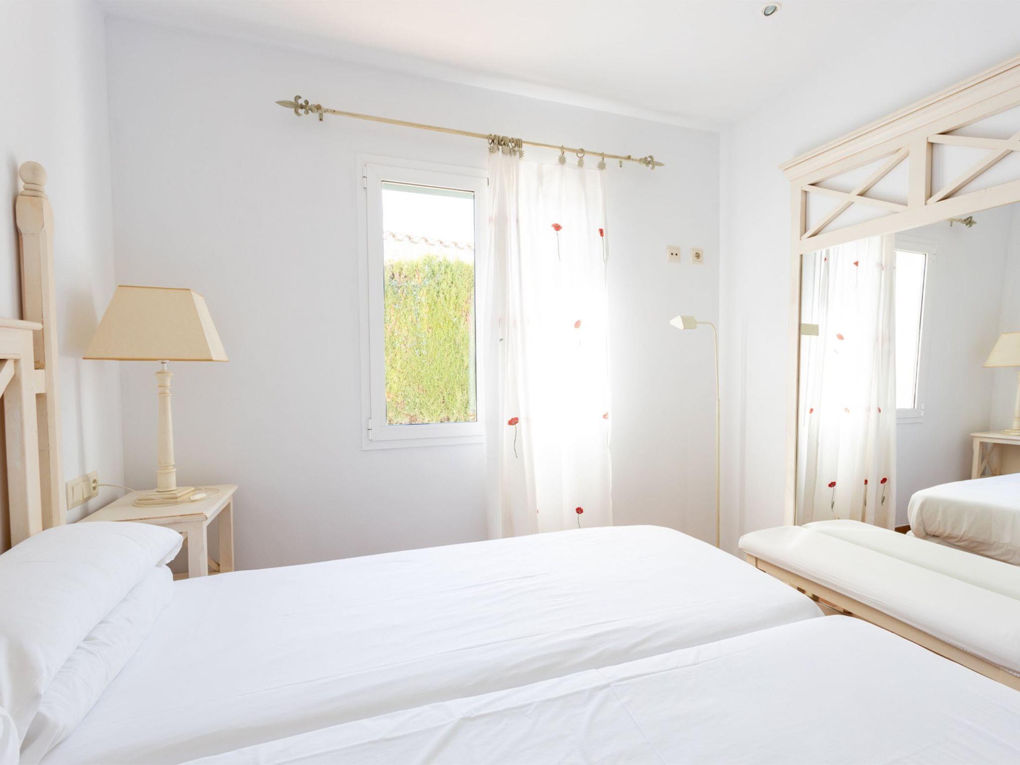 Son Bou: Beautiful, comfortable, luxurious villa "Villas Finesse Type 1", surrounded by trees. On the outskirts Son Bou, in a quiet, sunny position on top of a hill, 2 km from the sea. Private: property, garden, swimming pool (4 x 10 m, seasonal availability: 30.Apr. - 24.Oct.). Outdoor shower, patio, terrace. In the house: internet access, WiFi, air conditioning, washing machine. Parking on the premises. Shop 2 km, grocery 2 km, supermarket 1 km, restaurant 200 m, bus stop "Son Bou" 450 m, sandy beach 2 km. Golf course (18 hole) 20 km, tennis 1.9 km, riding stable 1 km, children's playground 300 m. Please note: car recommended. Suitable for families, suitable for seniors on request. Object suitable for 6 adults groups of teenagers on request only. Loading and unloading of baggage is possible at the holiday house. Airfield 20 km from the property.