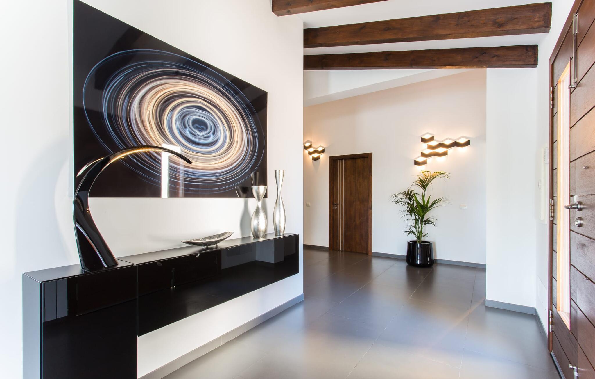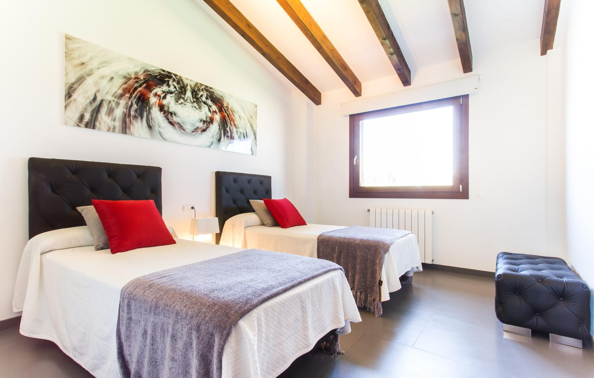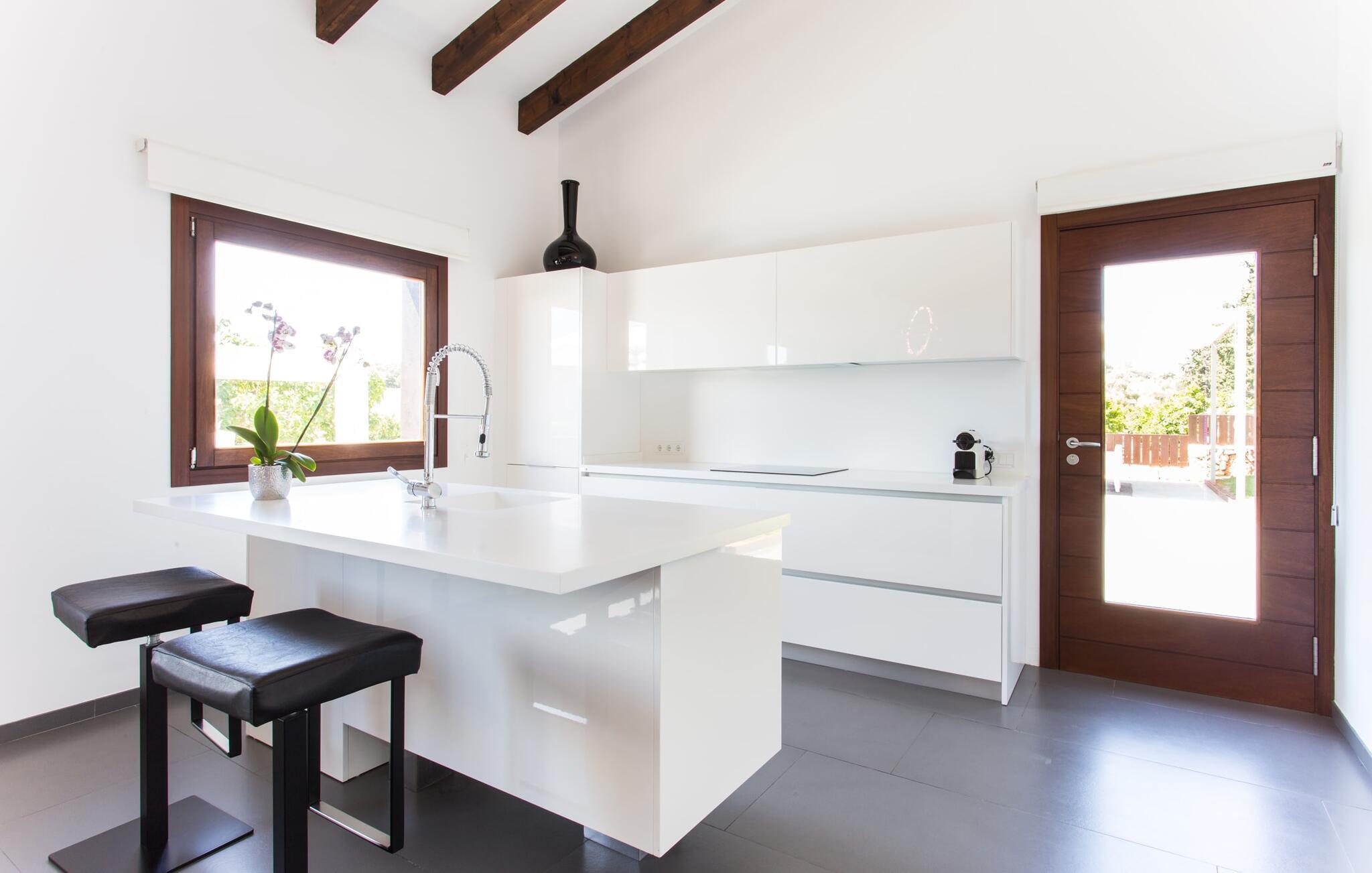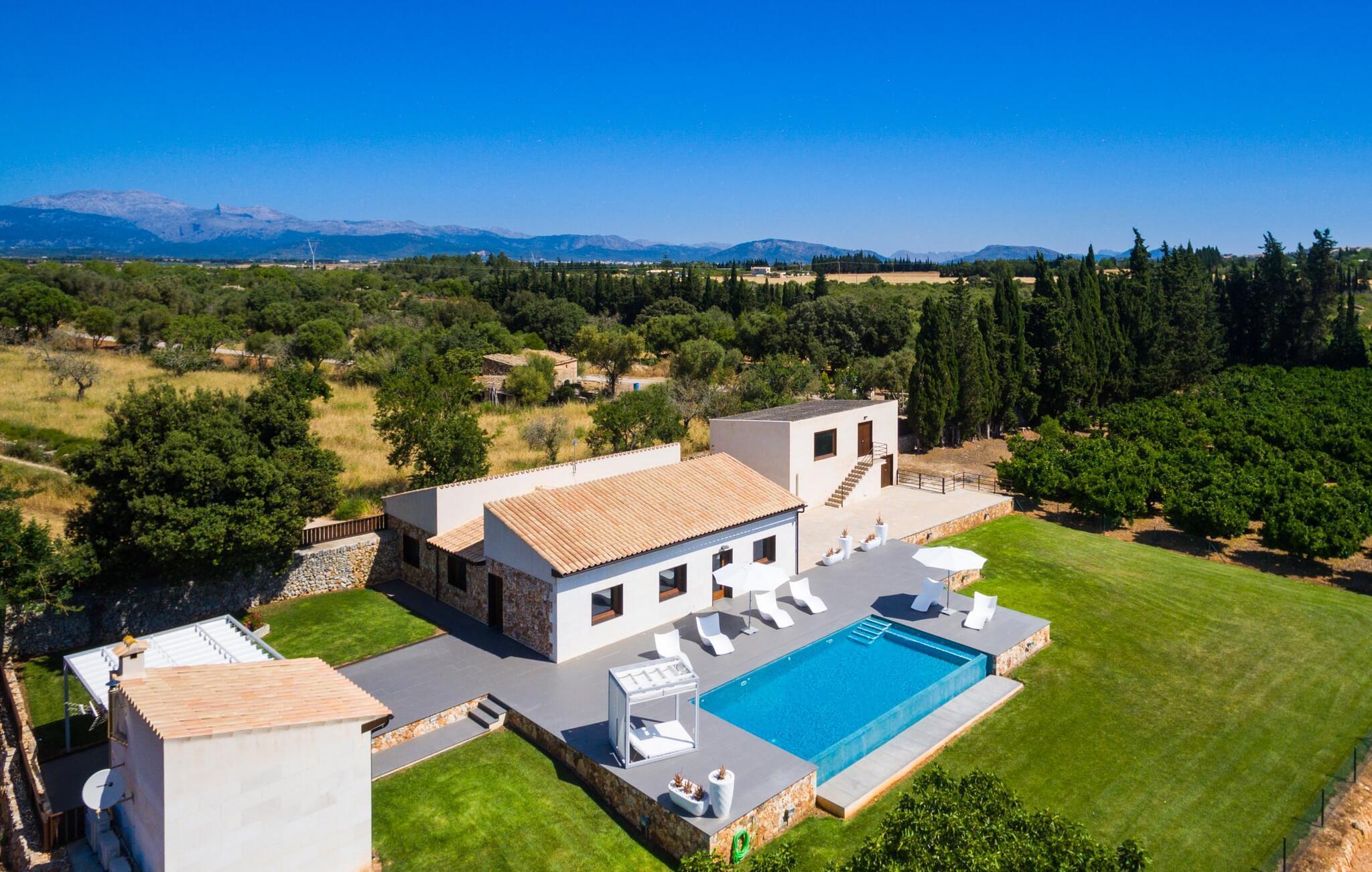 Det var med stor glæde, at vi tog imod ejerens invitation til at besøge hans villa “Son Calet”, som ligger nær landsbyen Muro. Alene de foreløbige data virkede passende: en rustik villa, totalrenoveret i 2015 og derfor omfattende moderniseret, på en imponerende 120.000 m² stor grund og alligevel med god adgang til indkøbsmuligheder og relativt tæt på stranden. Det er alle parametre, der passer perfekt til de villaer, der allerede tilbydes i vores program. Men da vi besøgte villaen for at se den fra vores kunders perspektiv, blev forventningen til ligefrem begejstring, for den trendy villa “Son Calet” er faktisk blevet renoveret i utroligt omfang og udstråler derfor en særlig charme i hele den moderigtige, stilfulde atmosfære. . Hvis I værdsætter design og kvalitet, er I kommet til det rigtige sted. Symbiosen mellem fortsat tradition og mere nutidige aspekter af bygningen kan også ses på den glatpudsede facade, som er løsnet op med grove stenbrud. Denne symbiose afspejles også i villaens indretning. Til denne villa er valgt en åben planløsning, der skaber en flydende overgang mellem stue, spisestue og køkken, der tilsammen udgør ejendommens fælles opholdsrum. Stuen er oversvømmet med naturligt lys takket være gulv-til-loft vinduerne. De fritlagte bjælkelofter, de hvide vægge og de grå, store gulvfliser gør dette område til et meget behageligt opholdssted. Dette område er indrettet i et virkelig harmonisk design af høj kvalitet: fra den rummelige hvide sofa foran det roterende LCD-tv, det lange glasbord med swingerstolene og de smarte forkromede sæder til køkkenet, finder I kun absolut kvalitet. Det højglansindbyggede køkken af høj kvalitet indeholder en køkkenø, der visuelt adskiller køkkenet fra spisepladsen. Det udstyr og det udstyr, der gør jeres hverdag nemmere, er naturligvis teknisk høj kvalitet. I kan også se et lille stykke tradition her, når I ser på et udsnit af en gammel, blotlagt stenmur, der ser ud som om den er i en billedramme. De bevidst placerede møbler og storformatbillederne på væggene er også slående. En kommode i indgangspartiet giver for eksempel ikke kun opbevaringsplads, men dens design gør den også til et kunstværk i sig selv. I nøje planlagte og professionelt gennemførte detaljer støder vi også på flere og flere overlapninger mellem design og kunst i de øvrige rum (også i soveværelserne). I begge badeværelser kan vi forvente flisearbejde af højeste kvalitet, usædvanlige badeværelsesartikler og overlegen komfort. Der er 2 værelser med hver en dobbeltseng og et dobbeltværelse med to enkeltsenge. Hvert værelse har sin egen, lidt anderledes stil - fælles for dem er kunstfærdige lamper og lysarmaturer samt en behagelig opholds- og soveatmosfære. I et af soveværelserne blev et stykke bart murværk bragt ud bag væggen og givet en kølig pink-violet farve ved hjælp af indirekte belysning. Endnu en konfrontation mellem moderne, puristisk design og mallorcansk tradition – og det fungerer simpelthen perfekt. Vi forlader nu det spændende hus, hvor der er meget mere at opdage, end vi har kunnet beskrive her, og beder jer følges med os ind i haveområdet. Der er adskillige græsplæner og terrasseområder. Hvor den egentlige have slutter, begynder den ejendom, der hører til villaen. På et areal på 120.000 m² vil I befinde jer i et fuldstændig afsondret miljø, hvor absolut privatliv er garanteret. Hundredvis af appelsintræer er blandt de mange andre typer af vegetation på ejendommen, næsten umulige at se fuldt ud med det blotte øje. Fra selve huset er der adgang til solterrassen, hvori den fantastiske infinity-pool med en størrelse på 60 m² er indlejret. Oplyst om aftenen, som I ønsker det, kan I efter en god svømmetur slappe af på en af de trendy, ergonomisk formede liggestole (under en af de 3 parasoller, hvis I ønsker det) eller måske nyde et solbad, en siesta eller en god bog om balineserne seng. Udvidelsen af terrassen fører til en lige så stor spiseplads med designerstole omkring et enkelt udekøkken, som også har en indbygget grill, så der er absolut intet, der står i vejen for en hyggelig aften omkring grillen med hele jeres gruppe og et godt glas mallorcansk vin som tilbehør. Men hvis I beslutter jer for at forlade ejendommen for at udforske det omkringliggende område, vil jeres lejebil give jer mulighed for at opdage adskillige attraktive byer og landsbyer, som alle er meget nemme at nå. Den stilfulde villa "Son Calet" ligger cirka 5 minutters kørsel fra den nordlige mallorcanske by Muro. Der har I mulighed for at købe dagligvarer i de forskellige supermarkeder eller på søndagsmarkedet, hvilket gør den bevidste beslutning om at være selvforsynende så let som muligt. Der er også en række caféer og barer i Muro, som giver jer snacks og kaffe. Vi kan varmt anbefale at udforske de omkringliggende feriesteder, herunder den tidligere fiskerby Can Picafort, som stadig bevarer sin autentiske karakter, men alligevel er fuld af restauranter, barer, butikker og natklubber. Et besøg i landsbyen Santa Margarita, som er malerisk omgivet af marker og var det første sted, hvor befolkningen i samfundet kaldte hjem, kan også særligt anbefales. For en dag på stranden behøver I kun at rejse et par kilometer med jeres lejebil for at nå steder som Alcúdia-bugten, San Baulo-stranden eller Can Picafort-stranden, for blot at nævne nogle af de mange spektakulære strande i området. Mulighederne er mange og varierede, ligesom selve den imponerende villa "Son Calet", et feriehus, som vi hos Fincallorca giver en uforbeholden anbefaling til. Den utroligt stilfulde villa "Son Calet" er en ejendom, der blev renoveret i 2015 og indrettet med en moderne tilgang i en fabelagtig trendy indretningsstil. Villaen ligger på en 120.000 m² stor grund nær den nordlige mallorcanske landsby Muro, som ligger kun 5 minutter væk i bil. De mange strande i Alcúdia-bugten samt deres