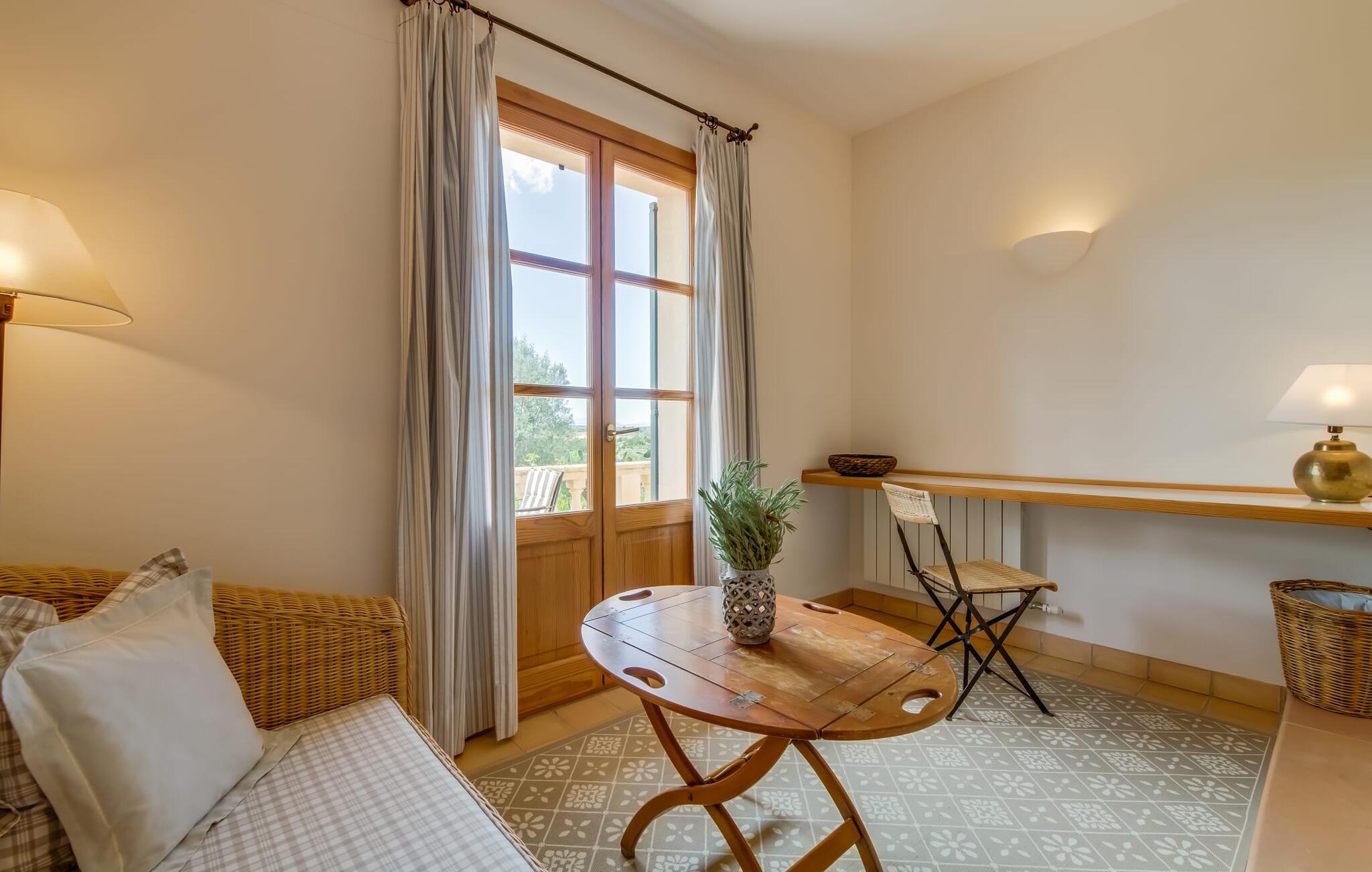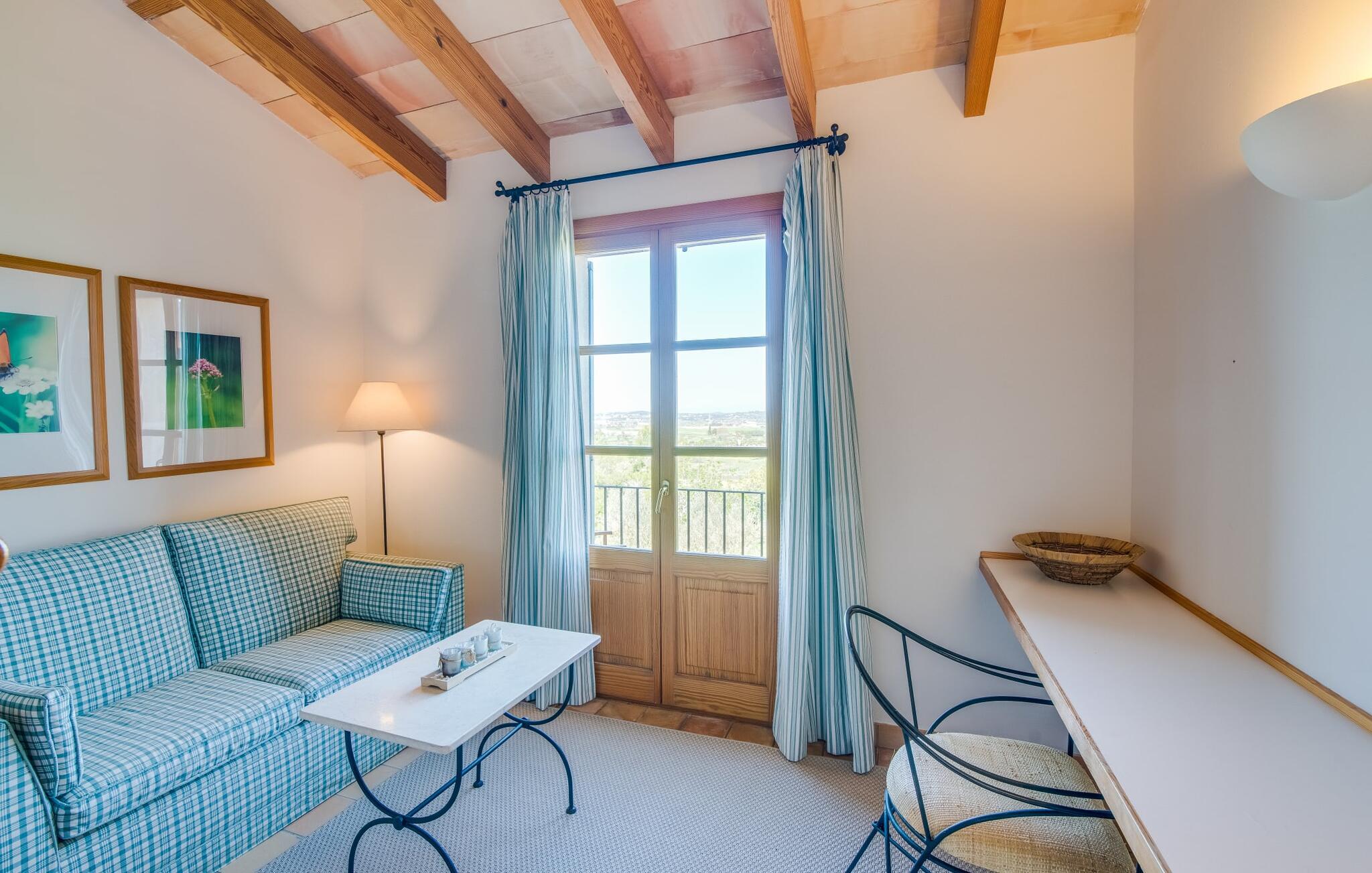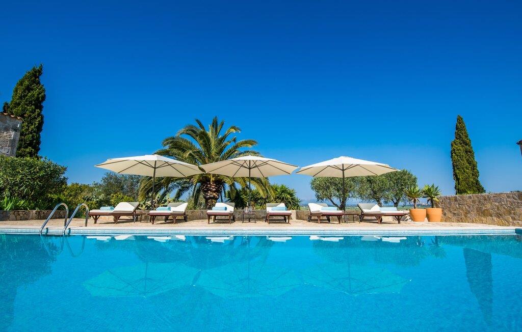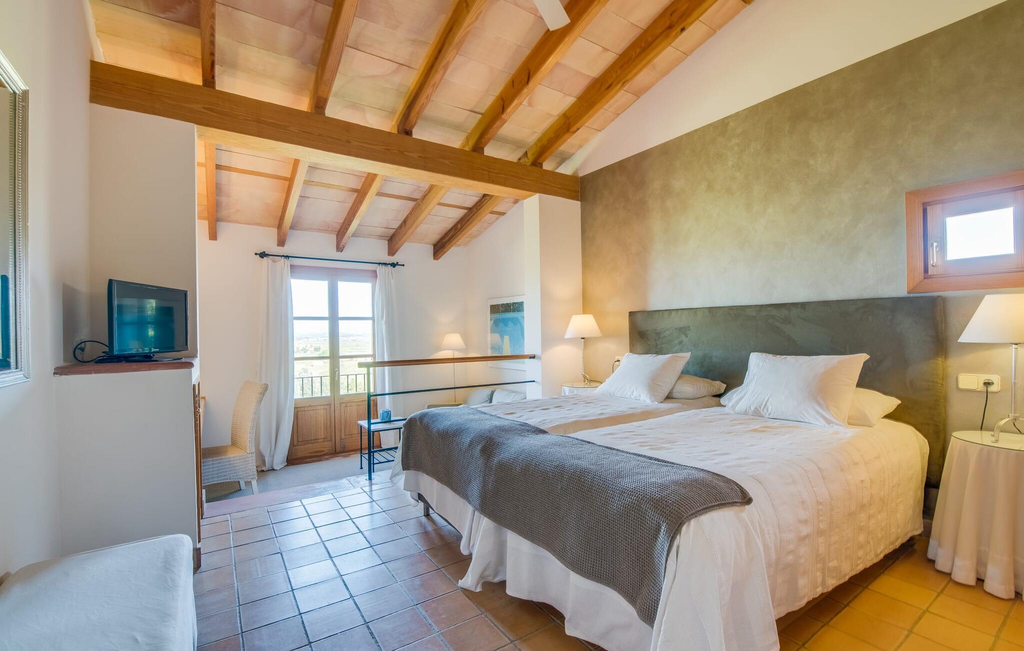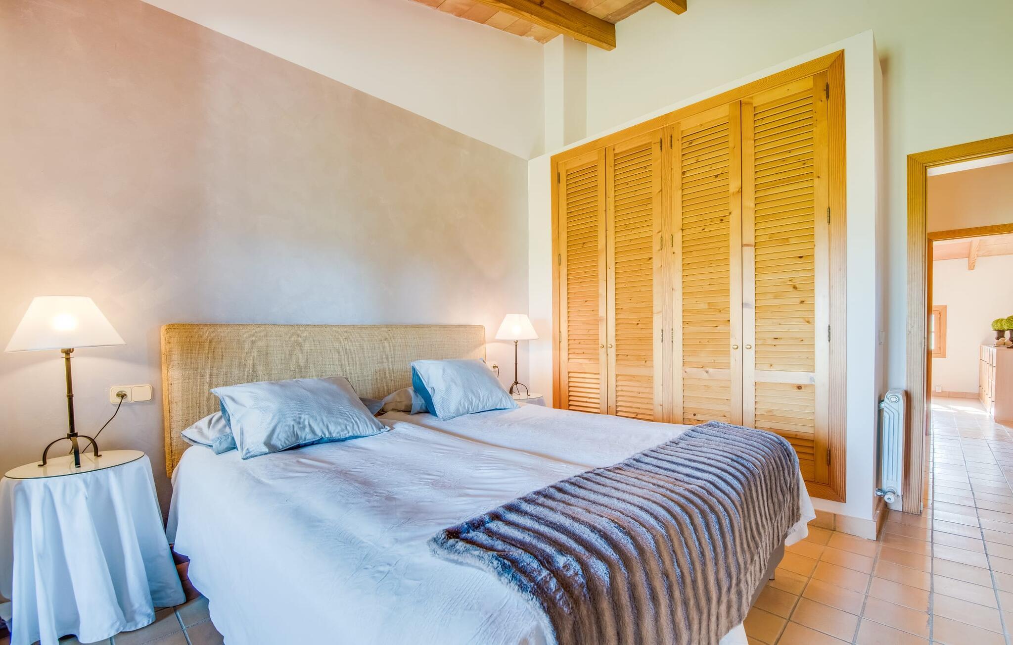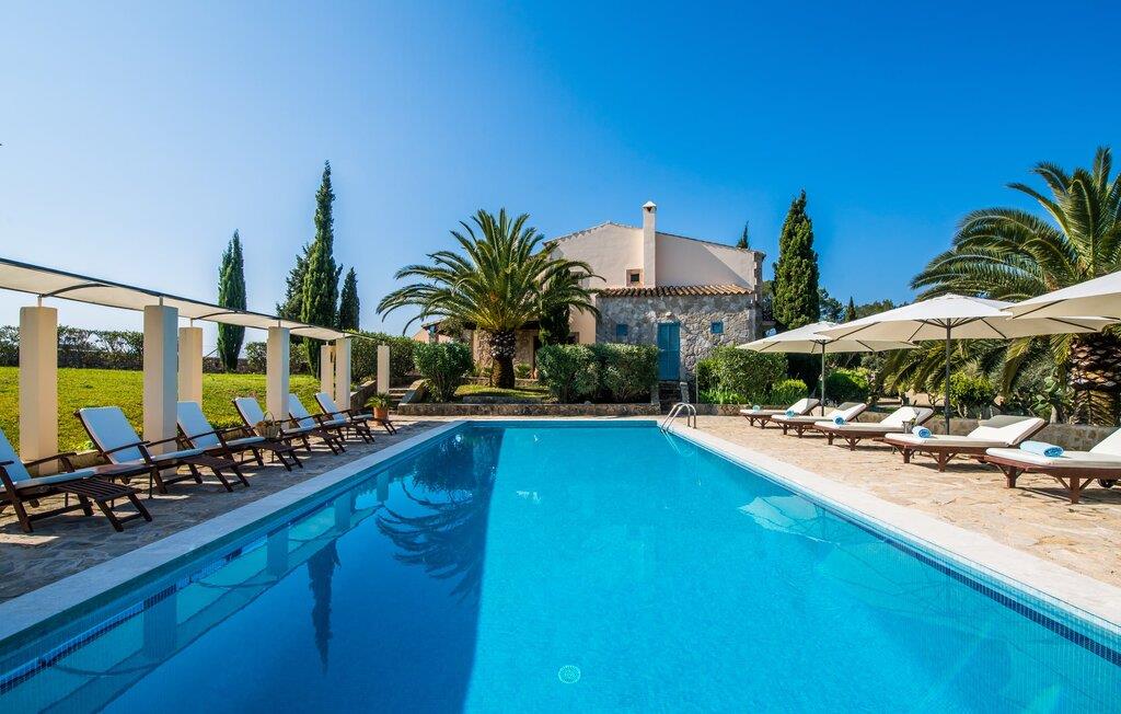 Når I ankommer til Villa "Son Canals", tag et øjeblik til at indånde skønheden i den 14.300 m² store ejendom er omgivet af en rummelig terrasse med en lang pool Højkvalitets træstole og lærredsparasoller inviterer jer til at solbade og tilbyde en betagende udsigt. på den solbeskinnede morgenmadsterrasse Det alsidige udendørsområde omfatter et smukt sommerkøkken med et stort bord, ideelt til afslapning med en solid grill. Indenfor inviterer den rummelige stue med pejs og højt til loftet en afslappet atmosfære med en god bog eller film Det lyse køkken i spansk stil er fuldt udstyret med alle de nødvendige apparater og det lange spisebord rummer komfortabelt alle. Seks dobbeltværelser, hver med eget badeværelse og direkte adgang til en balkon eller terrasse, tilbyder afslappende tilflugtssteder. Med sin stilfulde indretning sikrer denne villa en uforglemmelig ferieoplevelse. De venlige ejere bor i et separat hus og sikrer eksklusiv brug af haven og poolen. Den slående komfortable villa "Son Canals" er beliggende i en rolig beliggenhed nær Petra, en smuk lille by i den østlige del af Mallorca Med sine supermarkeder, barer og gode restauranter tilbyder Petra alt hvad I behøver for en afslappende ferie i dette indbydende feriehus. Den attraktive naturlige sandstrand fra Son Serra de Marina ligger kun omkring 15 minutter i bil fra villaen. Der er også fem forskellige golfbaner i nærheden.